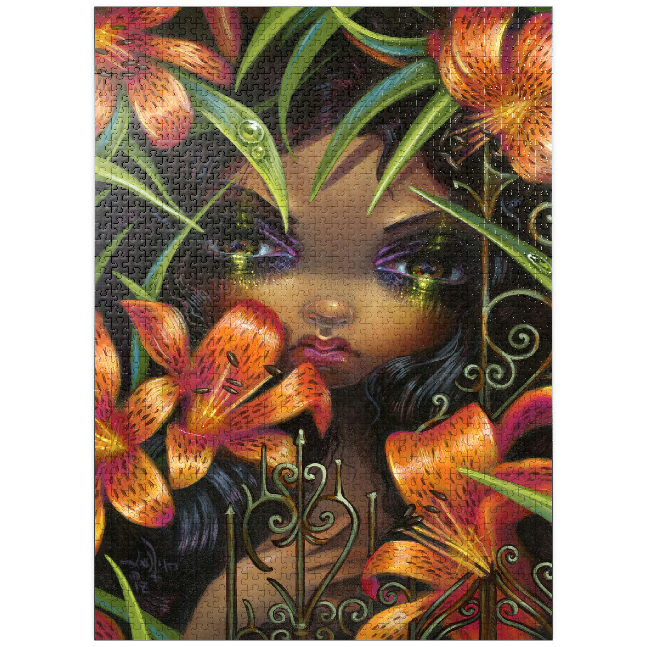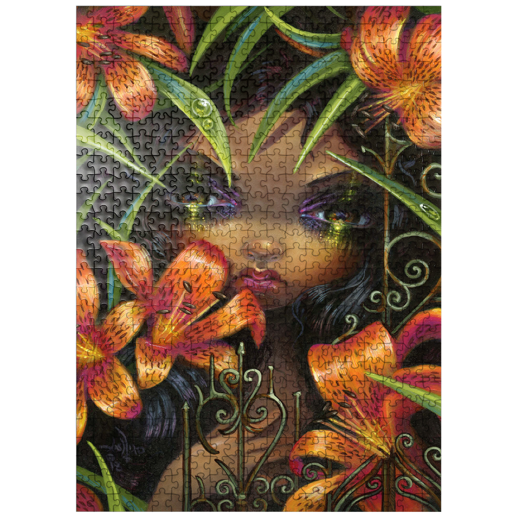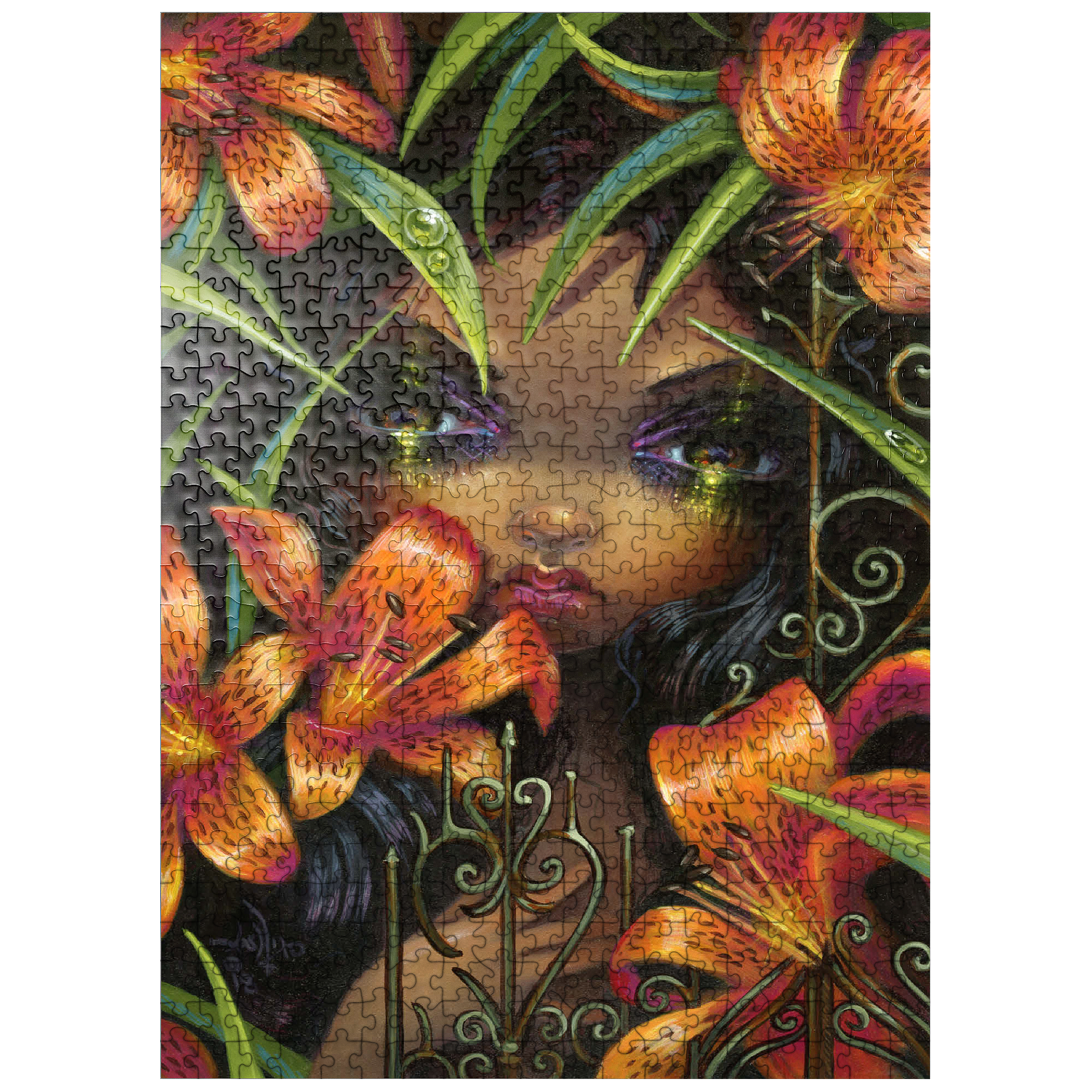 Decipher the Victorian message of -The Language of Flowers V: Tiger Lily- puzzle! Piece together this vibrant artwork exploring the secret language of flowers. Tiger lilies traditionally symbolize nobility and wealth. Unravel this regal and symbolic puzzle!