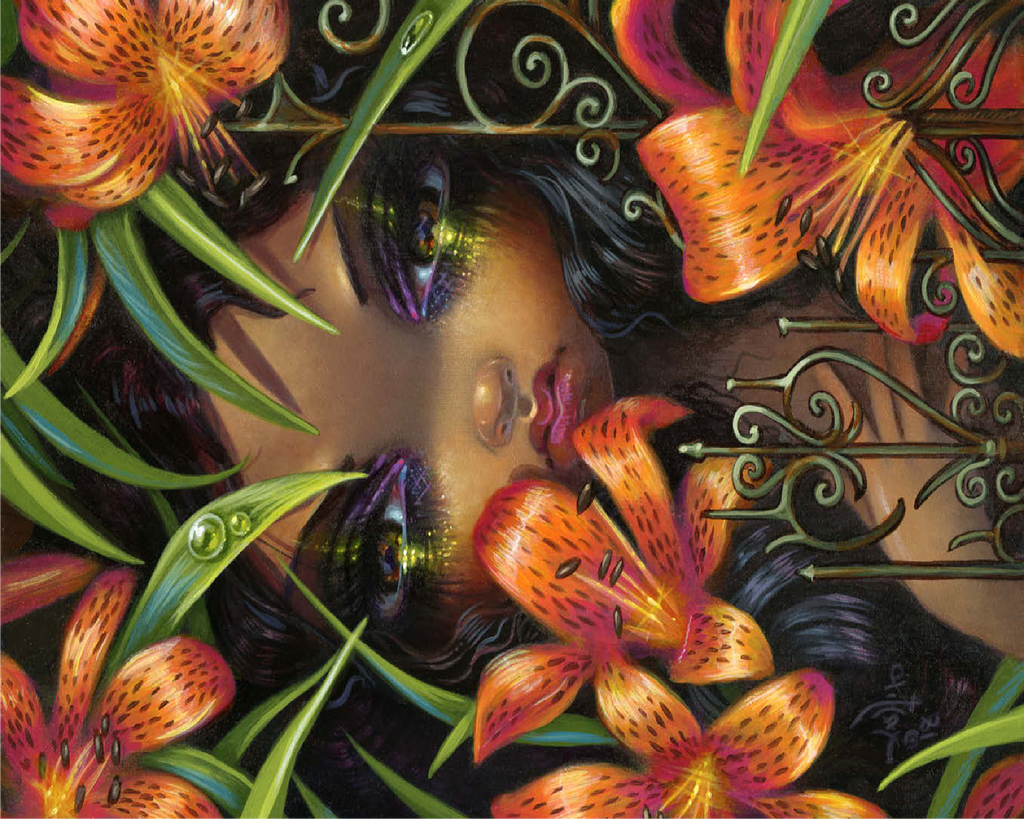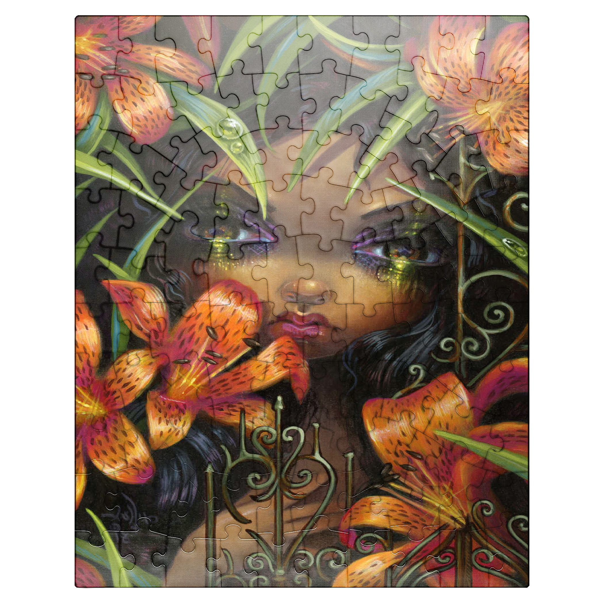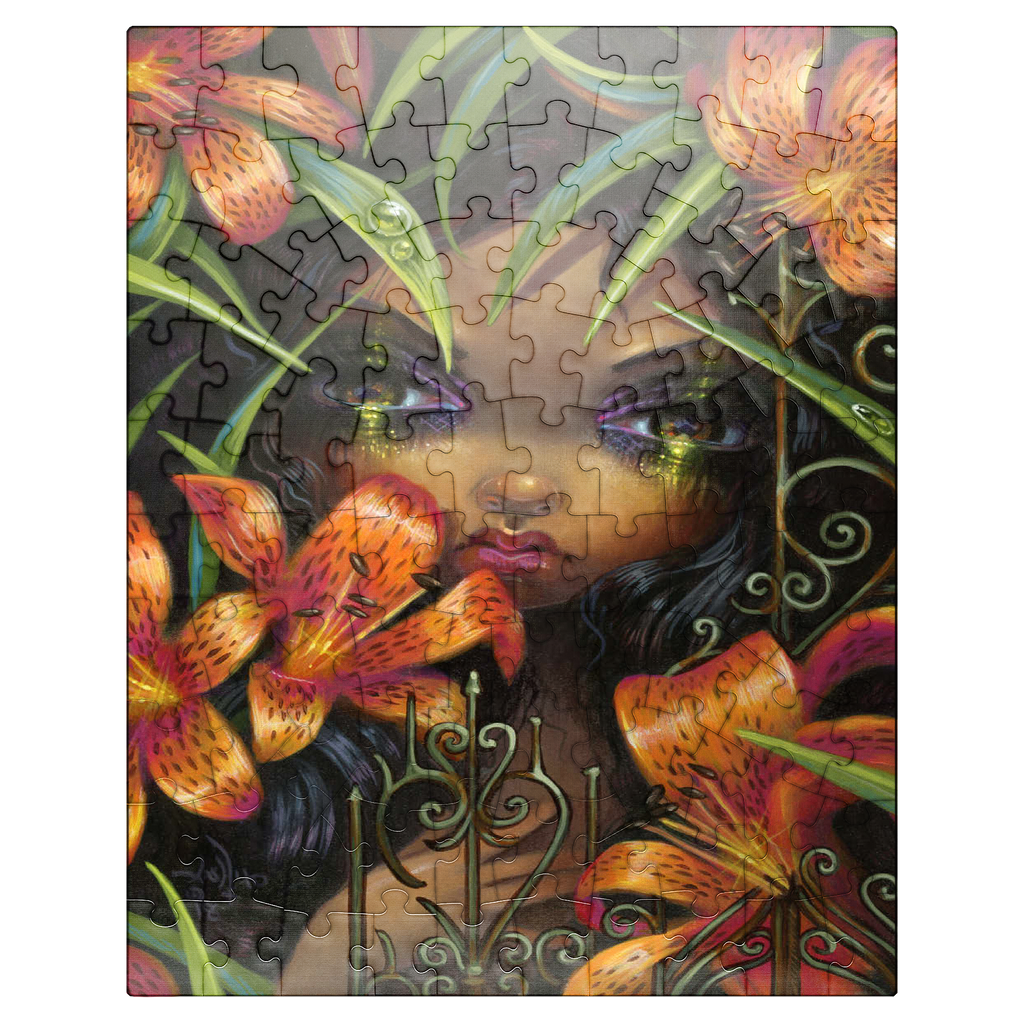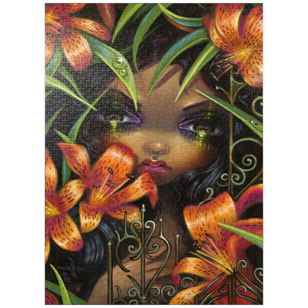 Decipher the Victorian message of -The Language of Flowers V: Tiger Lily- puzzle! Piece together this vibrant artwork exploring the secret language of flowers. Tiger lilies traditionally symbolize nobility and wealth. Unravel this regal and symbolic puzzle!