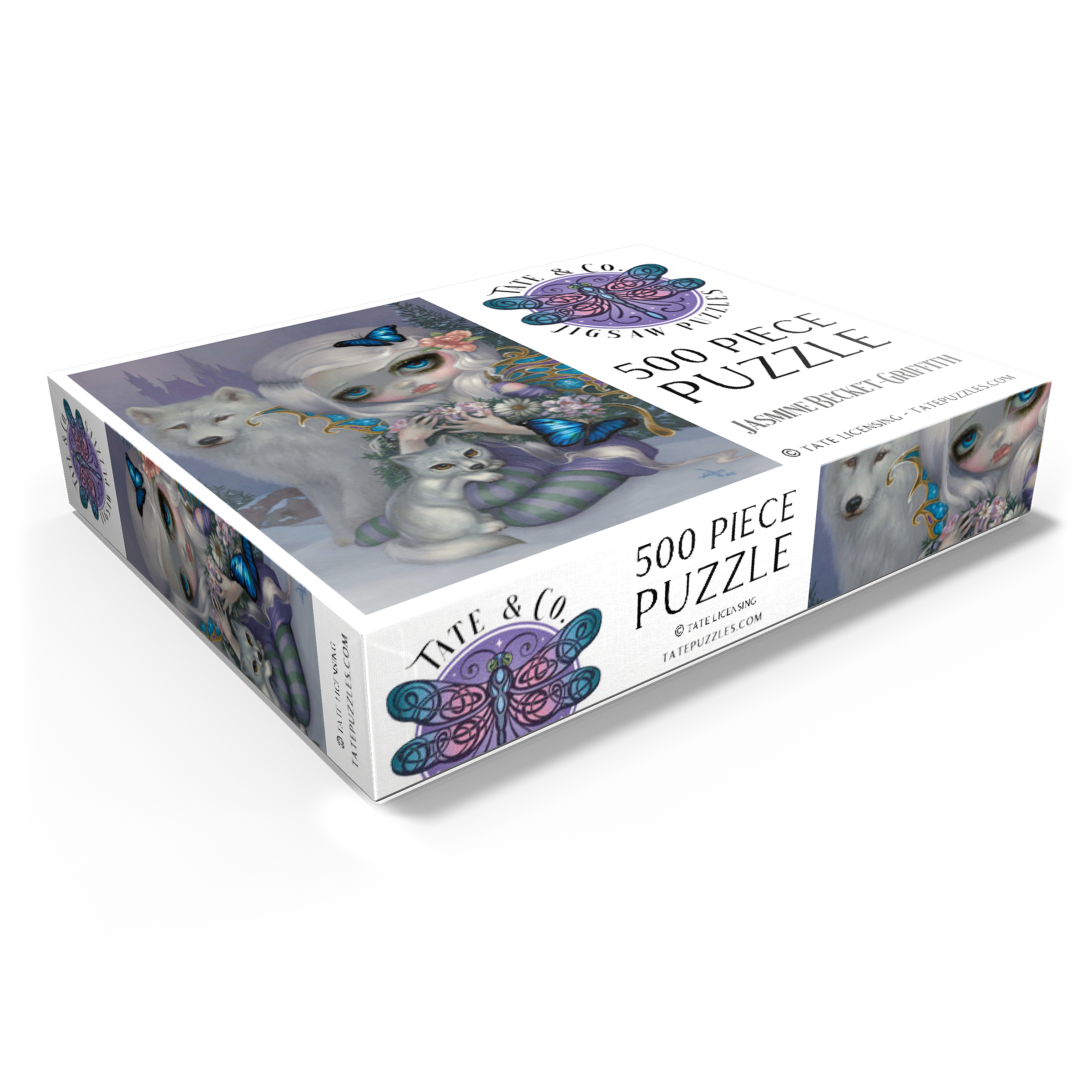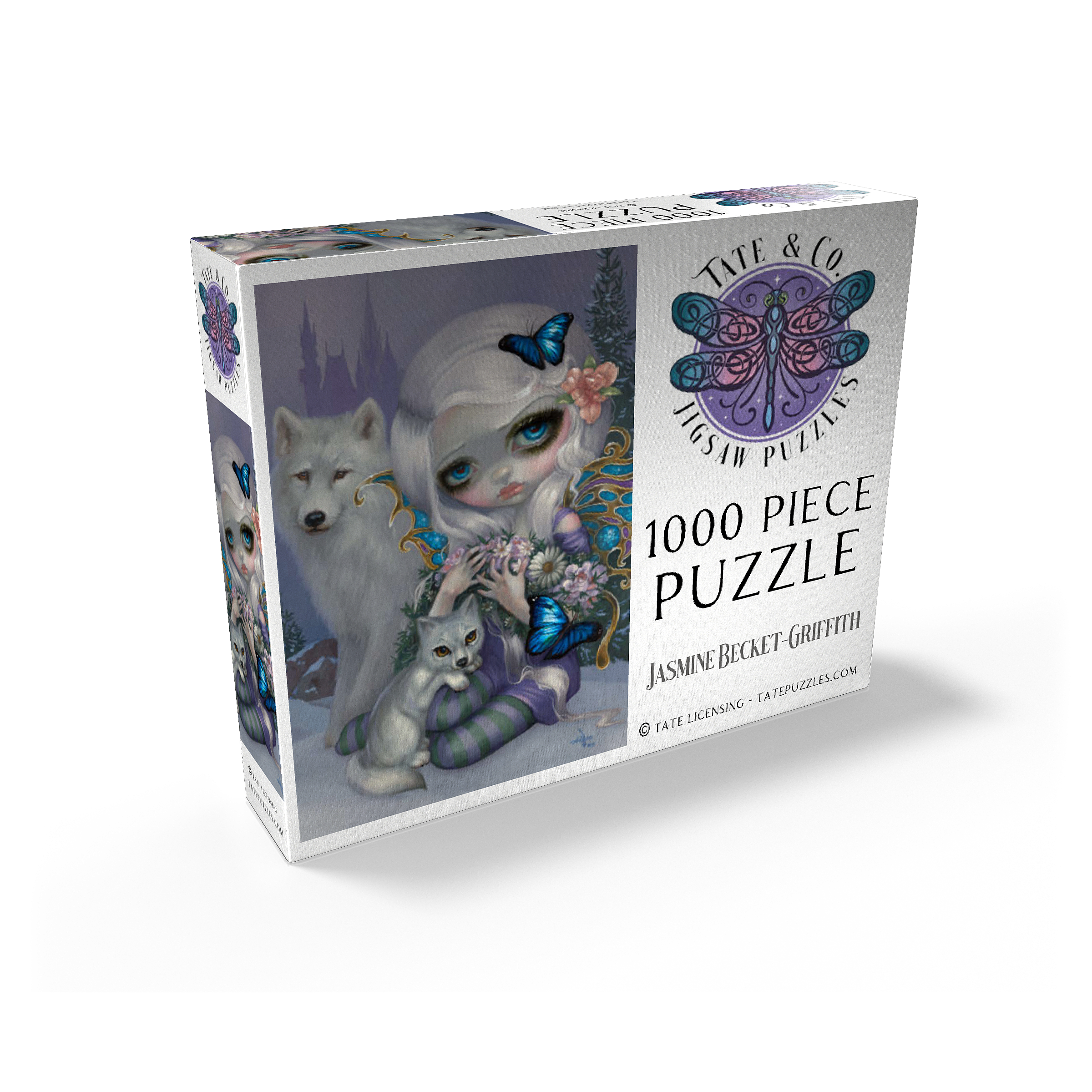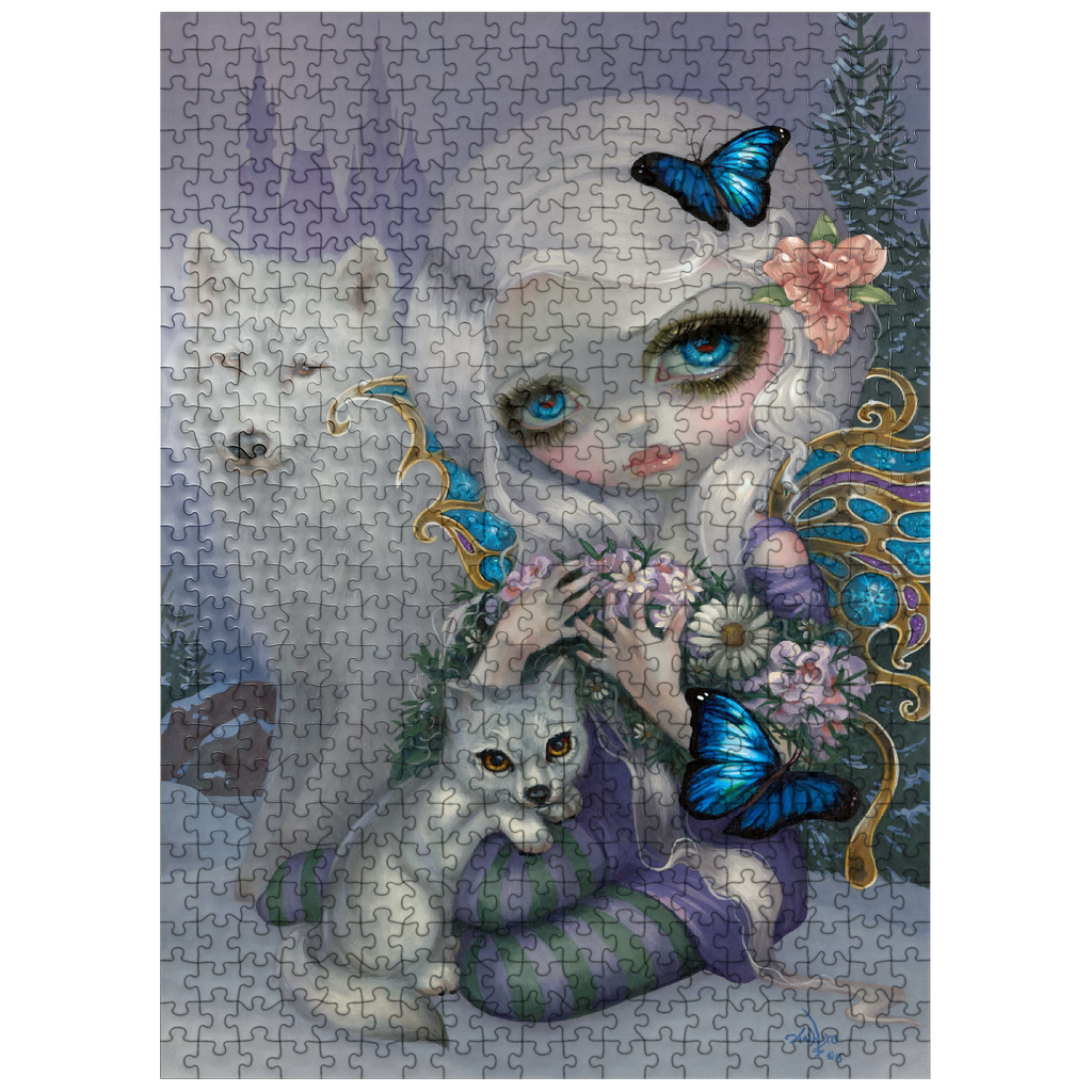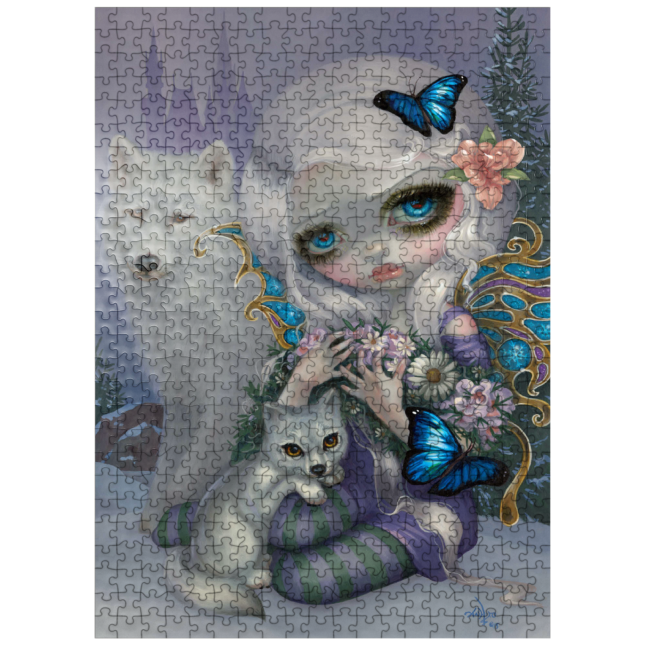 Embrace the serene beauty of the -Winter- puzzle! Piece together the Winter Fairy from the -Four Seasons- collection, accompanied by two majestic white wolves in a quiet, snowy evening. Discover the romantic 19th-century landscape, all connected by delicate butterflies. Unravel this tranquil winter scene!