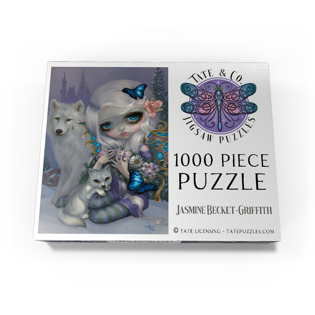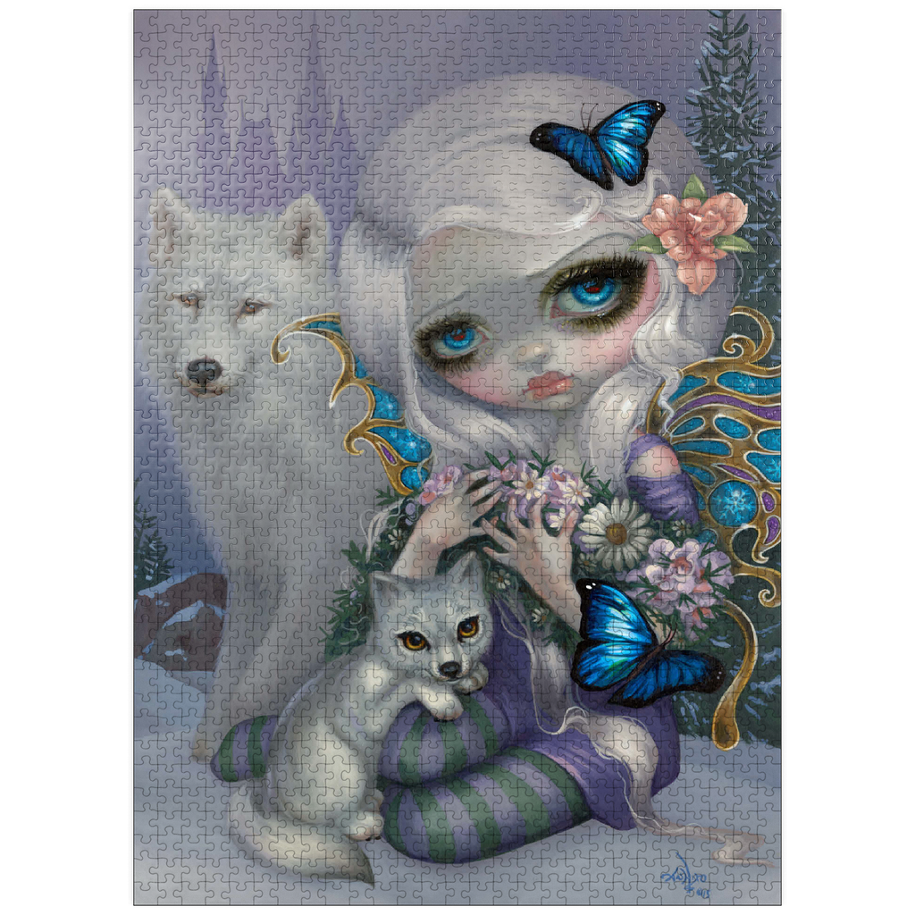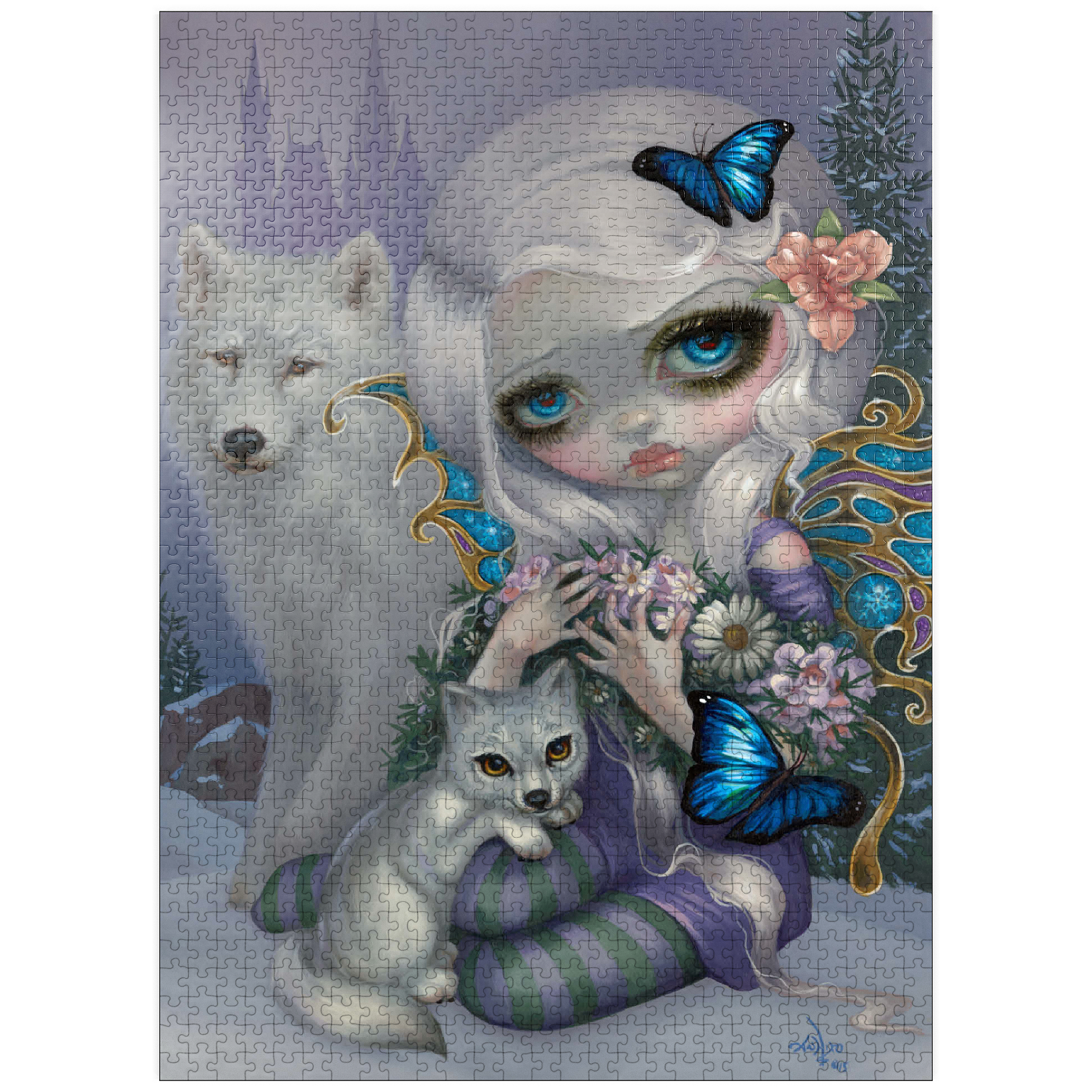 Embrace the serene beauty of the -Winter- puzzle! Piece together the Winter Fairy from the -Four Seasons- collection, accompanied by two majestic white wolves in a quiet, snowy evening. Discover the romantic 19th-century landscape, all connected by delicate butterflies. Unravel this tranquil winter scene!