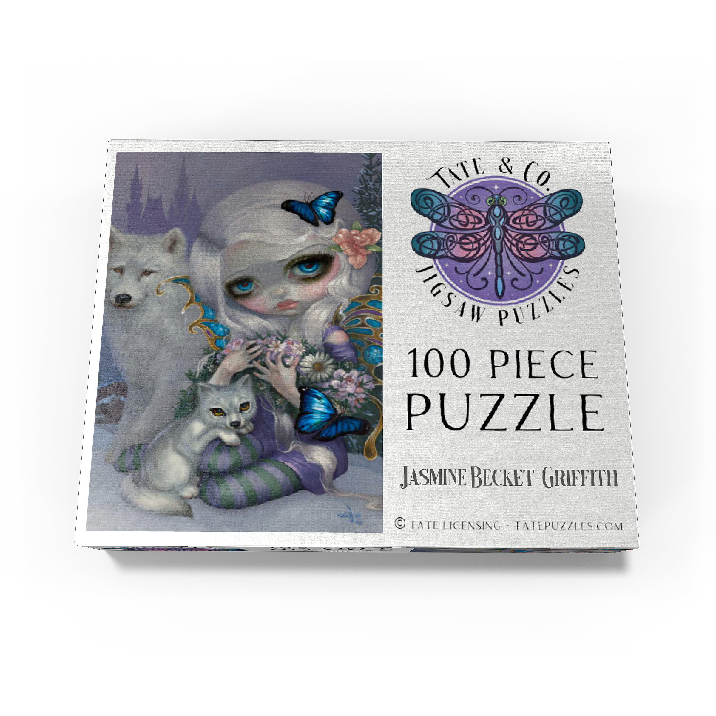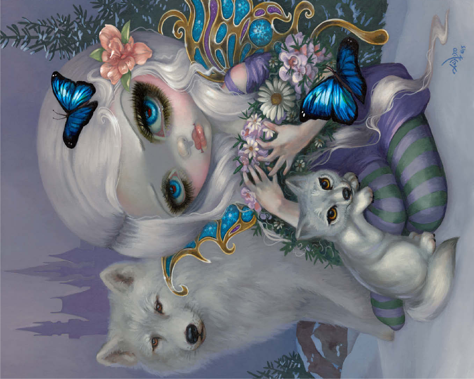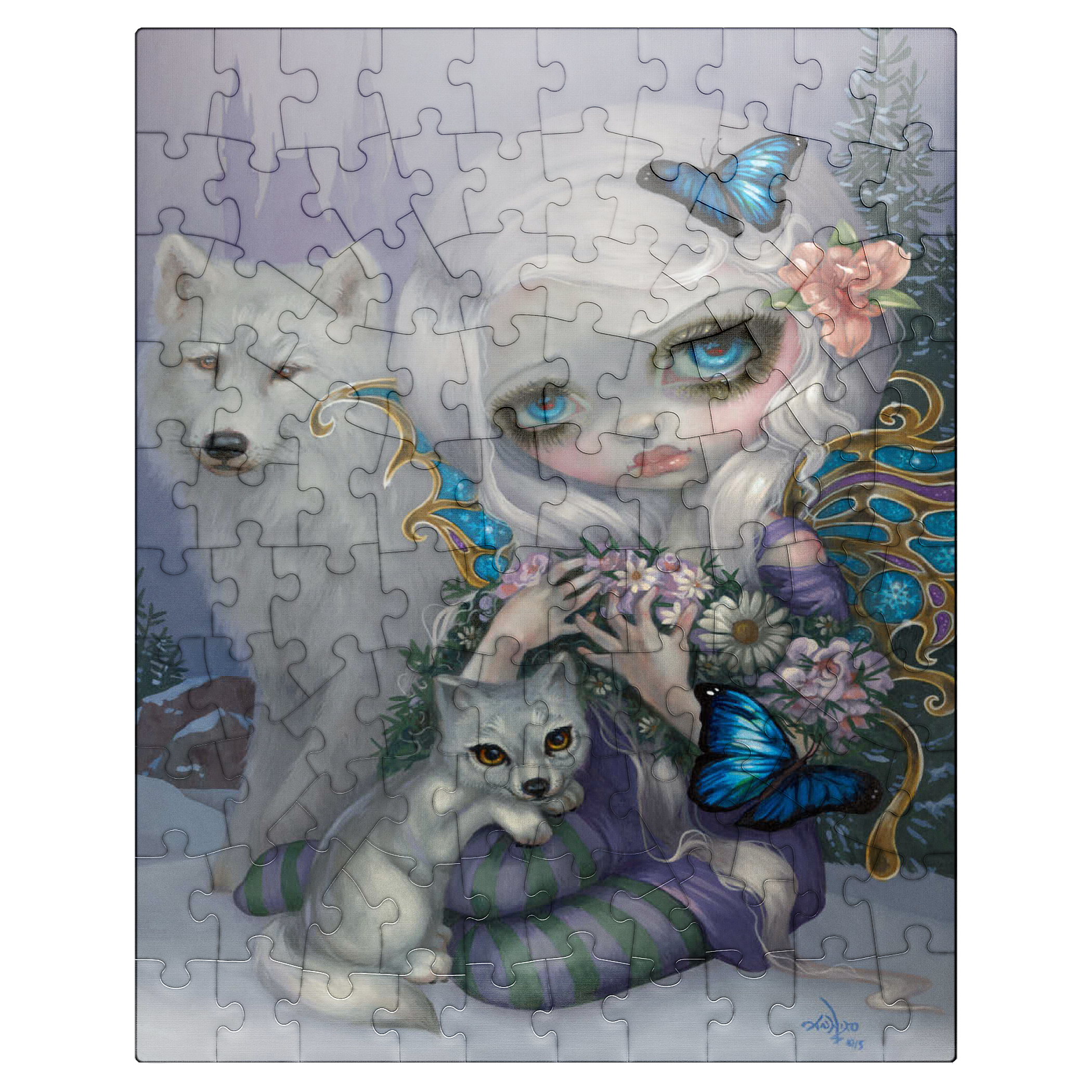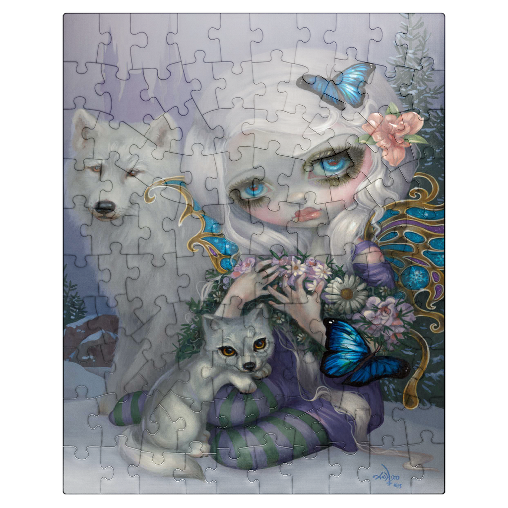 Embrace the serene beauty of the -Winter- puzzle! Piece together the Winter Fairy from the -Four Seasons- collection, accompanied by two majestic white wolves in a quiet, snowy evening. Discover the romantic 19th-century landscape, all connected by delicate butterflies. Unravel this tranquil winter scene!