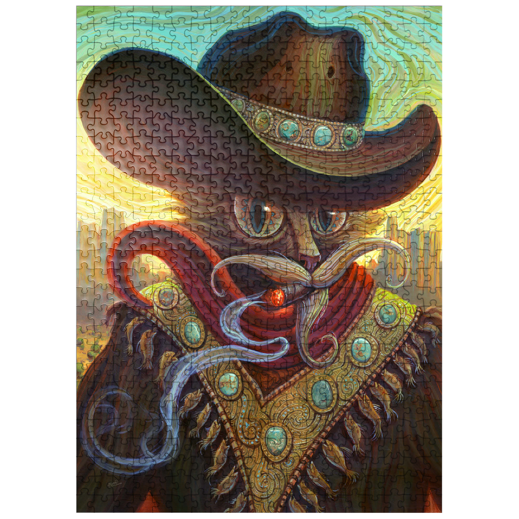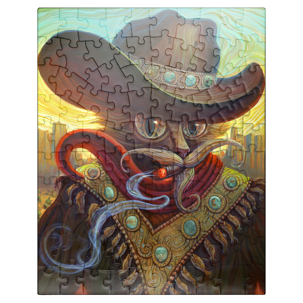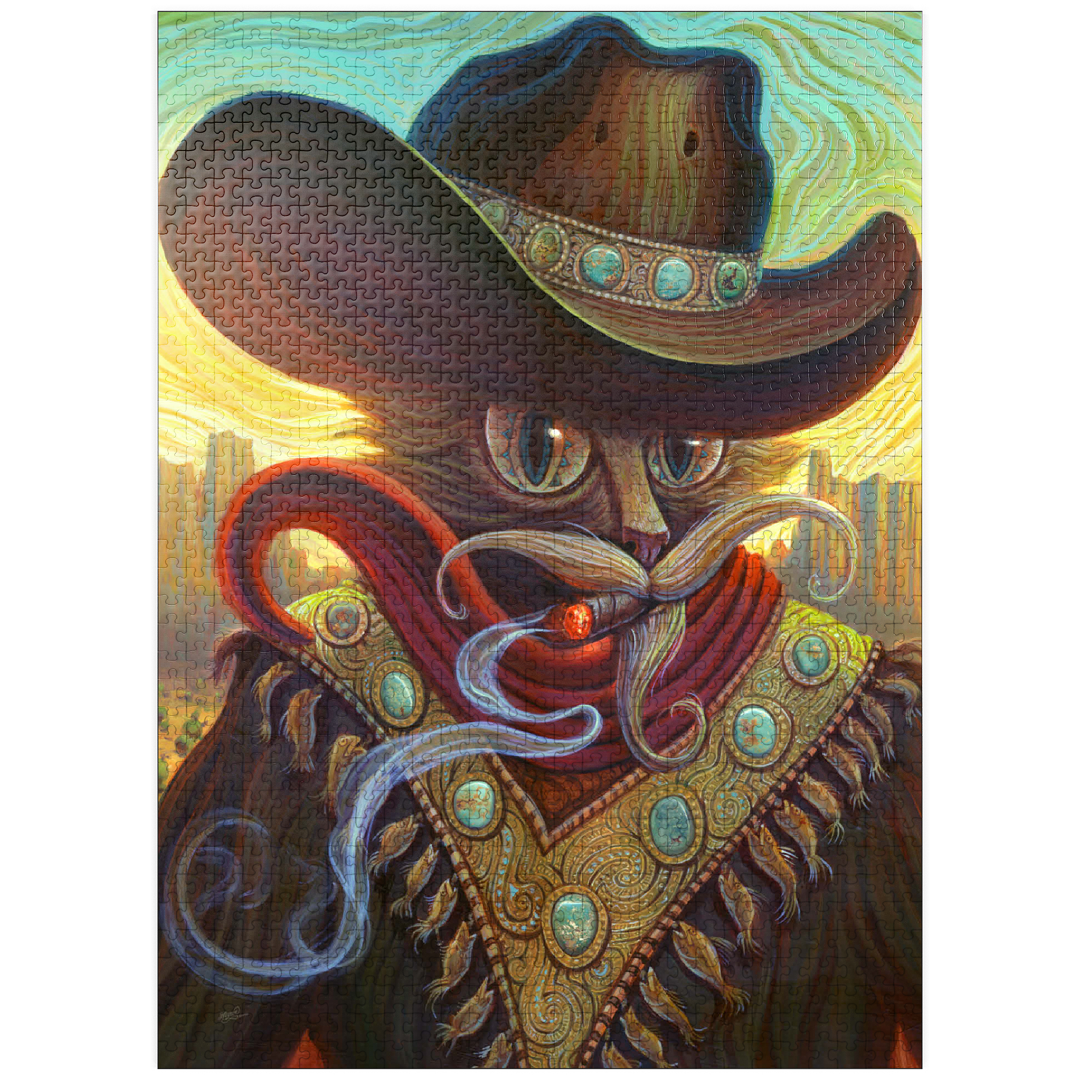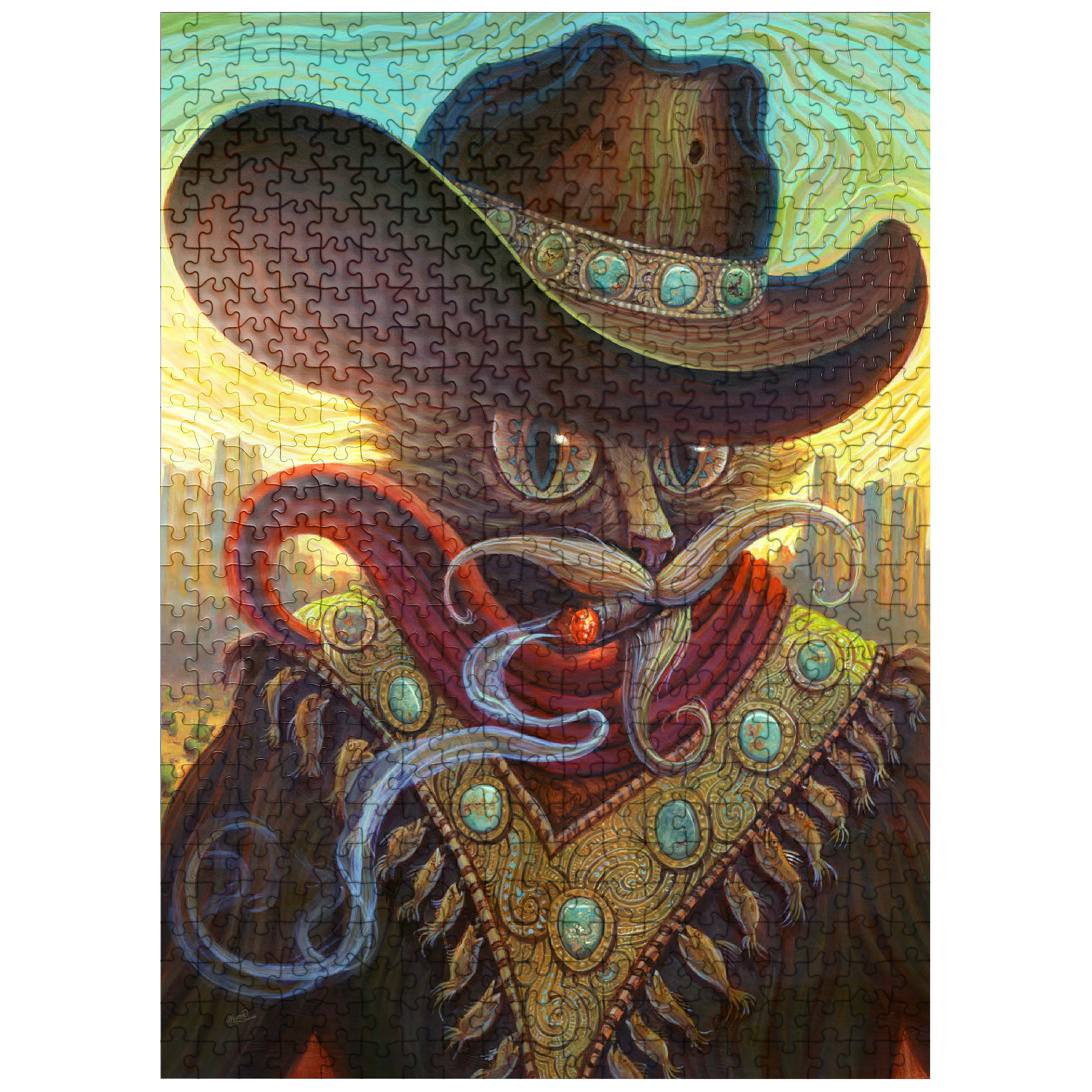 Jeff Haynie portrays a feline gunslinger, exuding a blend of power and charm, against a warm, stylized Western backdrop. The artwork showcases a cat wearing a large, ornate cowboy hat adorned with turquoise stones, a red scarf, and a decorative vest featuring similar stones and dangling fish