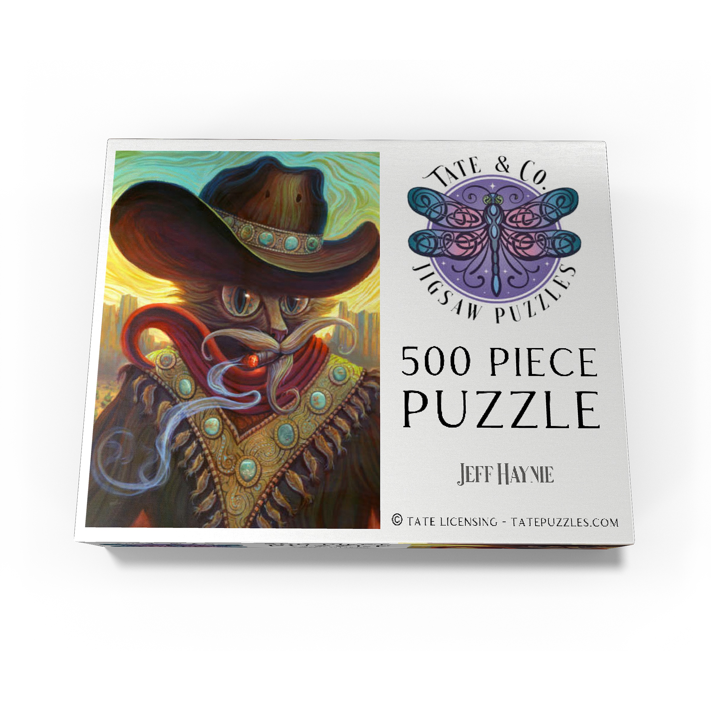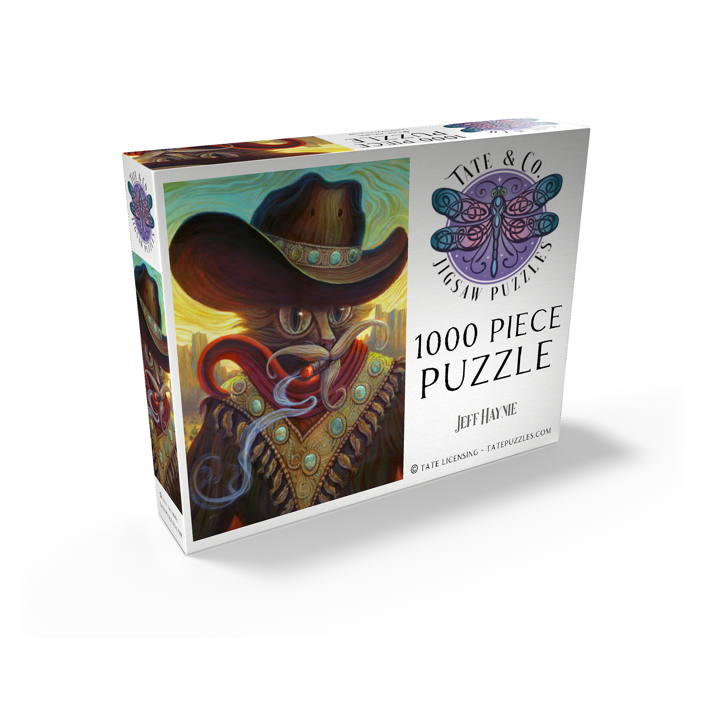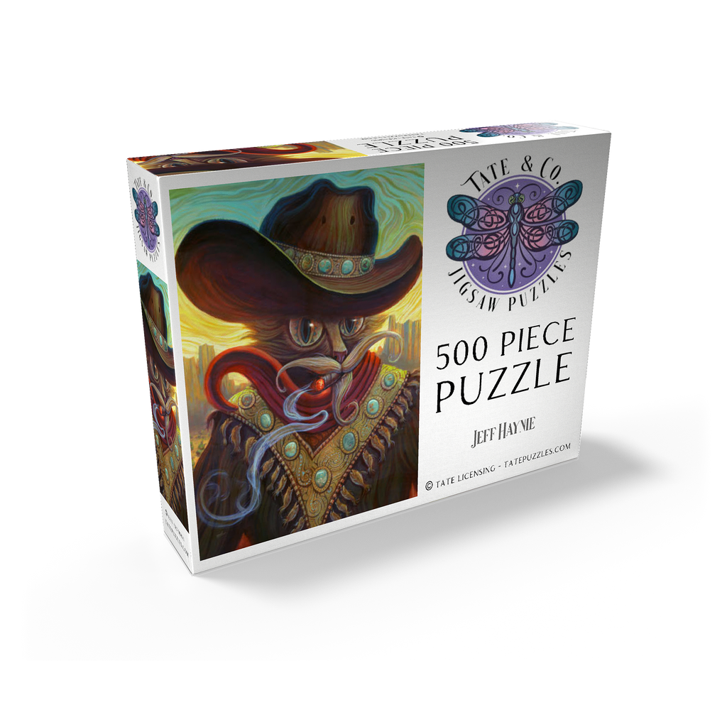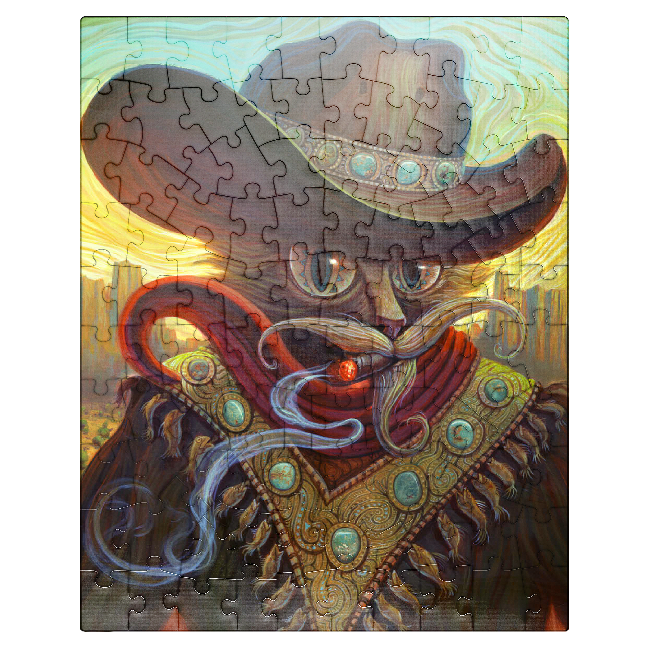 Jeff Haynie portrays a feline gunslinger, exuding a blend of power and charm, against a warm, stylized Western backdrop. The artwork showcases a cat wearing a large, ornate cowboy hat adorned with turquoise stones, a red scarf, and a decorative vest featuring similar stones and dangling fish