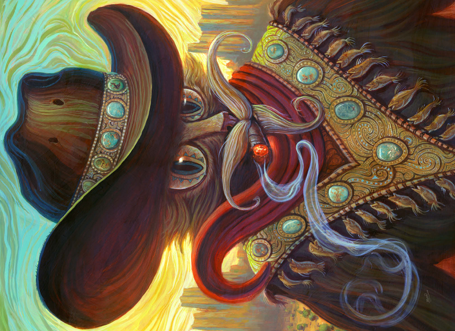 After relocating to New Mexico, Jeff shifted his artistic focus toward painting whimsical cats and striking ravens, weaving them into rich, decorative visual narratives. His unique works often incorporate turquoise stones that he personally mines and polishes. Through his art, Jeff brings to life enchanting stories set in imaginative fantasy worlds.