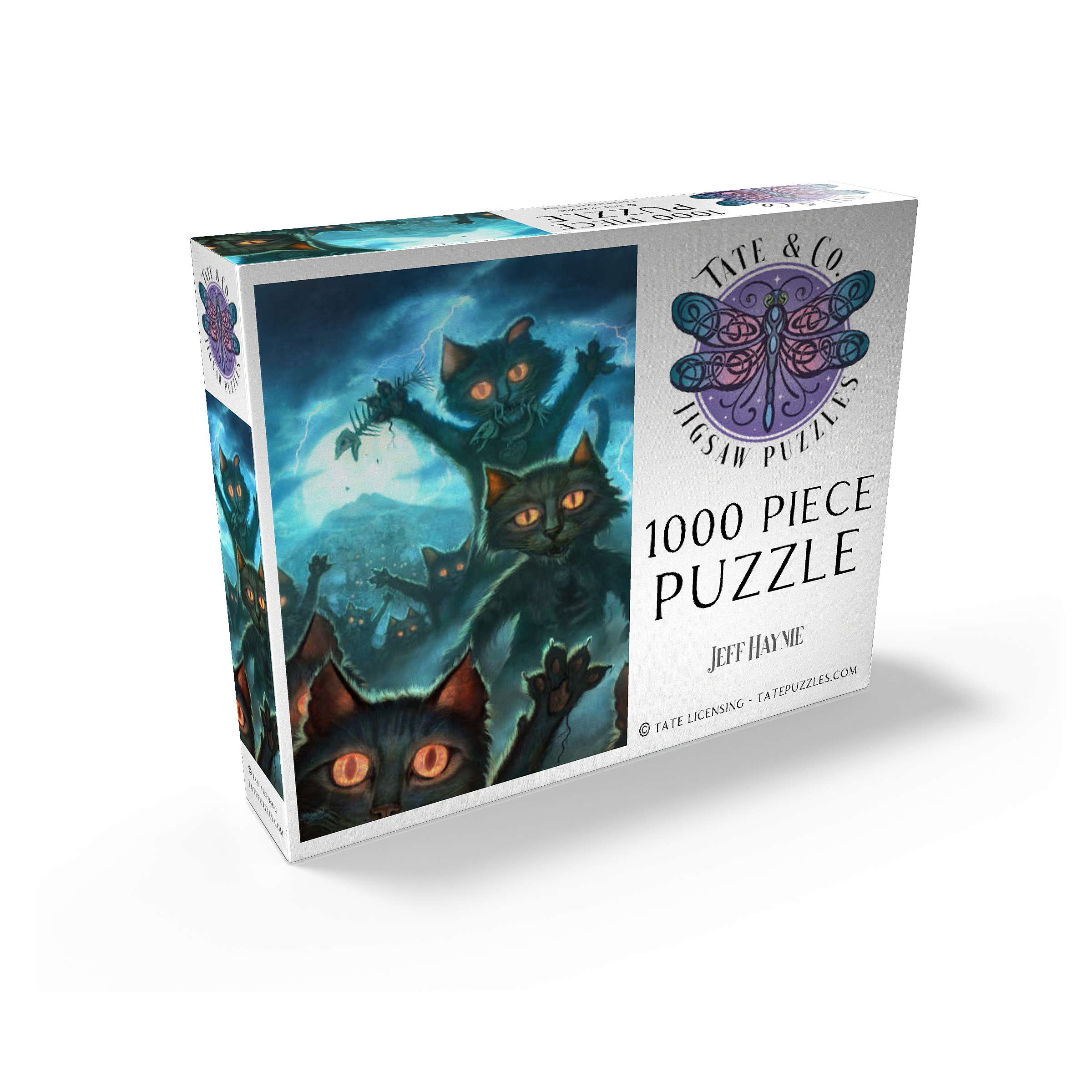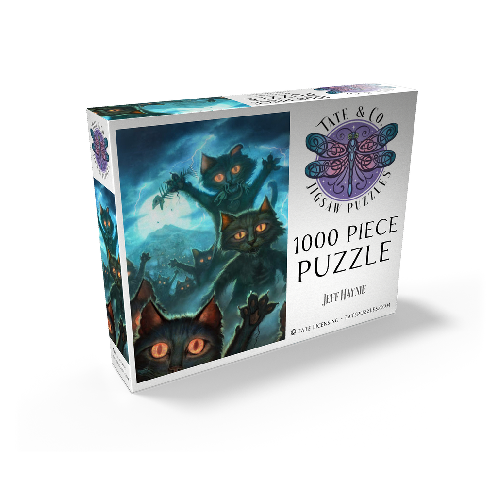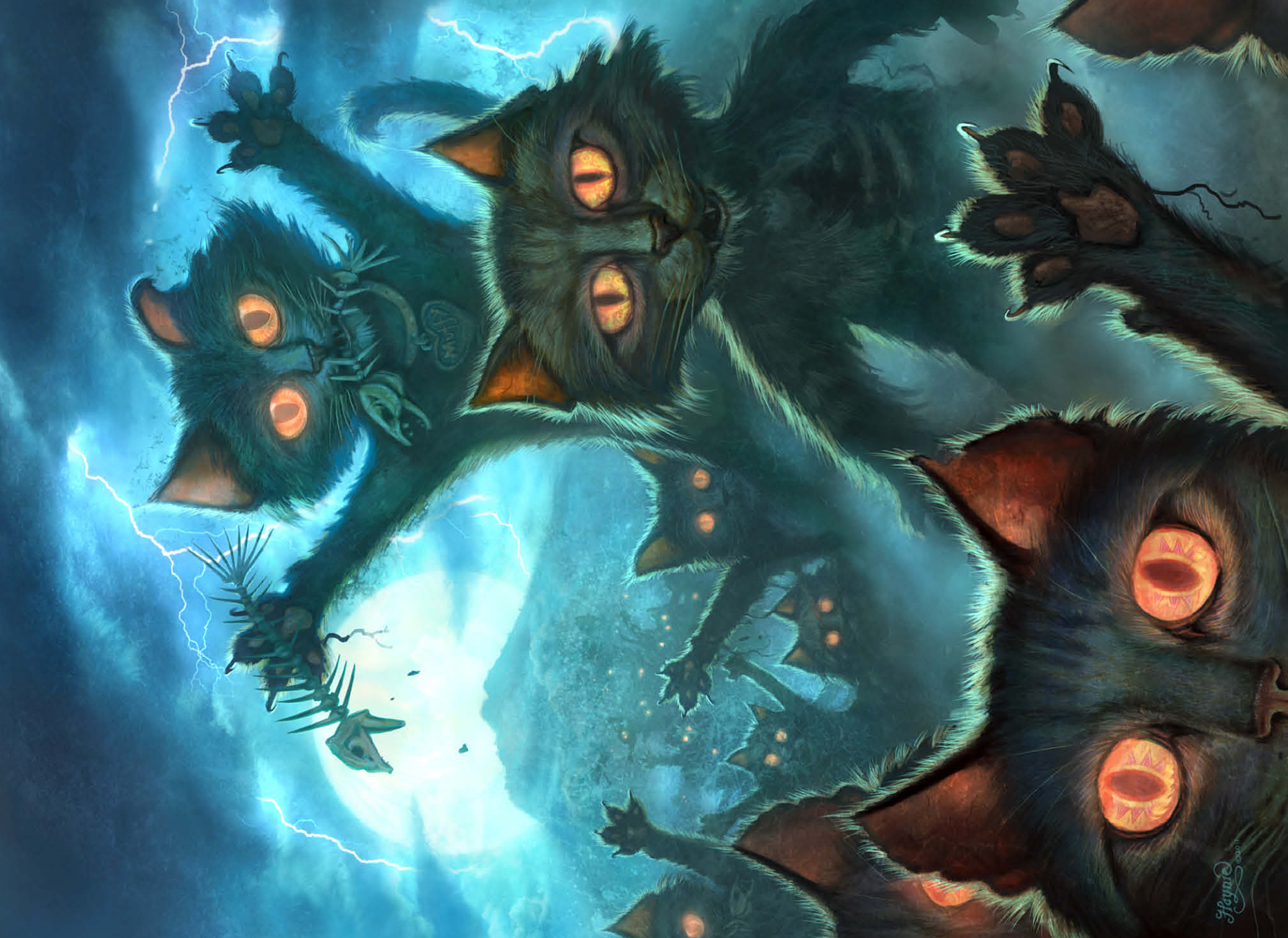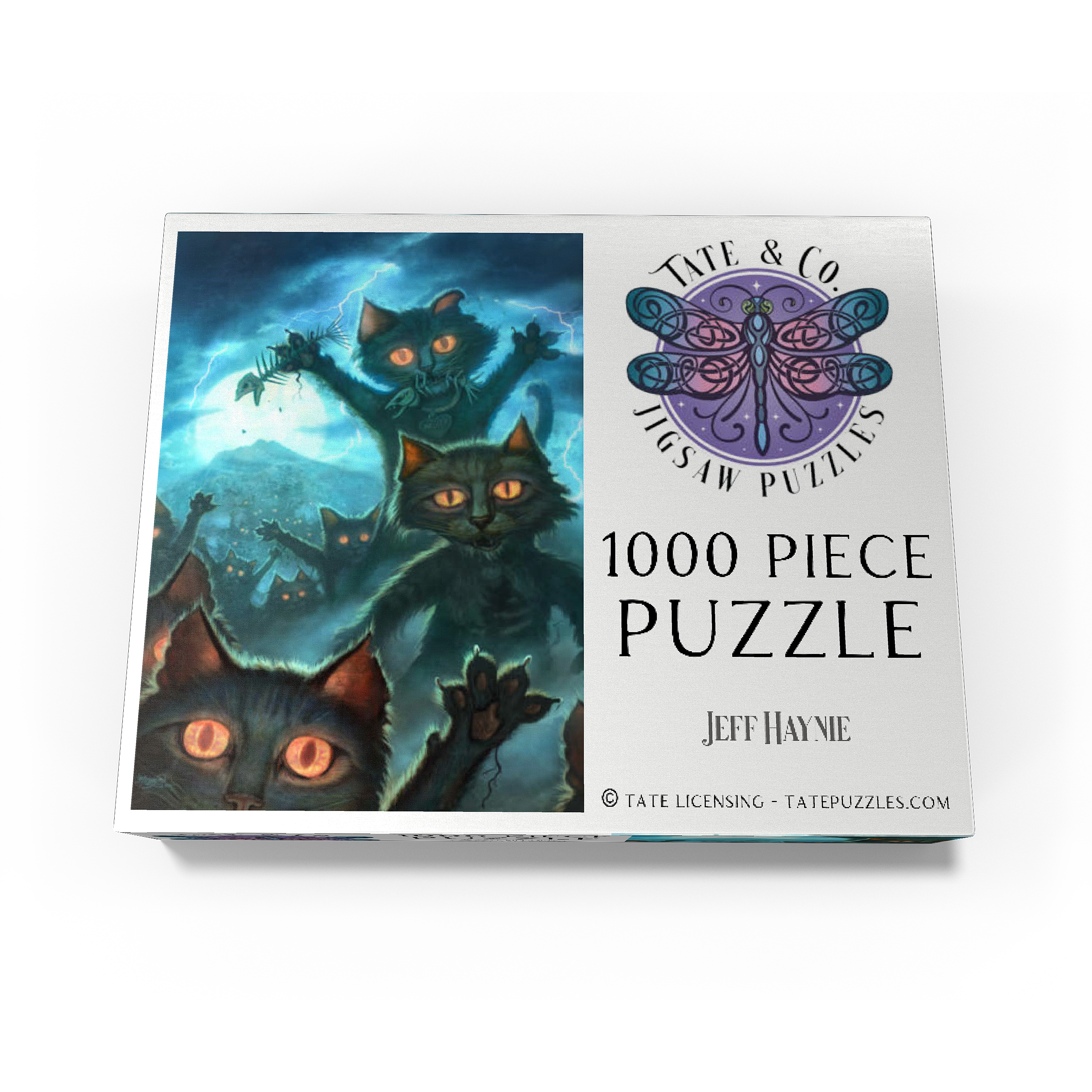 In Jeff Haynie's artwork, an army of ominous zombie cats with glowing orange eyes emerges beneath a stormy, full-moon night, creating a sense of eerie anticipation. The artwork features a multitude of dark grey cats, some partially skeletal, with bright orange eyes that dominate the foreground and midground, the background reveals a foggy village scene beneath a glowing full moon as lightning cracks across the sky. One cat holds up a fish skeleton triumphantly, while others raise their paws menacingly. The atmosphere is haunting and suspenseful, invoking a whimsical yet fearful mood, typical of Halloween themes, and uses a palette of cool blues and greys contrasted by the warm glow of the cats' eyes.