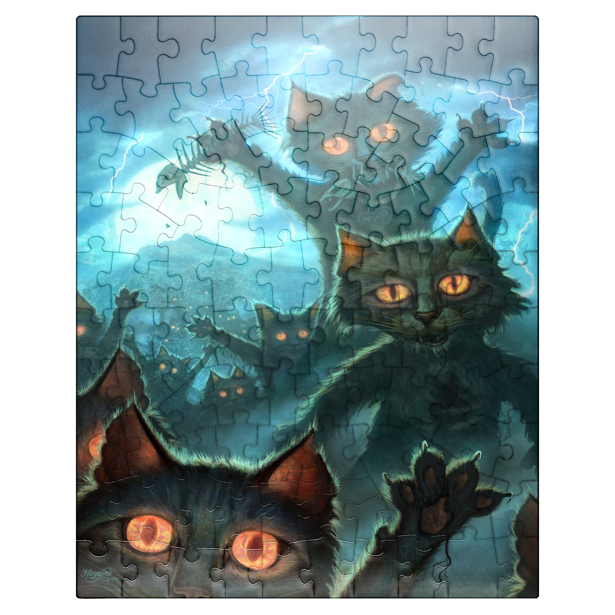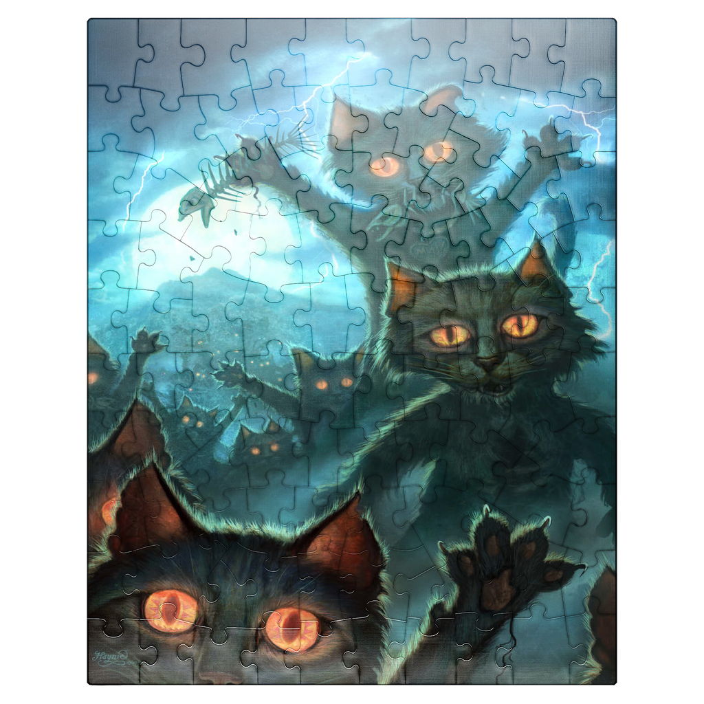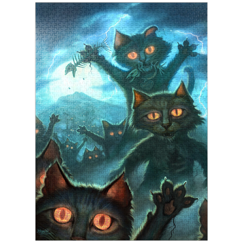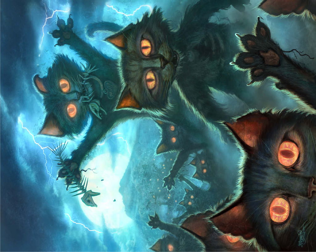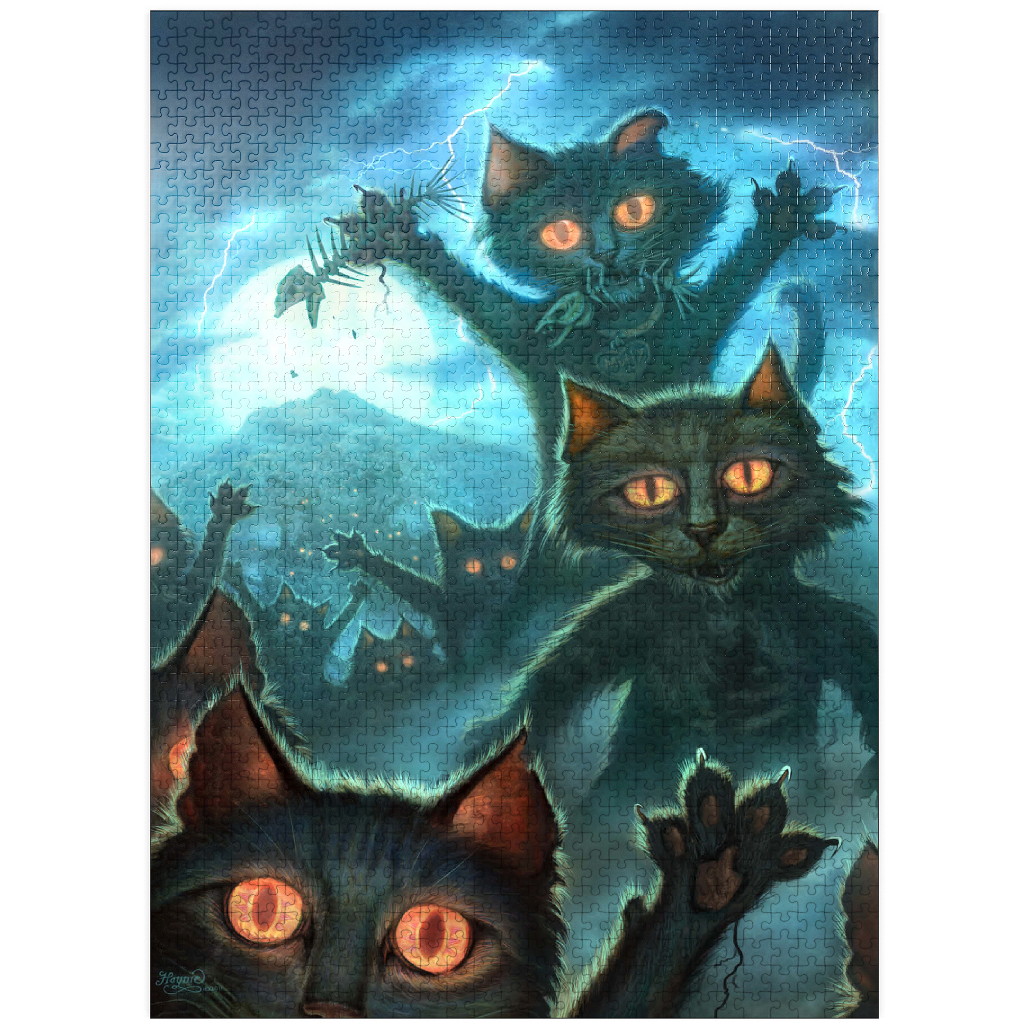 In Jeff Haynie's artwork, an army of ominous zombie cats with glowing orange eyes emerges beneath a stormy, full-moon night, creating a sense of eerie anticipation. The artwork features a multitude of dark grey cats, some partially skeletal, with bright orange eyes that dominate the foreground and midground, the background reveals a foggy village scene beneath a glowing full moon as lightning cracks across the sky. One cat holds up a fish skeleton triumphantly, while others raise their paws menacingly. The atmosphere is haunting and suspenseful, invoking a whimsical yet fearful mood, typical of Halloween themes, and uses a palette of cool blues and greys contrasted by the warm glow of the cats' eyes.