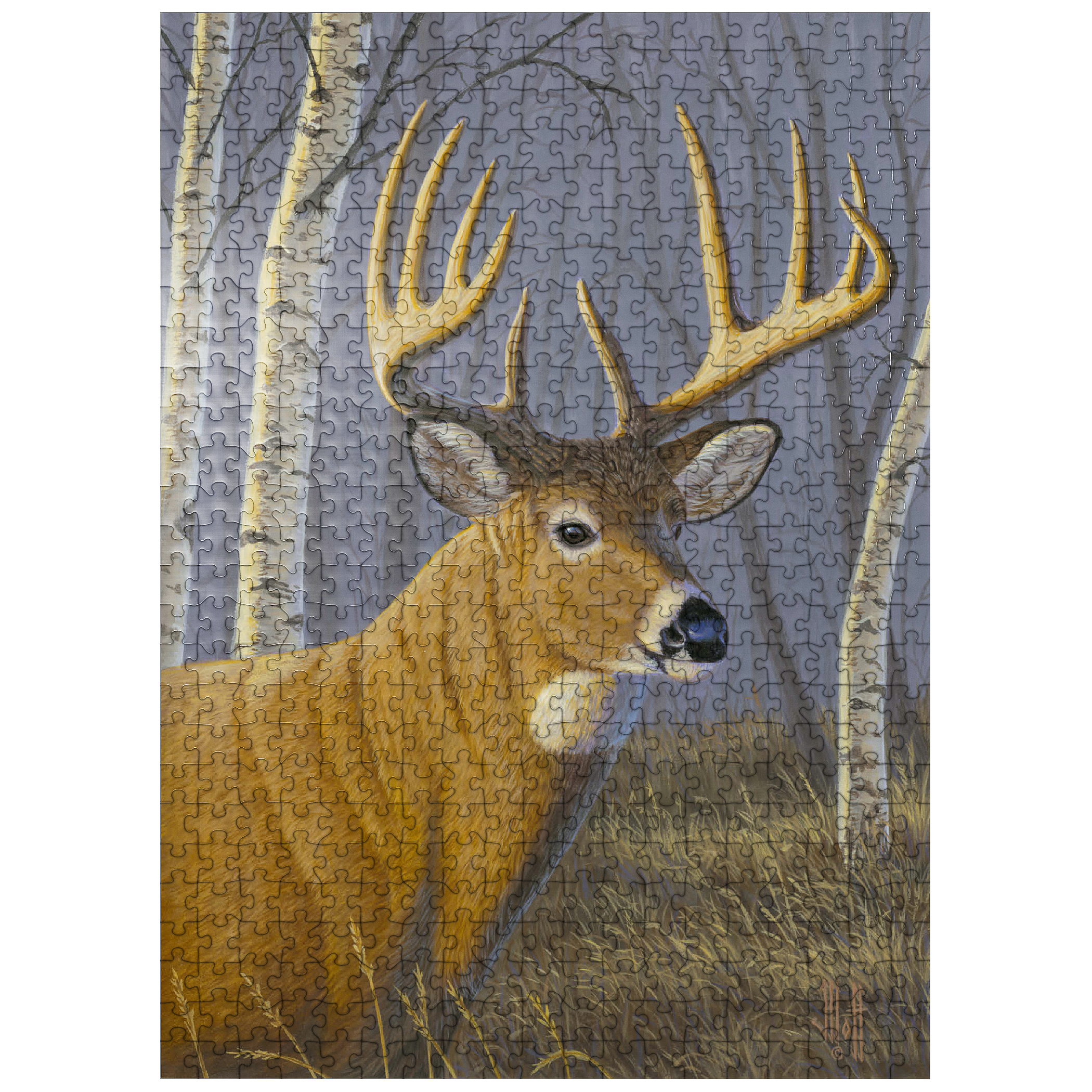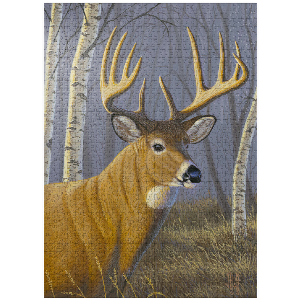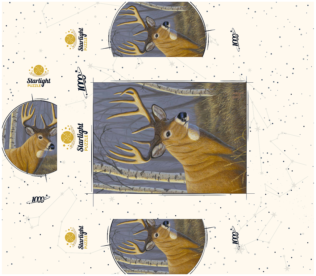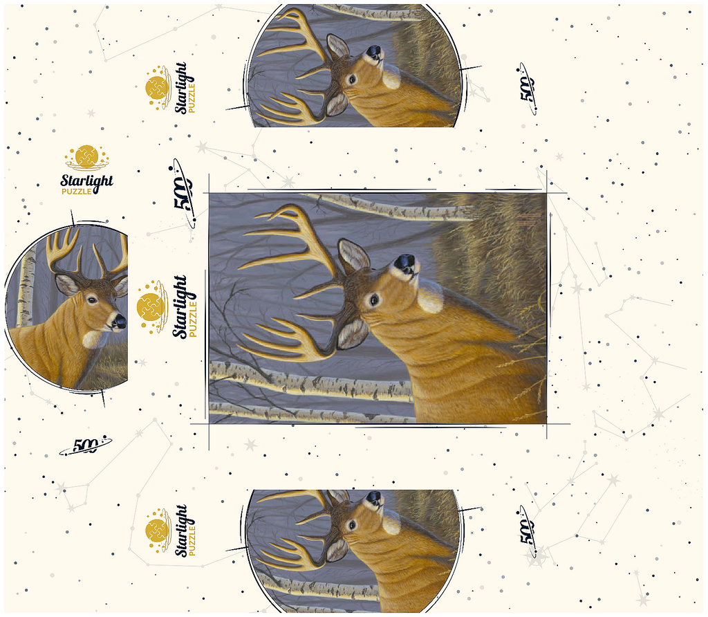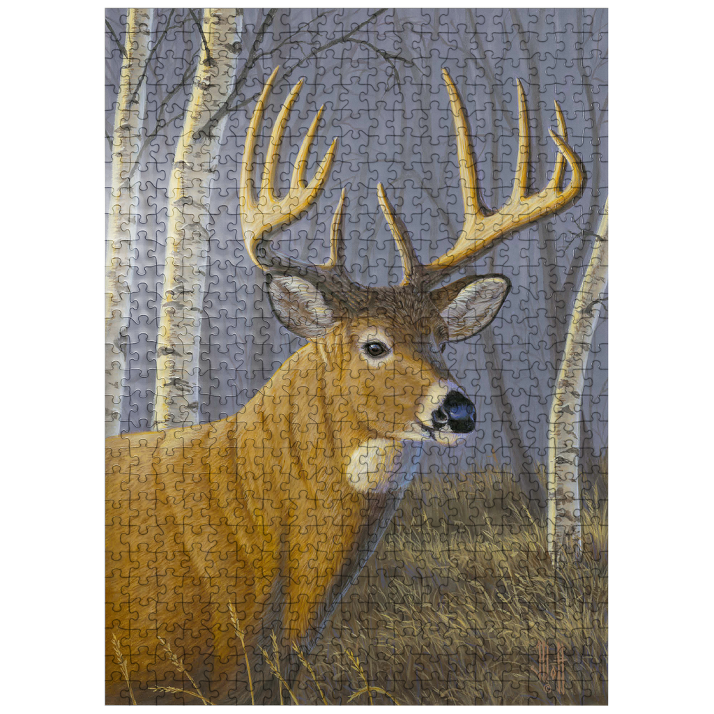 This captivating artwork depicts a majestic buck standing proudly in a serene birch forest. The deer's impressive antlers are beautifully detailed, contrasting against the soft, muted tones of the woodland background. With its golden-brown coat and alert expression, the buck exudes strength and elegance. The birch trees, with their white bark and delicate branches, create a tranquil atmosphere that enhances the natural beauty of the scene. This piece is a tribute to wildlife and the peaceful harmony of nature, making it a perfect addition for art lovers and nature enthusiasts alike.