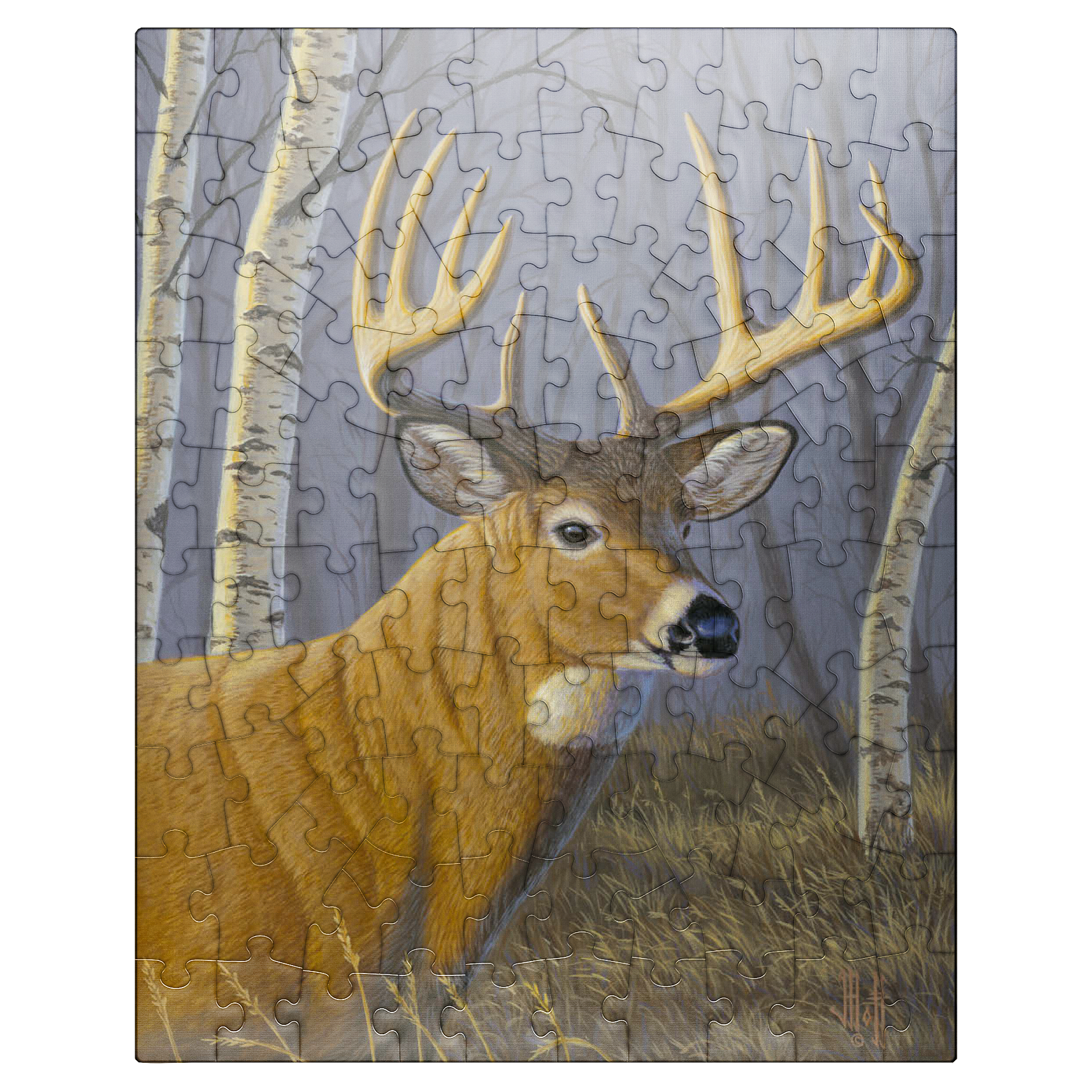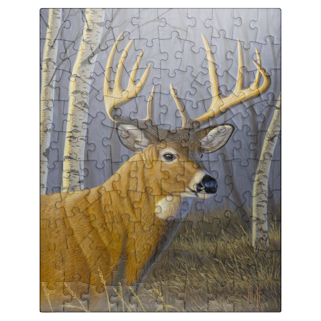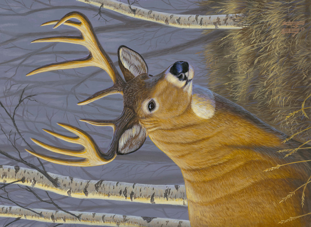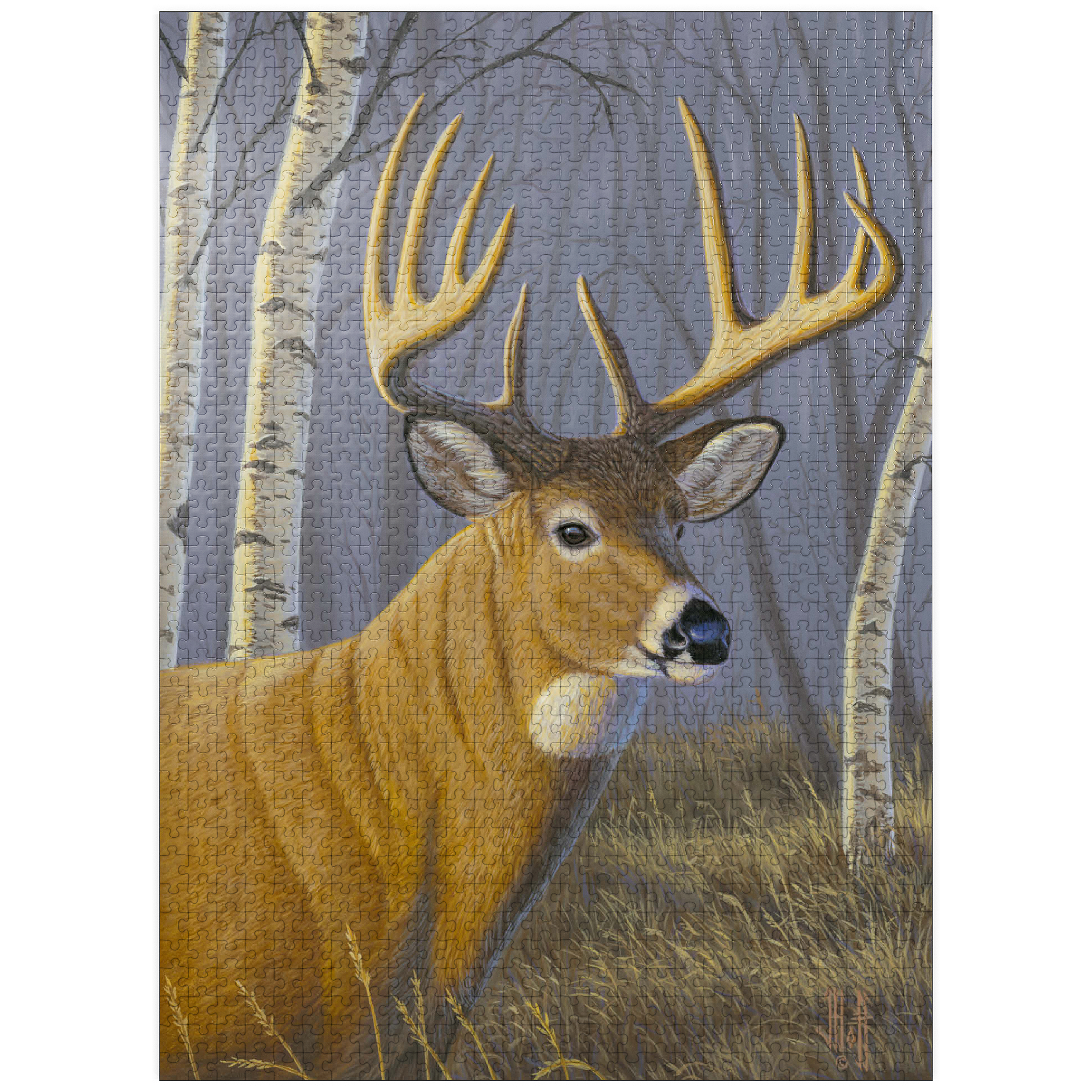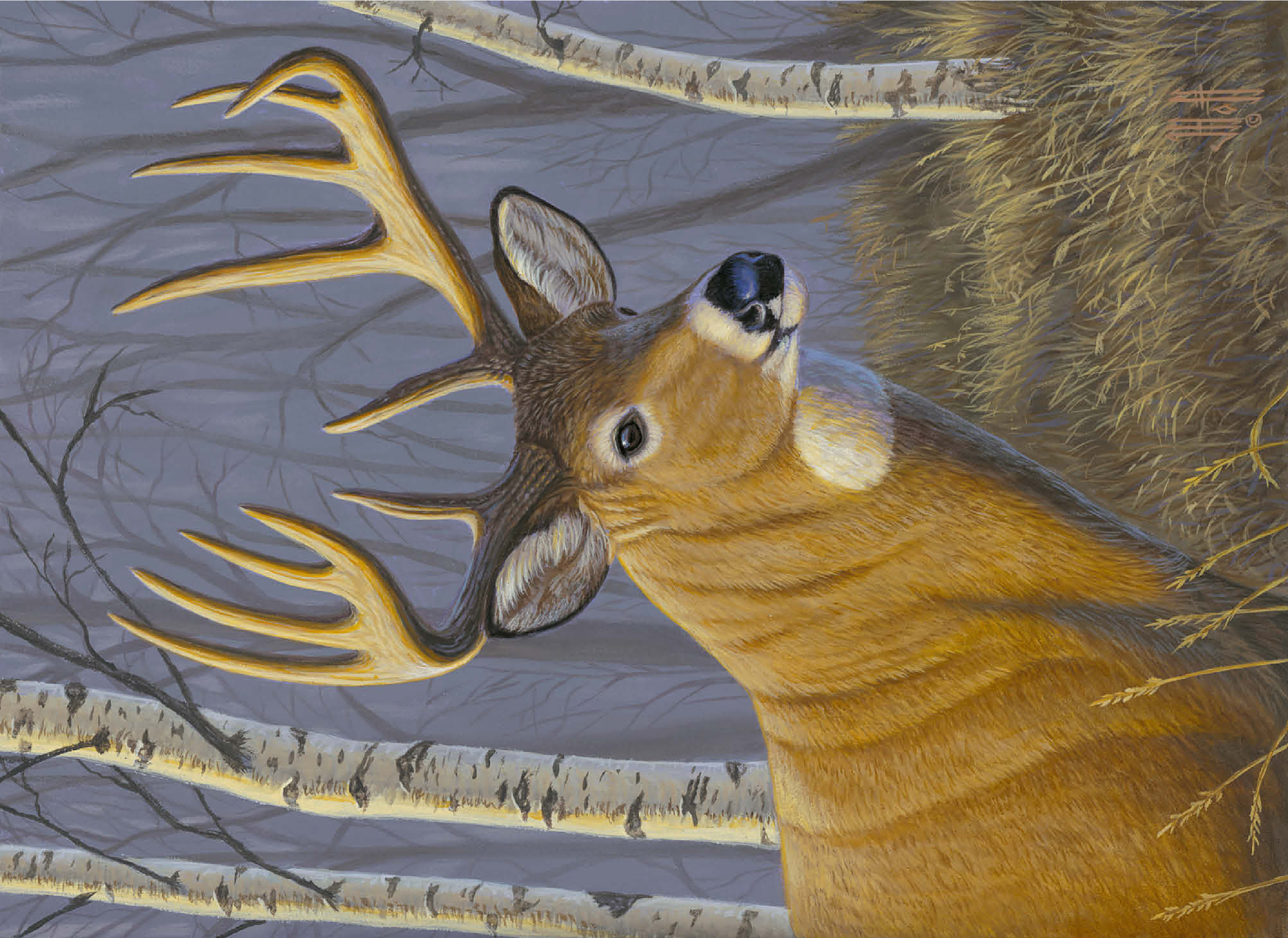 This captivating artwork depicts a majestic buck standing proudly in a serene birch forest. The deer's impressive antlers are beautifully detailed, contrasting against the soft, muted tones of the woodland background. With its golden-brown coat and alert expression, the buck exudes strength and elegance. The birch trees, with their white bark and delicate branches, create a tranquil atmosphere that enhances the natural beauty of the scene. This piece is a tribute to wildlife and the peaceful harmony of nature, making it a perfect addition for art lovers and nature enthusiasts alike.