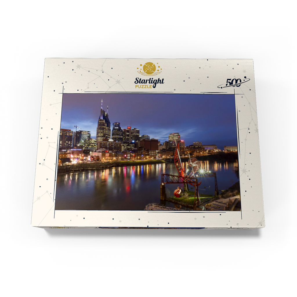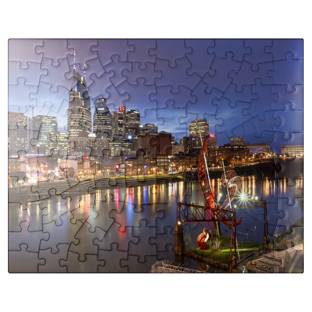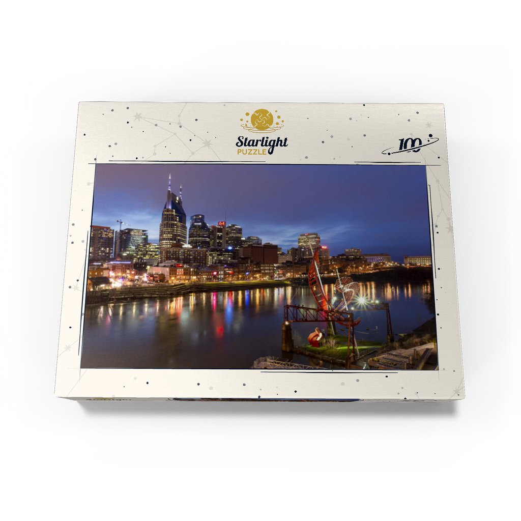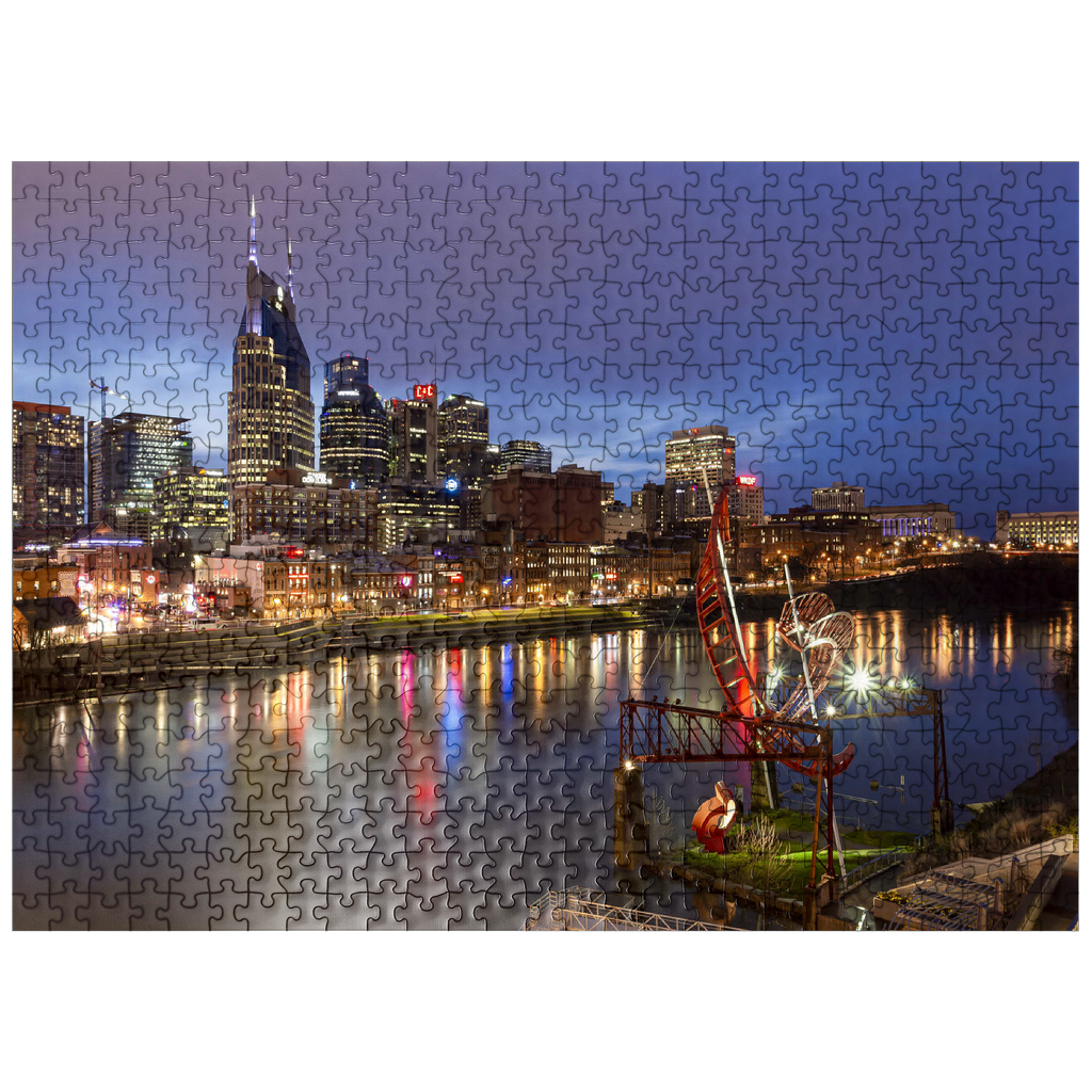 This stunning evening view showcases the illuminated Nashville skyline, Tennessee, with its iconic AT&T Building—popularly known as the “Batman Building”—standing prominently in the cityscape. The lights of downtown Nashville reflect vibrantly off the Cumberland River, capturing the essence of Music City's energetic nightlife. In the foreground, the striking red "Ghost Ballet for the East Bank Machineworks" sculpture adds an artistic touch to the riverbank. The image includes the bustling Broadway entertainment district, known for its legendary live music venues, restaurants, and honky-tonk bars. With its combination of modern architecture, creative public art, and historic southern charm, this image perfectly encapsulates the urban vibrancy and cultural soul of Nashville. Ideal for showcasing city travel, urban design, or Southern U.S. destinations, this photo evokes a sense of motion, energy, and allure.