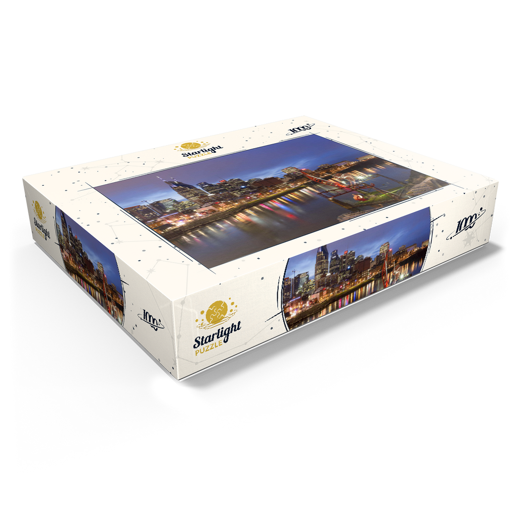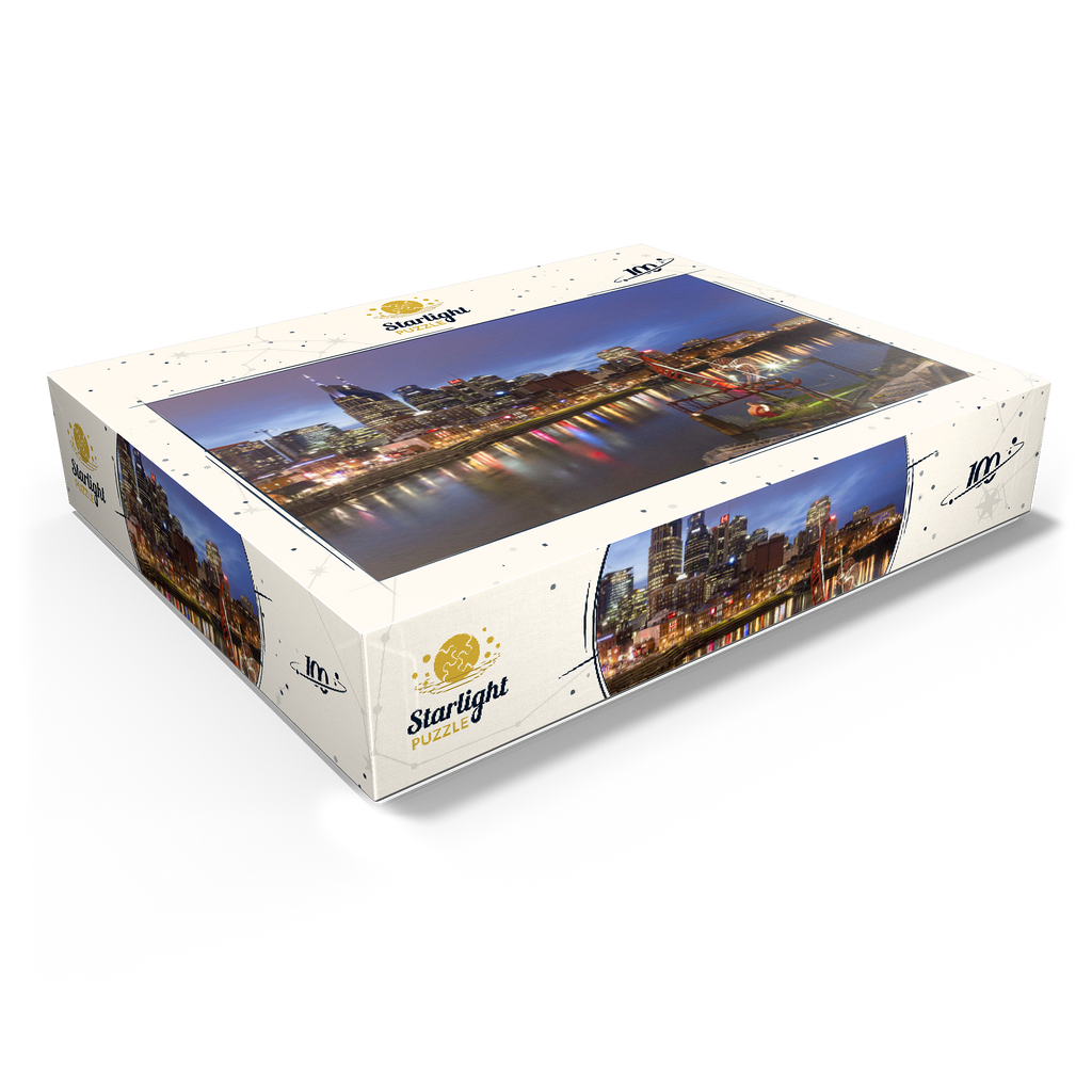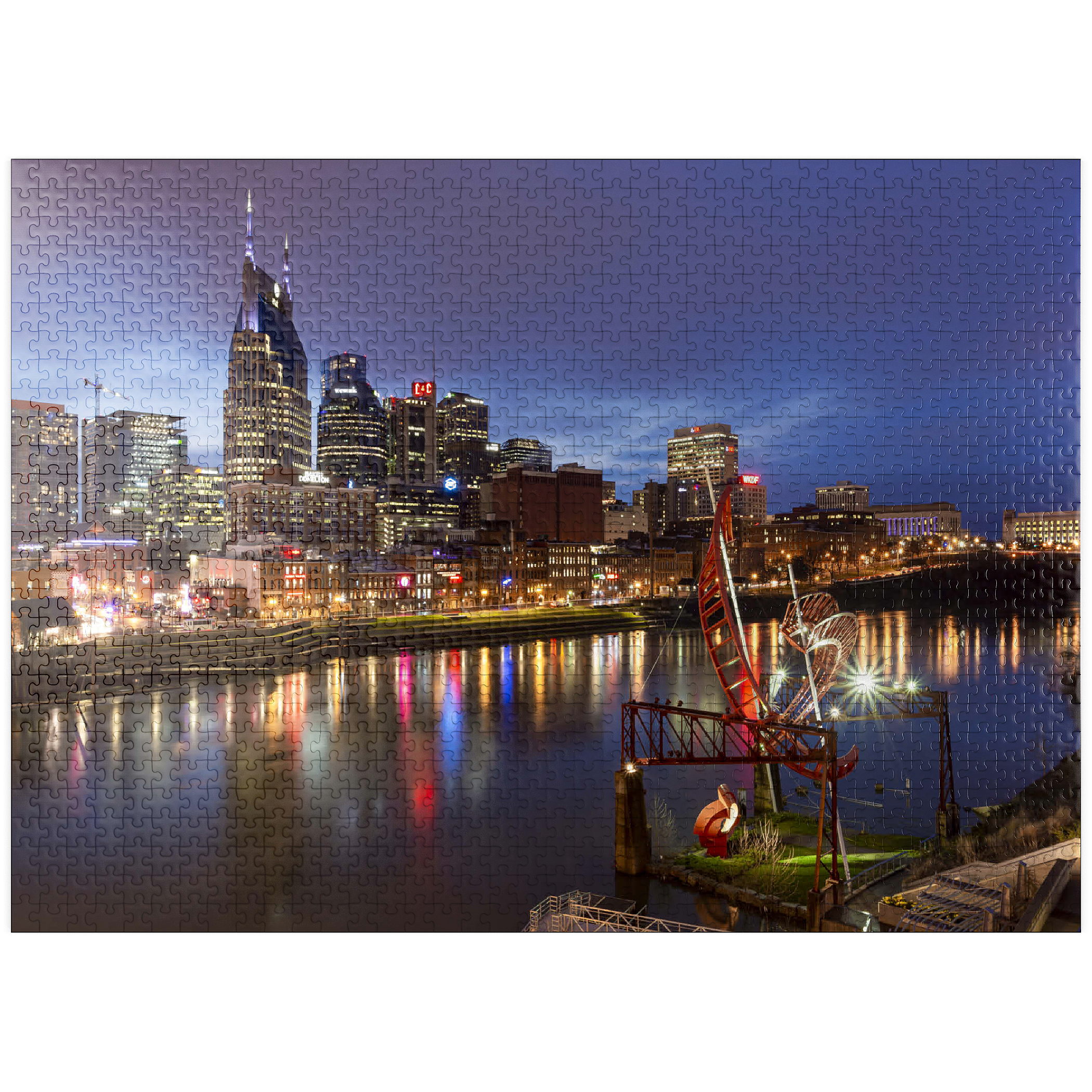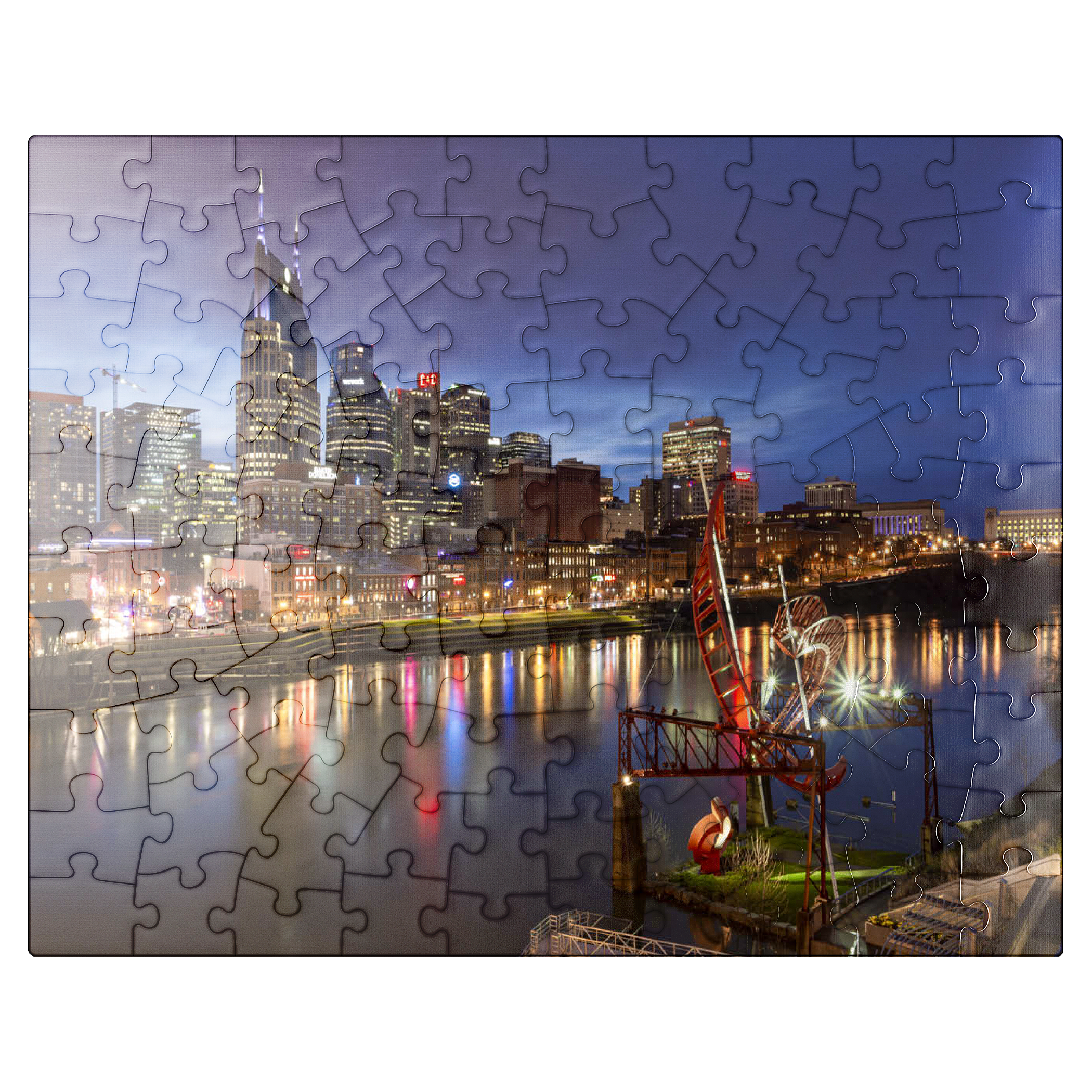This stunning evening view showcases the illuminated Nashville skyline, Tennessee, with its iconic AT&T Building—popularly known as the “Batman Building”—standing prominently in the cityscape. The lights of downtown Nashville reflect vibrantly off the Cumberland River, capturing the essence of Music City's energetic nightlife. In the foreground, the striking red "Ghost Ballet for the East Bank Machineworks" sculpture adds an artistic touch to the riverbank. The image includes the bustling Broadway entertainment district, known for its legendary live music venues, restaurants, and honky-tonk bars. With its combination of modern architecture, creative public art, and historic southern charm, this image perfectly encapsulates the urban vibrancy and cultural soul of Nashville. Ideal for showcasing city travel, urban design, or Southern U.S. destinations, this photo evokes a sense of motion, energy, and allure.
