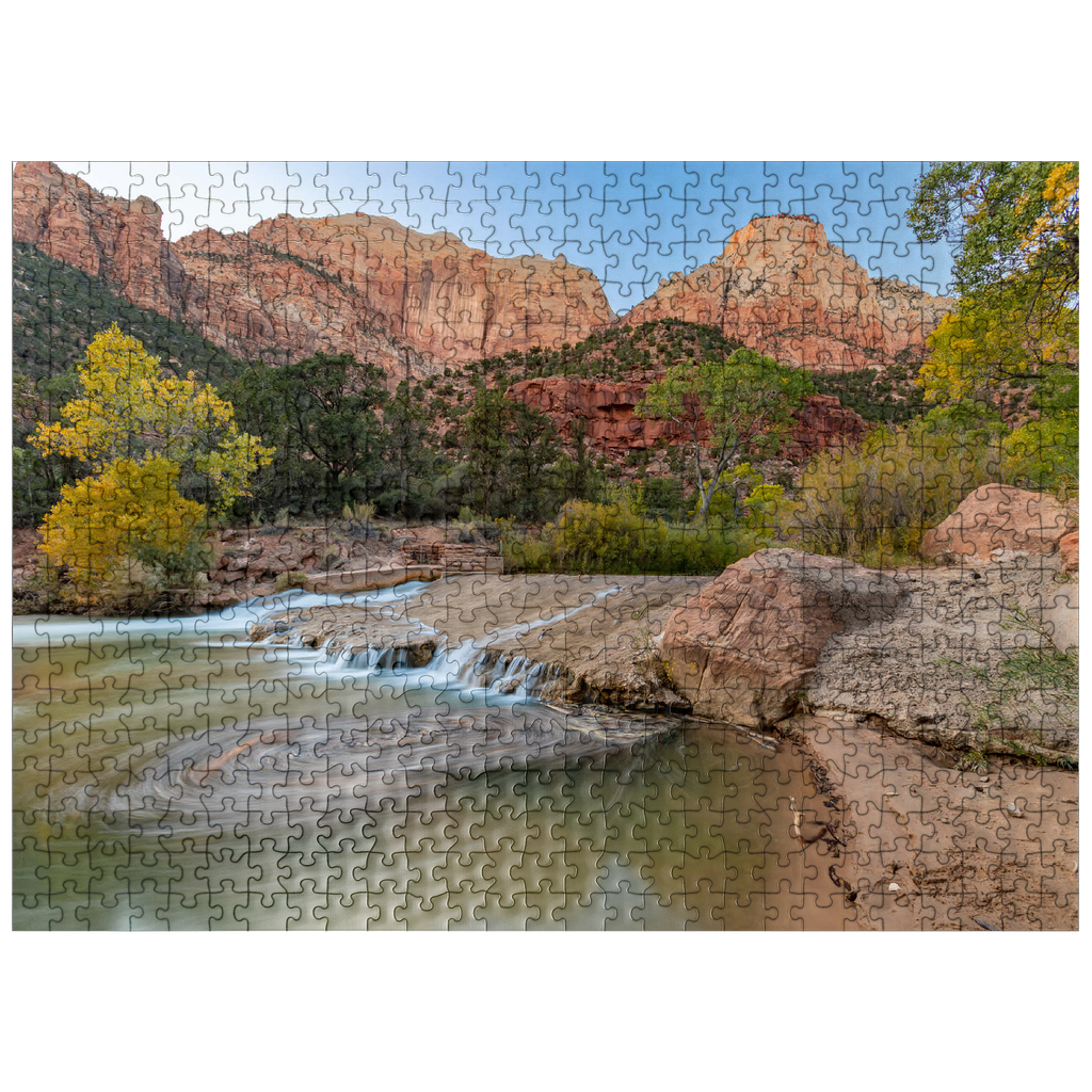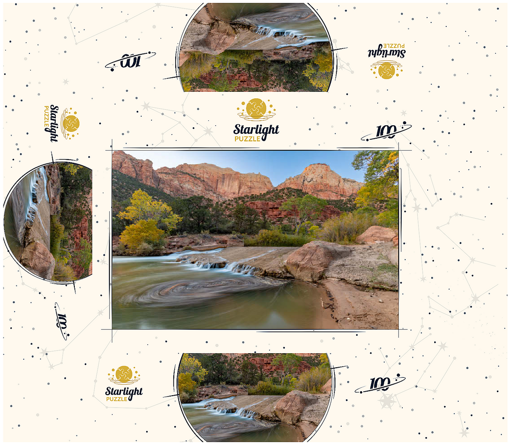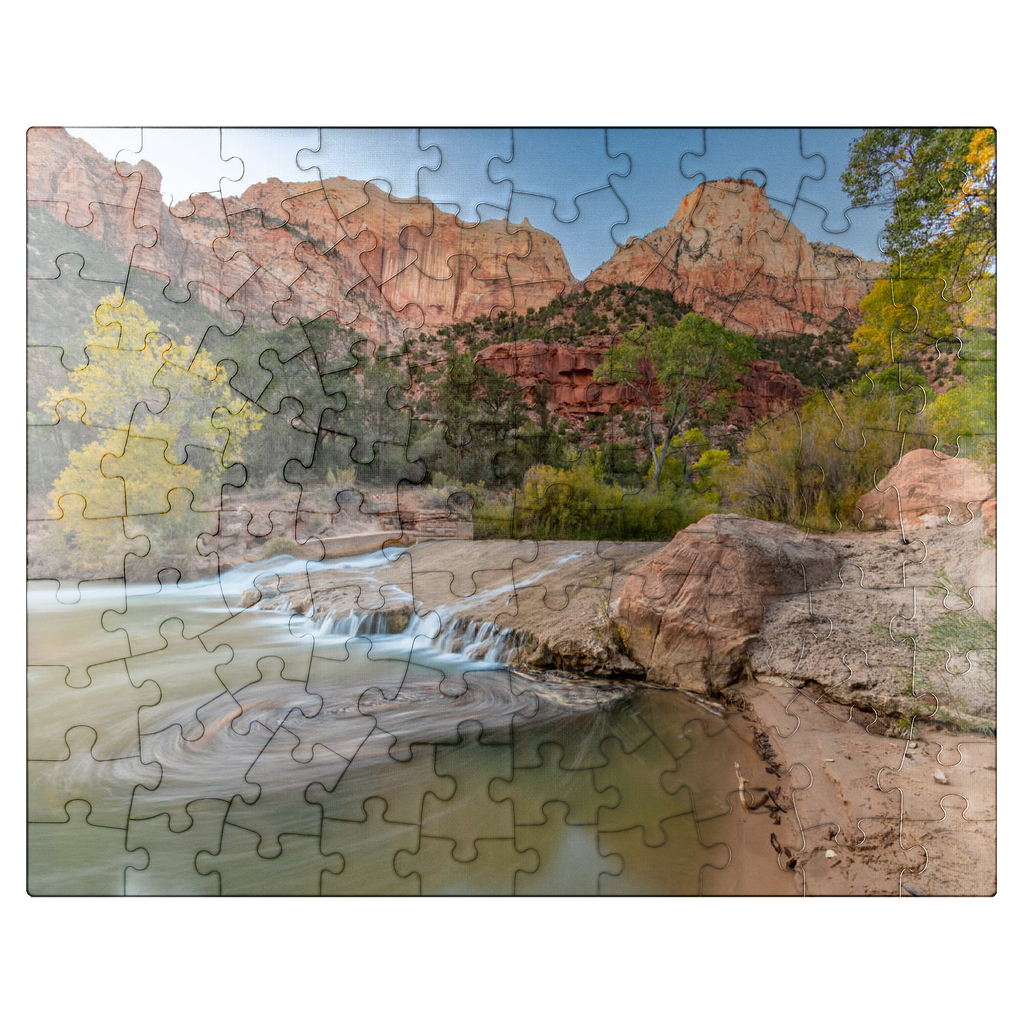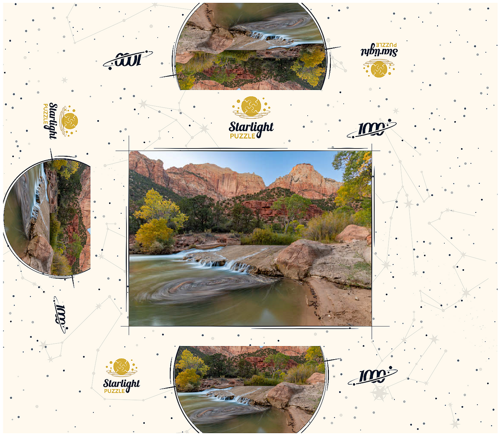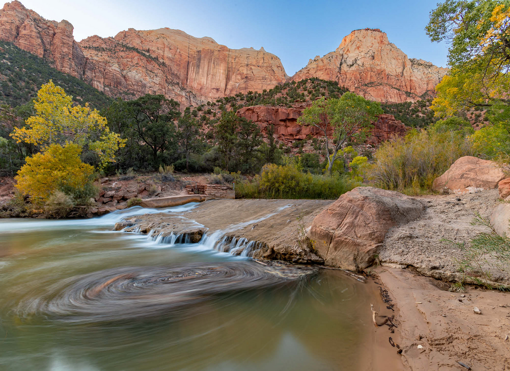 This picturesque scene captures the Virgin River flowing through Zion National Park in Utah, with its gentle cascades and swirling currents. The towering red sandstone cliffs rise dramatically in the background, showcasing the park's iconic geological formations. The golden hues of the trees contrast beautifully with the rugged terrain, highlighting the serene yet powerful landscape. Zion's diverse ecosystem and unique rock formations make it a favorite destination for nature lovers and photographers.