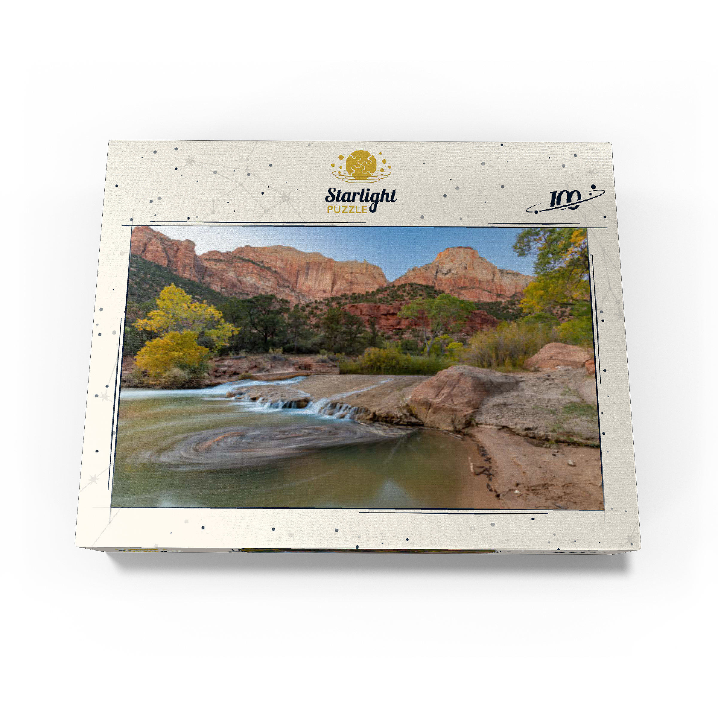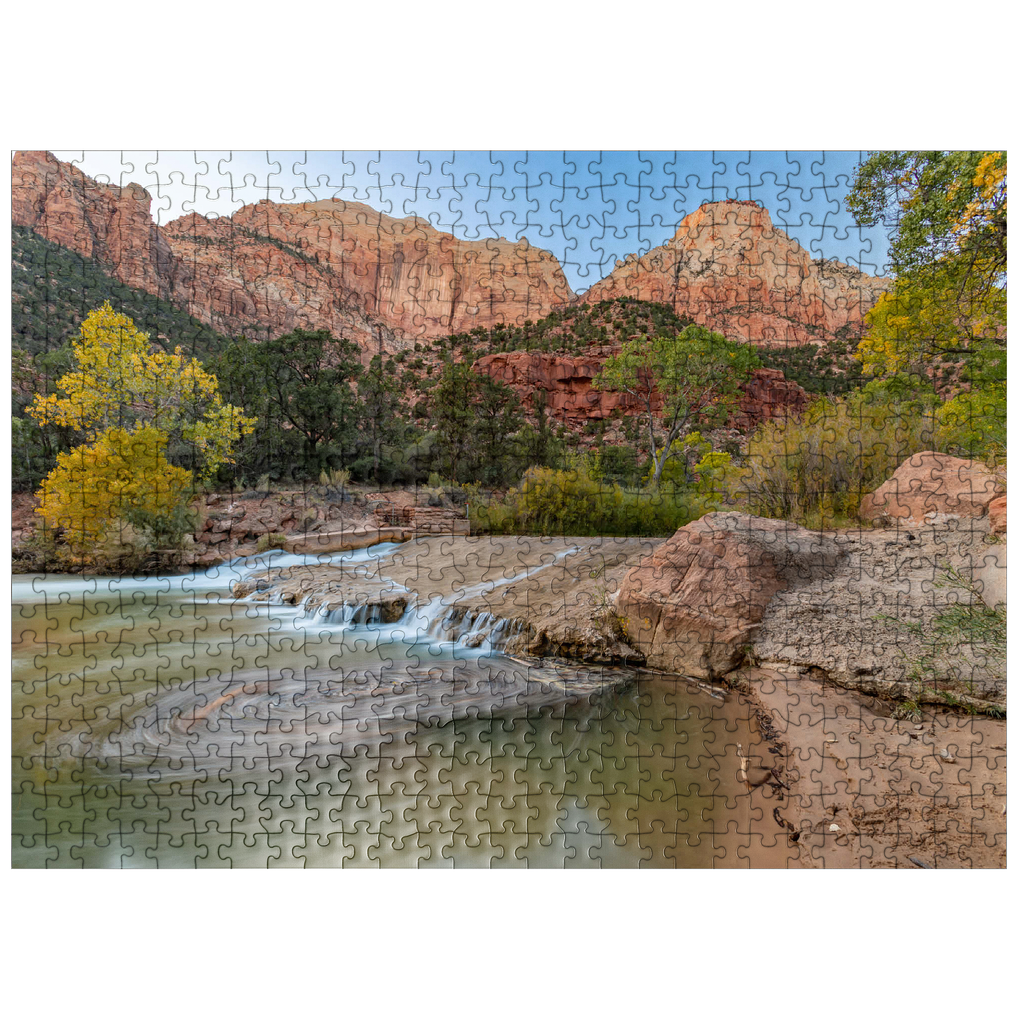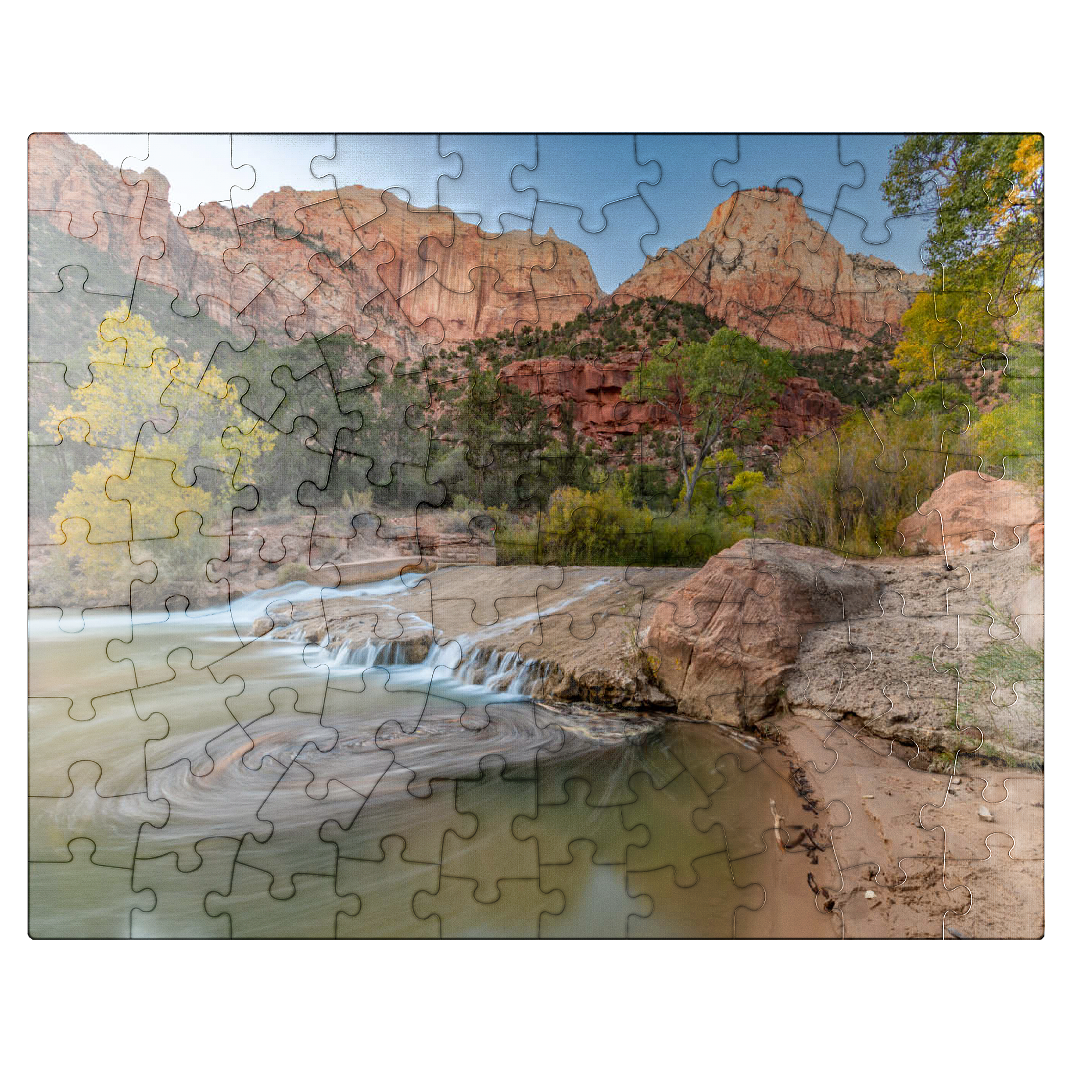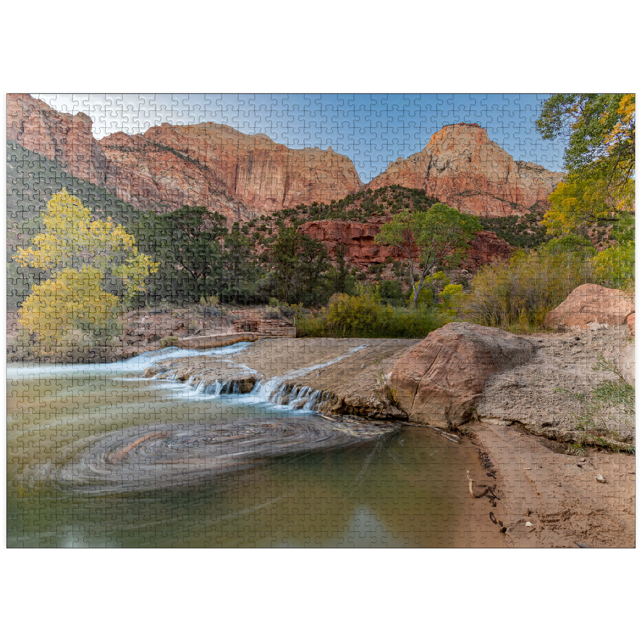 This picturesque scene captures the Virgin River flowing through Zion National Park in Utah, with its gentle cascades and swirling currents. The towering red sandstone cliffs rise dramatically in the background, showcasing the park's iconic geological formations. The golden hues of the trees contrast beautifully with the rugged terrain, highlighting the serene yet powerful landscape. Zion's diverse ecosystem and unique rock formations make it a favorite destination for nature lovers and photographers.