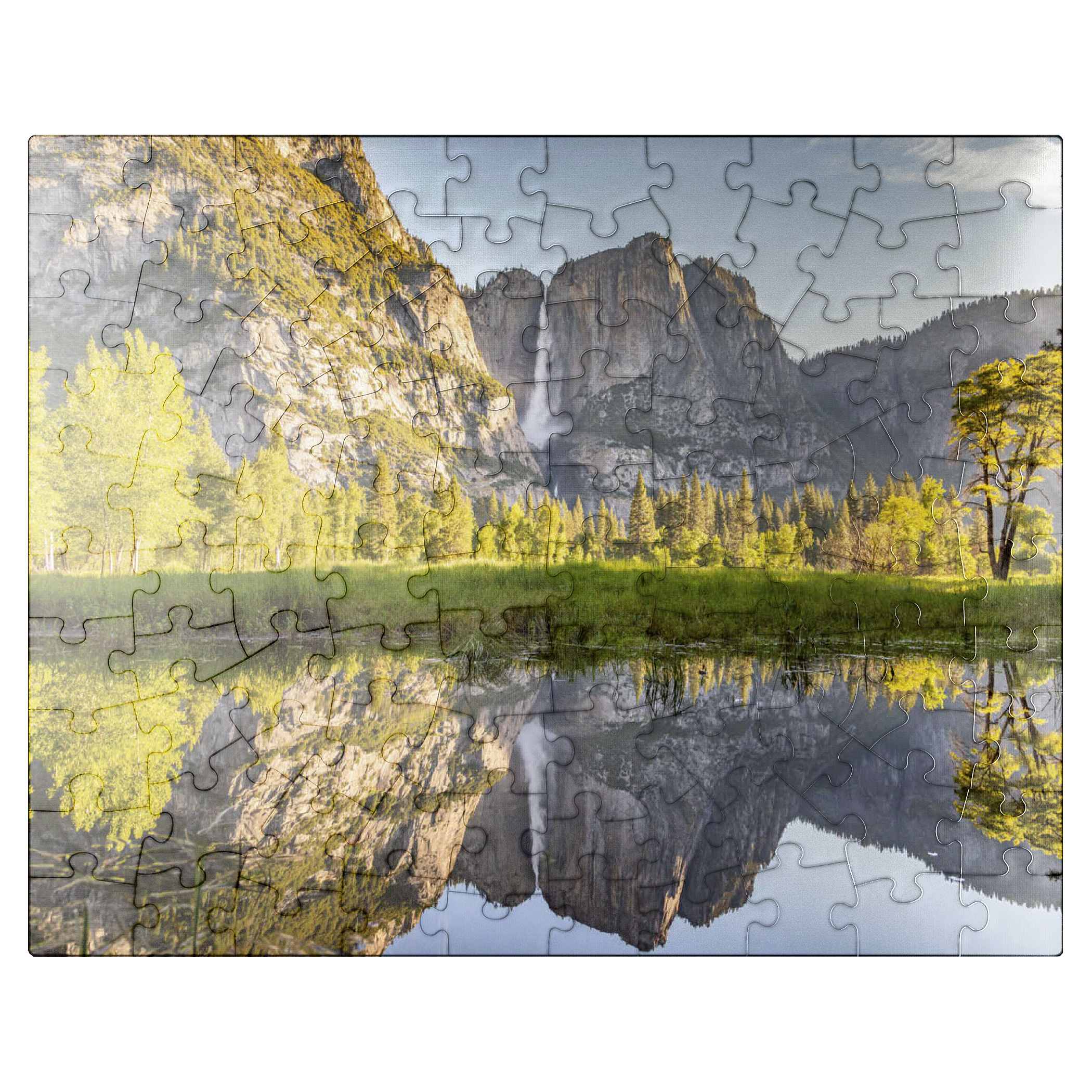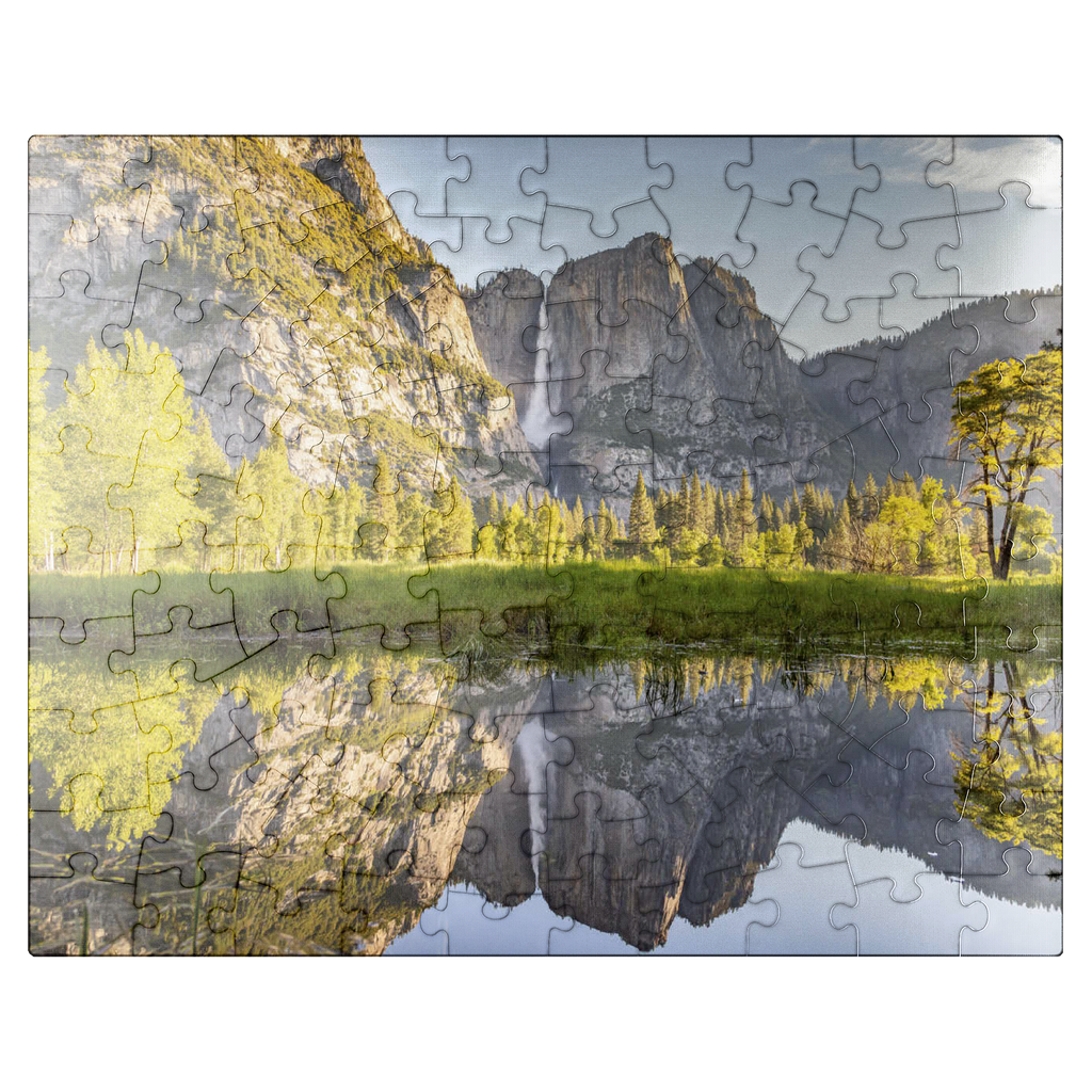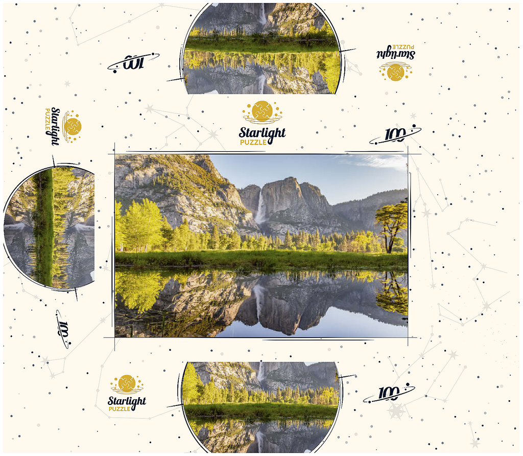 Yosemite Falls, one of the tallest waterfalls in North America, cascades dramatically down the granite cliffs of Yosemite National Park in California. The waterfall consists of three sections: Upper Yosemite Fall, the Middle Cascades, and Lower Yosemite Fall. During spring and early summer, the falls are at their peak flow, fed by the melting snow from the Sierra Nevada mountains. The mirror-like reflection in the calm waters adds to the breathtaking beauty of the scene. Surrounded by lush greenery and towering pines, this iconic landmark draws visitors from around the world.
