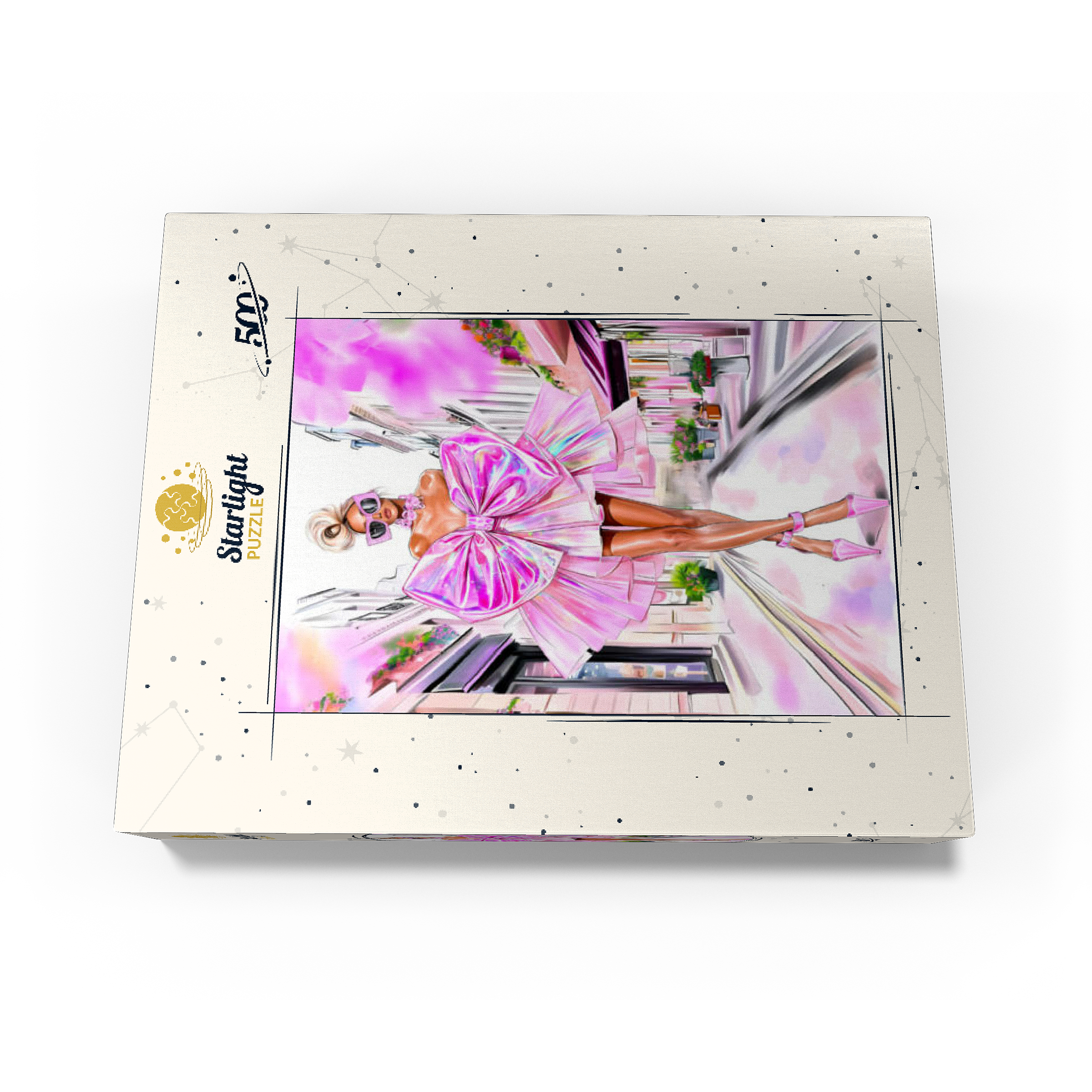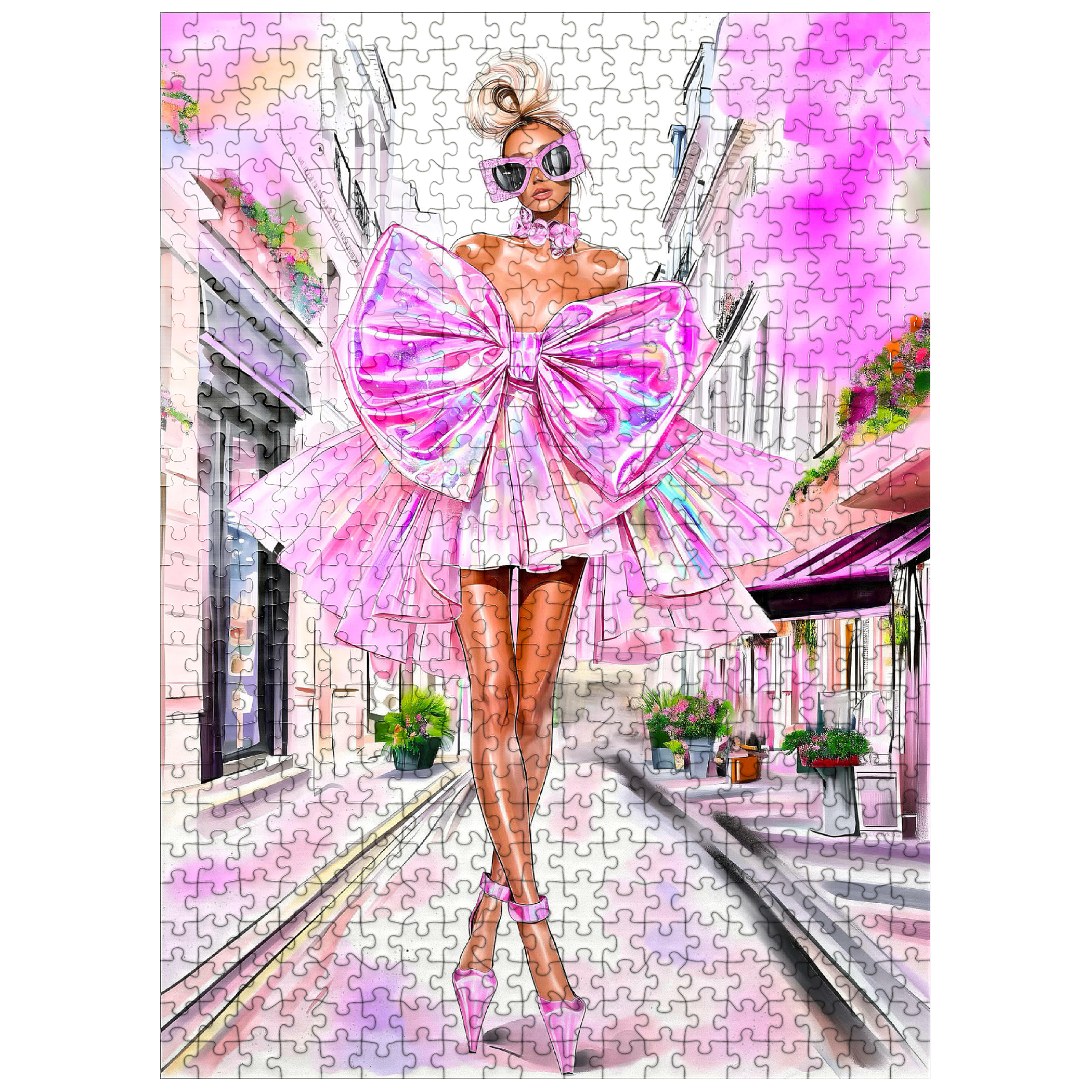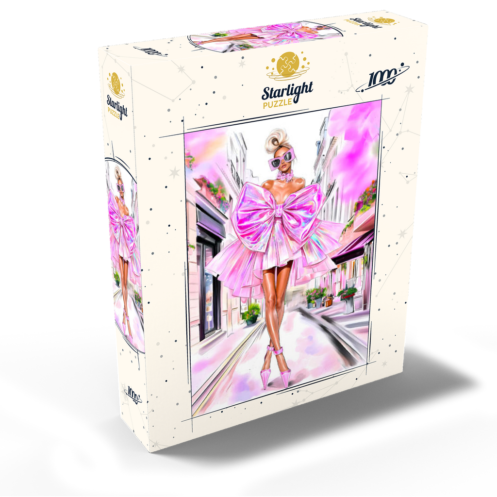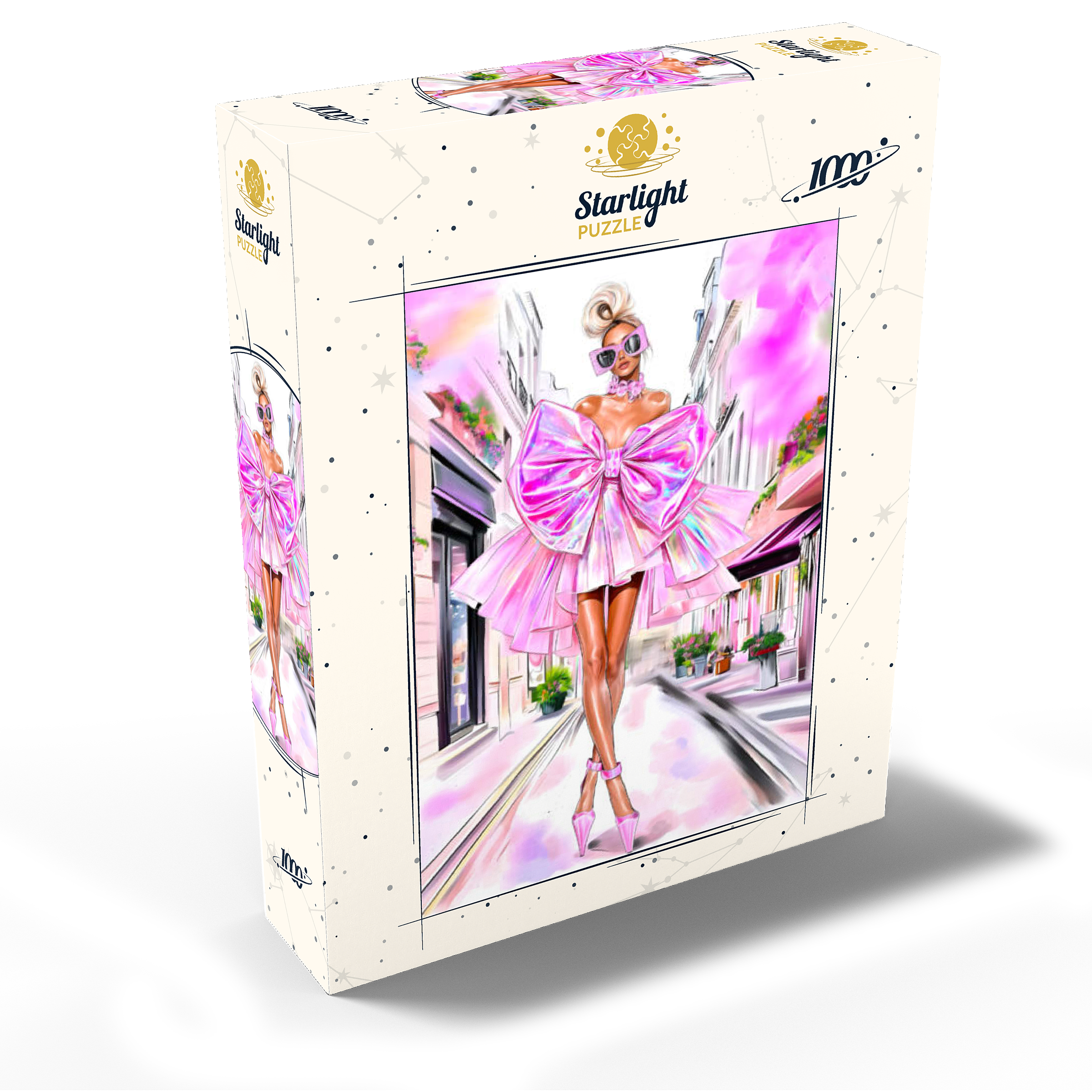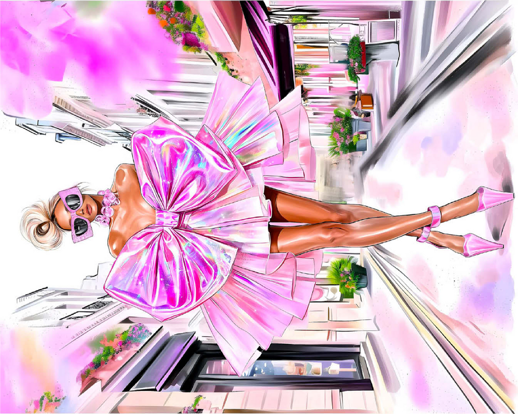 This stunning fashion illustration captures the essence of high-end couture and street-style glamour. A stylish model is adorned in an iridescent pink dress with an oversized bow, radiating elegance and confidence. The background features a charming cityscape with floral details and boutique-lined streets, emphasizing a chic and vibrant aesthetic. The playful use of soft pastel tones and bold highlights adds a modern, artistic touch to the design. Perfectly blending urban sophistication and avant-garde fashion, this artwork is a celebration of creativity and luxury.