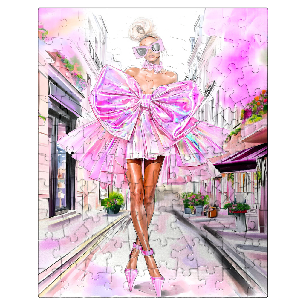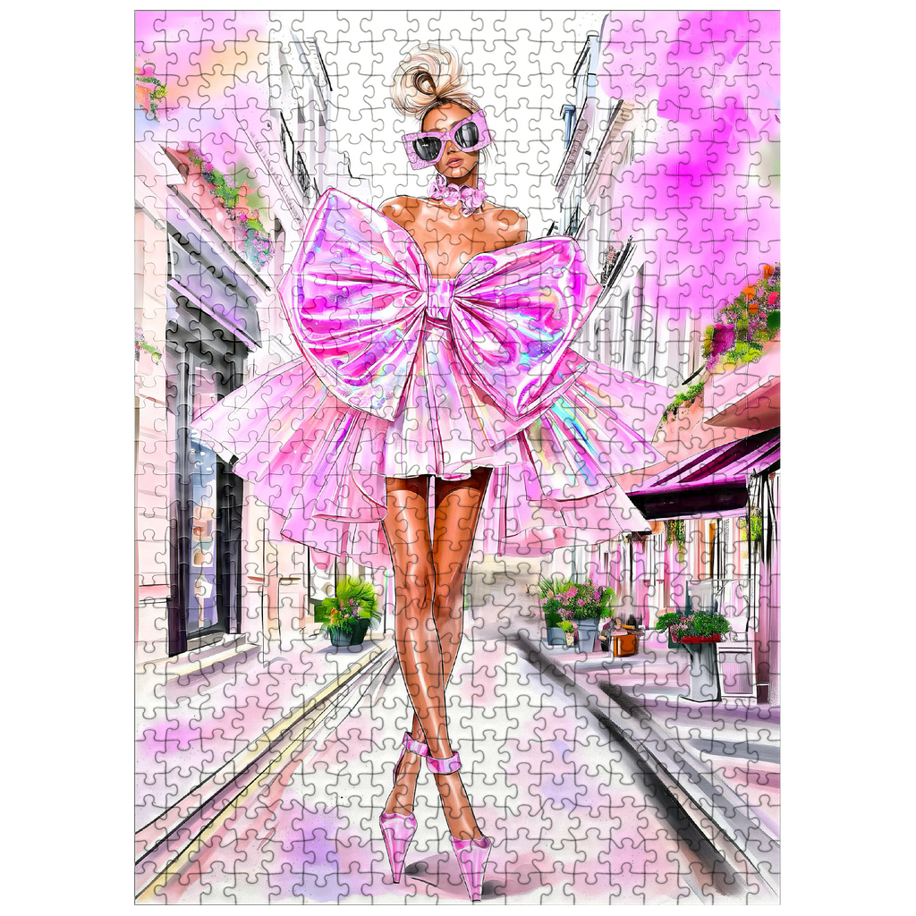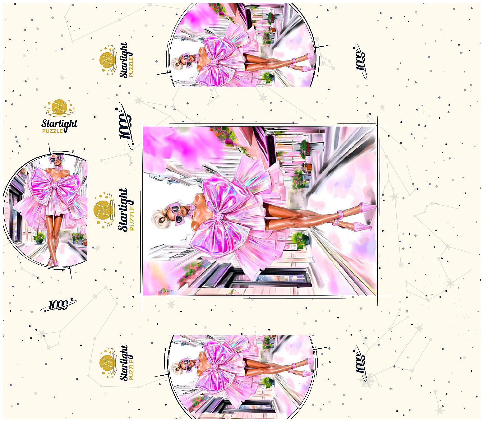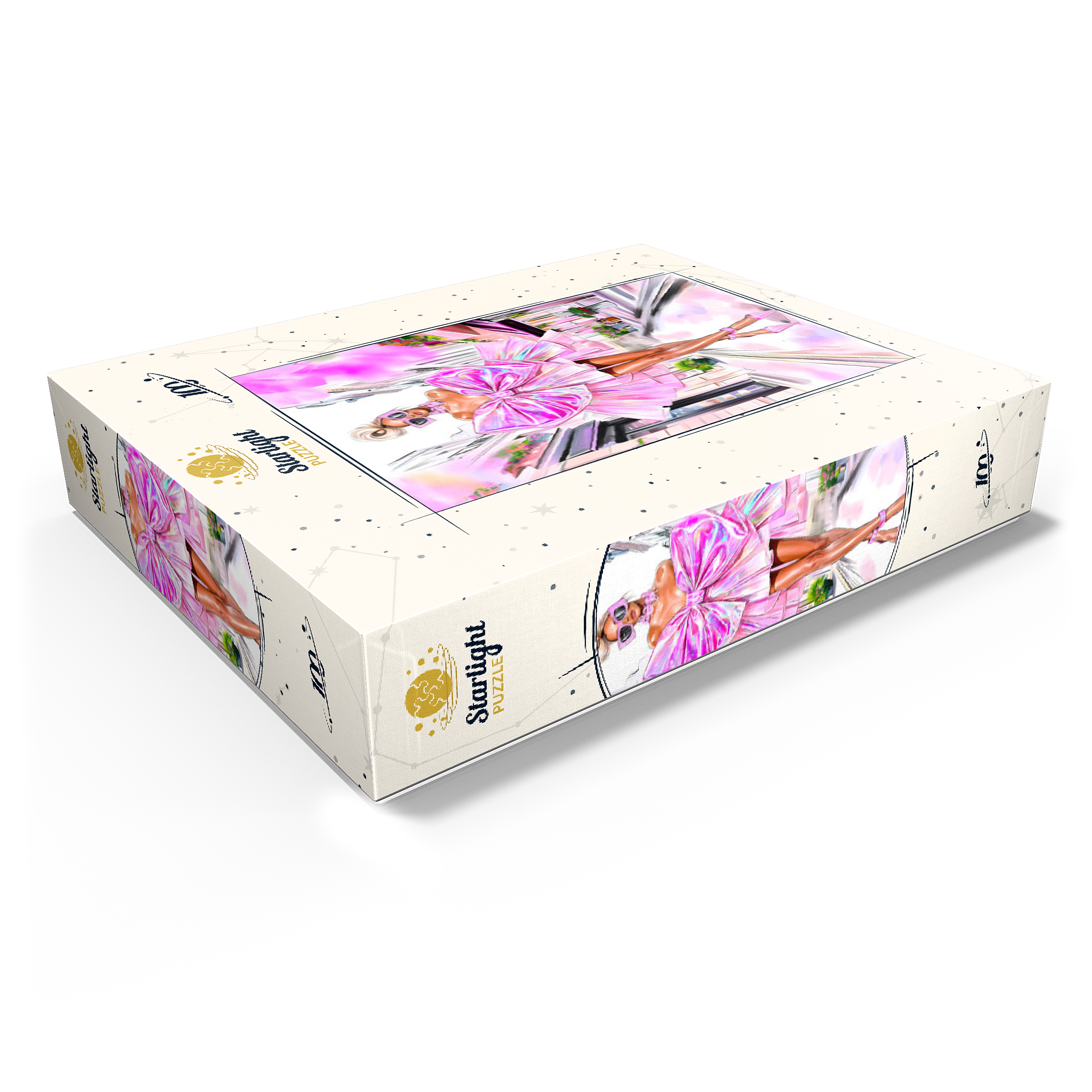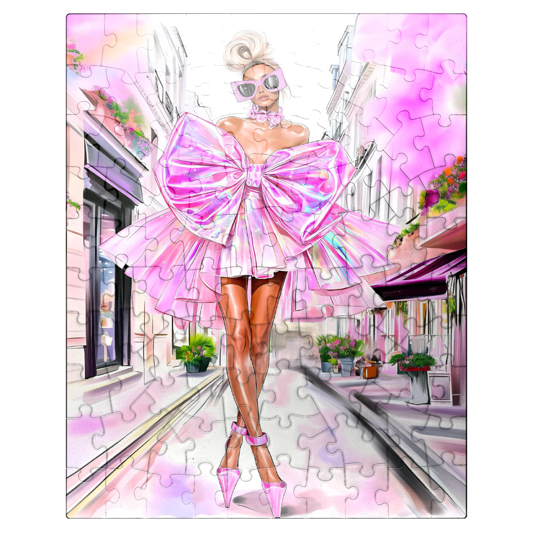 This stunning fashion illustration captures the essence of high-end couture and street-style glamour. A stylish model is adorned in an iridescent pink dress with an oversized bow, radiating elegance and confidence. The background features a charming cityscape with floral details and boutique-lined streets, emphasizing a chic and vibrant aesthetic. The playful use of soft pastel tones and bold highlights adds a modern, artistic touch to the design. Perfectly blending urban sophistication and avant-garde fashion, this artwork is a celebration of creativity and luxury.