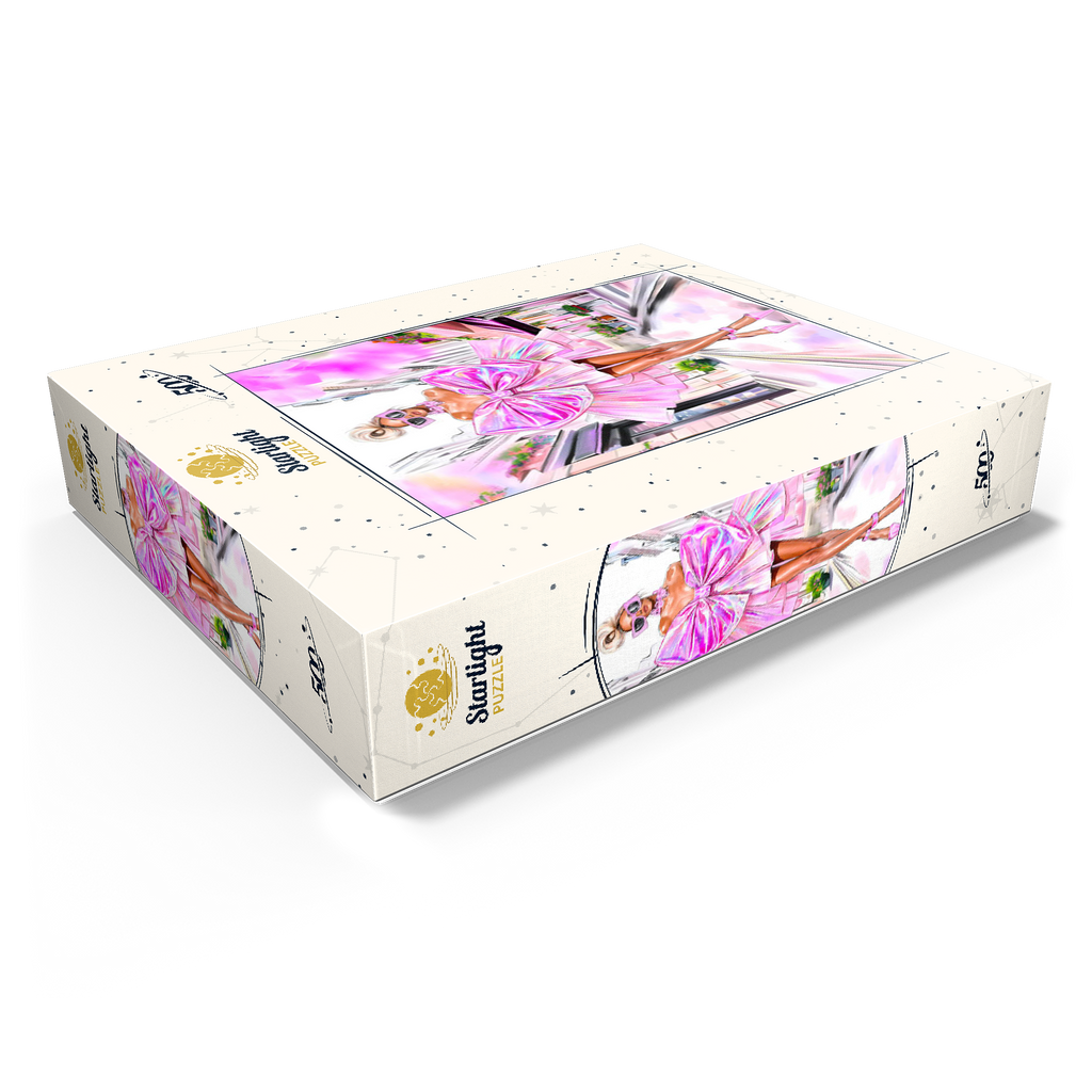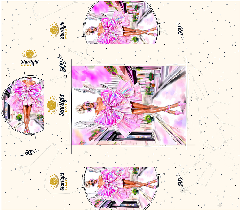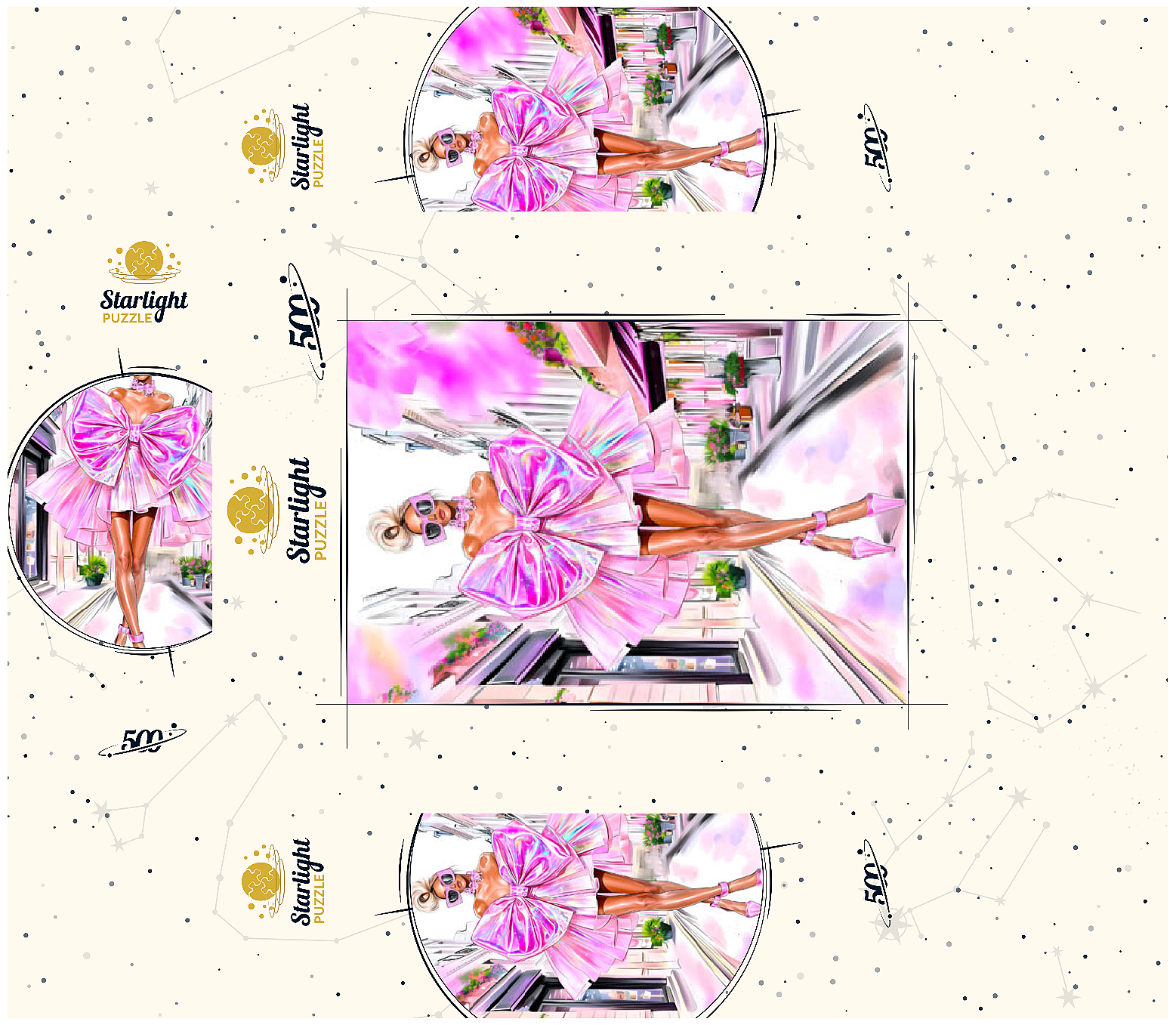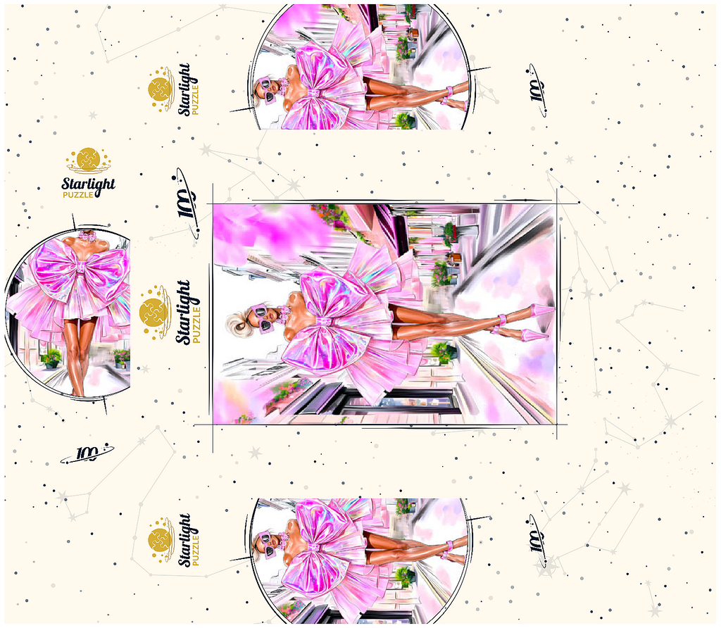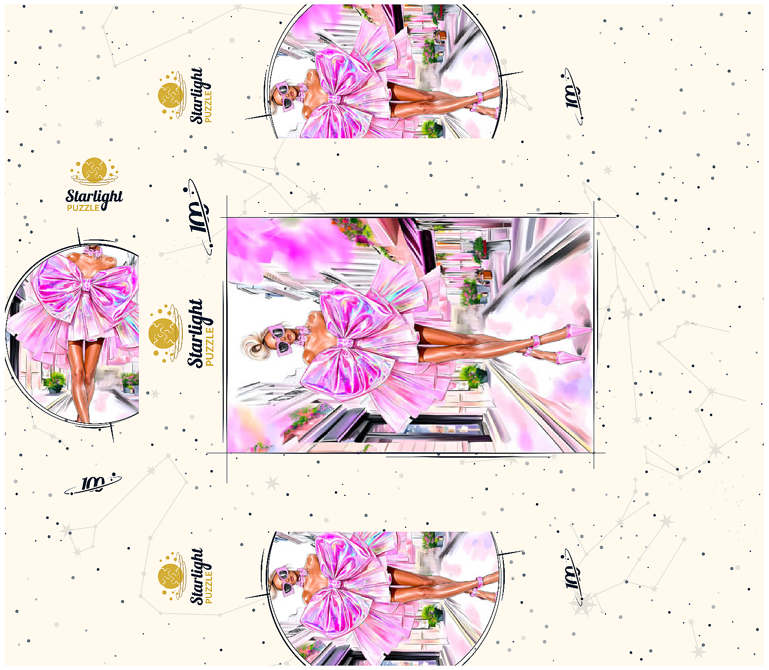 This stunning fashion illustration captures the essence of high-end couture and street-style glamour. A stylish model is adorned in an iridescent pink dress with an oversized bow, radiating elegance and confidence. The background features a charming cityscape with floral details and boutique-lined streets, emphasizing a chic and vibrant aesthetic. The playful use of soft pastel tones and bold highlights adds a modern, artistic touch to the design. Perfectly blending urban sophistication and avant-garde fashion, this artwork is a celebration of creativity and luxury.