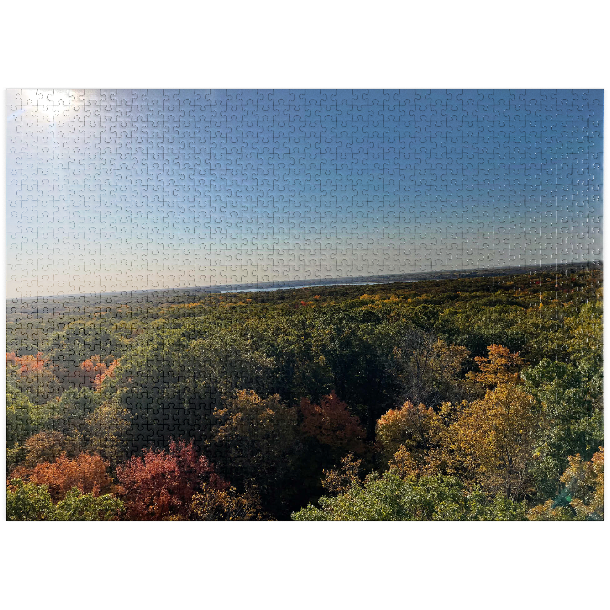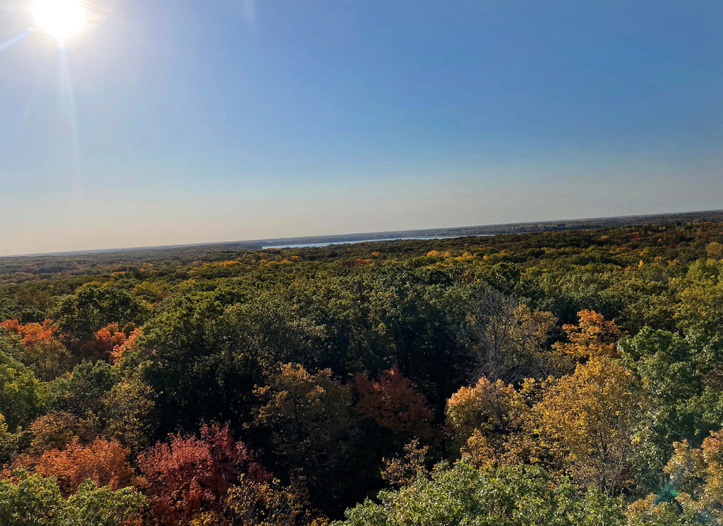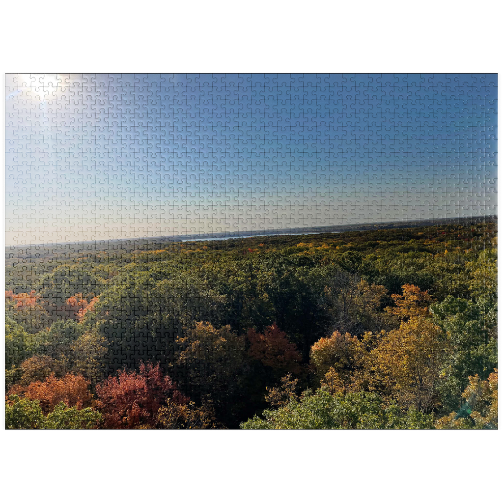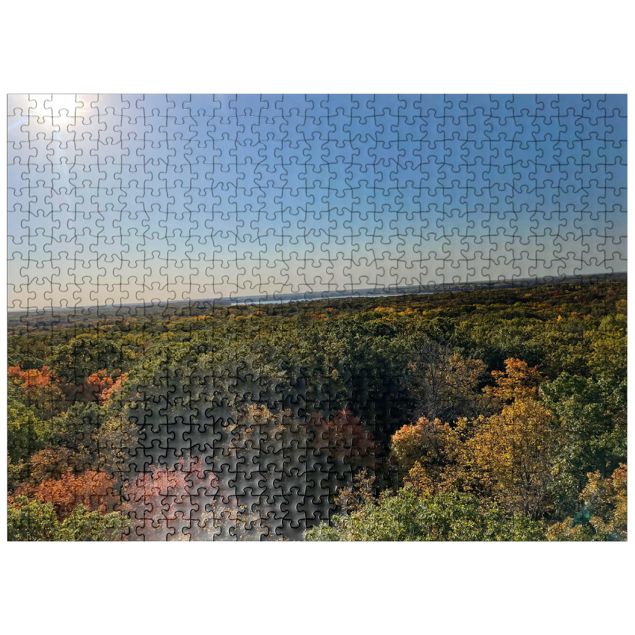 Experience the breathtaking beauty of autumn with this panoramic aerial view of a vast forest landscape. Captured under a clear blue sky with the sun casting a golden glow, this image showcases a vibrant mix of green, yellow, orange, and red foliage, highlighting the seasonal transformation. In the distance, a serene body of water adds depth to the scenery, creating a perfect blend of nature’s elements. Ideal for seasonal wall art, digital backgrounds, or nature-inspired decor, this stunning fall landscape photography embodies the peacefulness and grandeur of autumn.