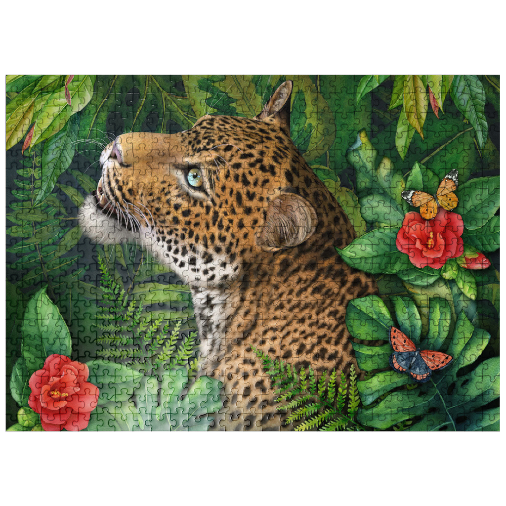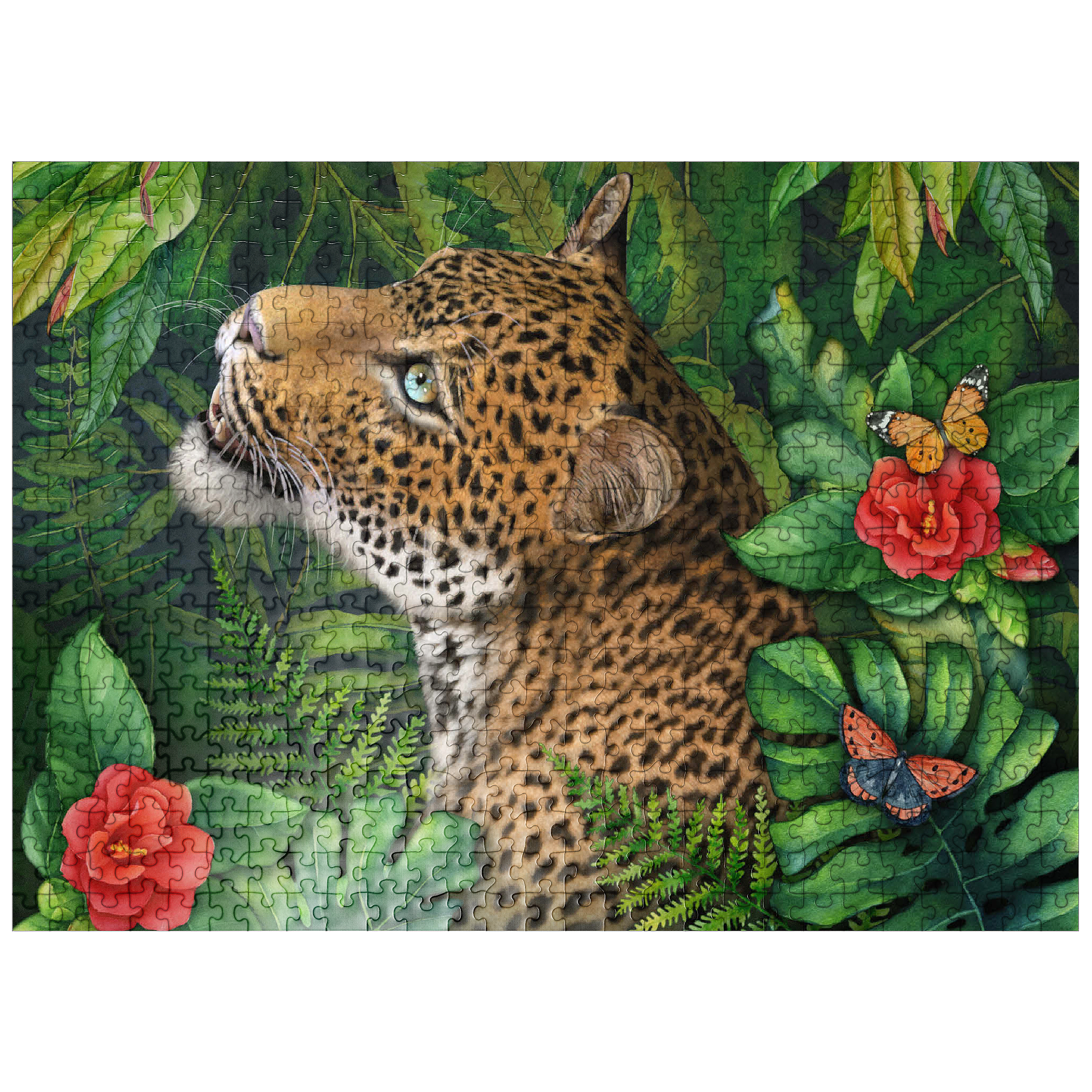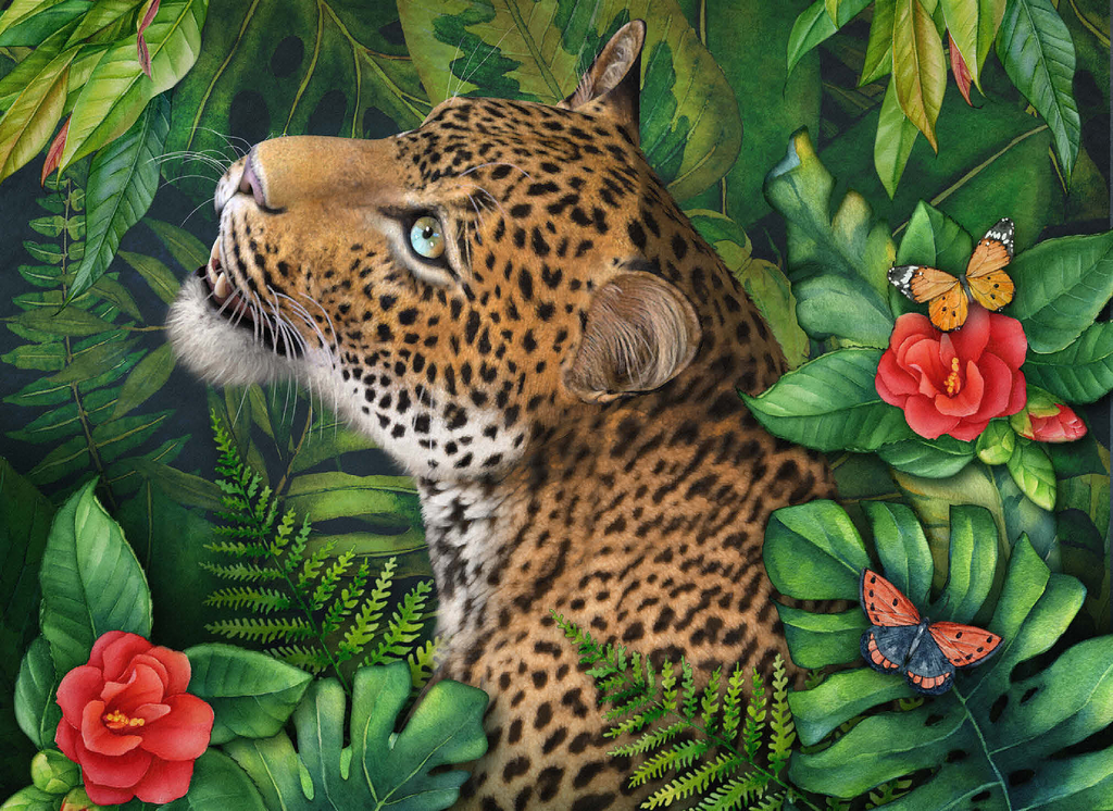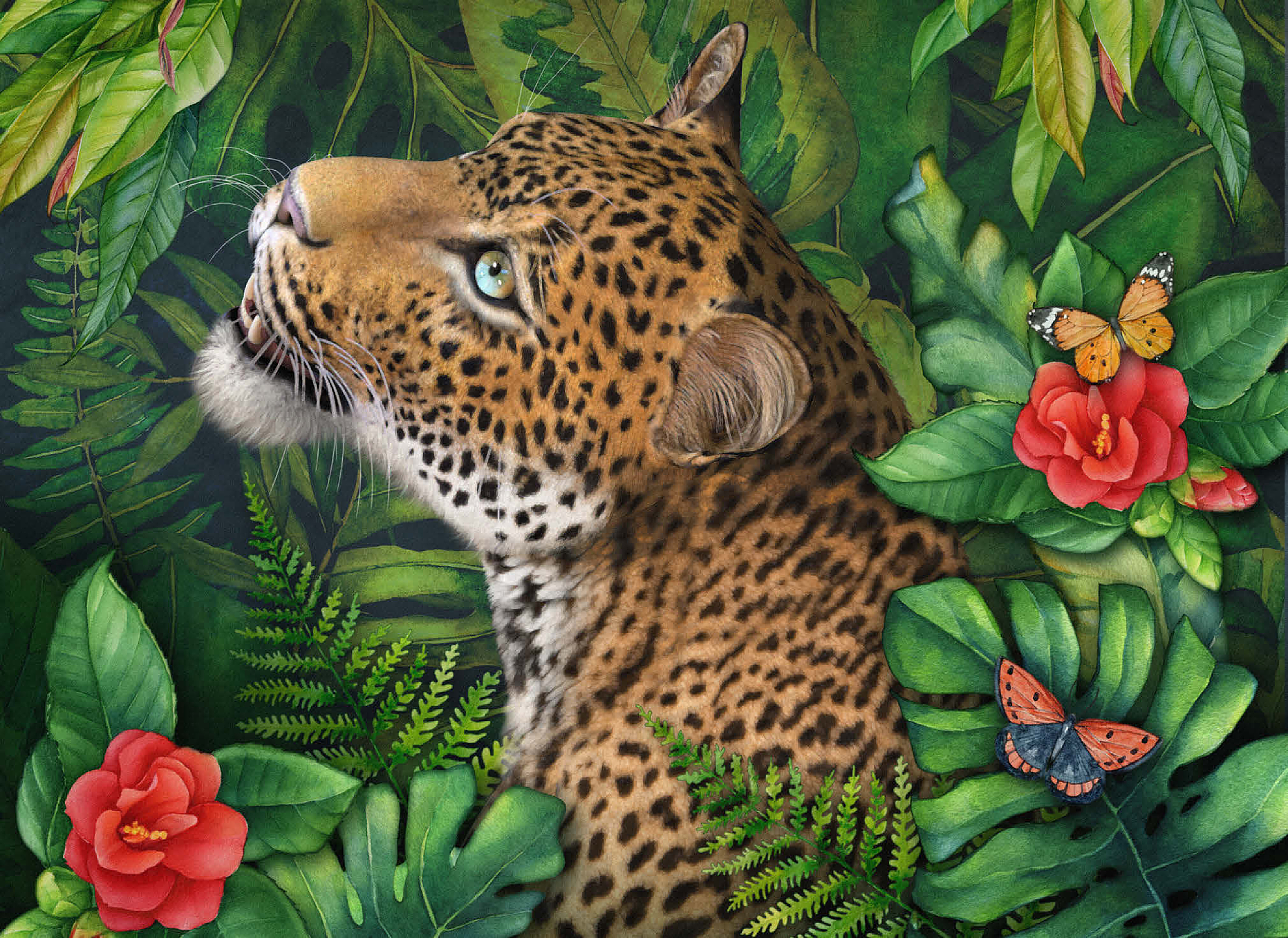 Laurie Prindle's -Leopard's Gaze- celebrates the elegant grace of a leopard with green eyes who gazes intensely into the distance. He is surrounded by lush green jungle palms, leaves and ferns with various colorful butterflies flitting by the vibrant red flowers, adding a touch of delicate beauty. With its loving attention to detail and playful atmosphere, it offers a gracious natural world for wildlife and big cat lovers.