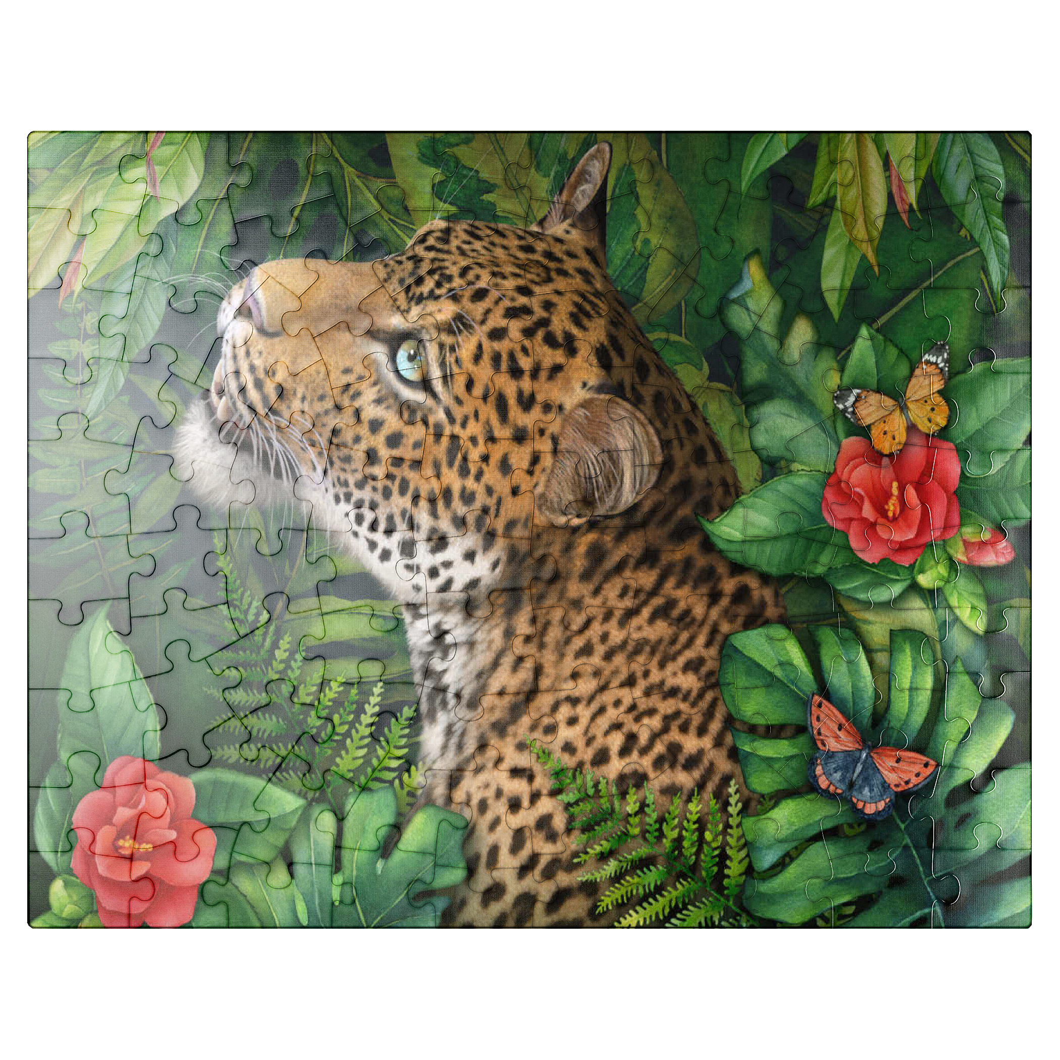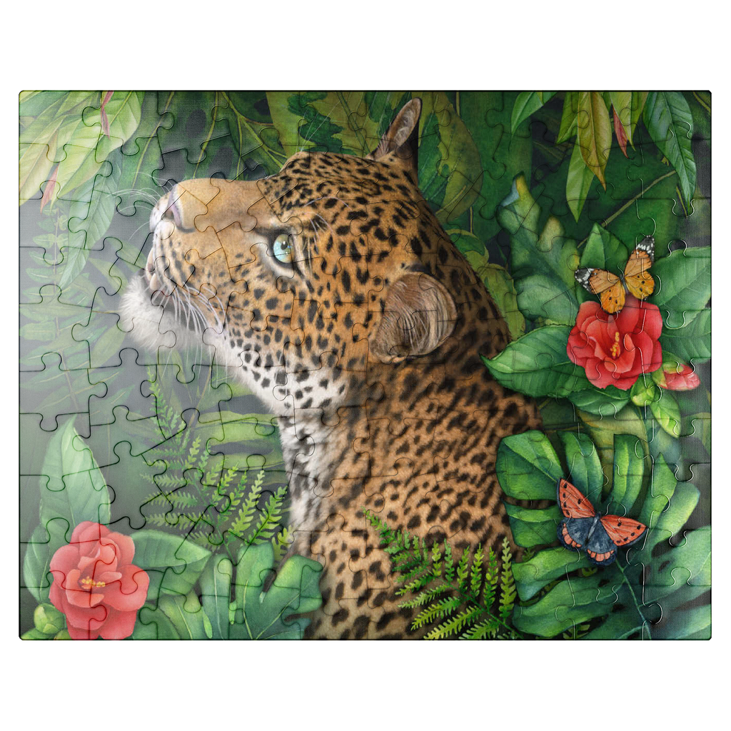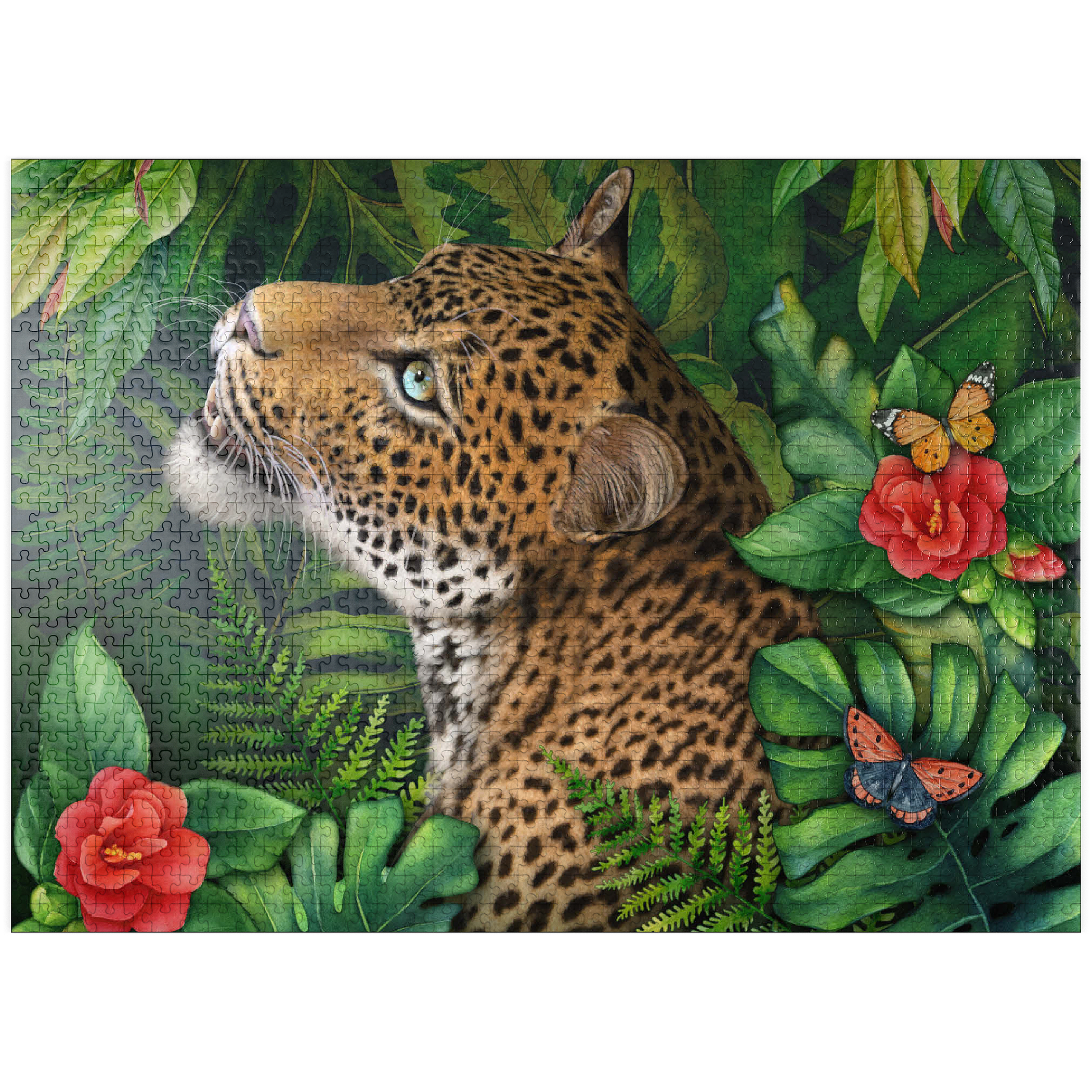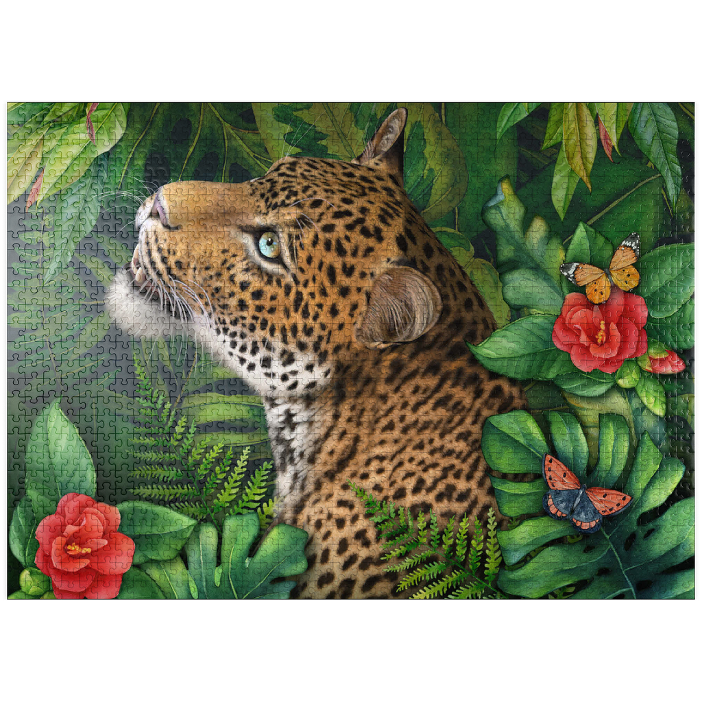 Laurie Prindle's -Leopard's Gaze- celebrates the elegant grace of a leopard with green eyes who gazes intensely into the distance. He is surrounded by lush green jungle palms, leaves and ferns with various colorful butterflies flitting by the vibrant red flowers, adding a touch of delicate beauty. With its loving attention to detail and playful atmosphere, it offers a gracious natural world for wildlife and big cat lovers.