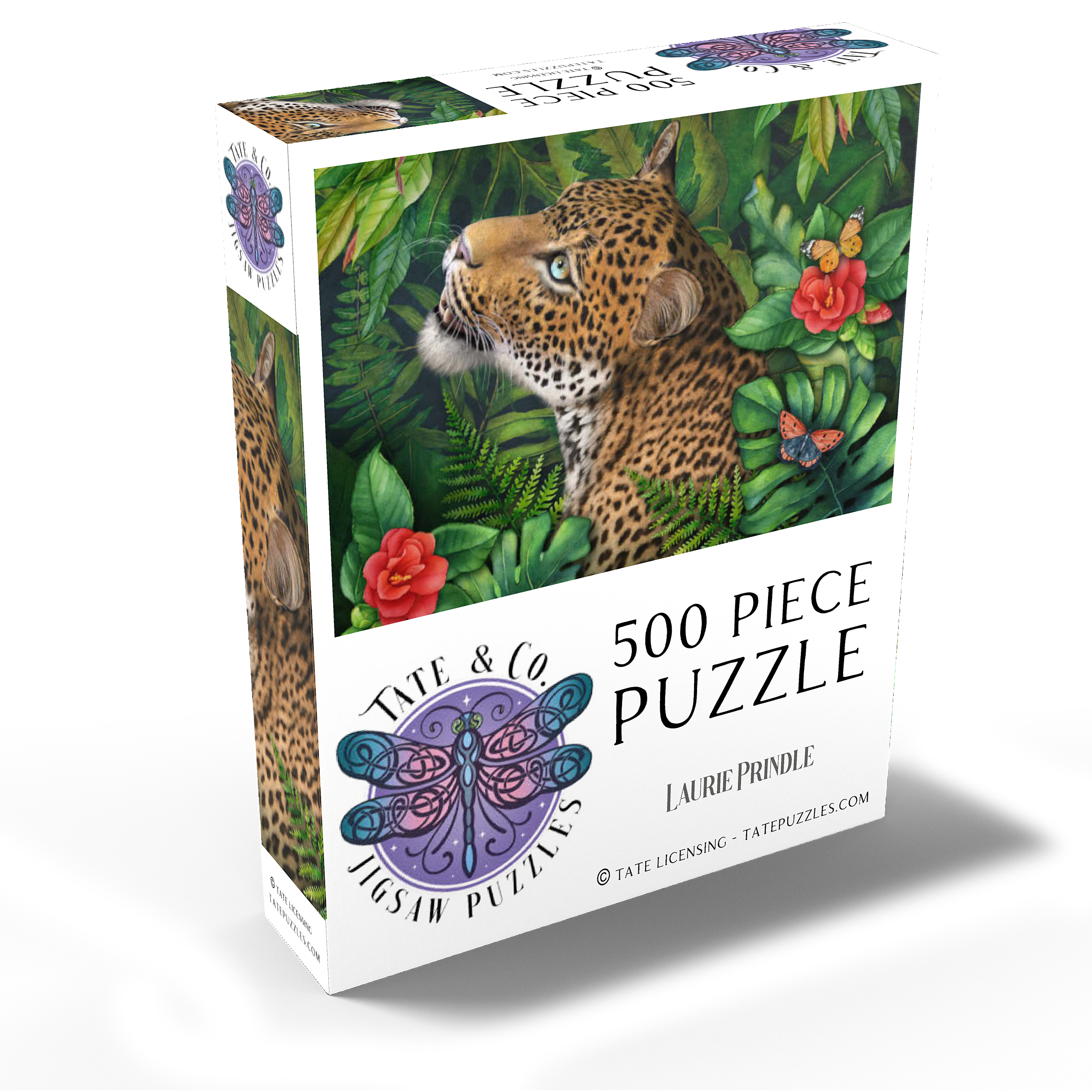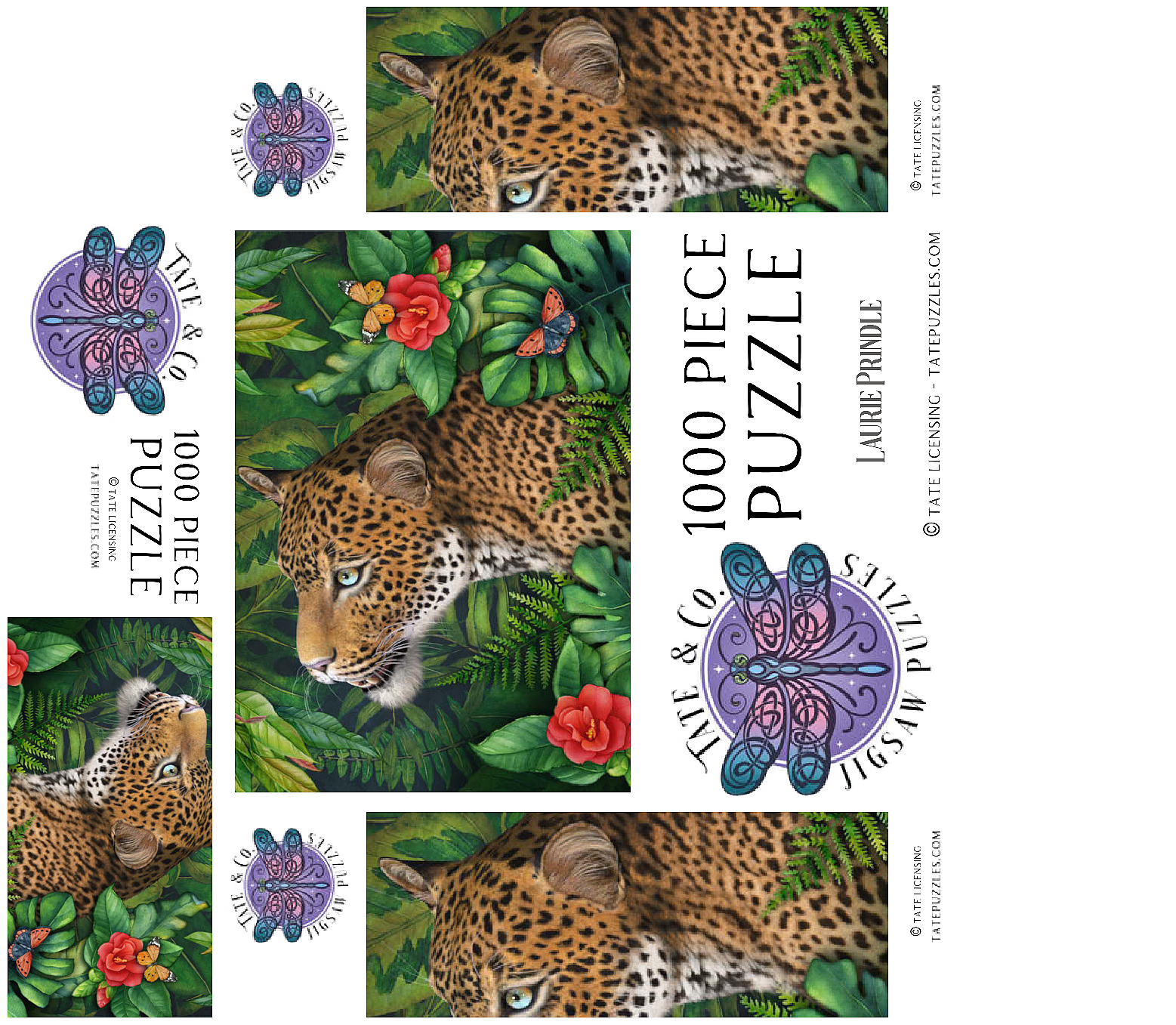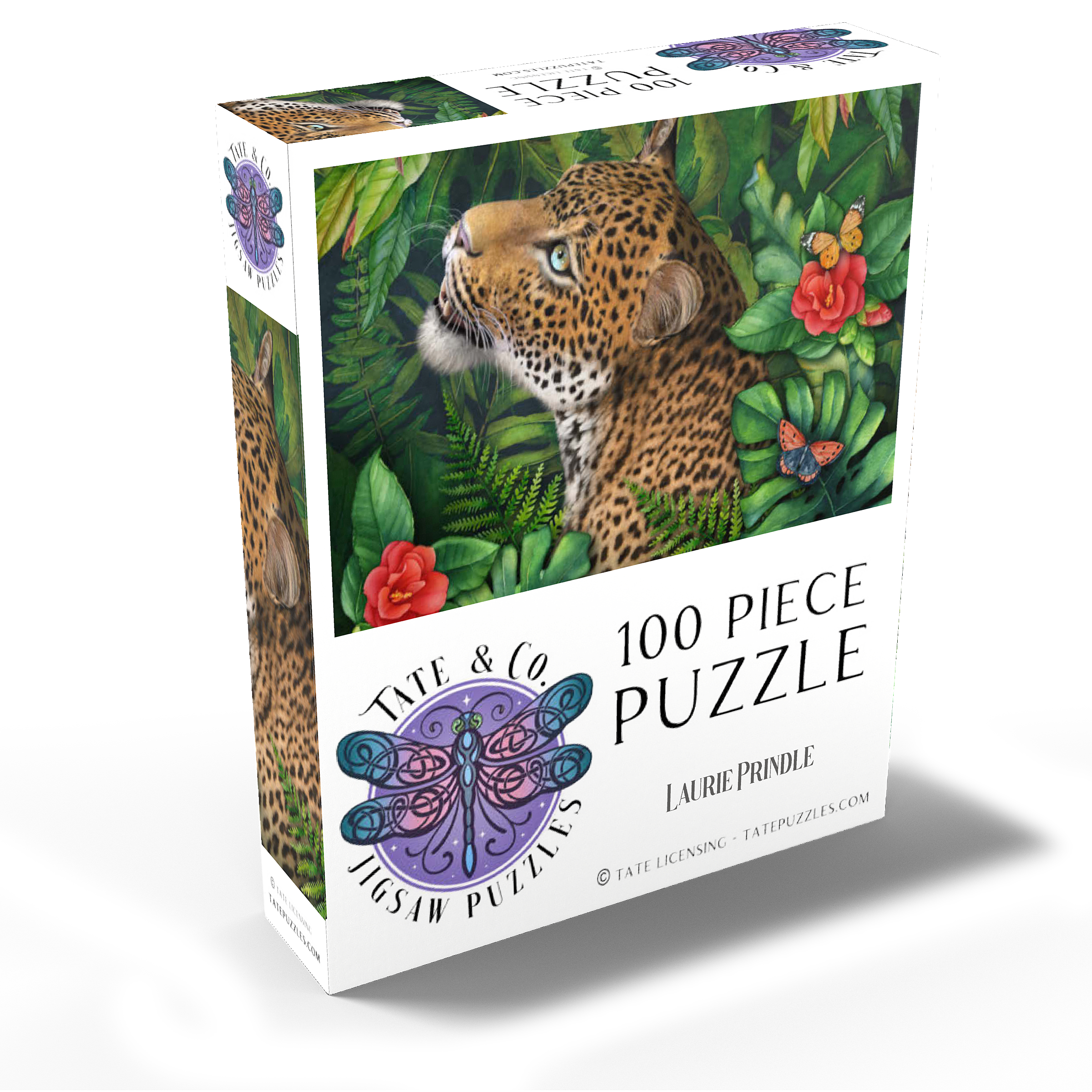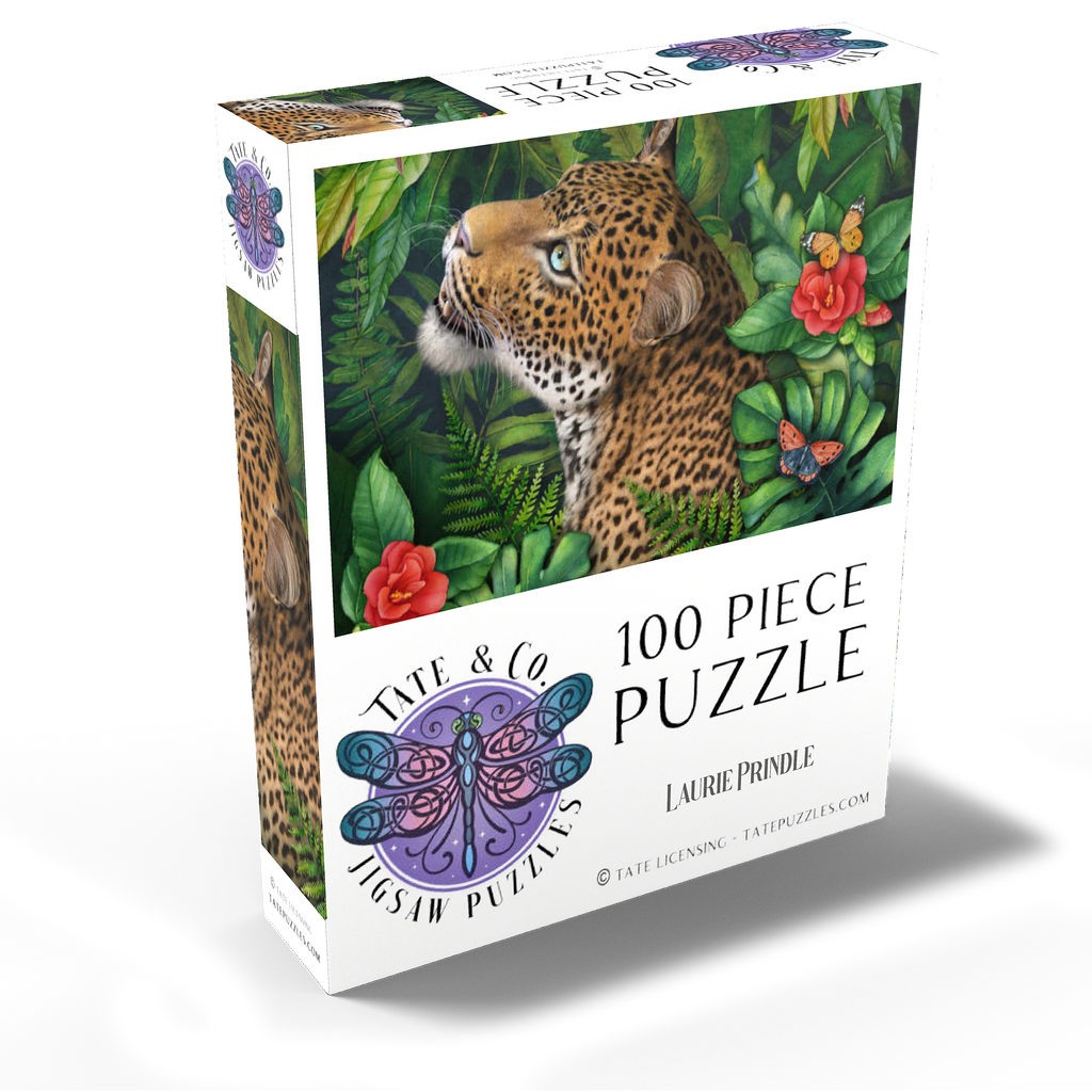 Laurie Prindle's -Leopard's Gaze- celebrates the elegant grace of a leopard with green eyes who gazes intensely into the distance. He is surrounded by lush green jungle palms, leaves and ferns with various colorful butterflies flitting by the vibrant red flowers, adding a touch of delicate beauty. With its loving attention to detail and playful atmosphere, it offers a gracious natural world for wildlife and big cat lovers.