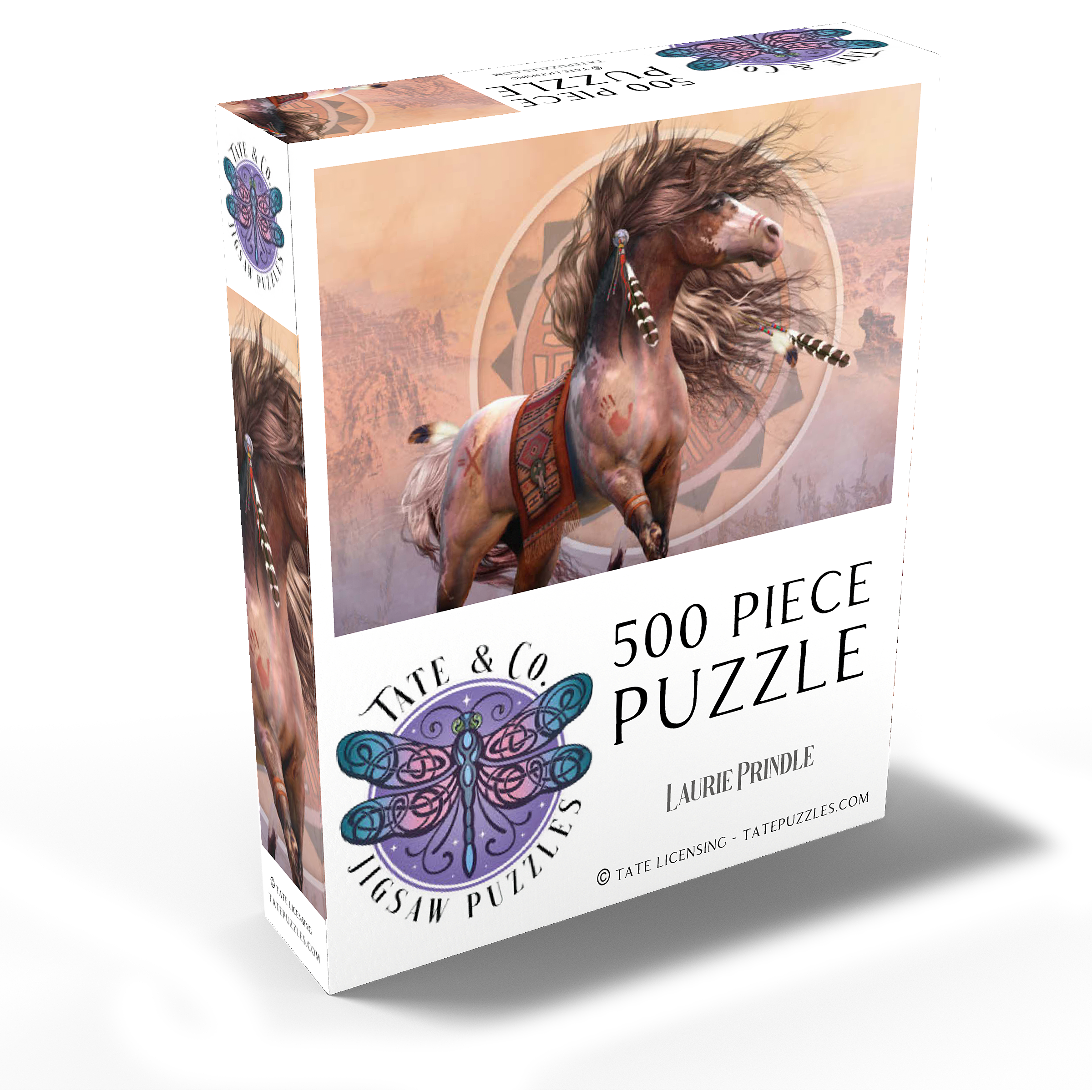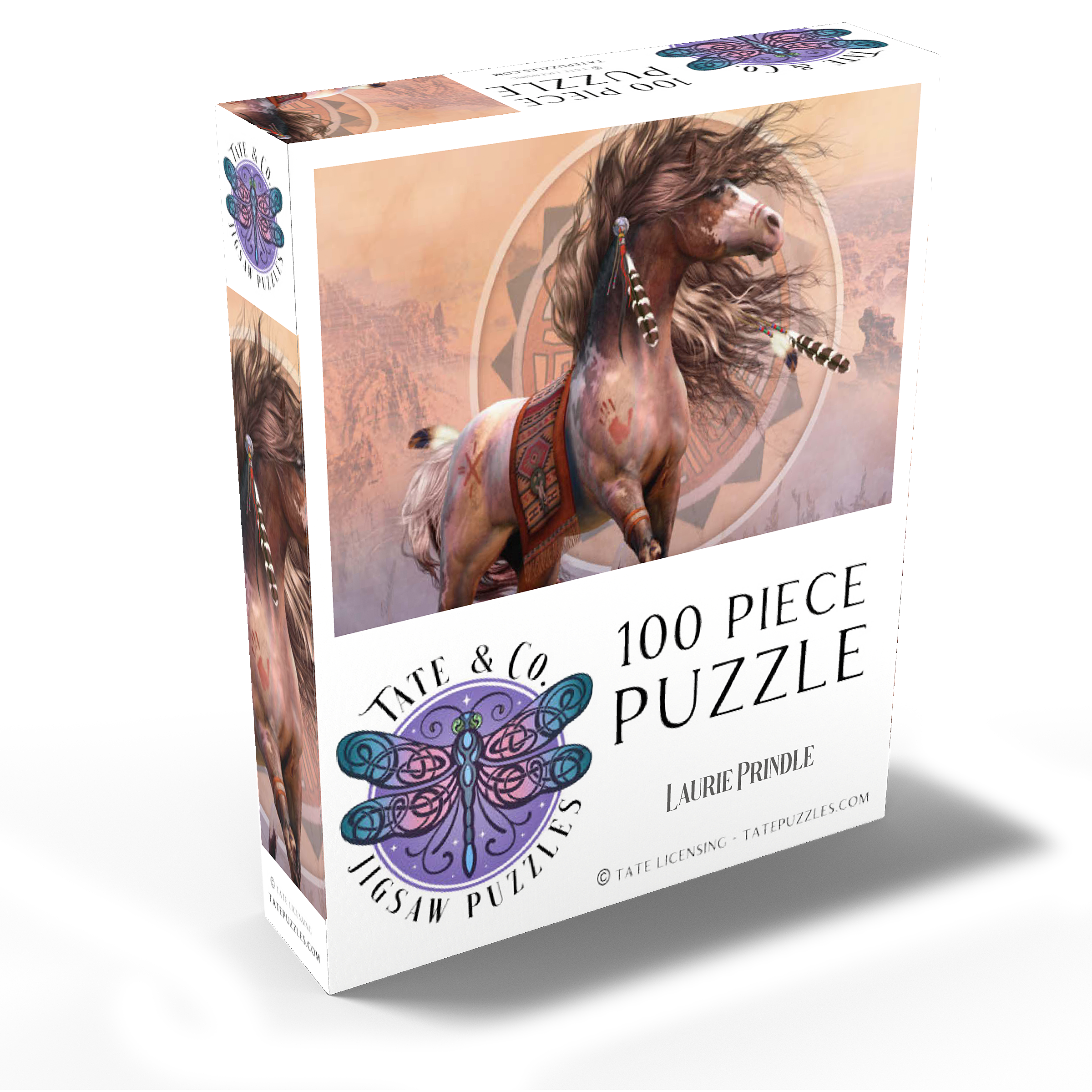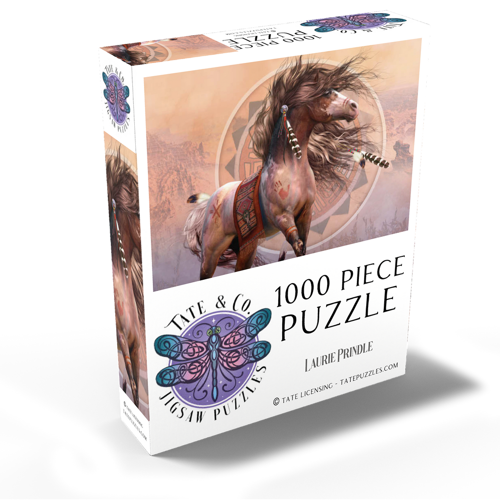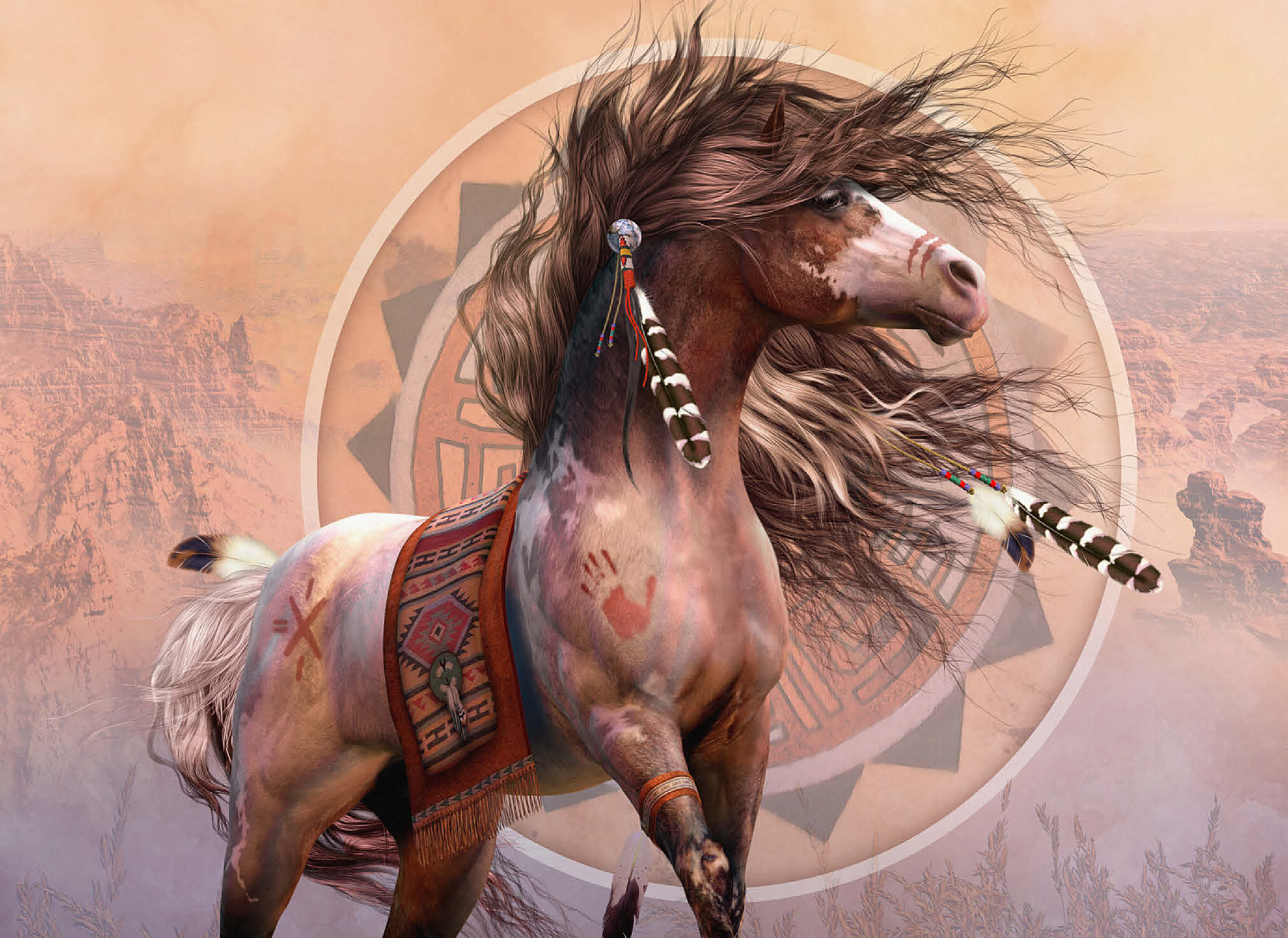 -Spirit Warrior-, one of the most famous of Laurie Prindle's Native American Horse artworks features a striking red roan paint warhorse, decorated with native symbols of honor and strength. With his long, textured mane and tail flowing in the wind, he stands dramatically against a backdrop of red rock mesas and buttes typical of a southwestern desert landscape, and a subtle dreamcatcher design. The majestic warhorse is adorned with traditional Native American accents, including colorful beaded details, feathers, and a native patterned saddle blanket.