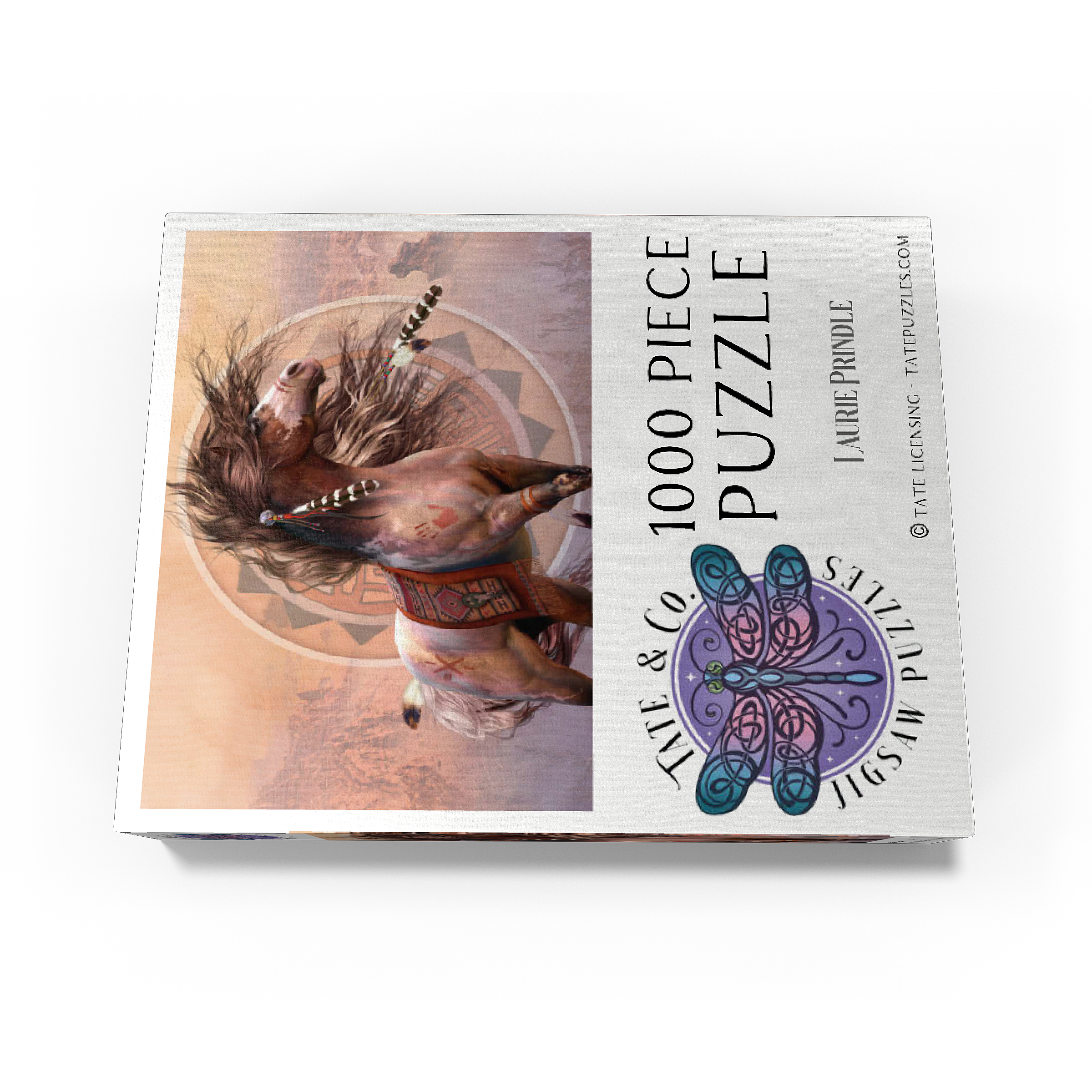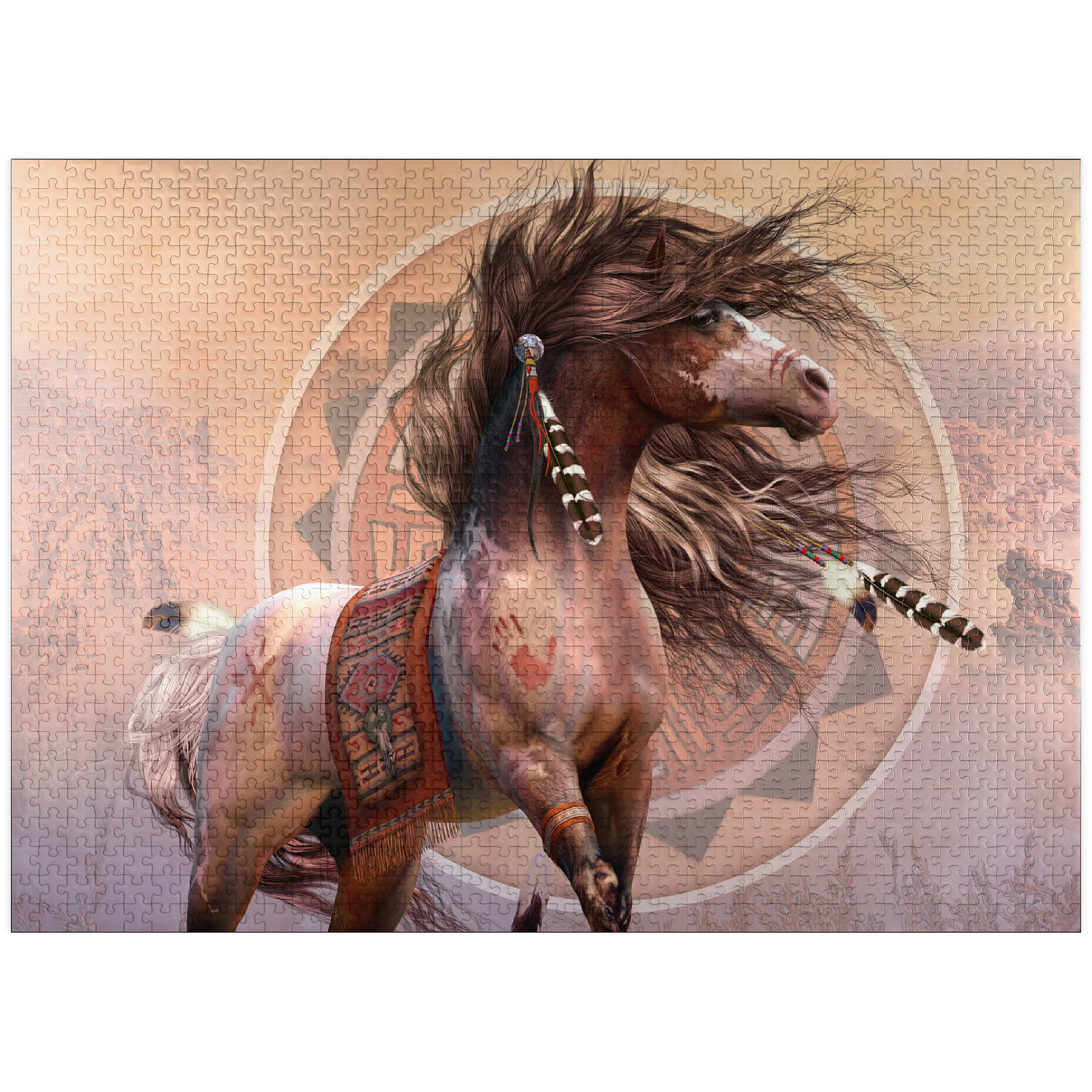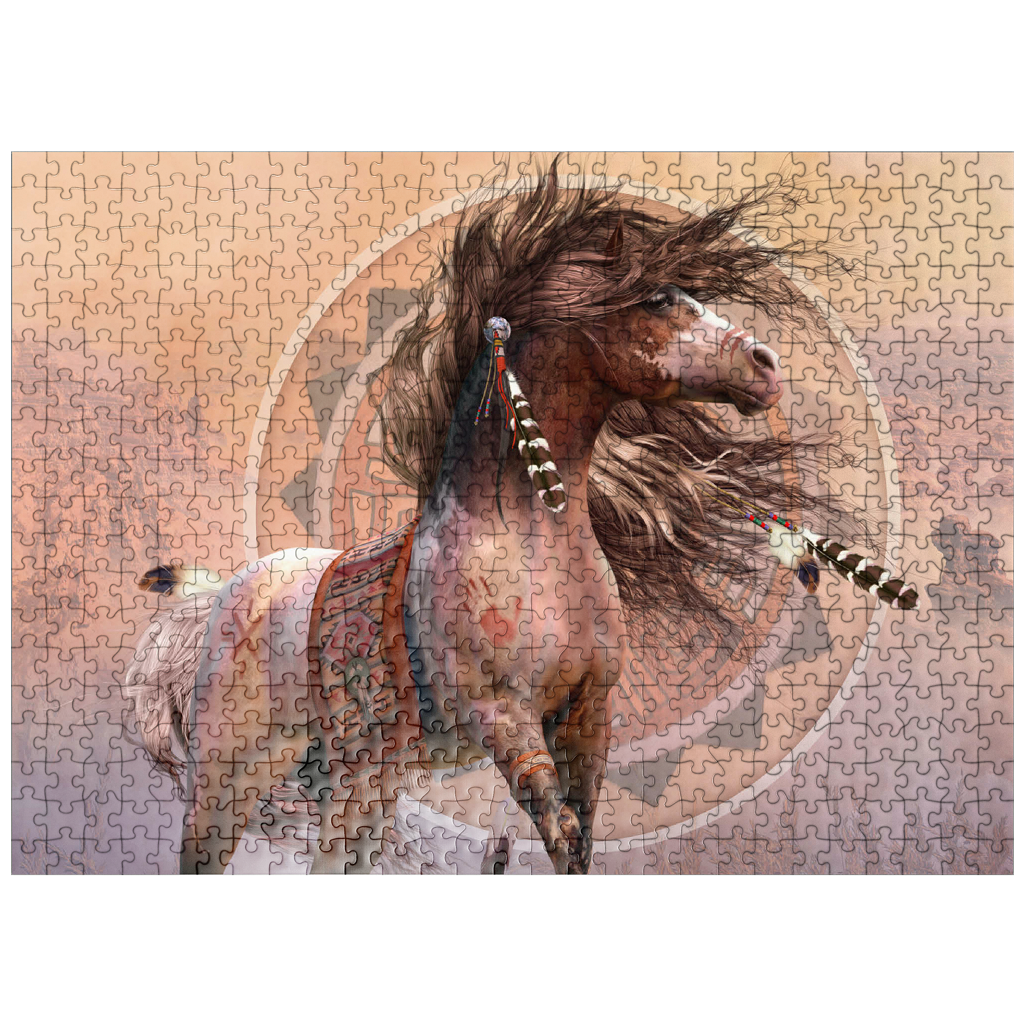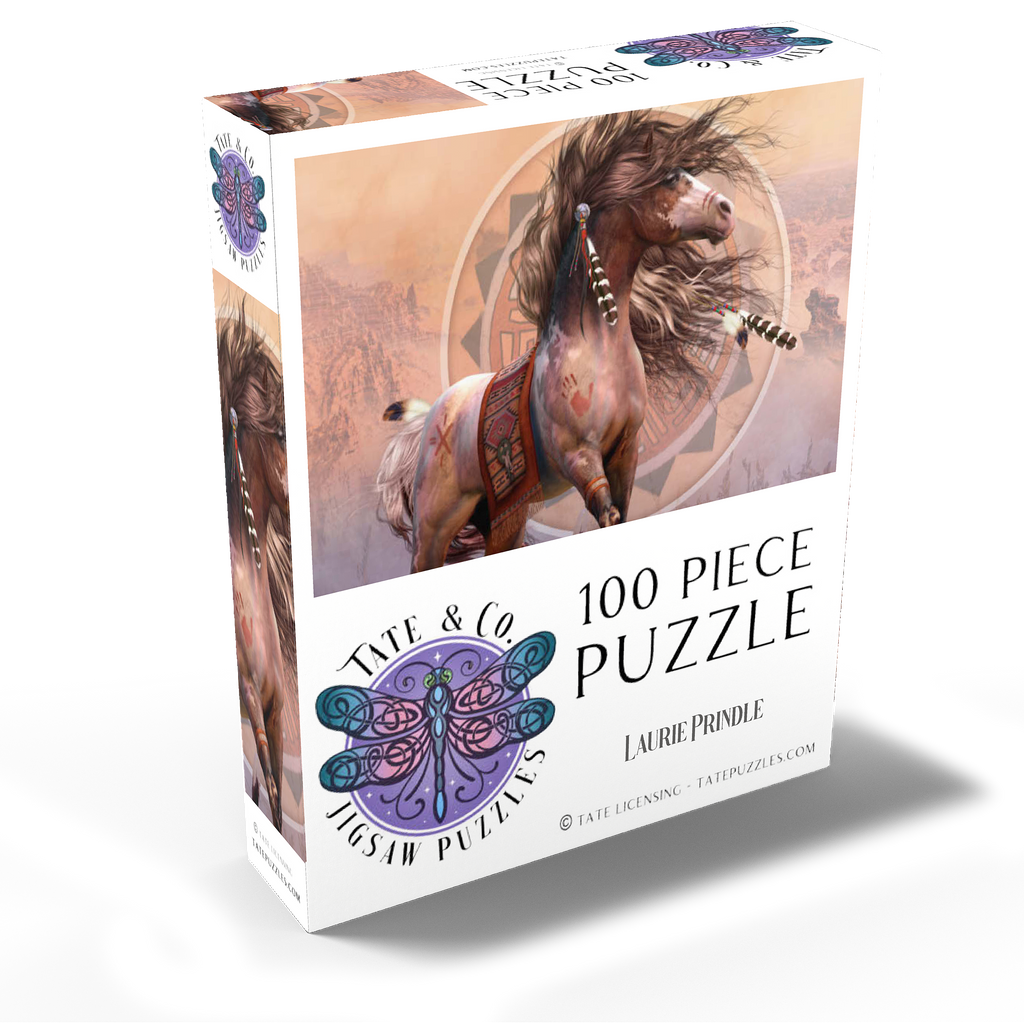 -Spirit Warrior-, one of the most famous of Laurie Prindle's Native American Horse artworks features a striking red roan paint warhorse, decorated with native symbols of honor and strength. With his long, textured mane and tail flowing in the wind, he stands dramatically against a backdrop of red rock mesas and buttes typical of a southwestern desert landscape, and a subtle dreamcatcher design. The majestic warhorse is adorned with traditional Native American accents, including colorful beaded details, feathers, and a native patterned saddle blanket.