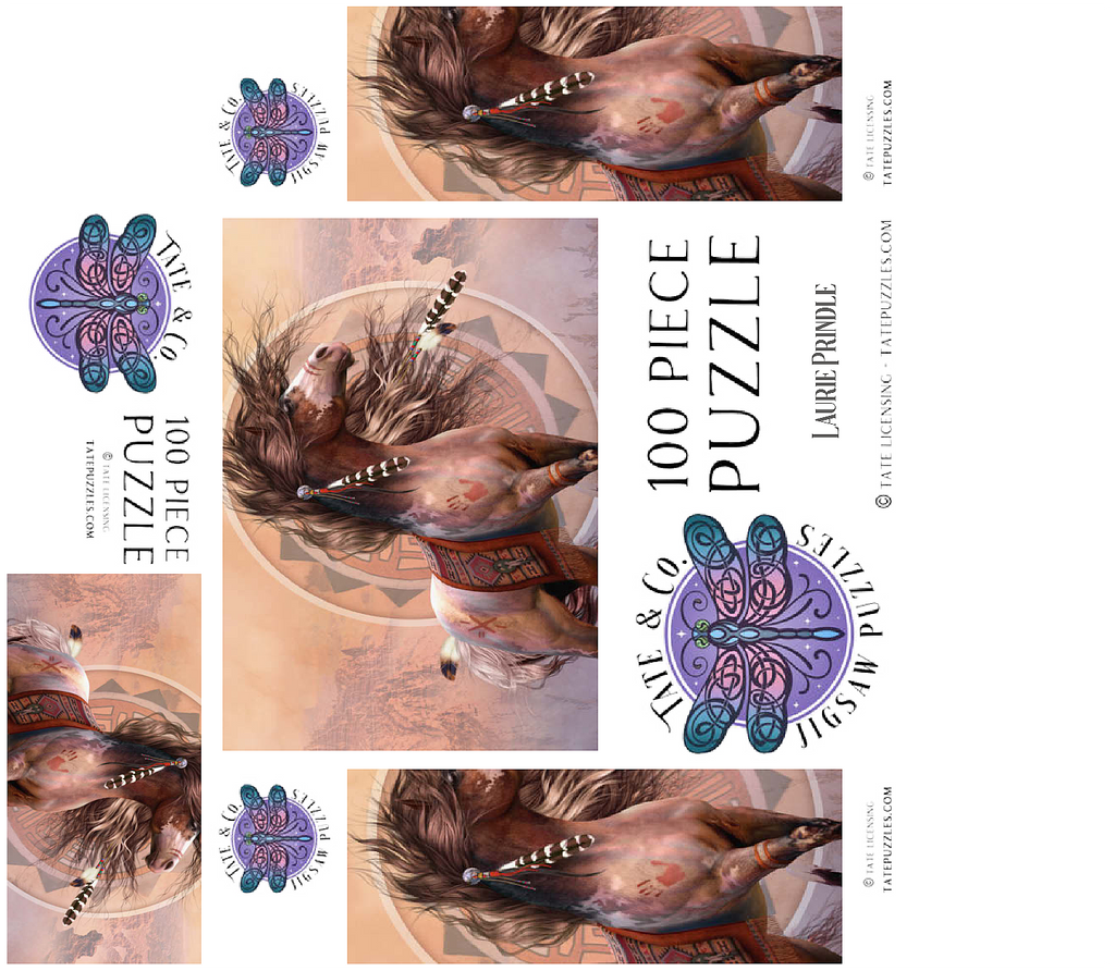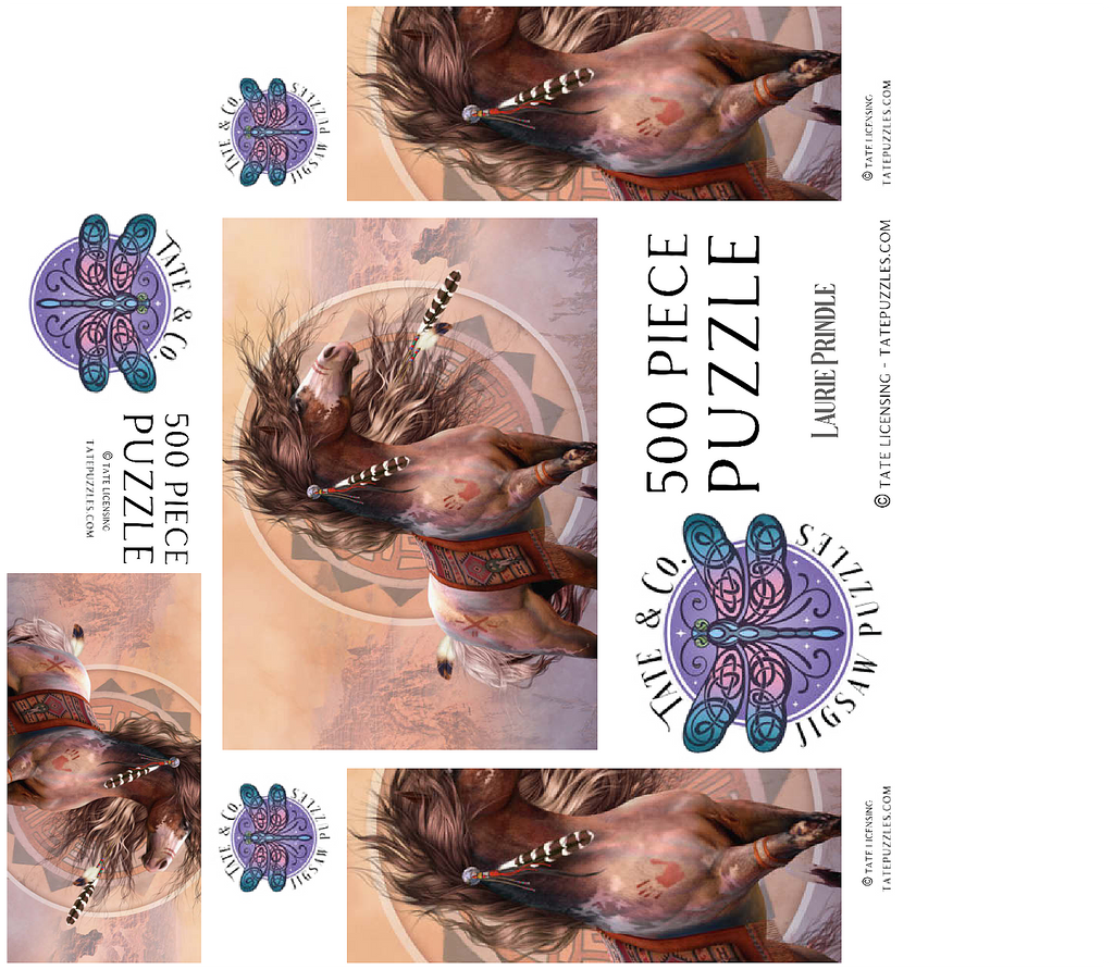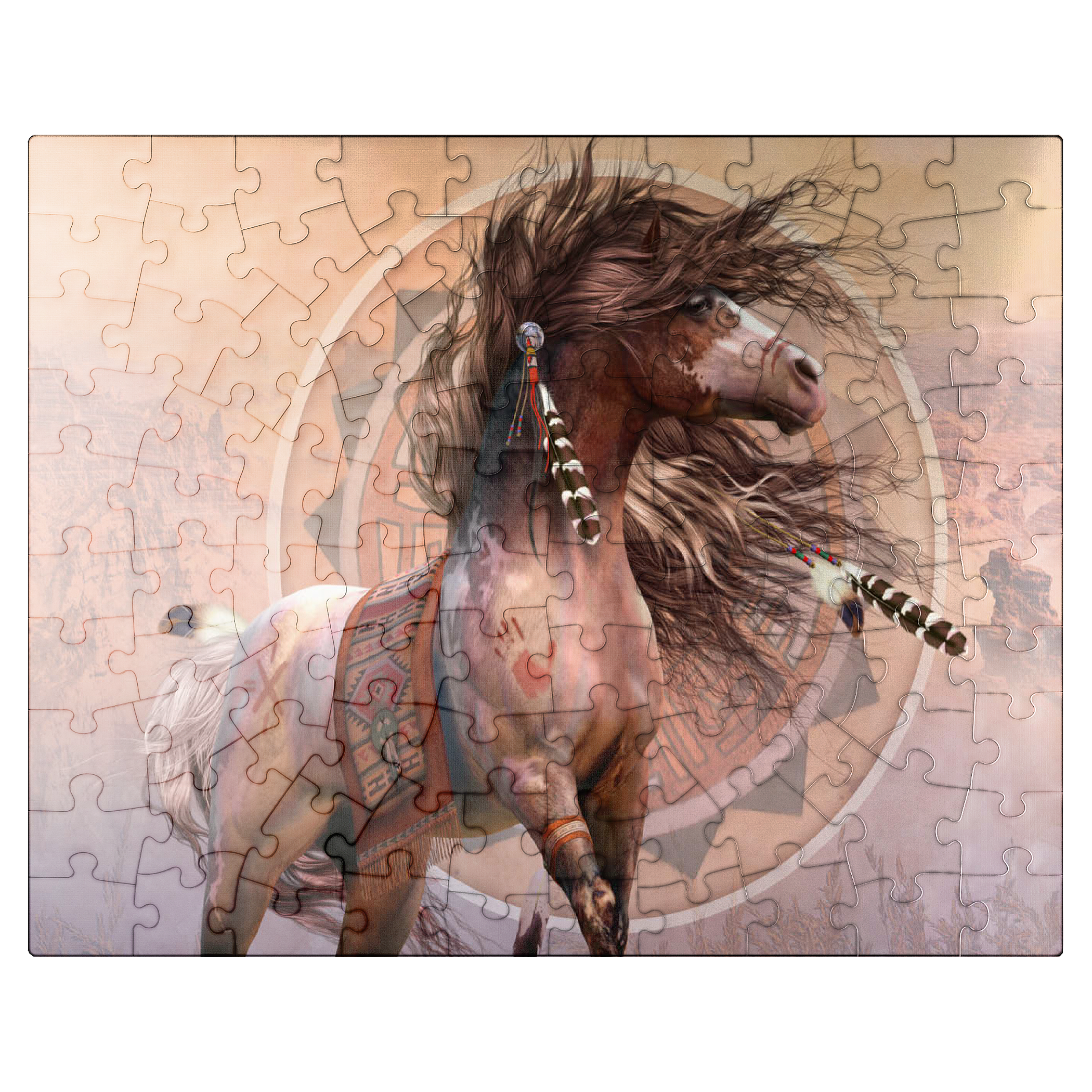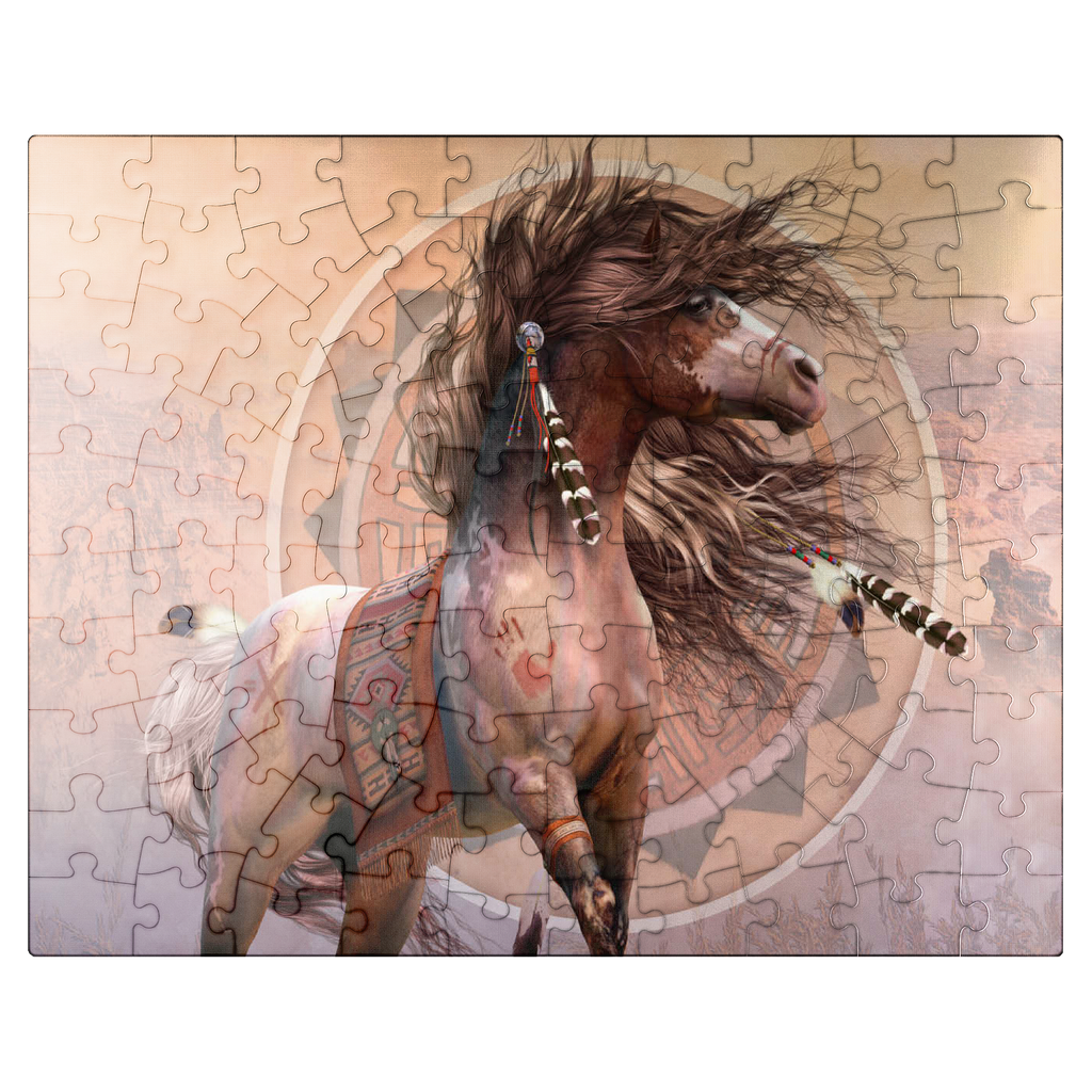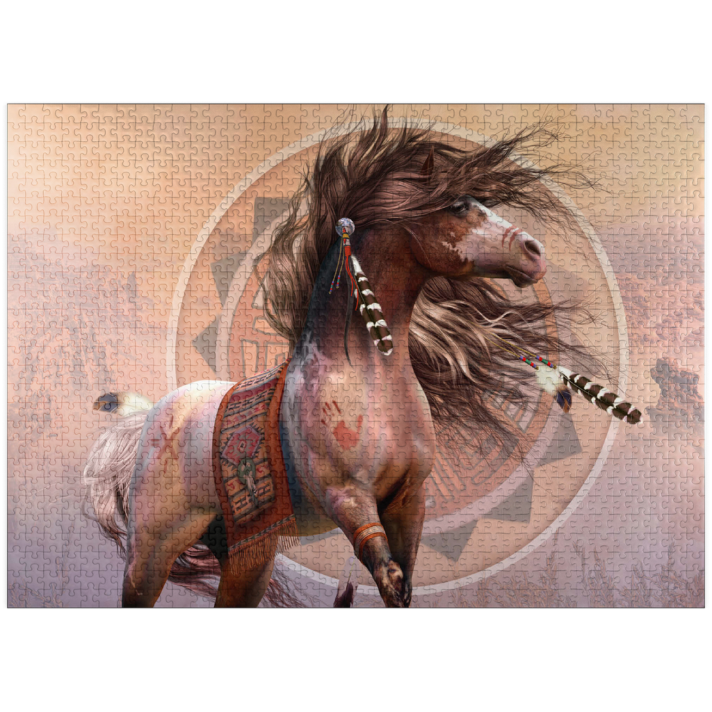 -Spirit Warrior-, one of the most famous of Laurie Prindle's Native American Horse artworks features a striking red roan paint warhorse, decorated with native symbols of honor and strength. With his long, textured mane and tail flowing in the wind, he stands dramatically against a backdrop of red rock mesas and buttes typical of a southwestern desert landscape, and a subtle dreamcatcher design. The majestic warhorse is adorned with traditional Native American accents, including colorful beaded details, feathers, and a native patterned saddle blanket.