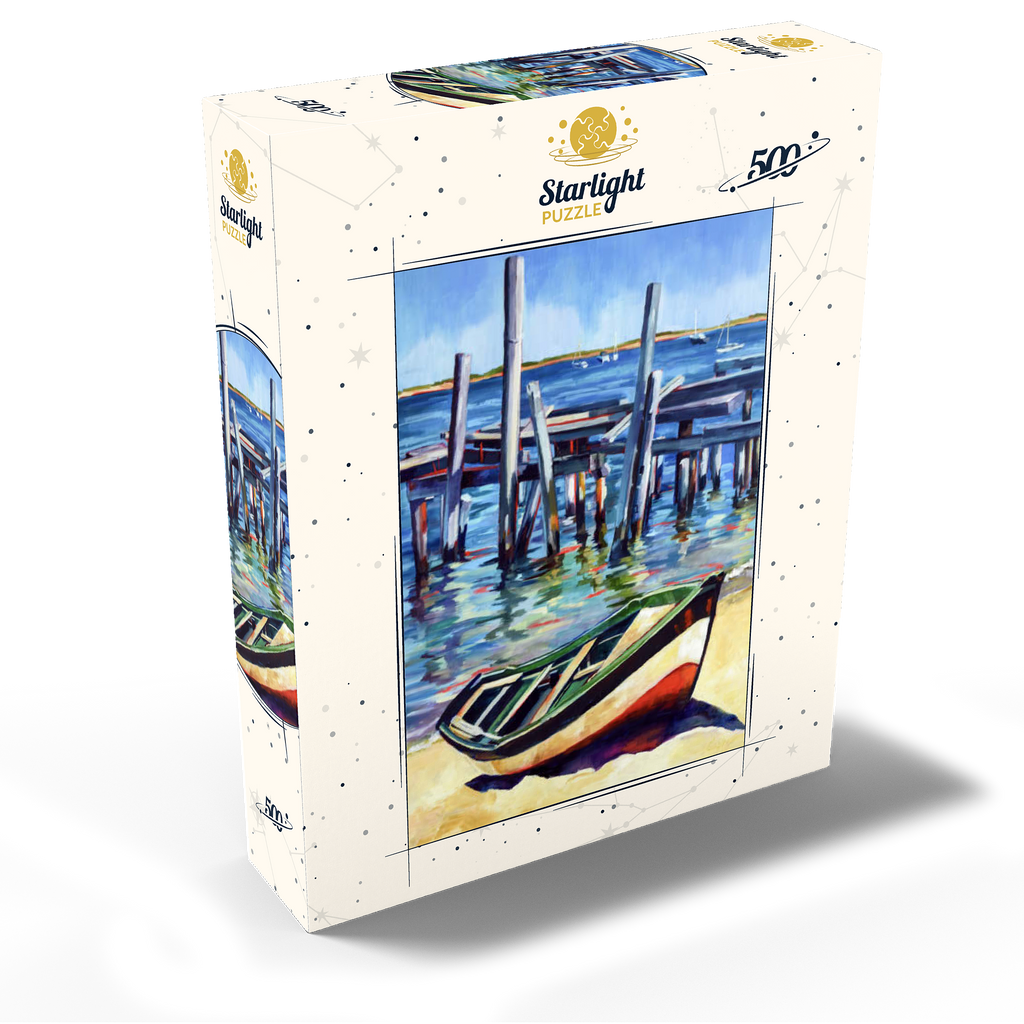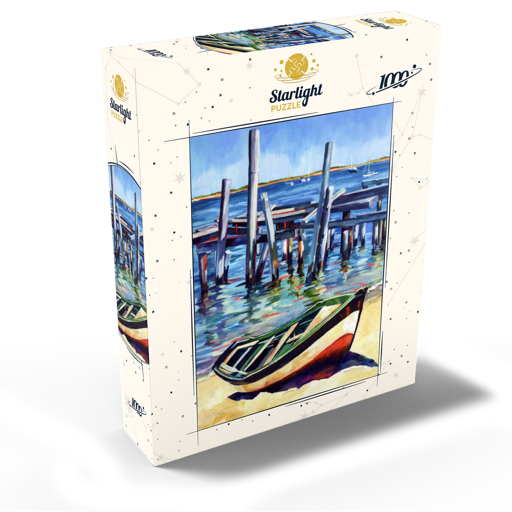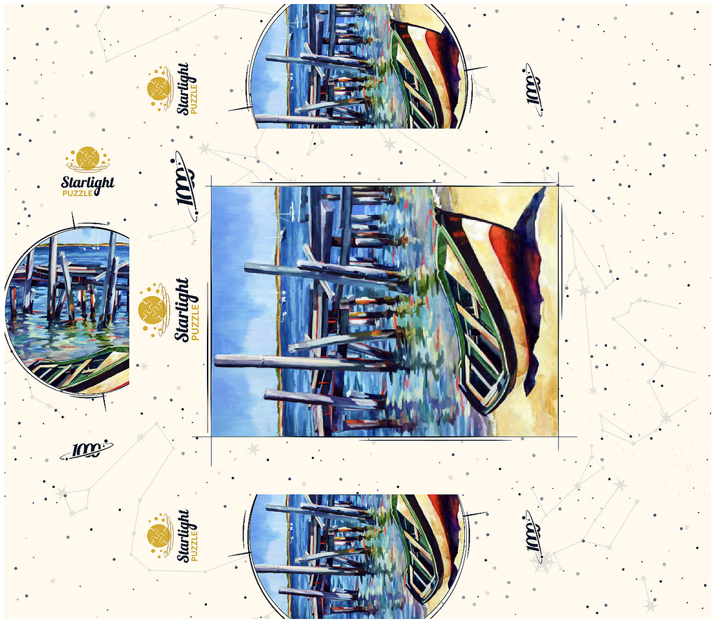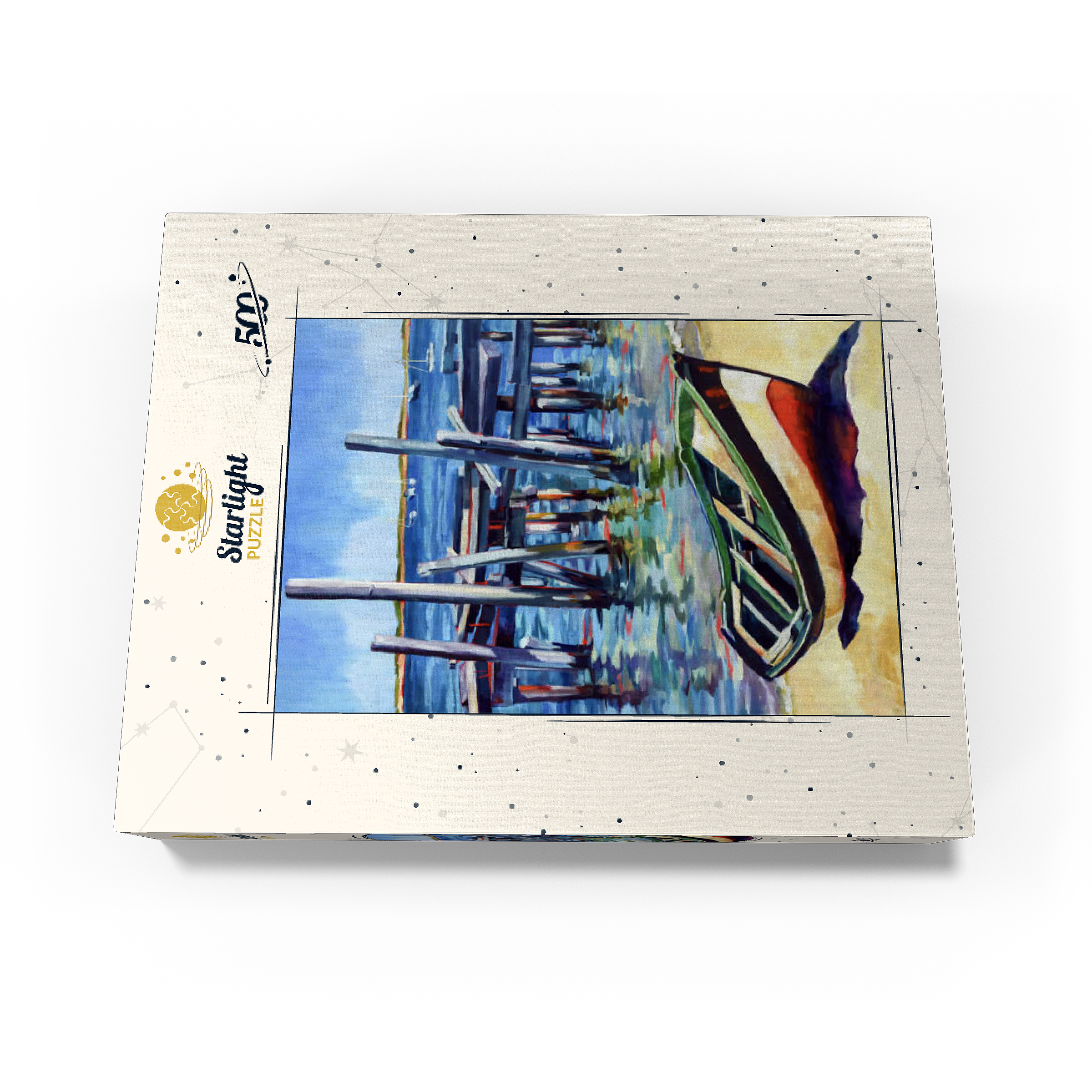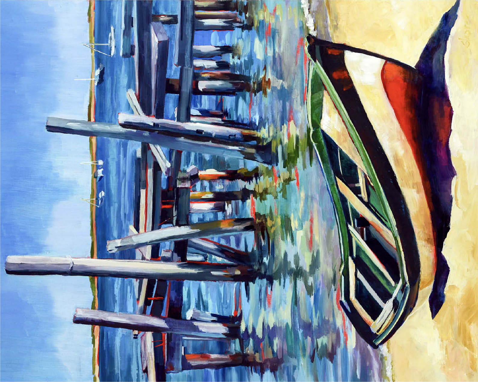 This colorful painting captures a serene coastal scene featuring a weathered wooden rowboat resting on the sandy shore. in the background, aged wooden piers extend into the calm blue waters, their reflections shimmering in vivid hues. sailboats float peacefully in the distance, evoking a sense of timeless seaside charm. the vibrant brushstrokes and bold colors infuse the artwork with a dynamic, yet tranquil energy that celebrates coastal life and rustic beauty.