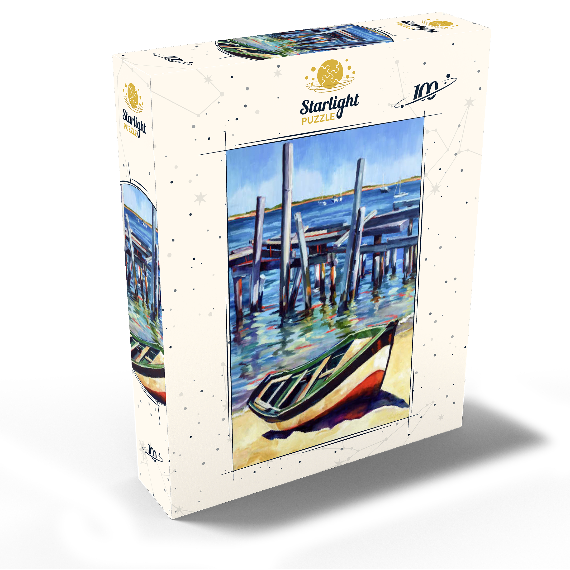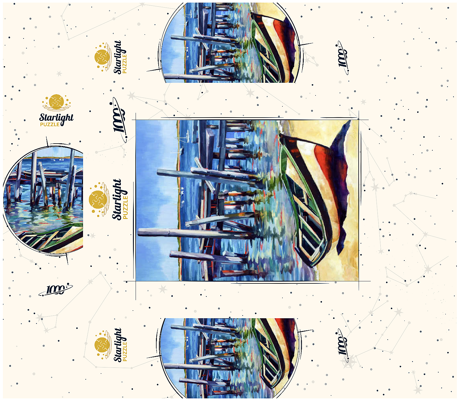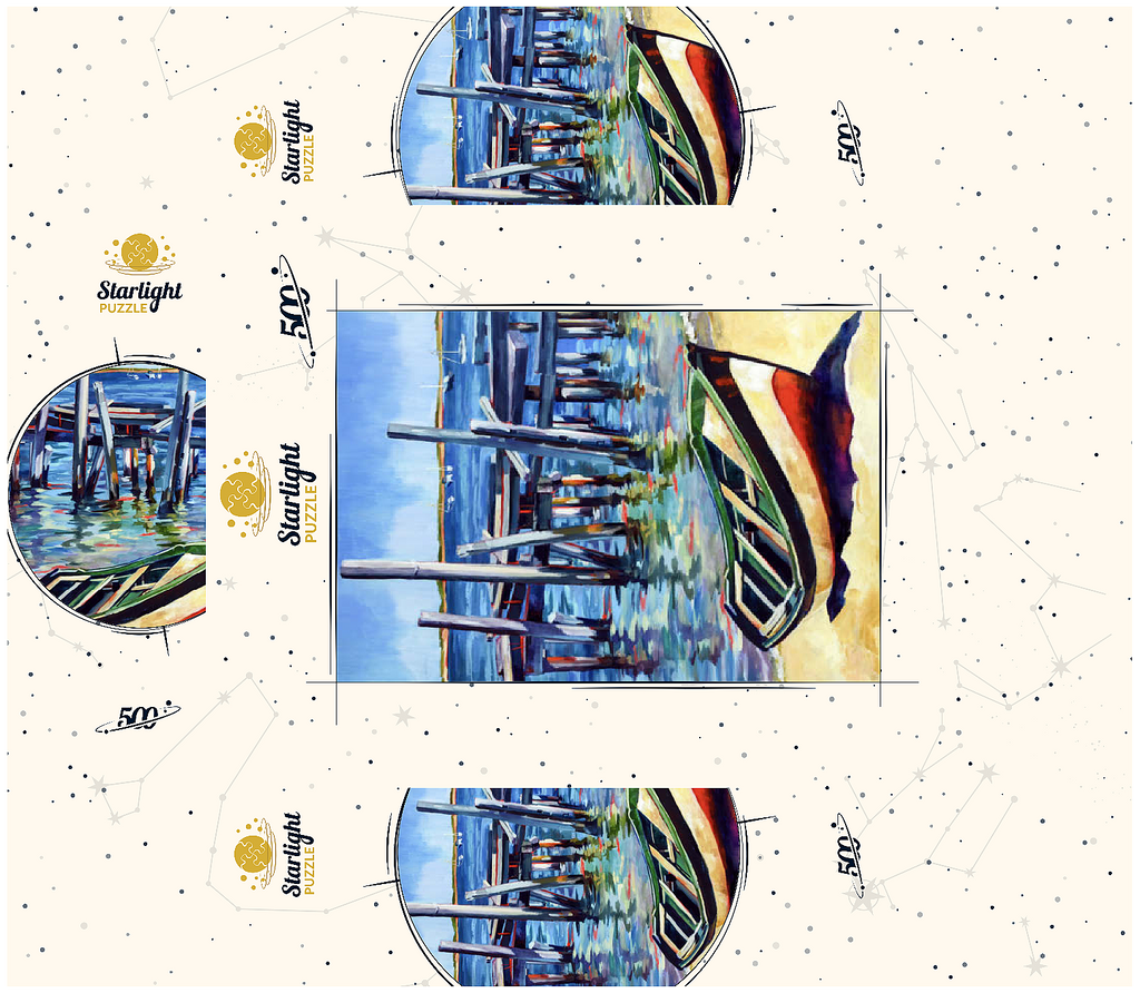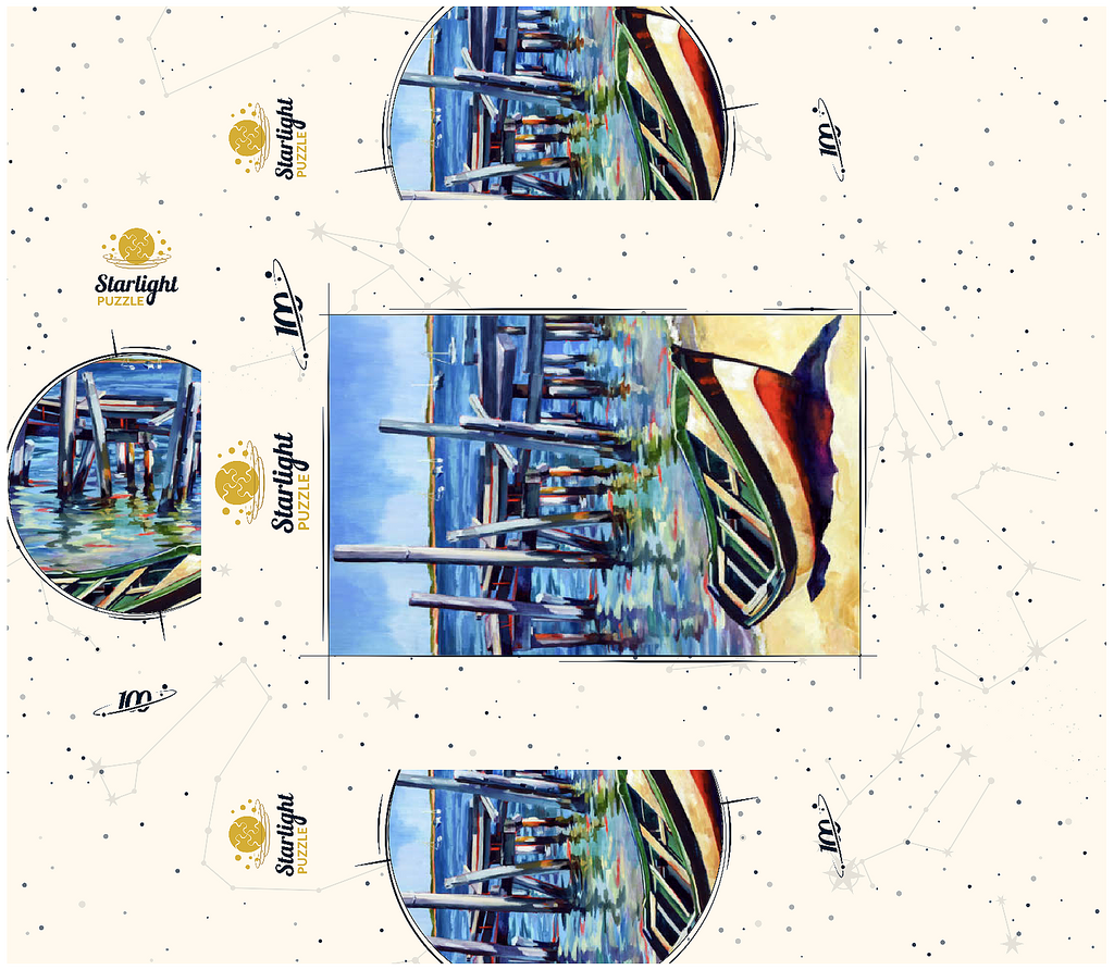 This colorful painting captures a serene coastal scene featuring a weathered wooden rowboat resting on the sandy shore. in the background, aged wooden piers extend into the calm blue waters, their reflections shimmering in vivid hues. sailboats float peacefully in the distance, evoking a sense of timeless seaside charm. the vibrant brushstrokes and bold colors infuse the artwork with a dynamic, yet tranquil energy that celebrates coastal life and rustic beauty.
