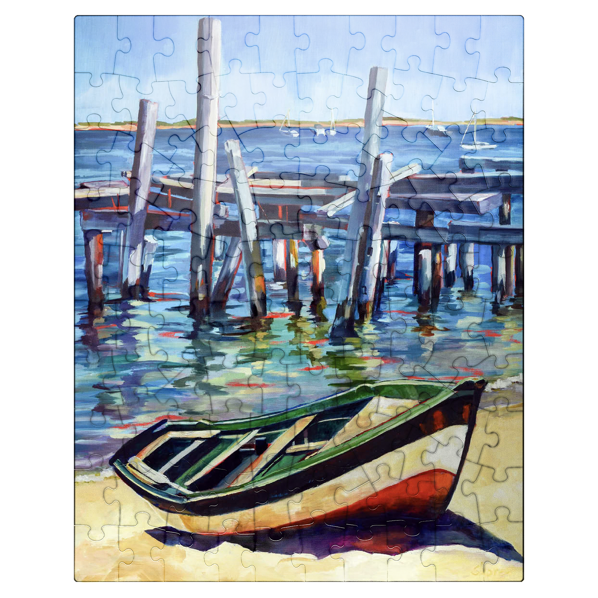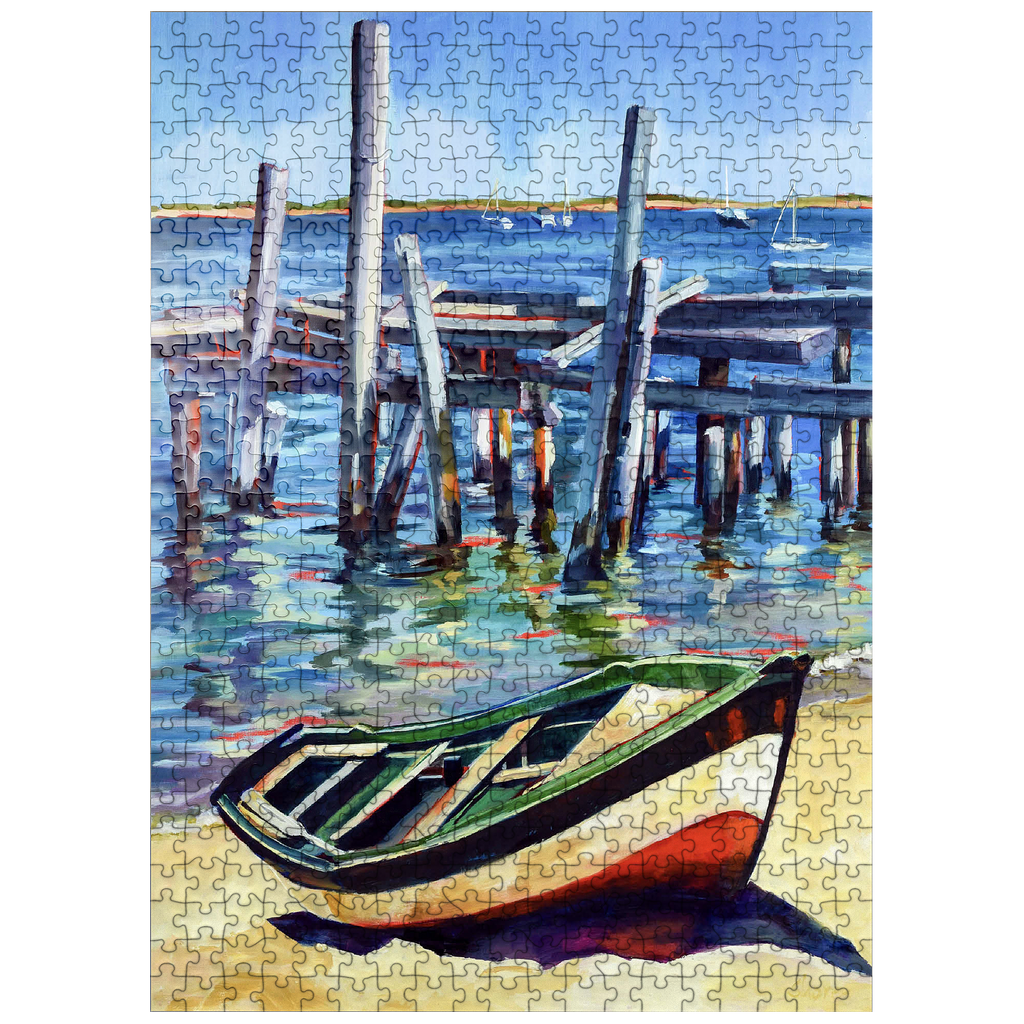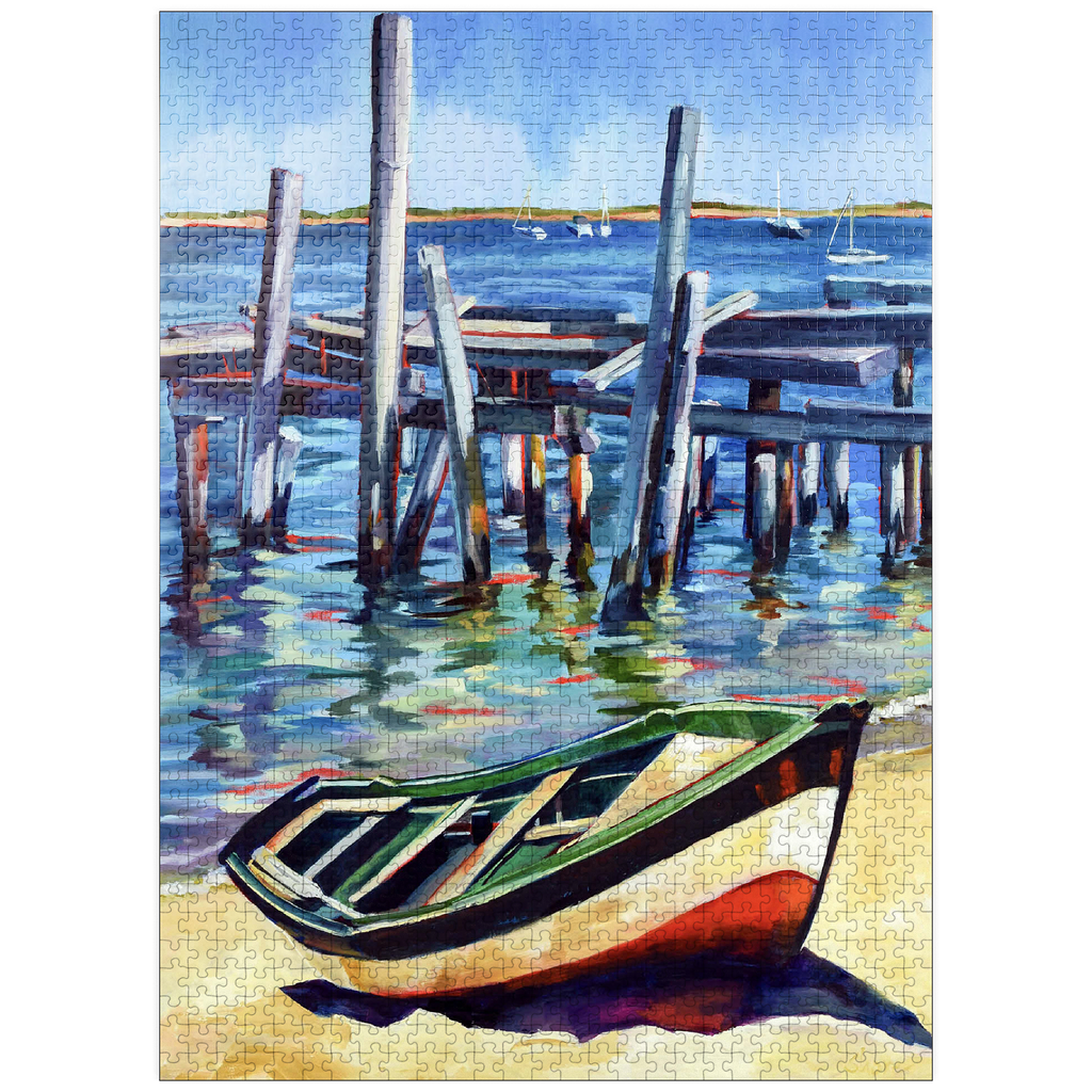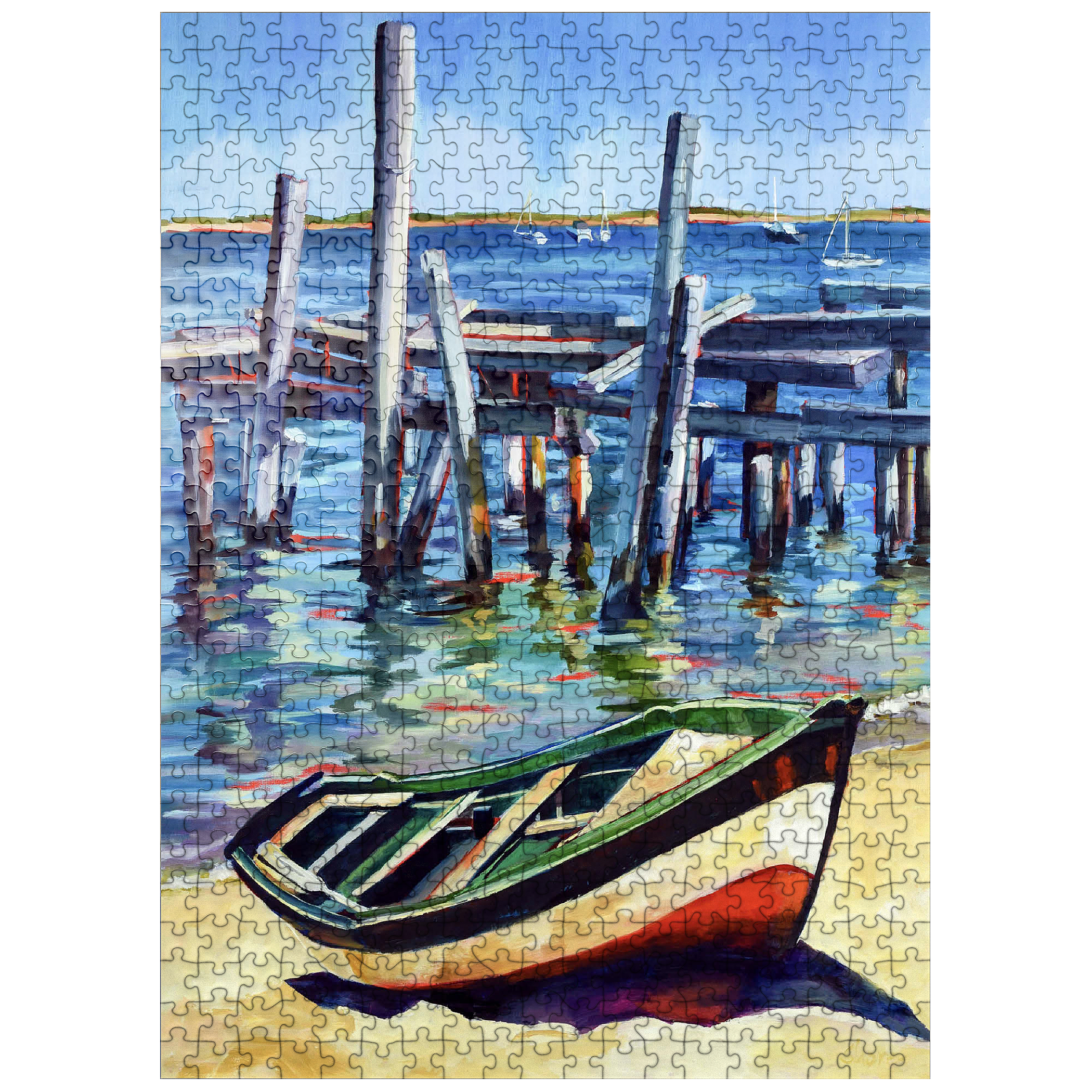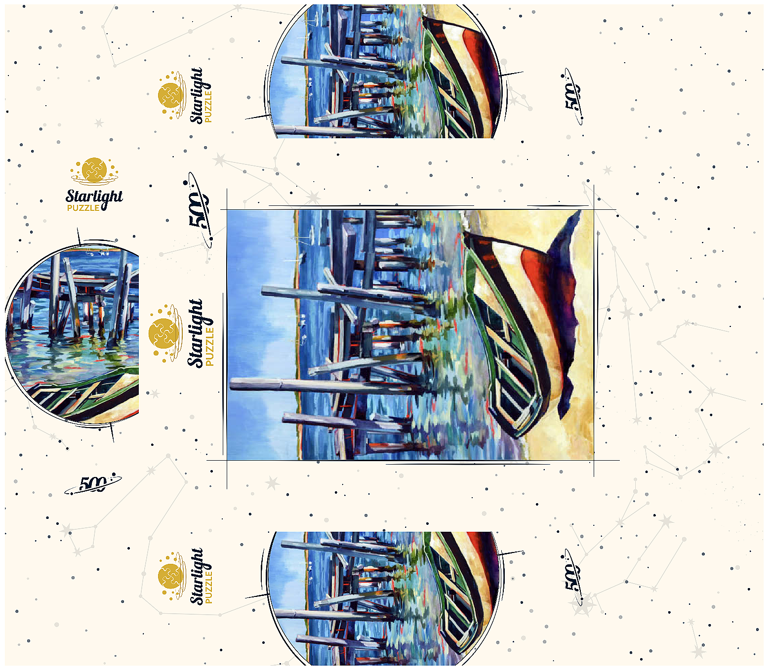 This colorful painting captures a serene coastal scene featuring a weathered wooden rowboat resting on the sandy shore. in the background, aged wooden piers extend into the calm blue waters, their reflections shimmering in vivid hues. sailboats float peacefully in the distance, evoking a sense of timeless seaside charm. the vibrant brushstrokes and bold colors infuse the artwork with a dynamic, yet tranquil energy that celebrates coastal life and rustic beauty.