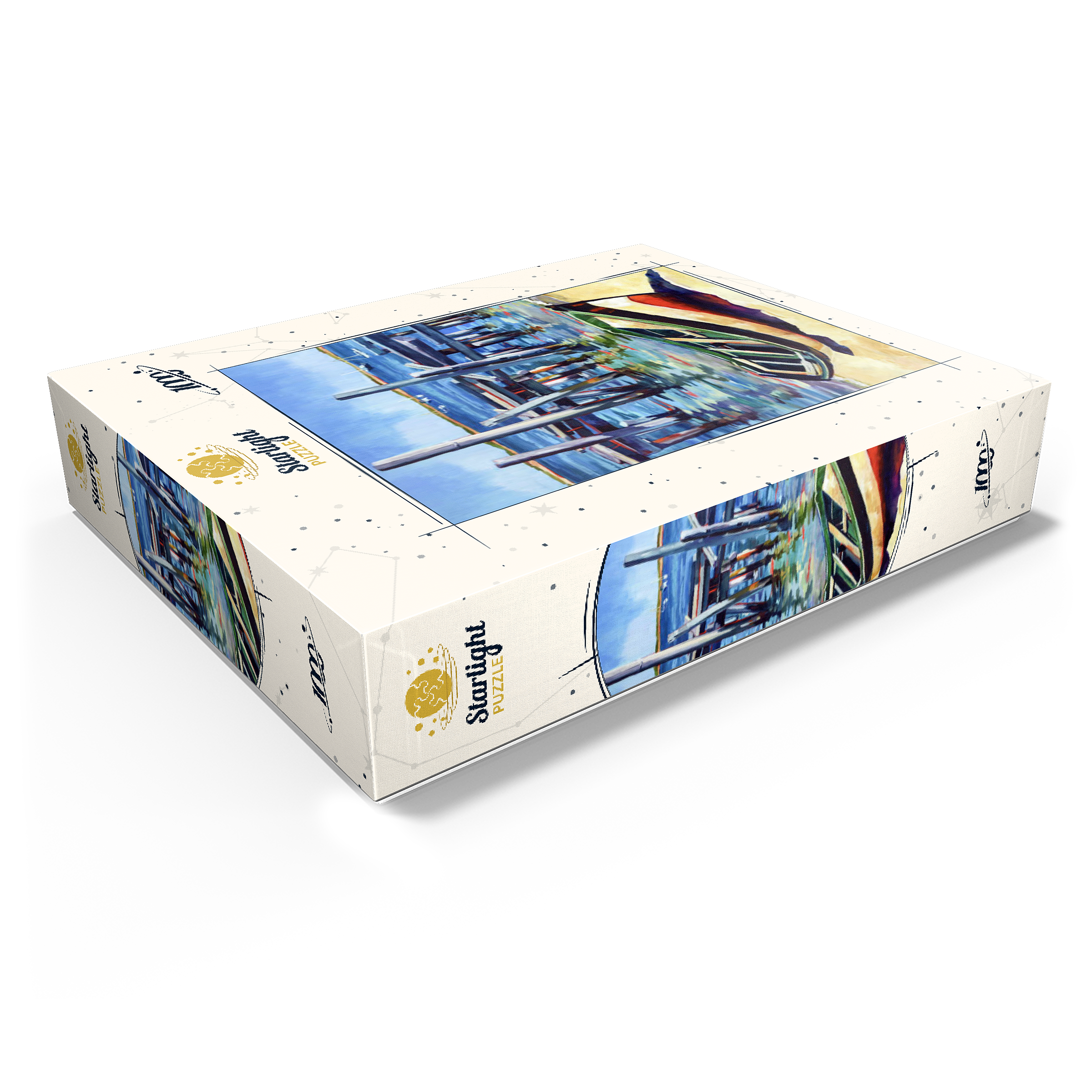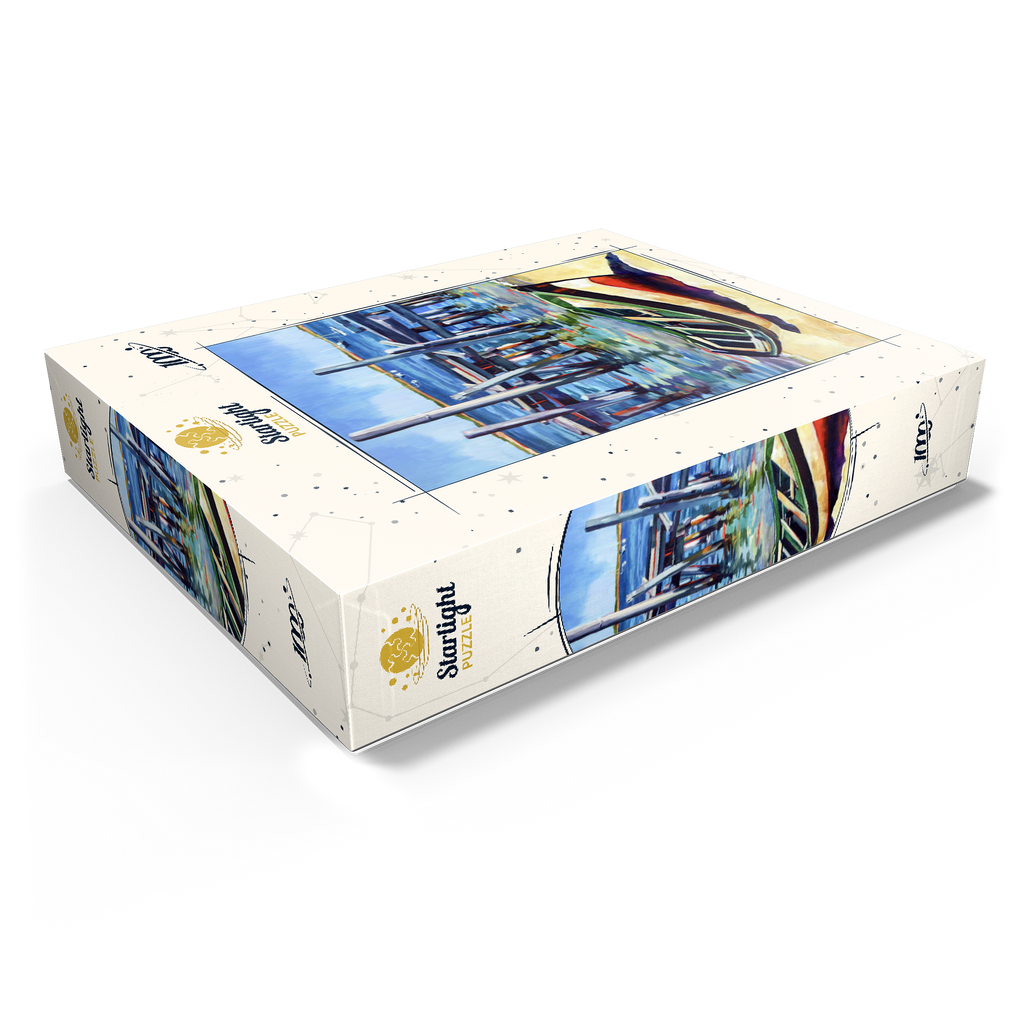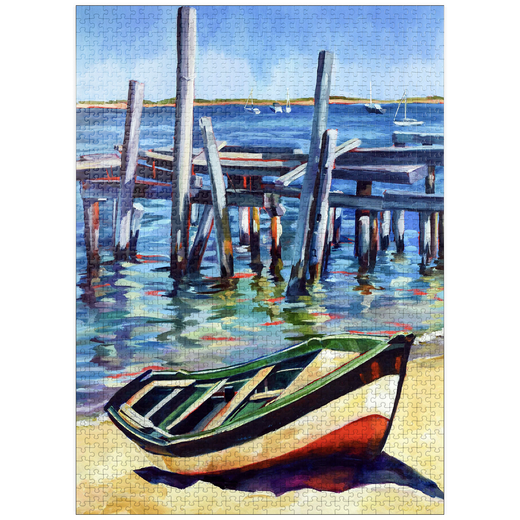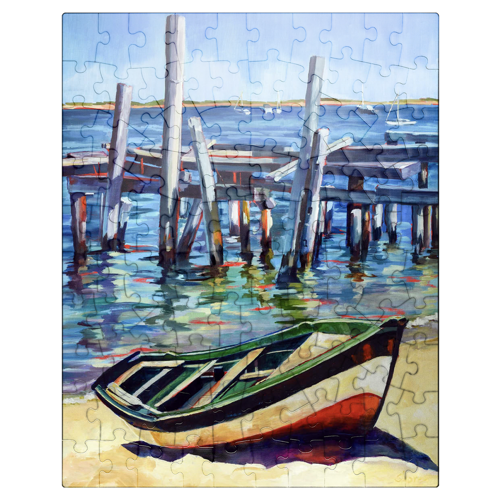This colorful painting captures a serene coastal scene featuring a weathered wooden rowboat resting on the sandy shore. in the background, aged wooden piers extend into the calm blue waters, their reflections shimmering in vivid hues. sailboats float peacefully in the distance, evoking a sense of timeless seaside charm. the vibrant brushstrokes and bold colors infuse the artwork with a dynamic, yet tranquil energy that celebrates coastal life and rustic beauty.