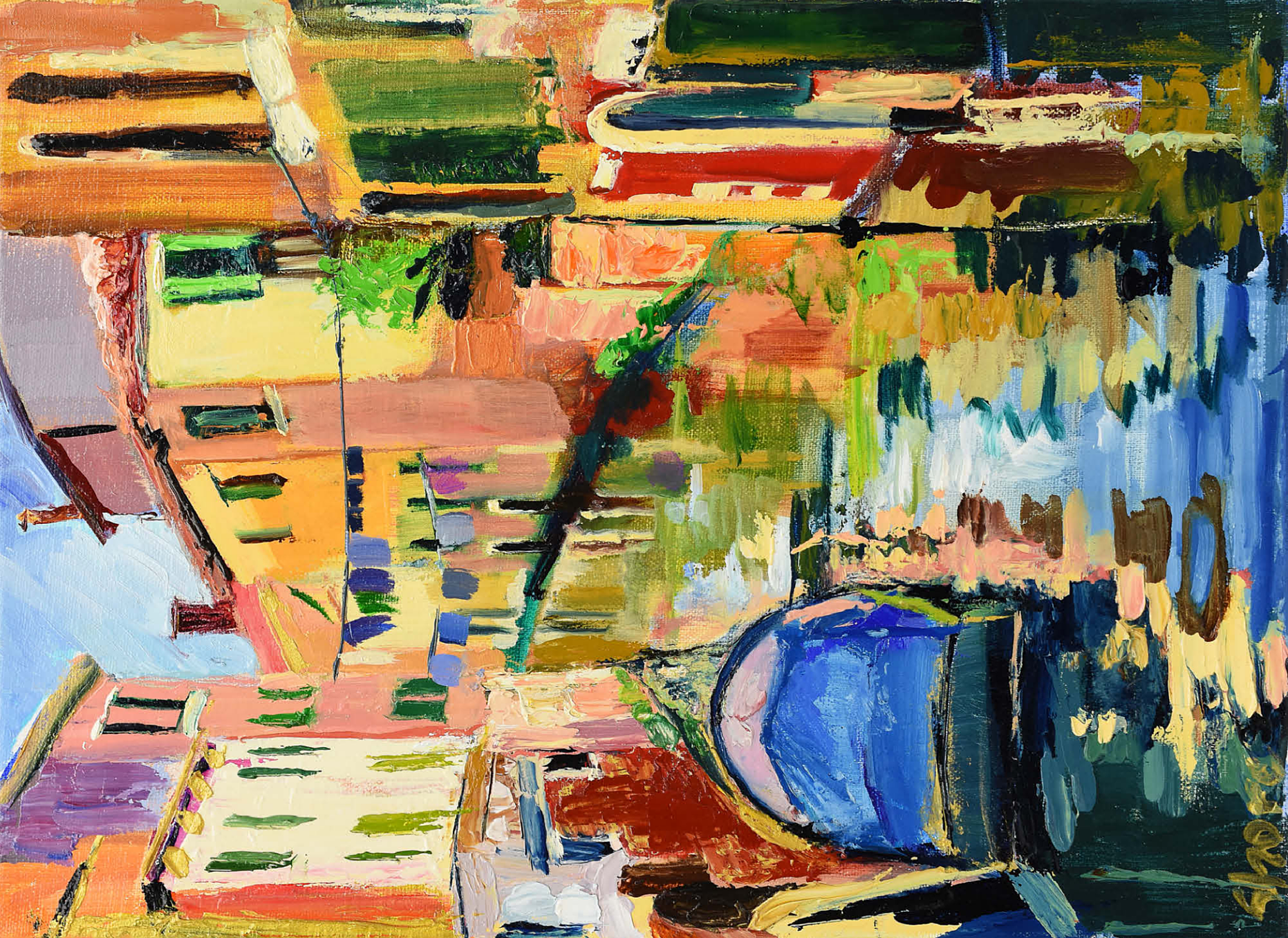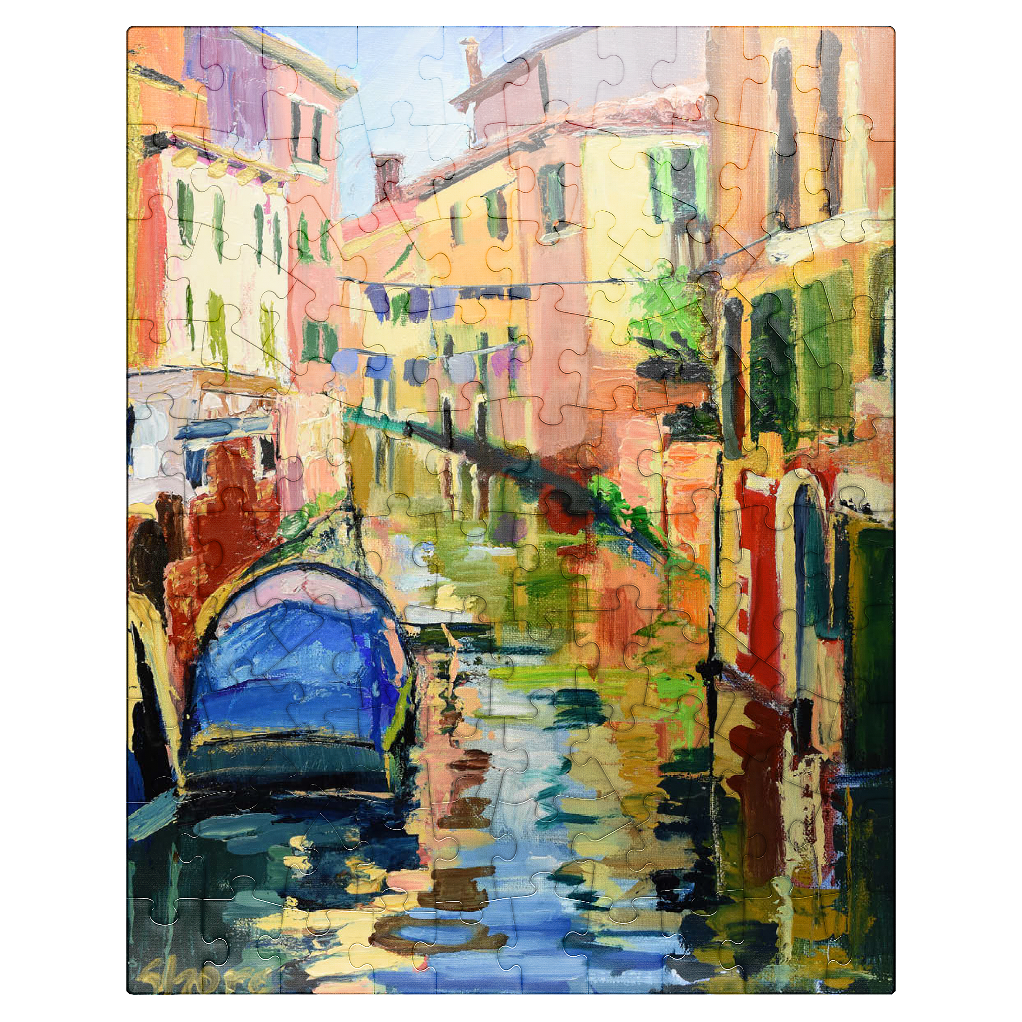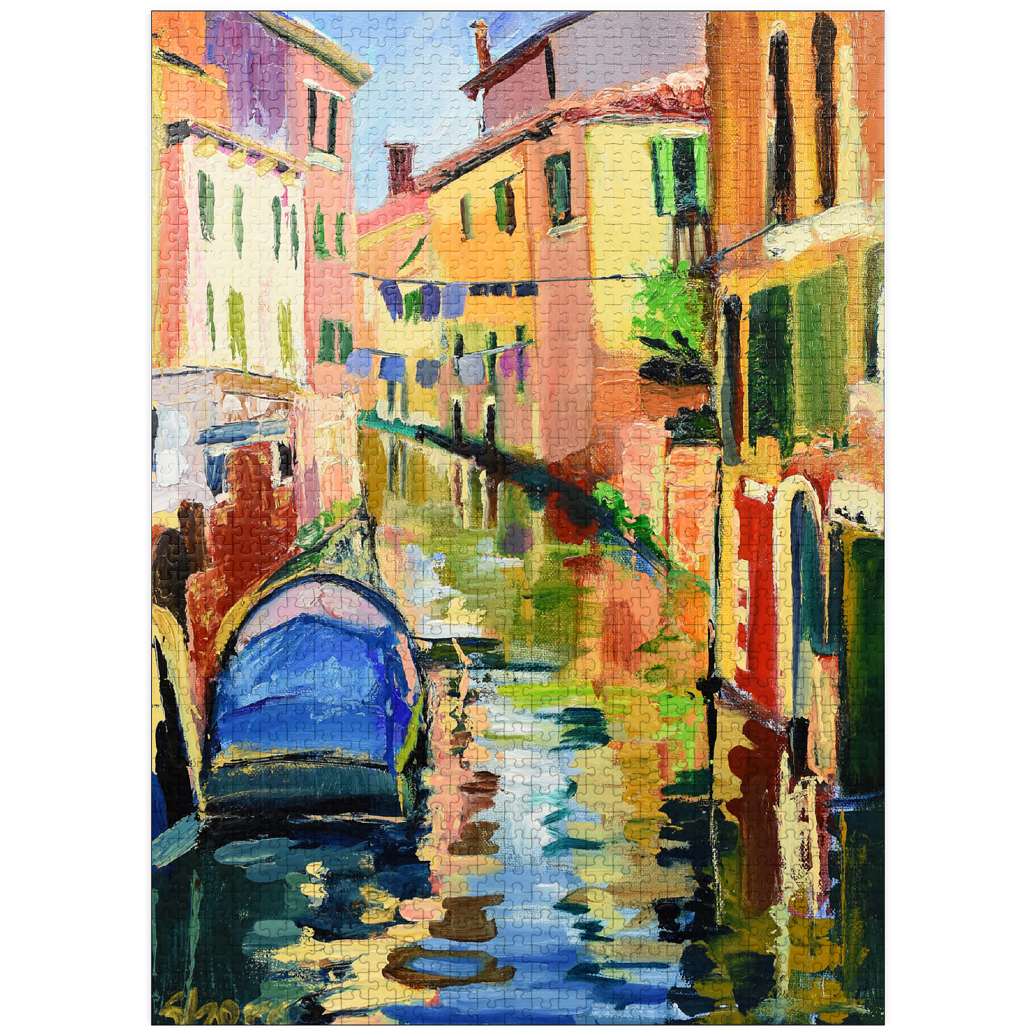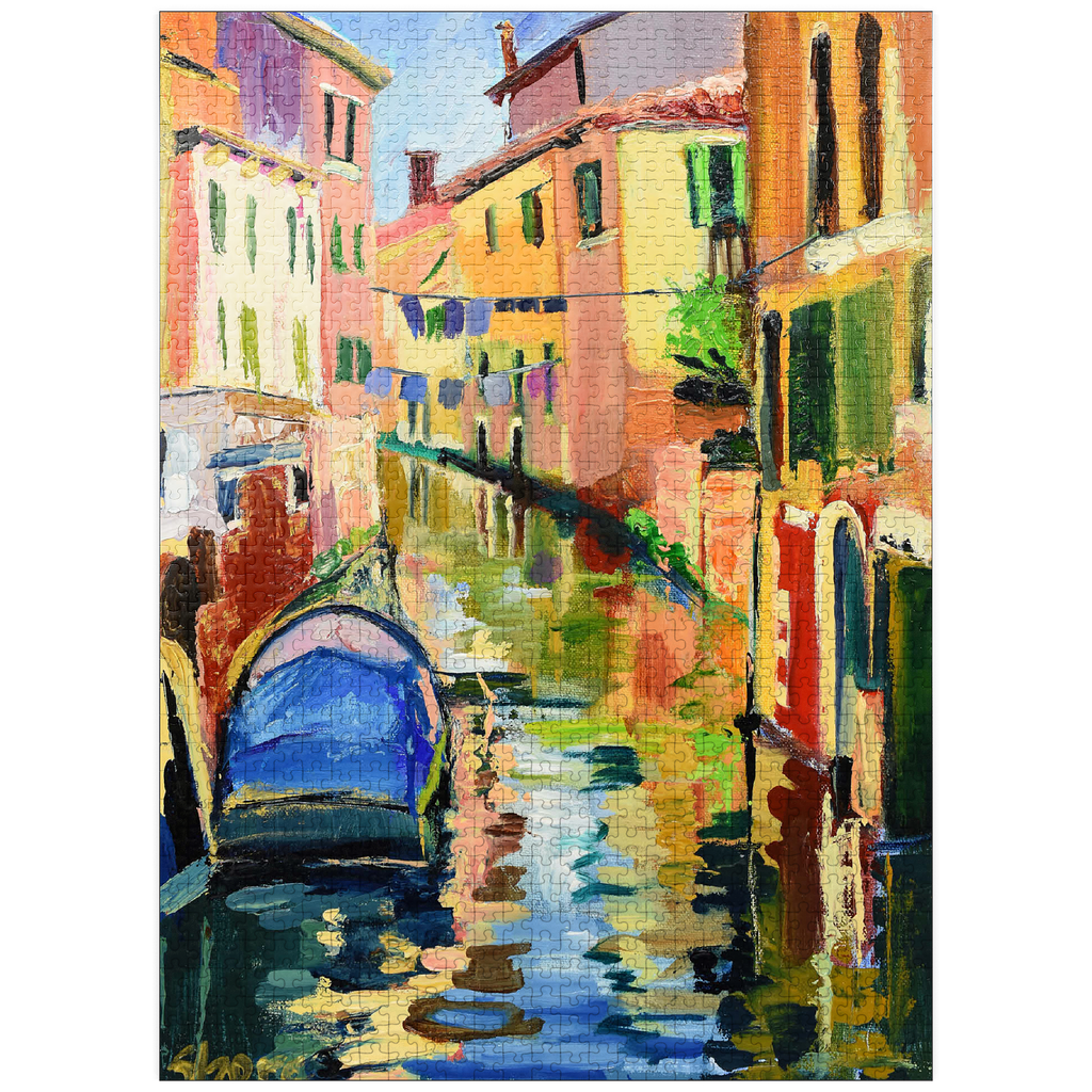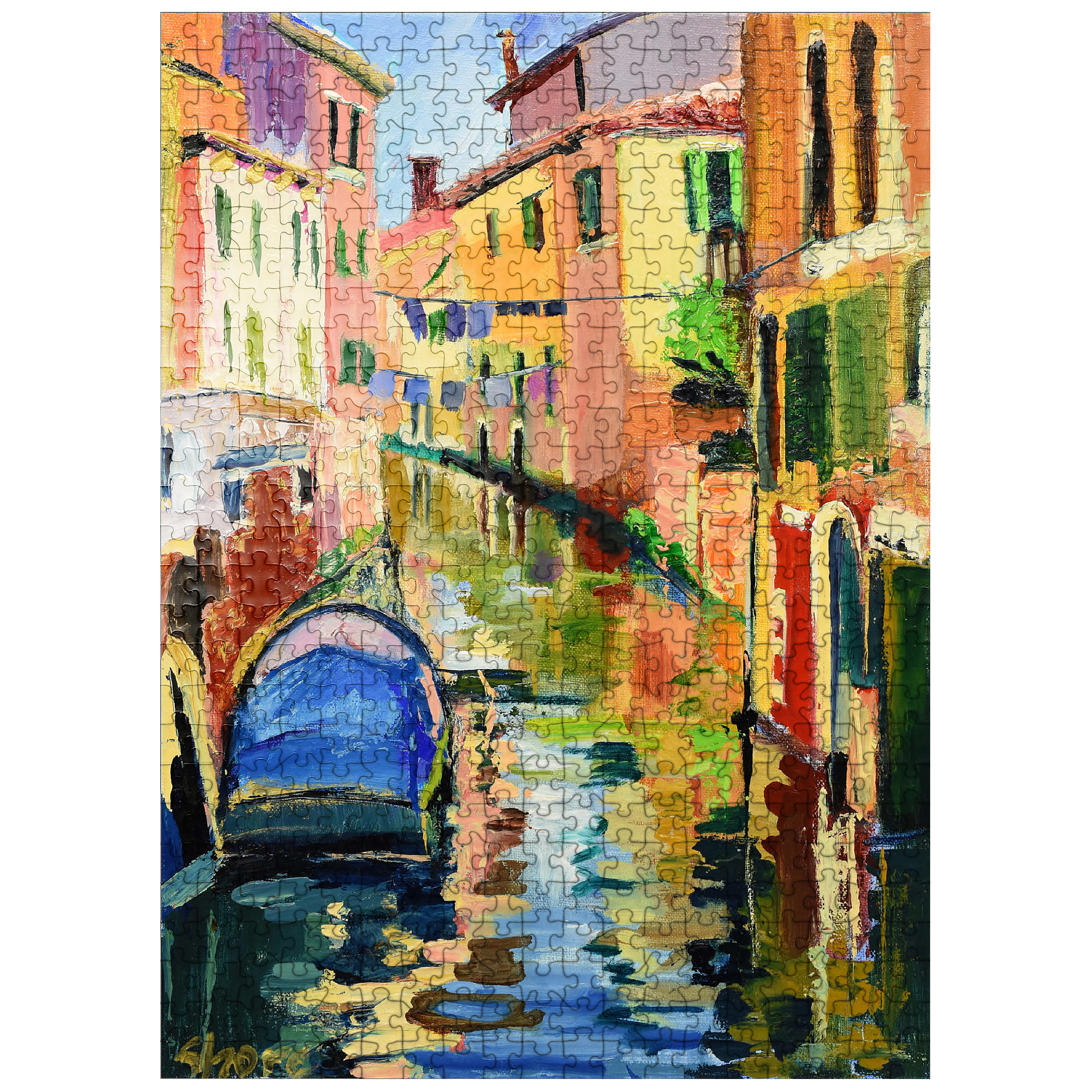 This vibrant impressionist artwork captures the charm of a Venetian canal, bathed in warm sunlight and rich with color. the textured brushstrokes bring movement to the scene, where a blue boat gently floats on the shimmering water, reflecting the warm hues of the historic buildings. green shutters, laundry lines, and rustic facades add to the lively atmosphere of this picturesque Italian setting. the bold, expressive painting style makes this piece a captivating choice for lovers of European cityscapes, modern impressionism, and dynamic, colorful art.
