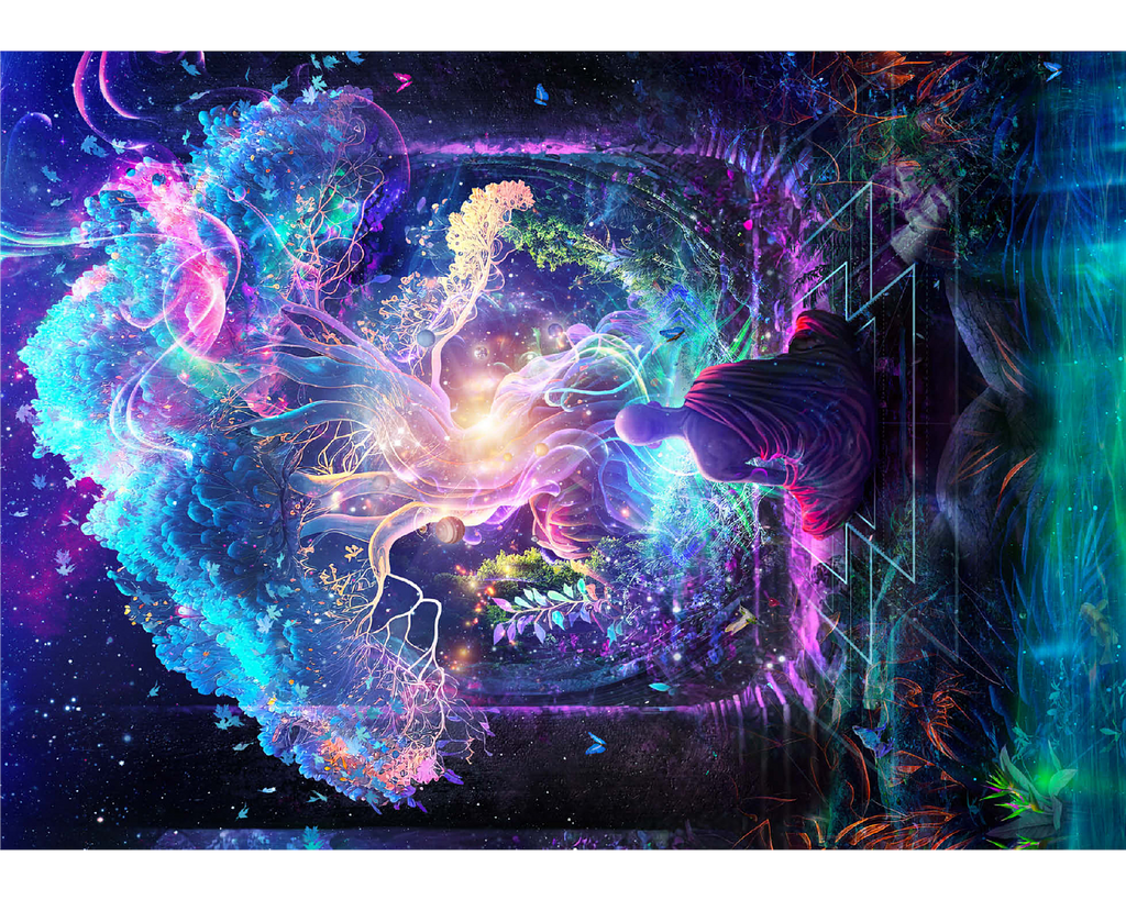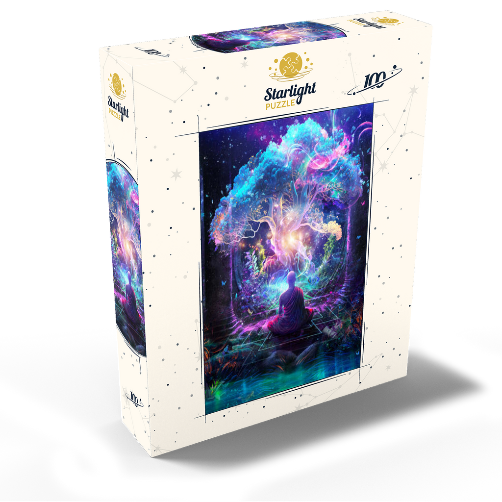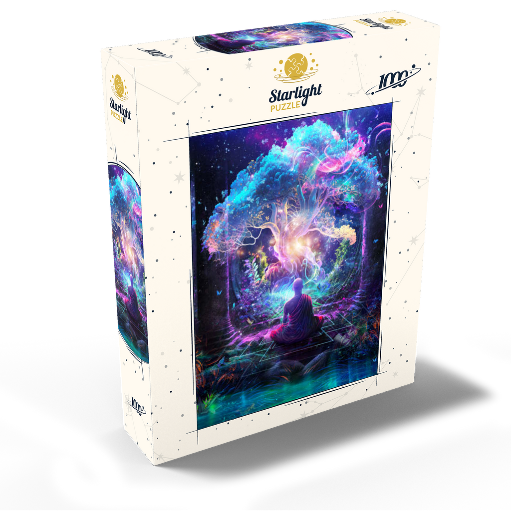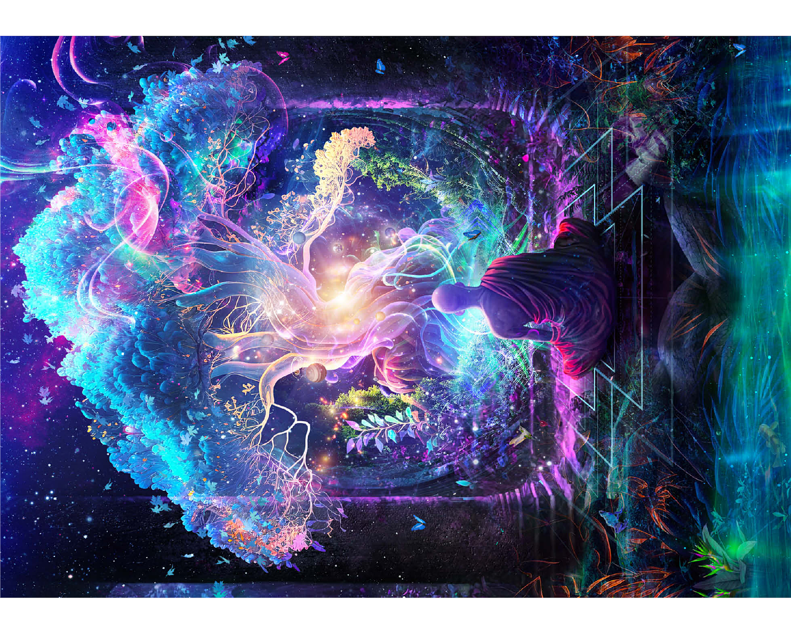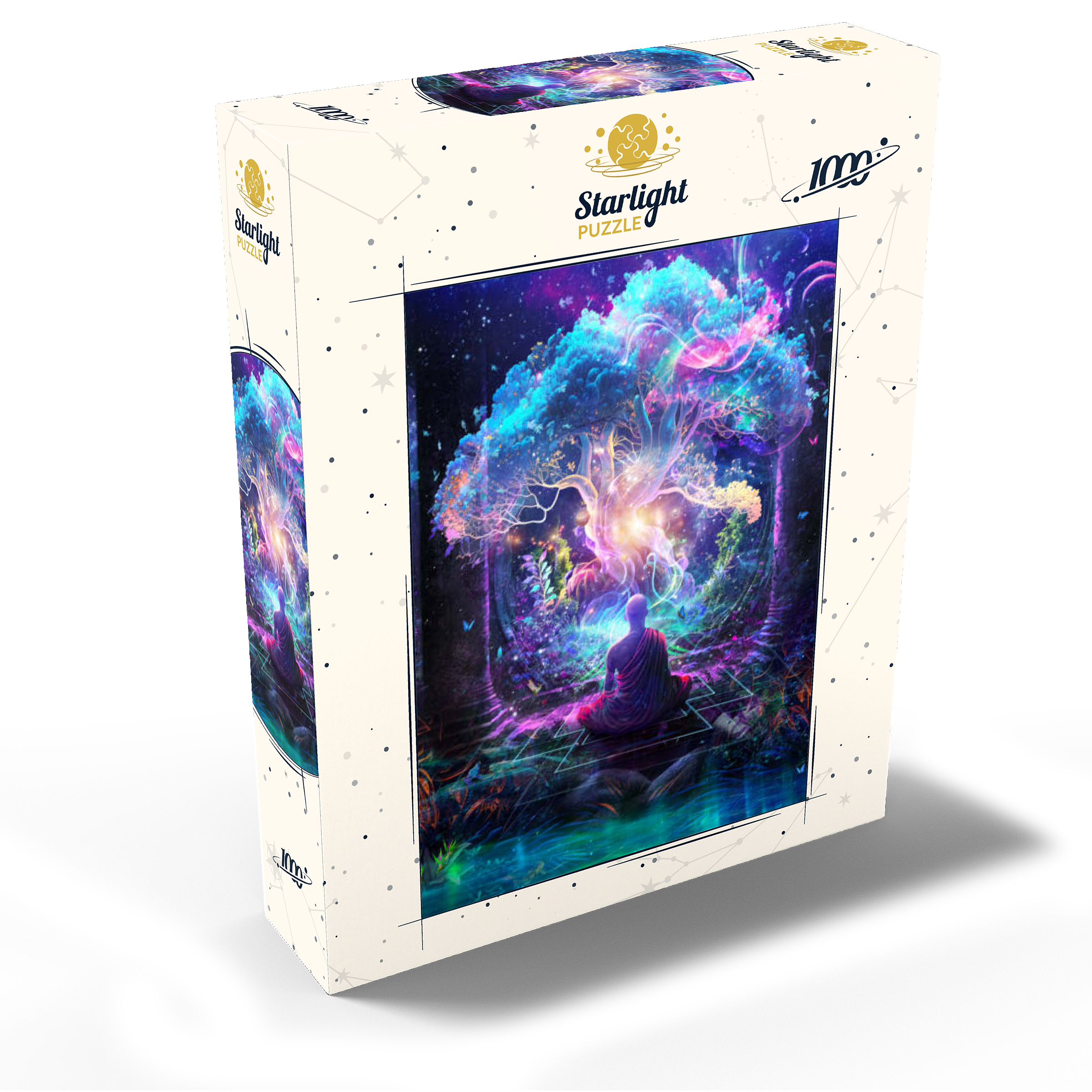 This mesmerizing artwork portrays a serene figure in deep meditation before a radiant, otherworldly tree glowing with cosmic energy. The tree’s ethereal branches shimmer with vibrant hues of blue, pink, and gold, emanating light that fills the mystical, starry environment. Butterflies and luminescent foliage add touches of life to this tranquil yet surreal setting. The reflective pool in the foreground enhances the spiritual ambiance, symbolizing inner peace and enlightenment. This vivid scene captures the essence of harmony, spirituality, and connection with the universe.
