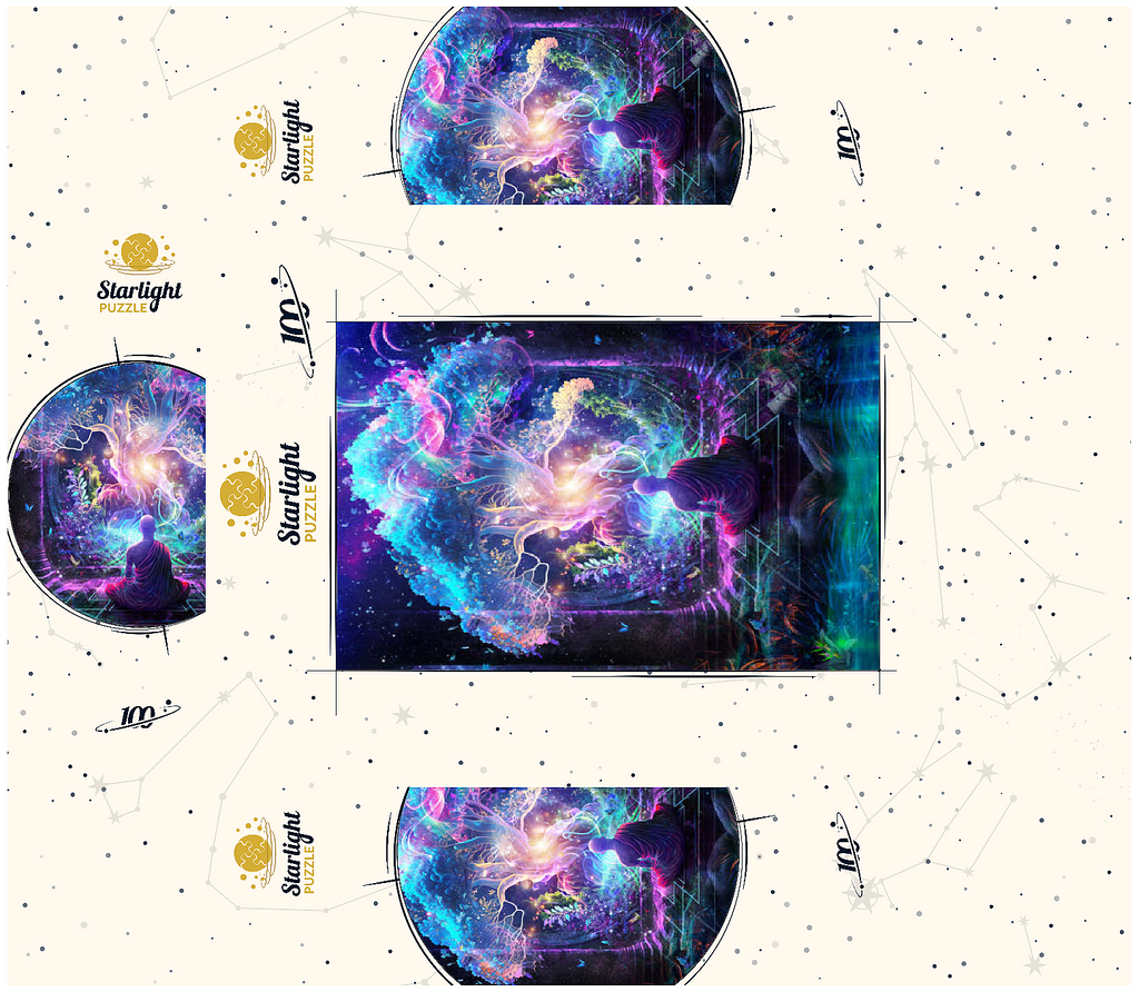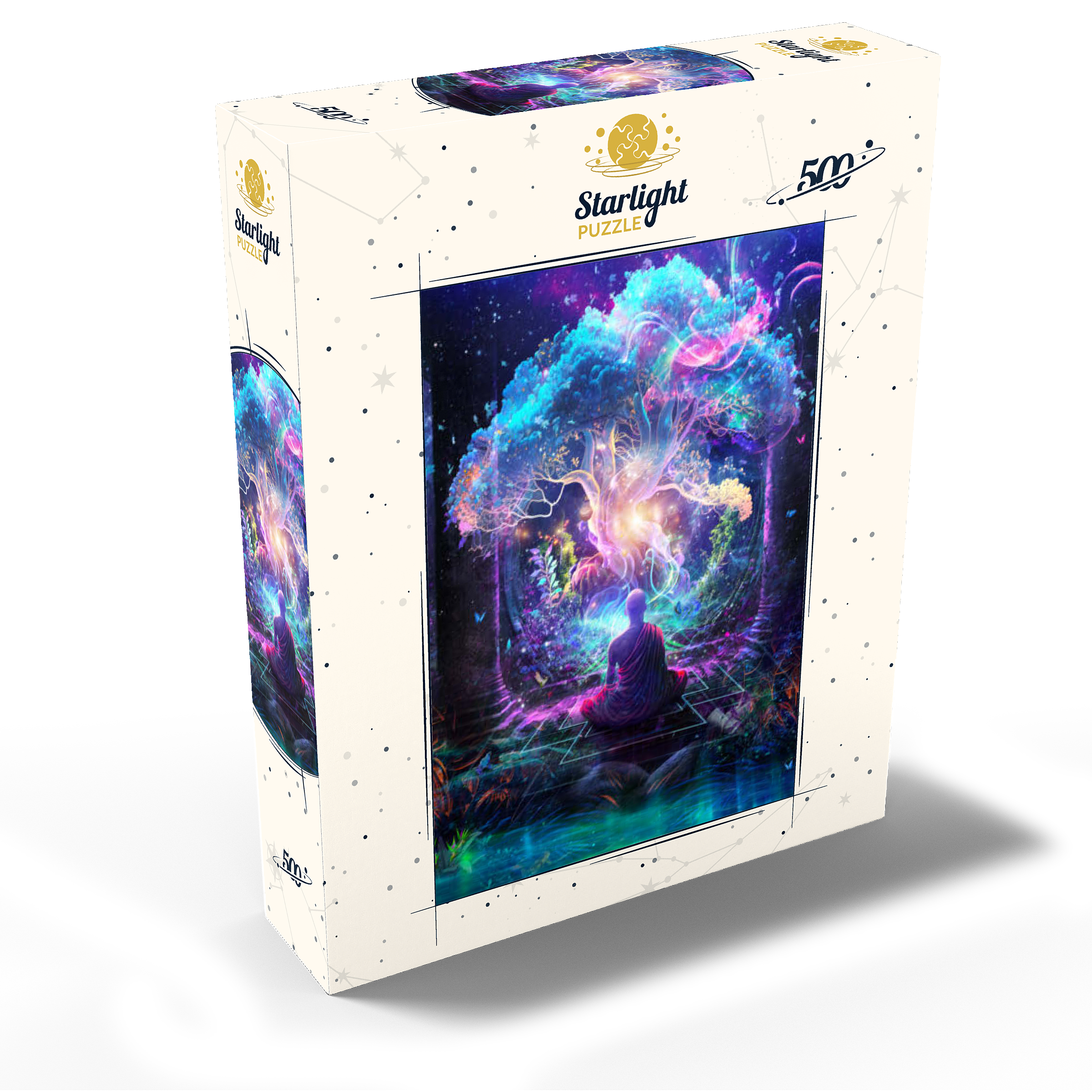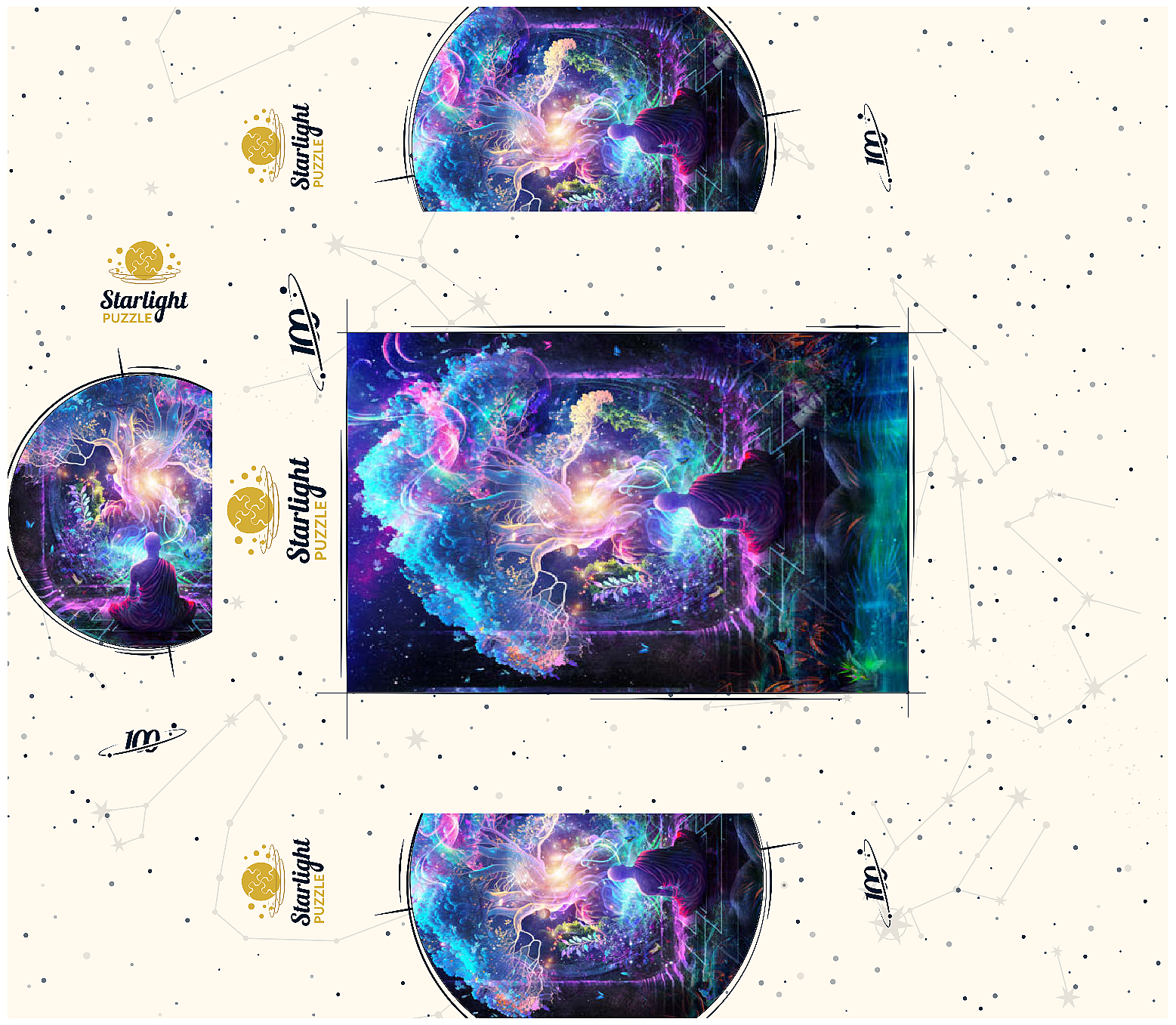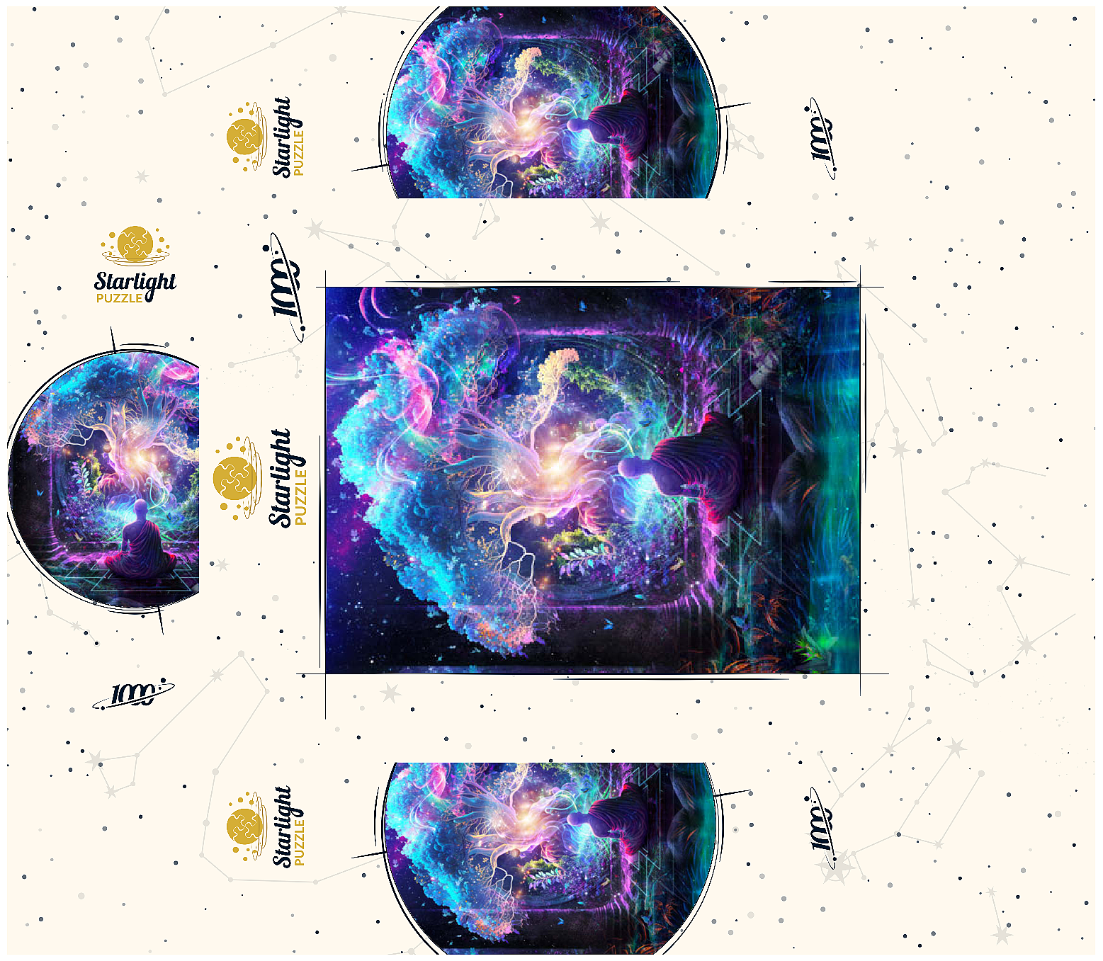 This mesmerizing artwork portrays a serene figure in deep meditation before a radiant, otherworldly tree glowing with cosmic energy. The tree’s ethereal branches shimmer with vibrant hues of blue, pink, and gold, emanating light that fills the mystical, starry environment. Butterflies and luminescent foliage add touches of life to this tranquil yet surreal setting. The reflective pool in the foreground enhances the spiritual ambiance, symbolizing inner peace and enlightenment. This vivid scene captures the essence of harmony, spirituality, and connection with the universe.