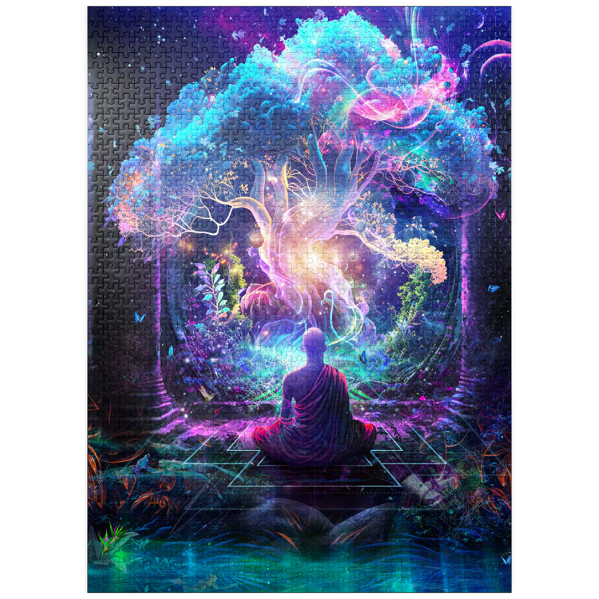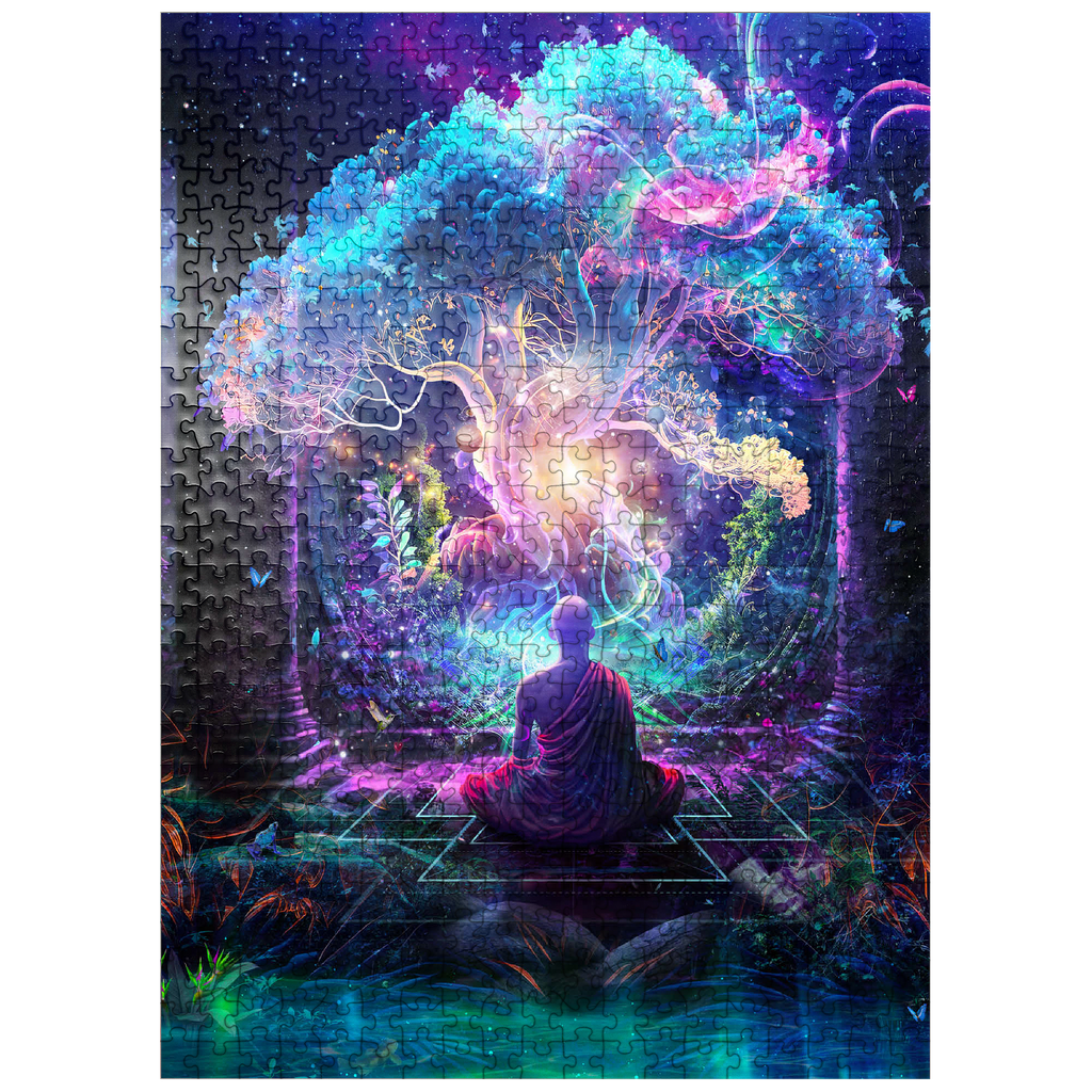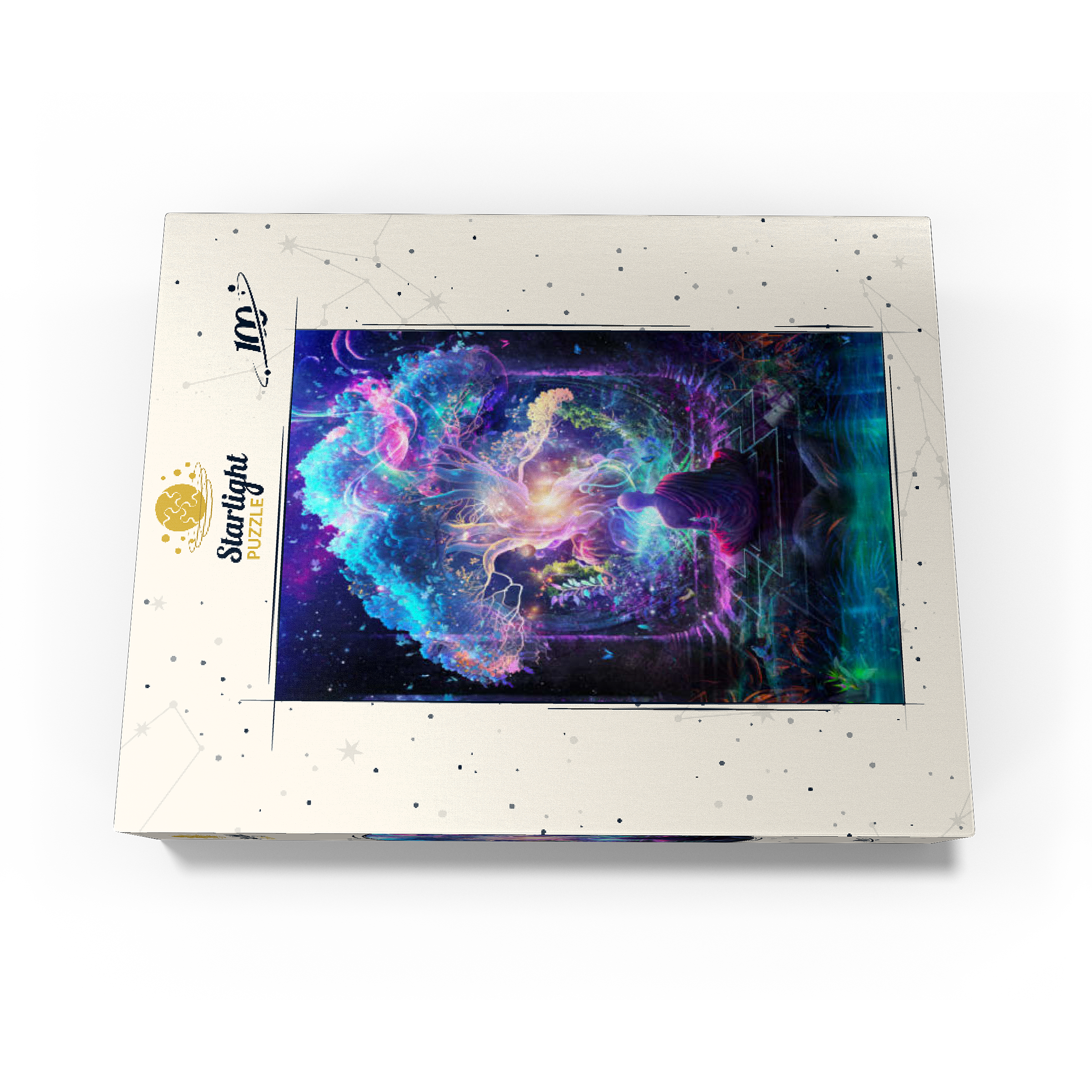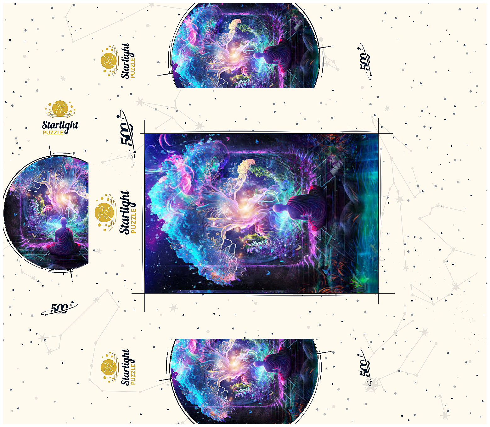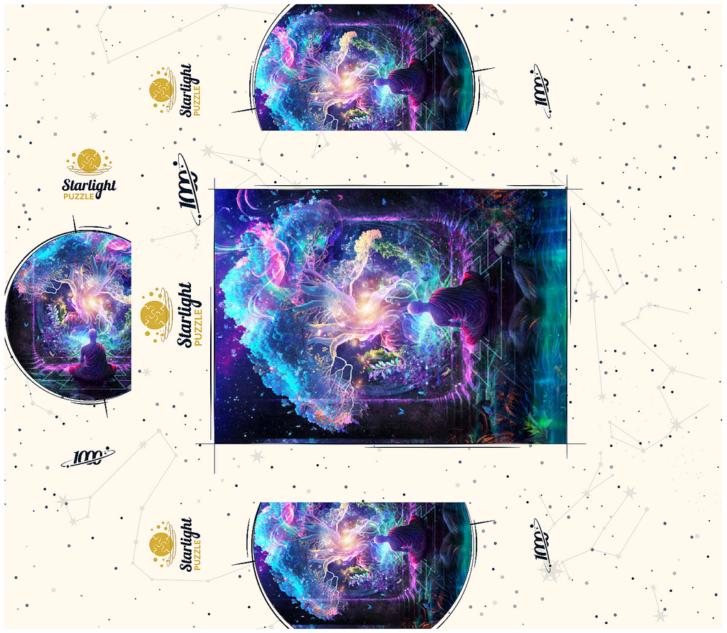 This mesmerizing artwork portrays a serene figure in deep meditation before a radiant, otherworldly tree glowing with cosmic energy. The tree’s ethereal branches shimmer with vibrant hues of blue, pink, and gold, emanating light that fills the mystical, starry environment. Butterflies and luminescent foliage add touches of life to this tranquil yet surreal setting. The reflective pool in the foreground enhances the spiritual ambiance, symbolizing inner peace and enlightenment. This vivid scene captures the essence of harmony, spirituality, and connection with the universe.