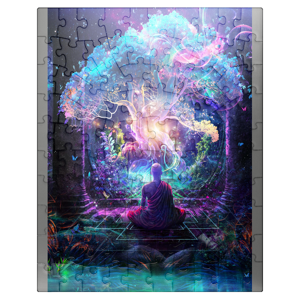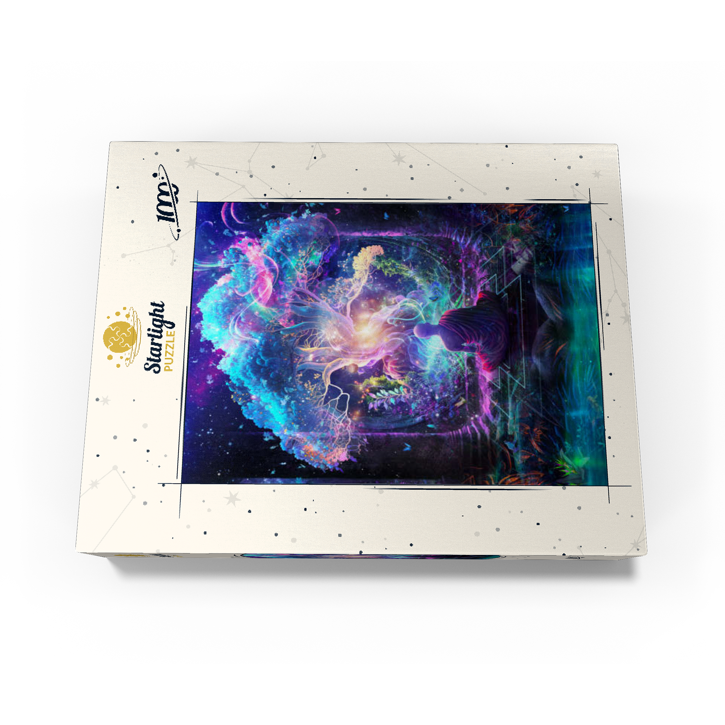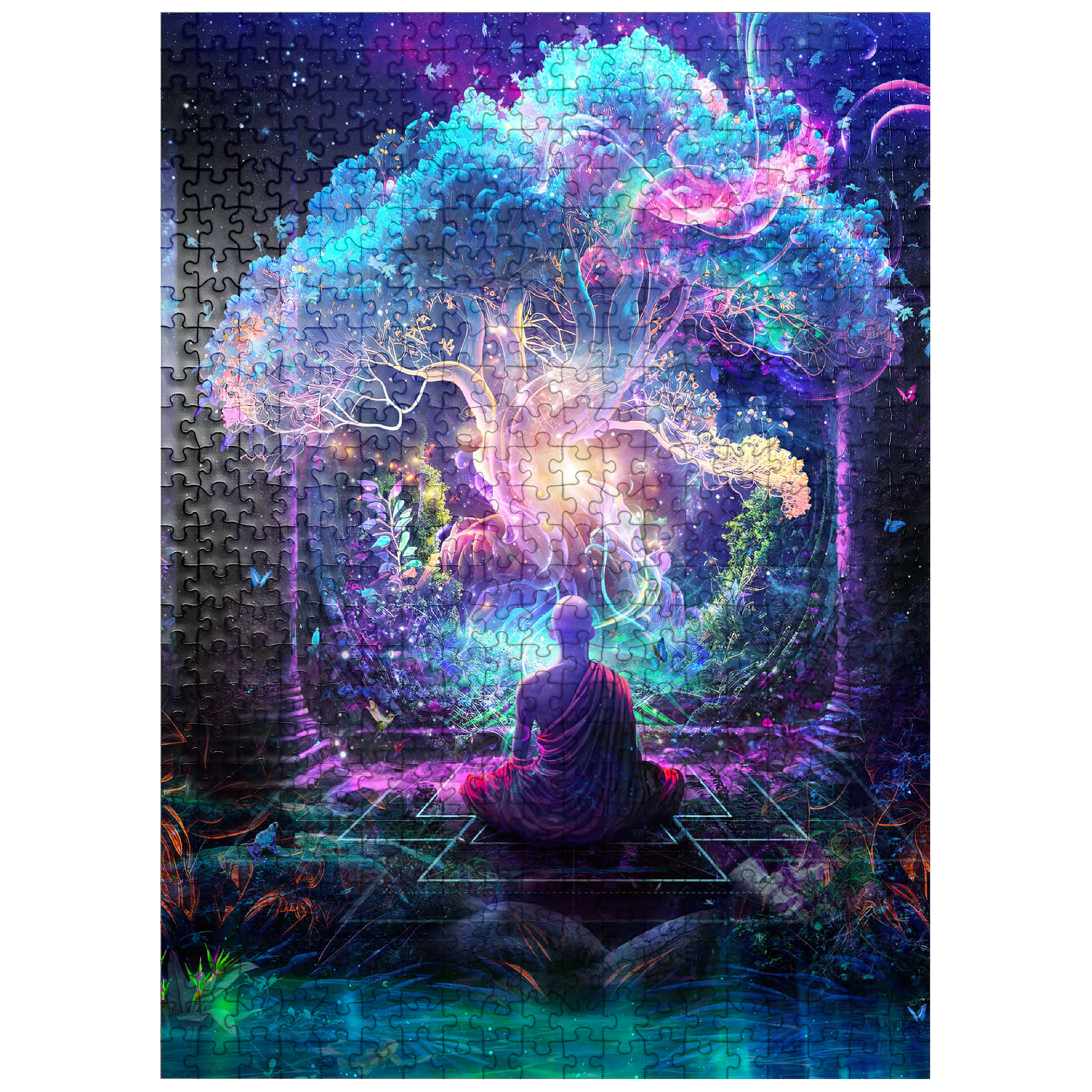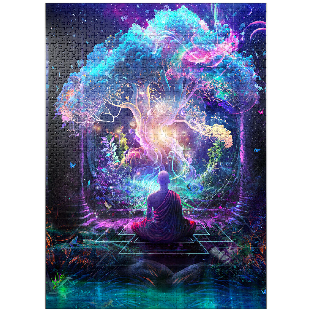This mesmerizing artwork portrays a serene figure in deep meditation before a radiant, otherworldly tree glowing with cosmic energy. The tree’s ethereal branches shimmer with vibrant hues of blue, pink, and gold, emanating light that fills the mystical, starry environment. Butterflies and luminescent foliage add touches of life to this tranquil yet surreal setting. The reflective pool in the foreground enhances the spiritual ambiance, symbolizing inner peace and enlightenment. This vivid scene captures the essence of harmony, spirituality, and connection with the universe.