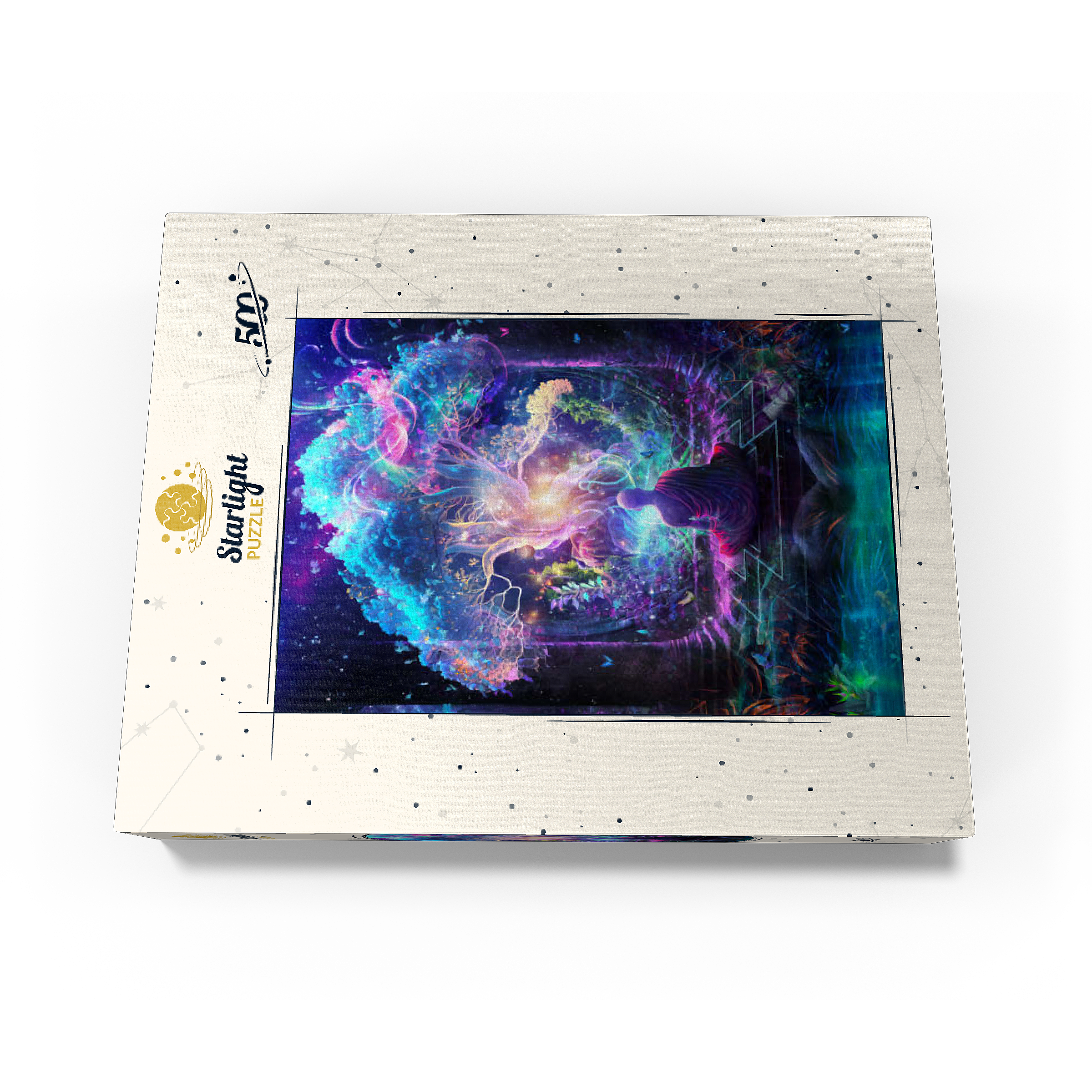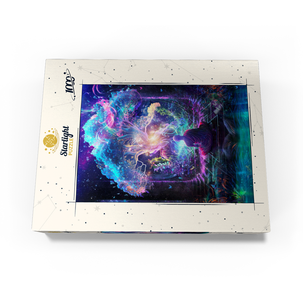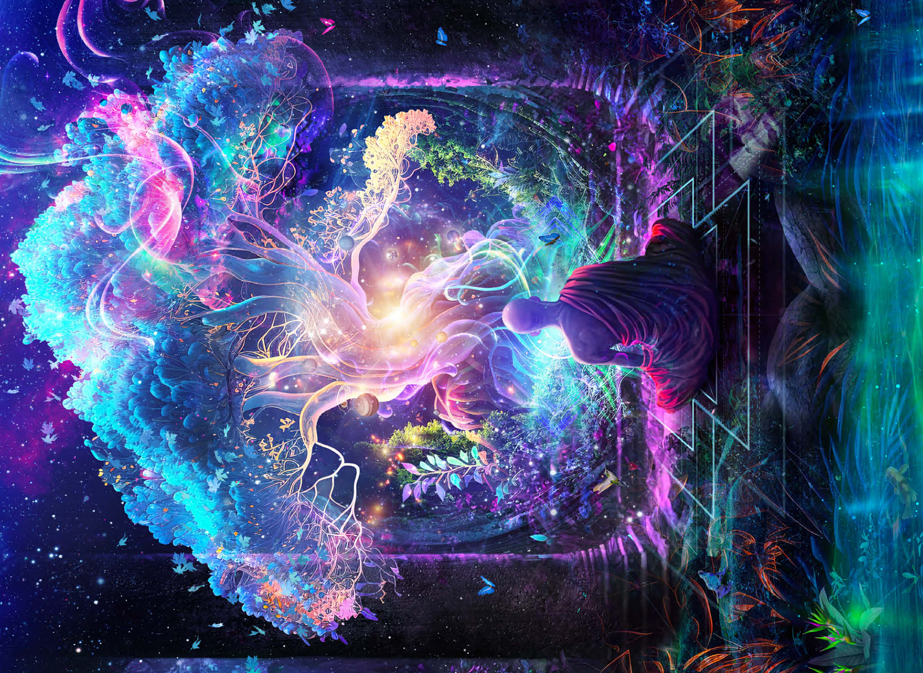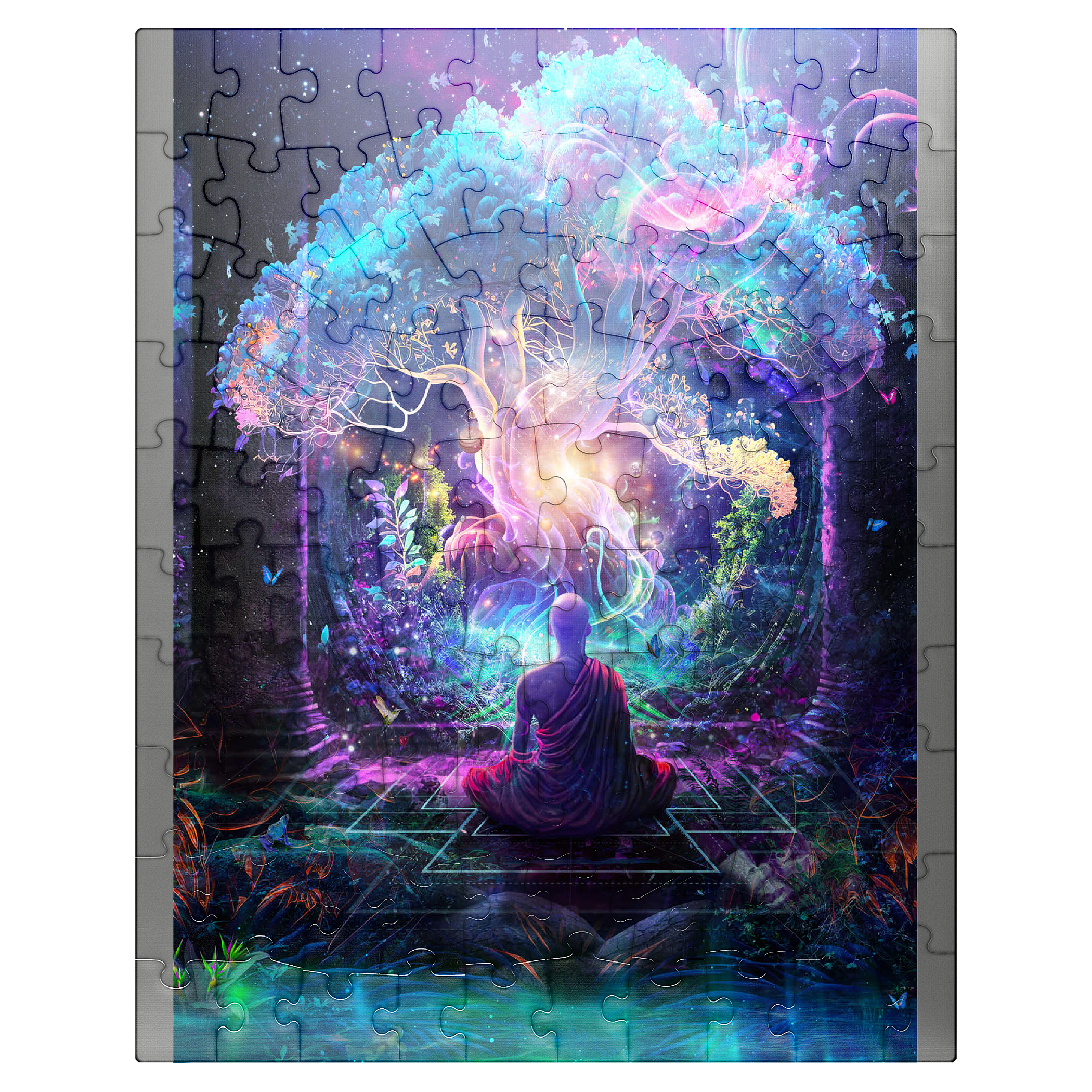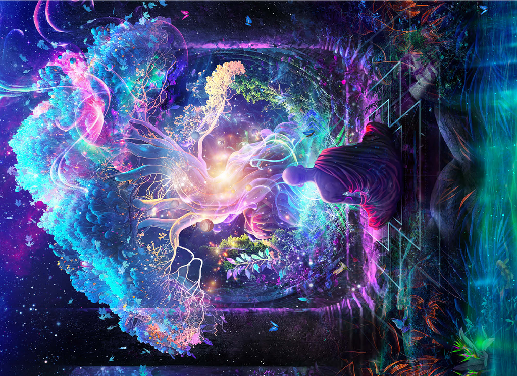 This mesmerizing artwork portrays a serene figure in deep meditation before a radiant, otherworldly tree glowing with cosmic energy. The tree’s ethereal branches shimmer with vibrant hues of blue, pink, and gold, emanating light that fills the mystical, starry environment. Butterflies and luminescent foliage add touches of life to this tranquil yet surreal setting. The reflective pool in the foreground enhances the spiritual ambiance, symbolizing inner peace and enlightenment. This vivid scene captures the essence of harmony, spirituality, and connection with the universe.