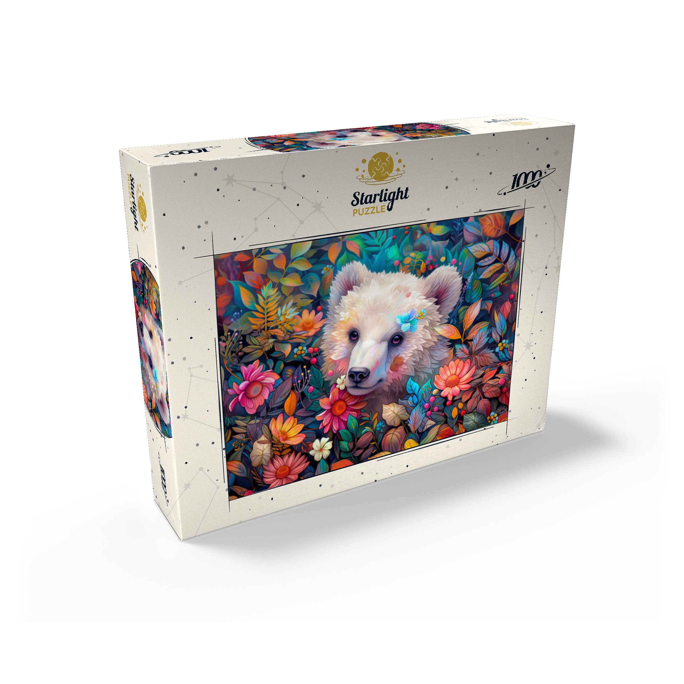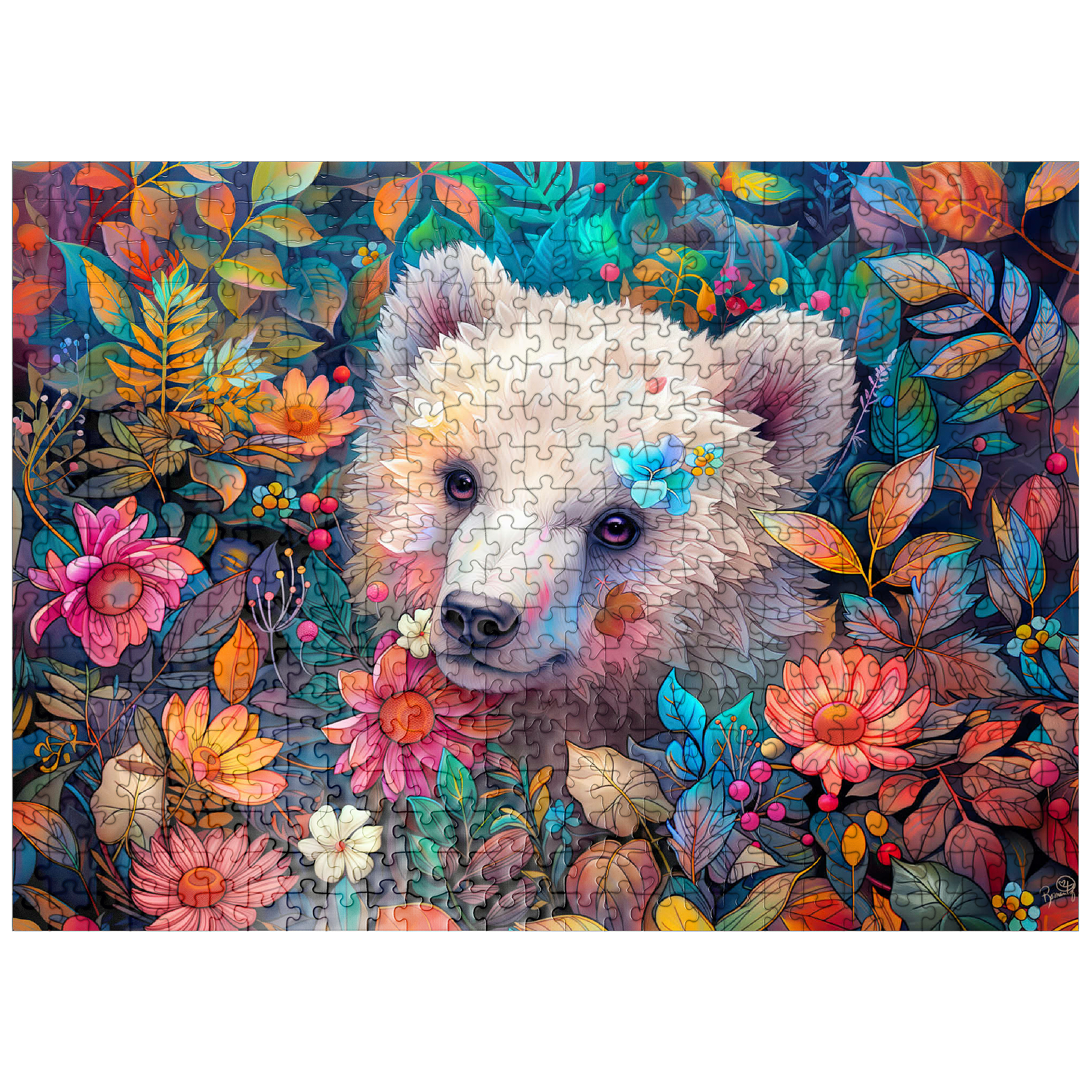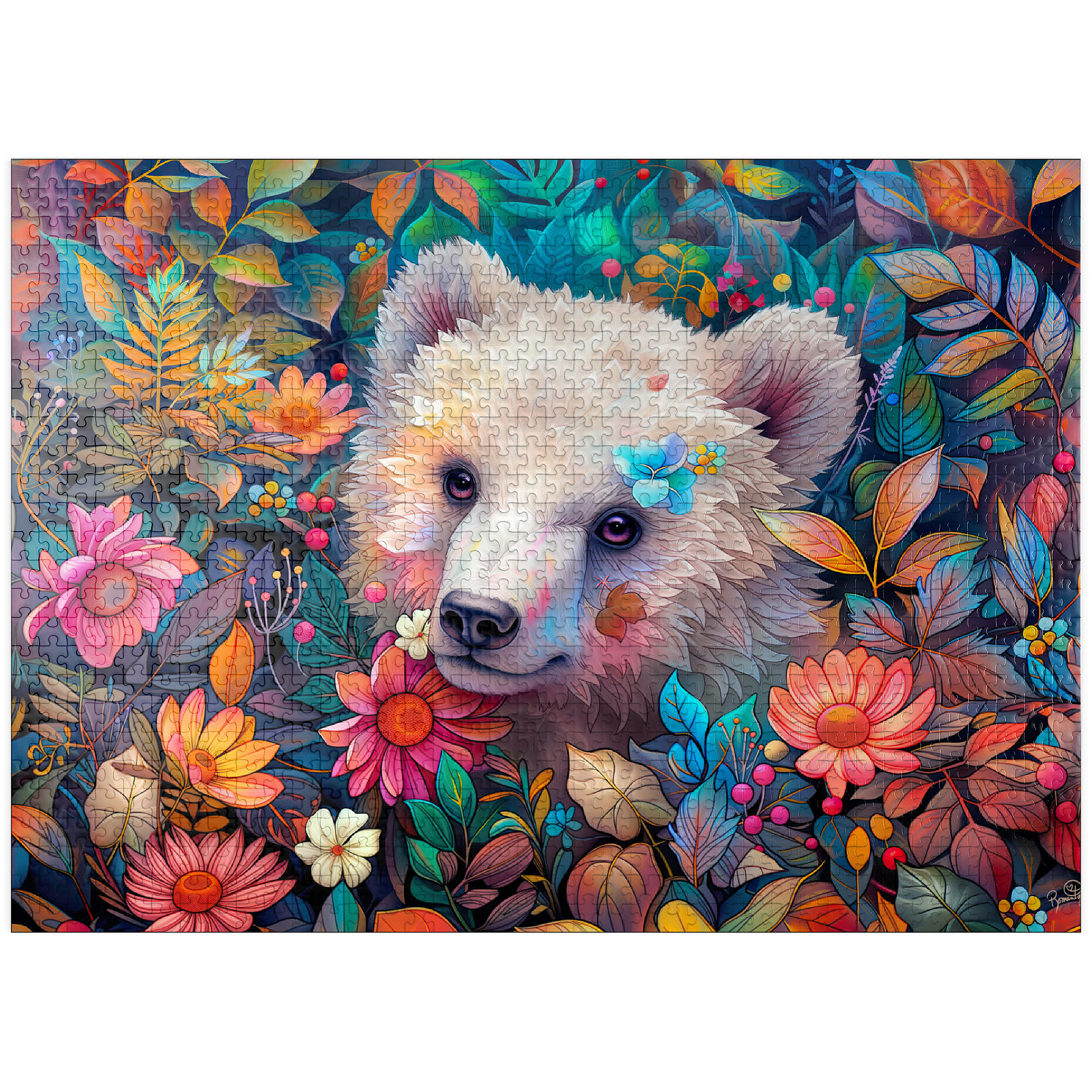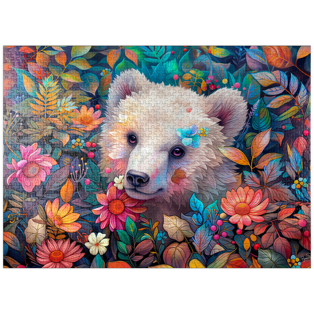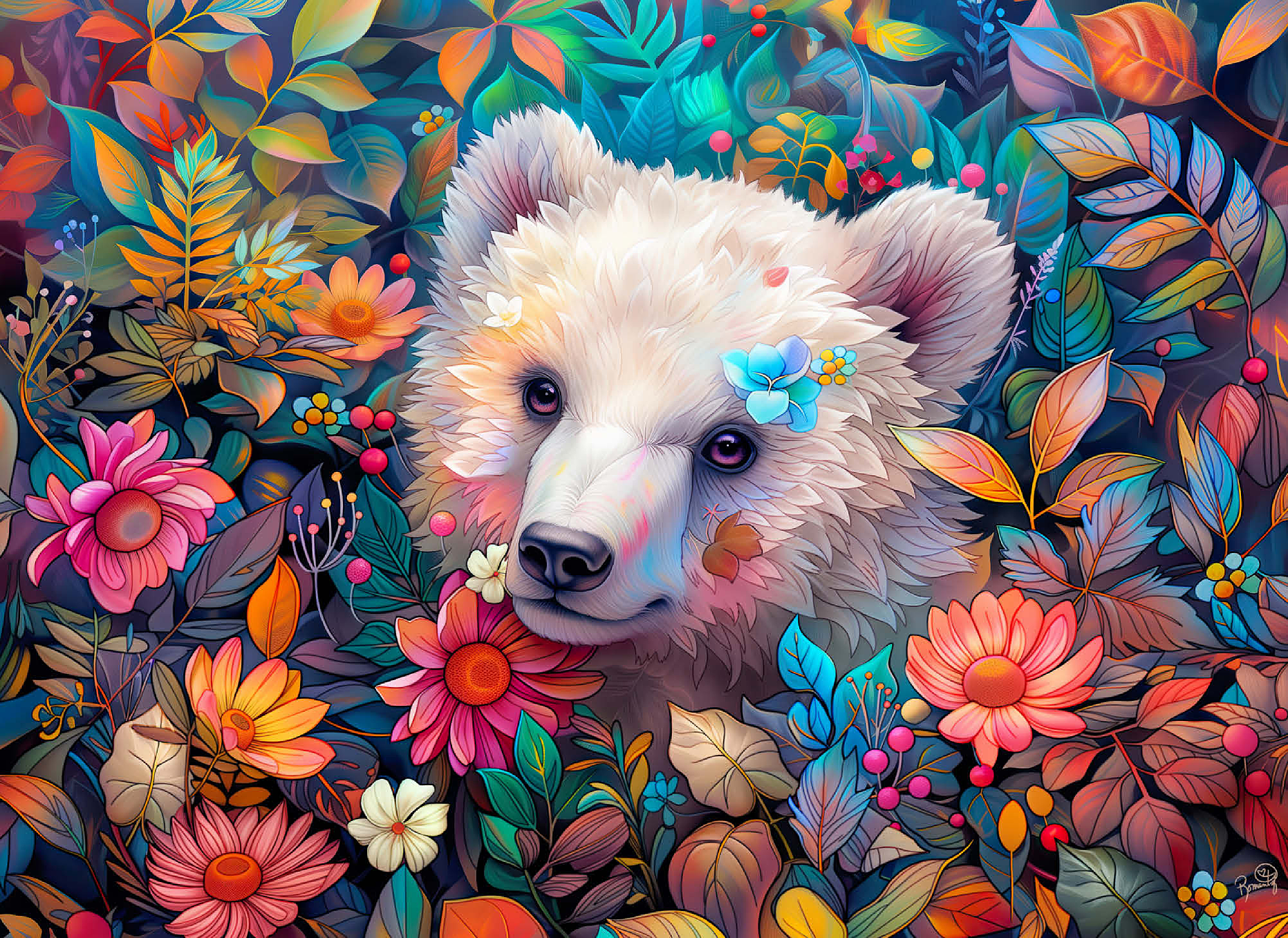 A charming digital artwork depicting an adorable white bear cub peeking through a lush floral landscape. the cub's gentle expression and soft fur are accentuated by colorful blossoms and foliage in shades of pink, orange, yellow, and blue. delicate flowers are tucked into its fur, adding a whimsical touch. the rich, vibrant background features detailed leaves, berries, and petals, creating a magical forest atmosphere. this enchanting piece is perfect for nature lovers, wildlife enthusiasts, and fans of imaginative animal portraits. ideal for wall art, nursery decor, or as a statement piece in any cozy space.