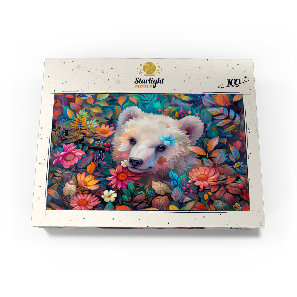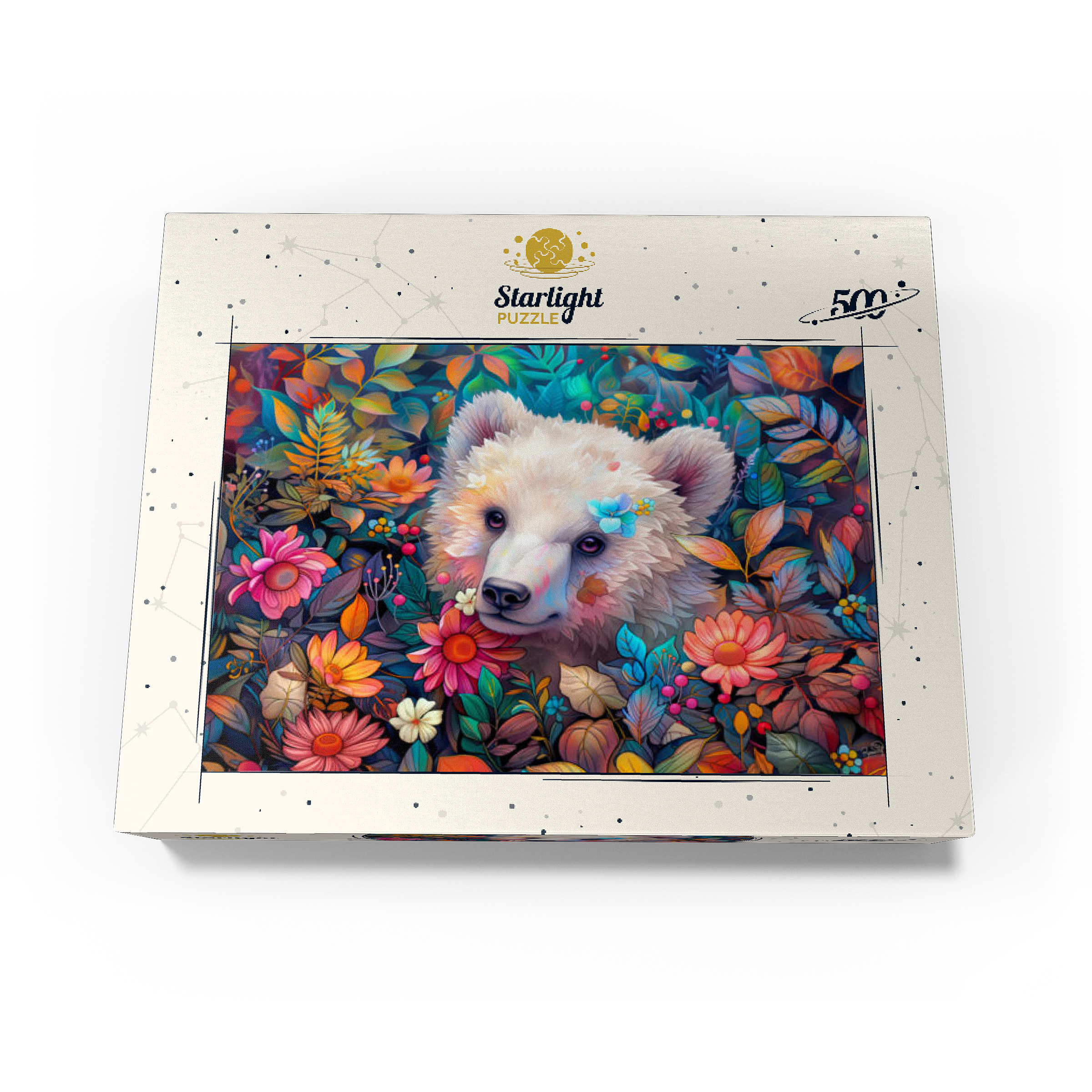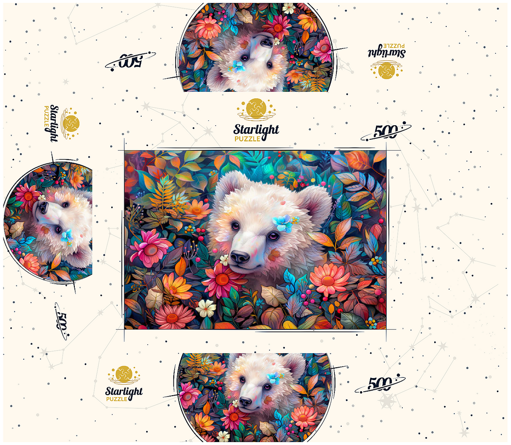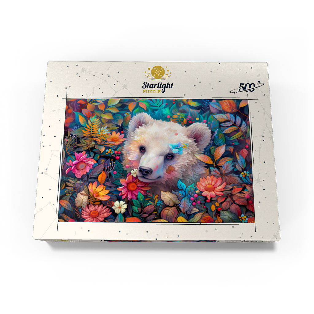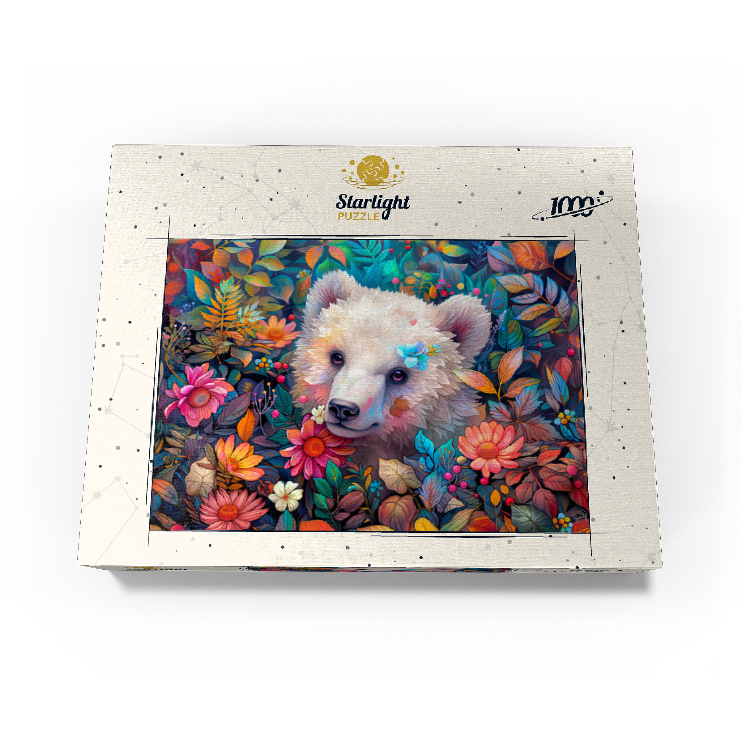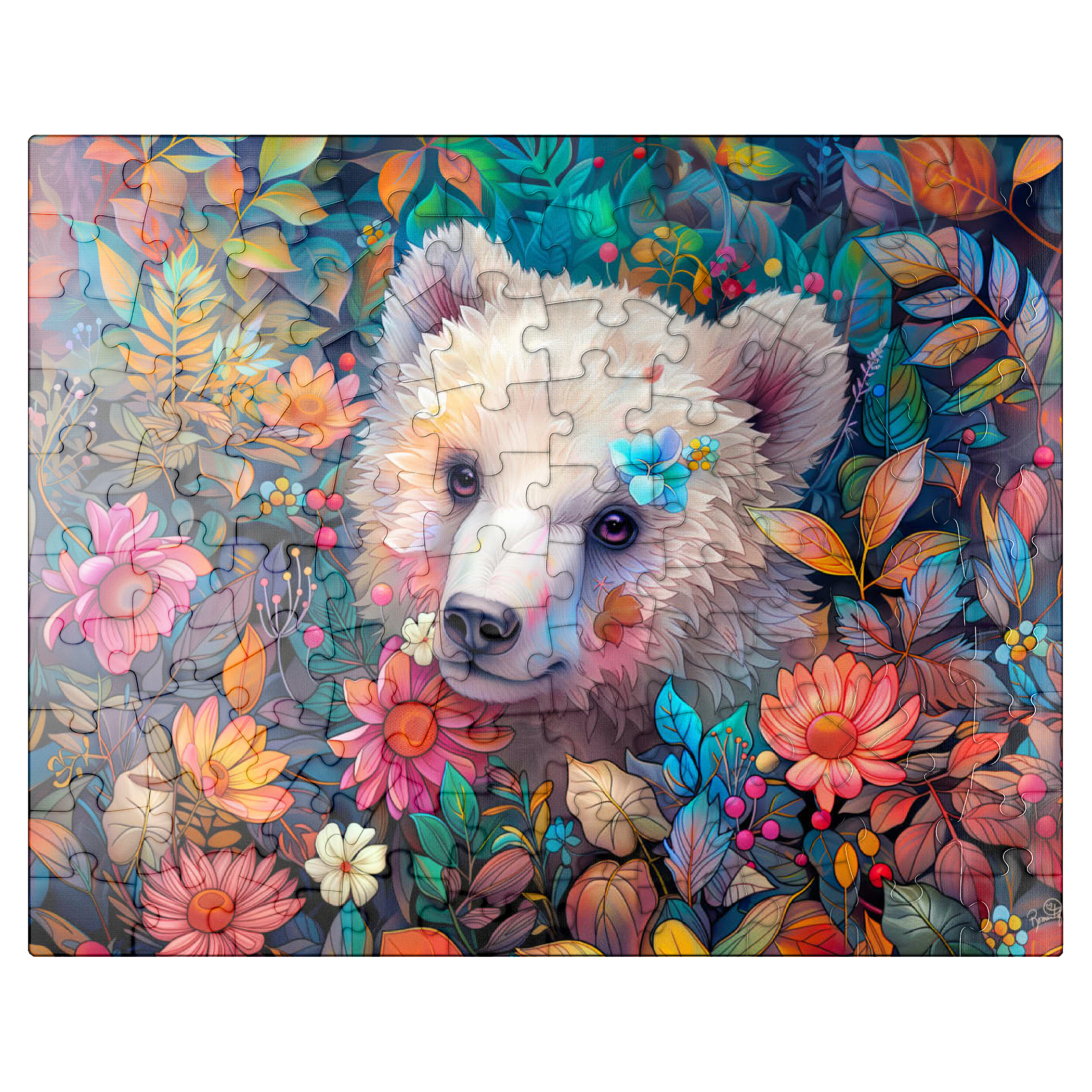 A charming digital artwork depicting an adorable white bear cub peeking through a lush floral landscape. the cub's gentle expression and soft fur are accentuated by colorful blossoms and foliage in shades of pink, orange, yellow, and blue. delicate flowers are tucked into its fur, adding a whimsical touch. the rich, vibrant background features detailed leaves, berries, and petals, creating a magical forest atmosphere. this enchanting piece is perfect for nature lovers, wildlife enthusiasts, and fans of imaginative animal portraits. ideal for wall art, nursery decor, or as a statement piece in any cozy space.
