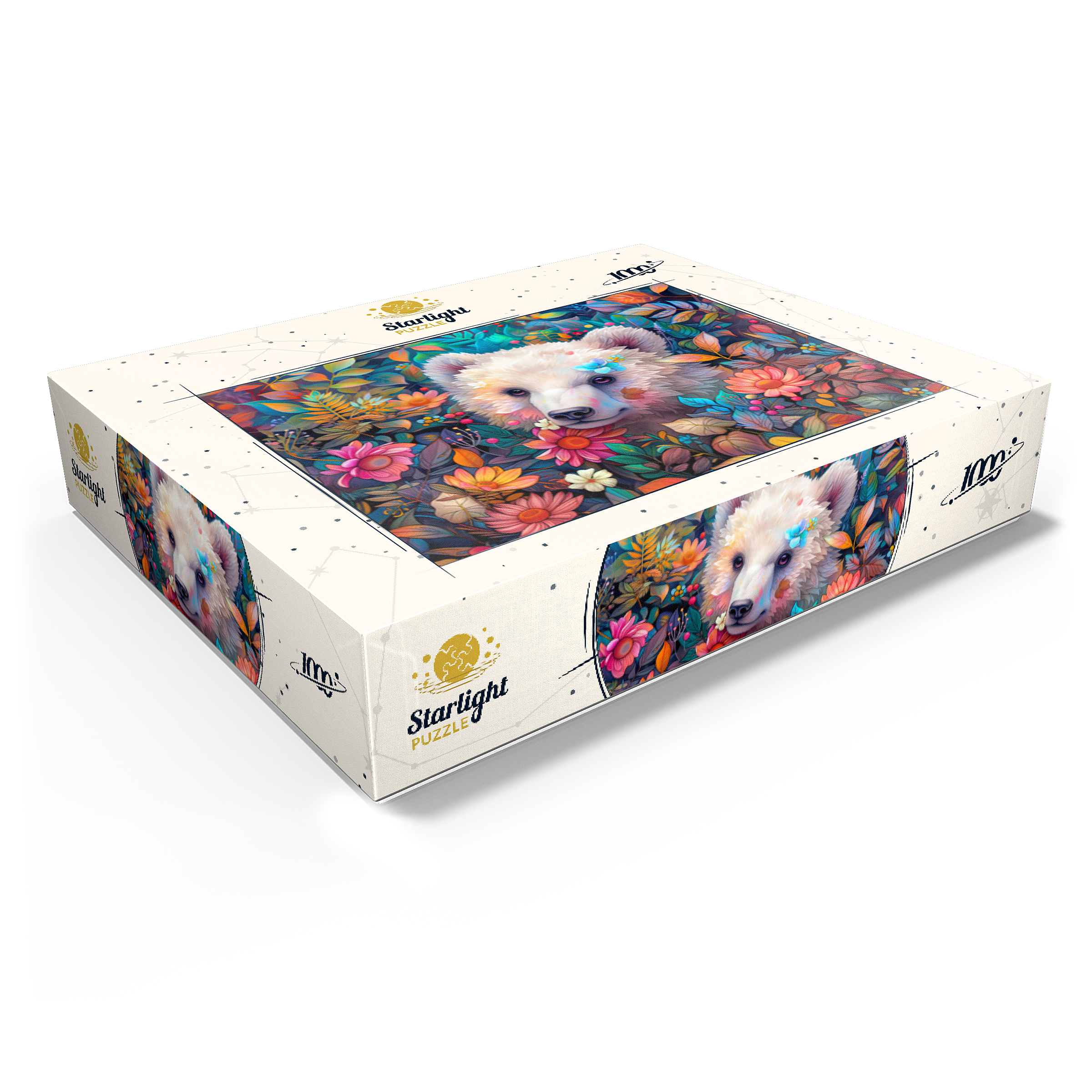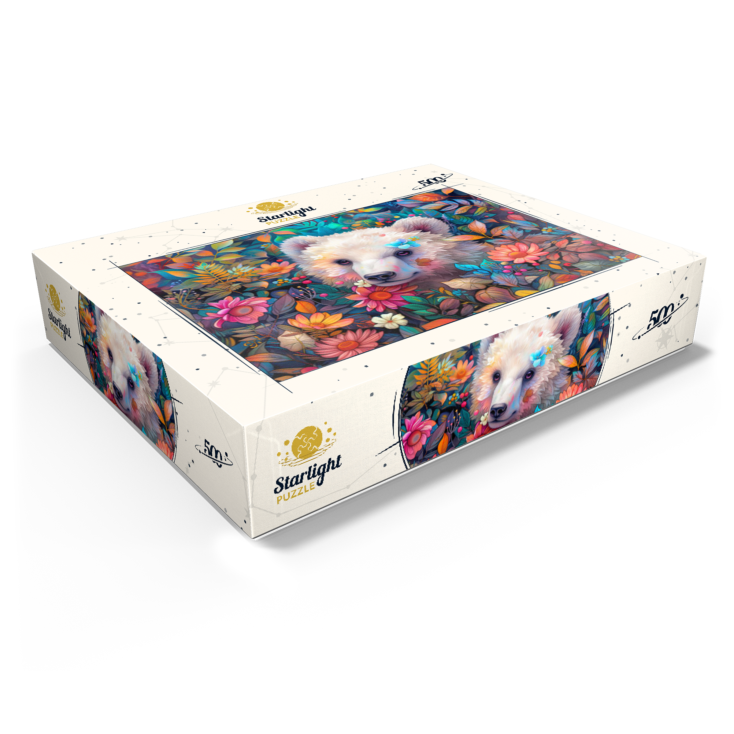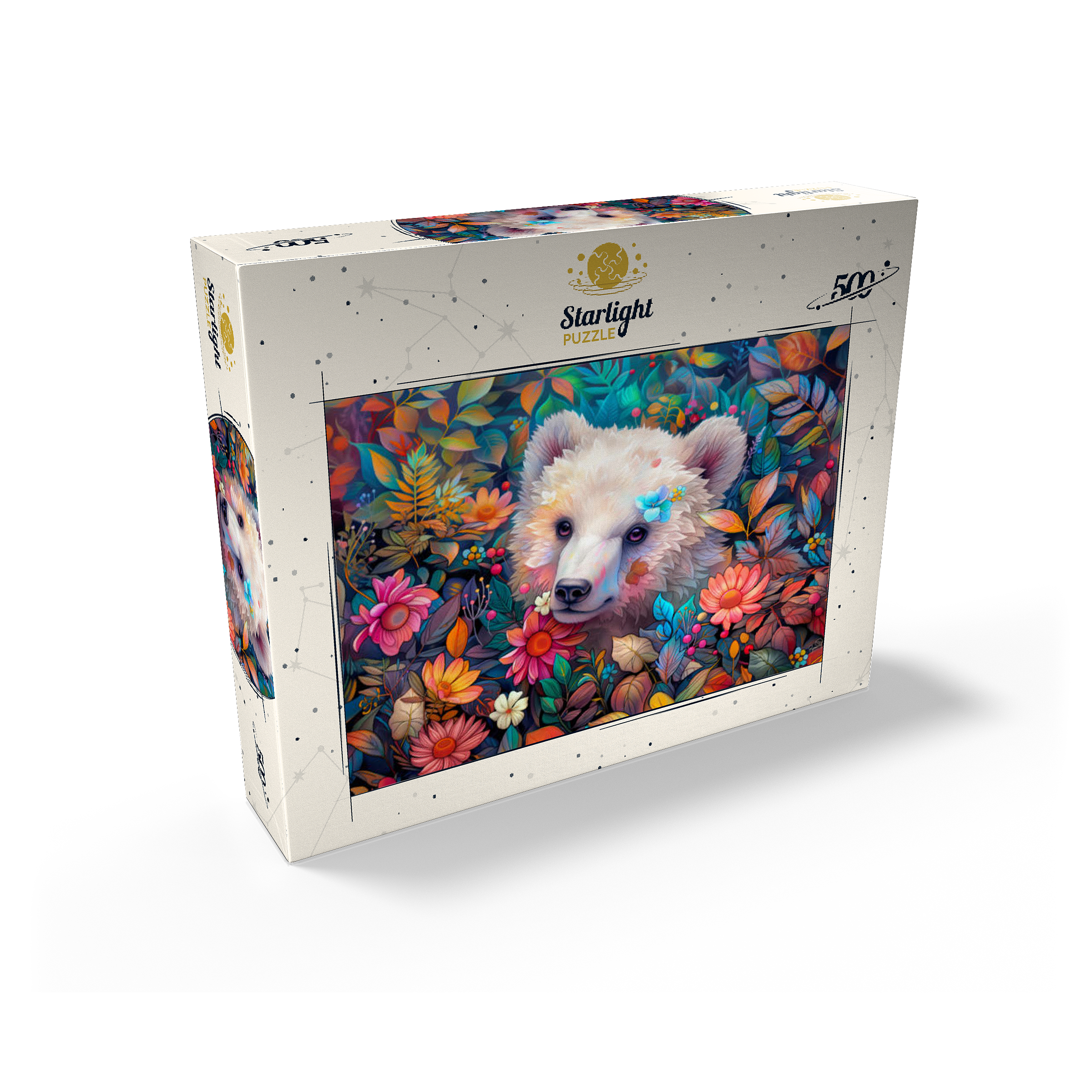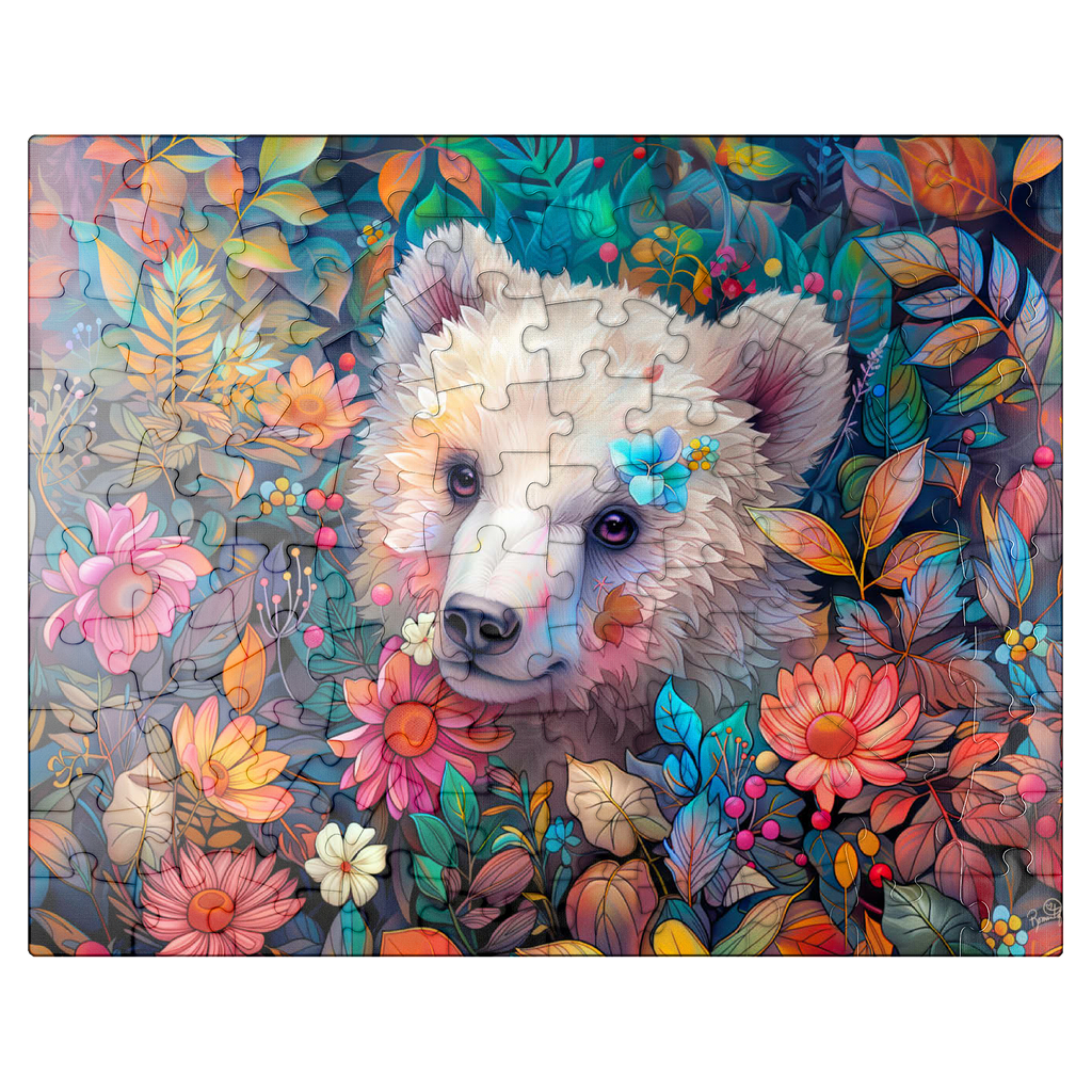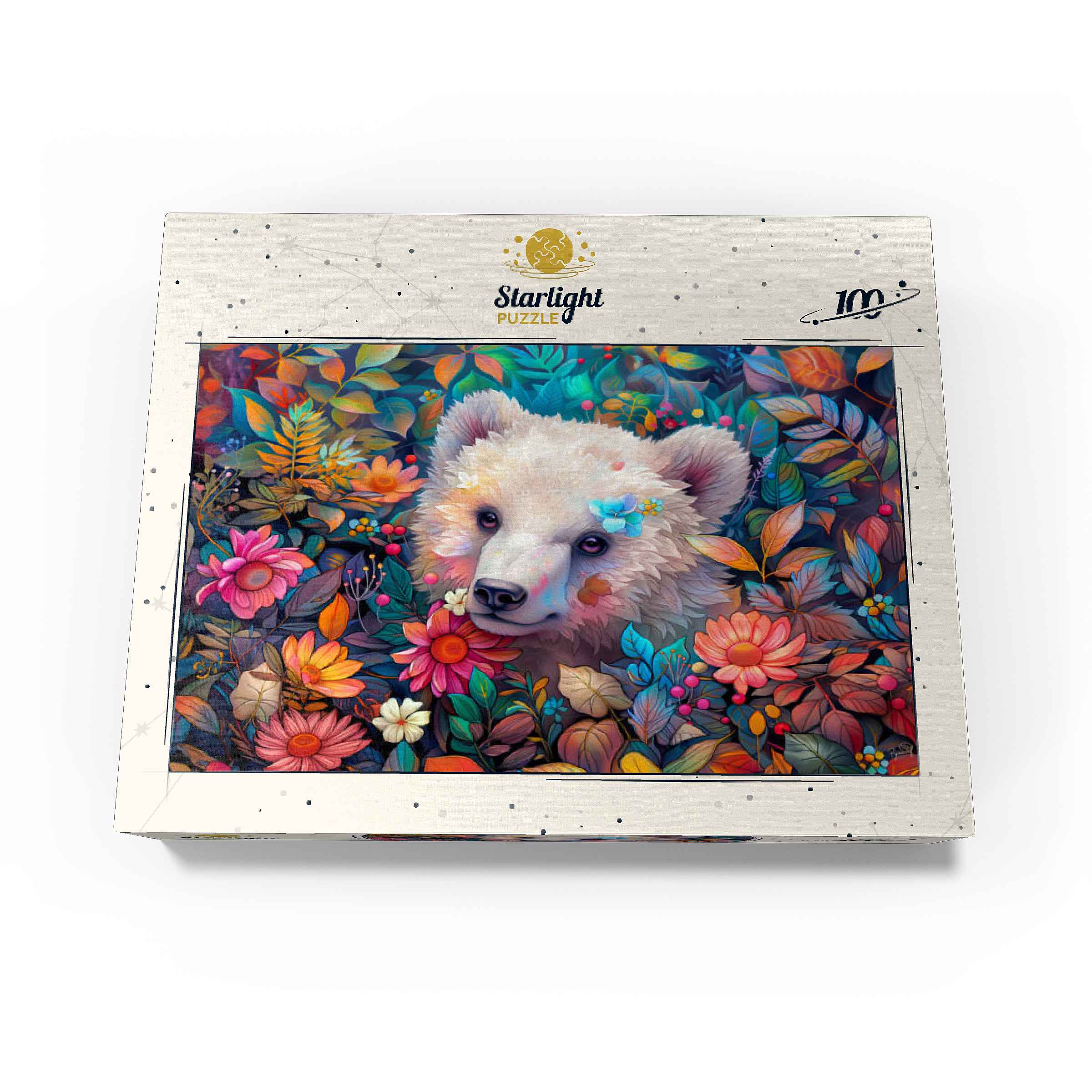 A charming digital artwork depicting an adorable white bear cub peeking through a lush floral landscape. the cub's gentle expression and soft fur are accentuated by colorful blossoms and foliage in shades of pink, orange, yellow, and blue. delicate flowers are tucked into its fur, adding a whimsical touch. the rich, vibrant background features detailed leaves, berries, and petals, creating a magical forest atmosphere. this enchanting piece is perfect for nature lovers, wildlife enthusiasts, and fans of imaginative animal portraits. ideal for wall art, nursery decor, or as a statement piece in any cozy space.