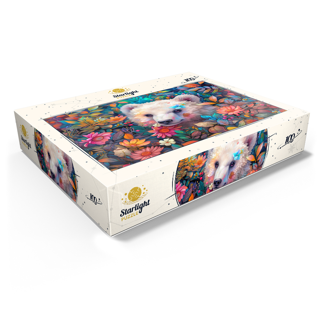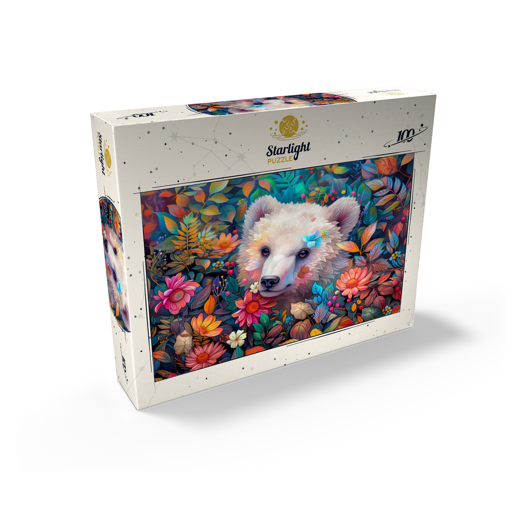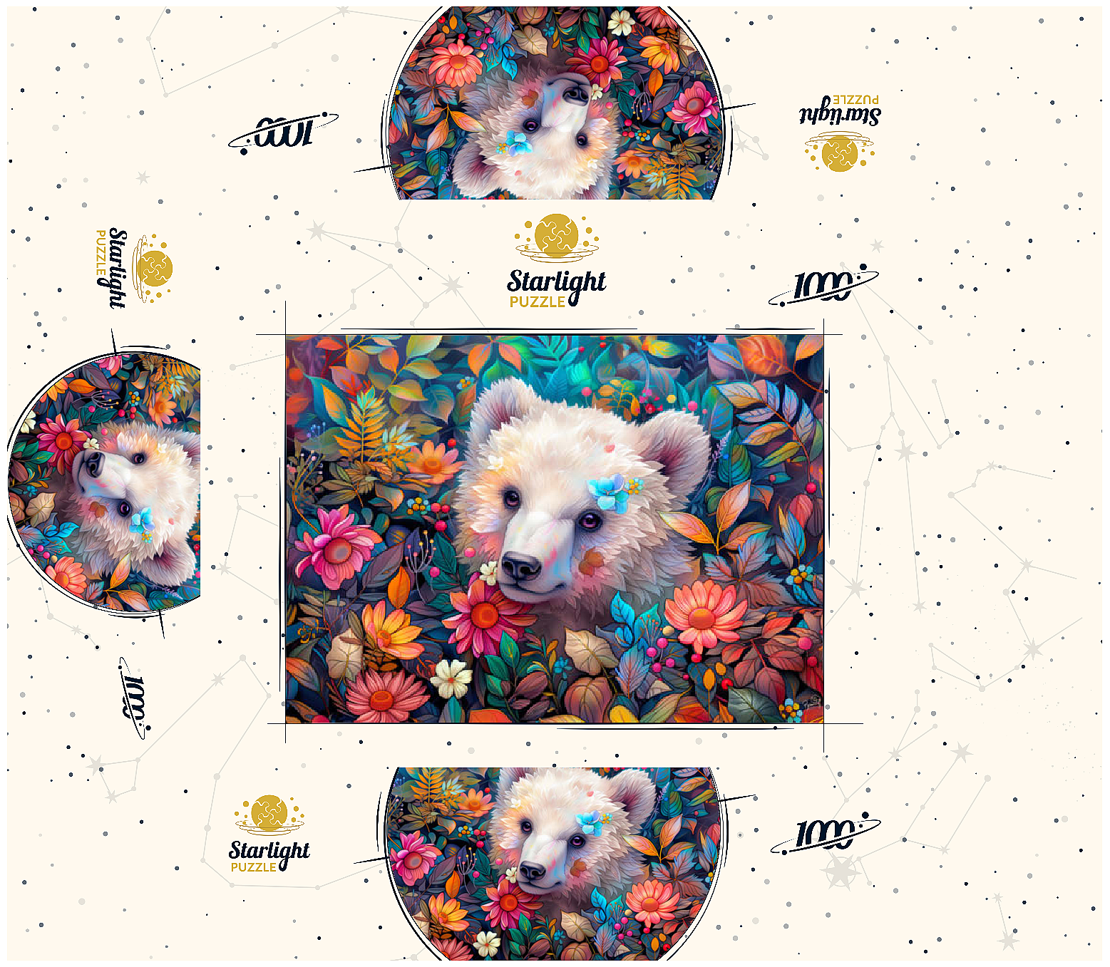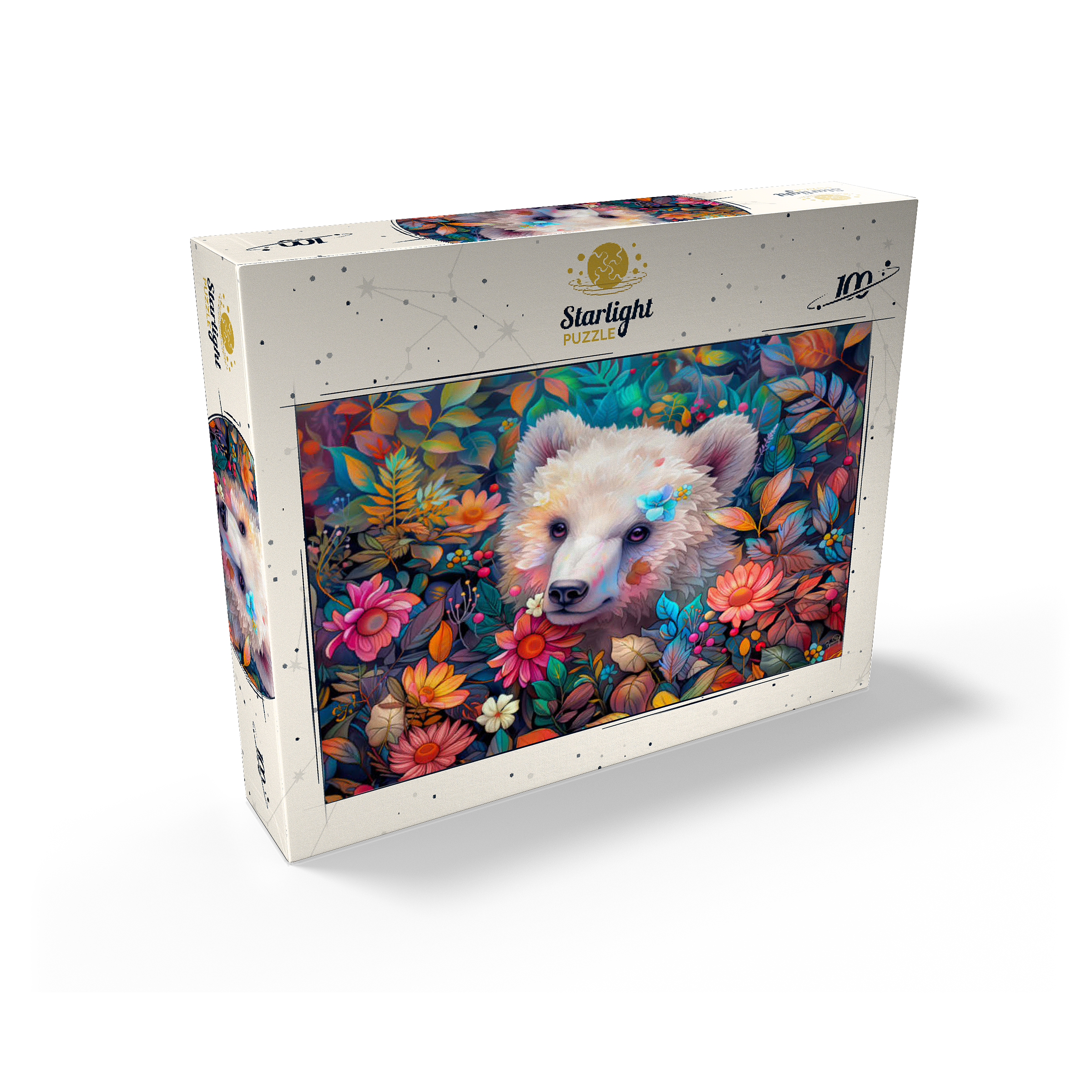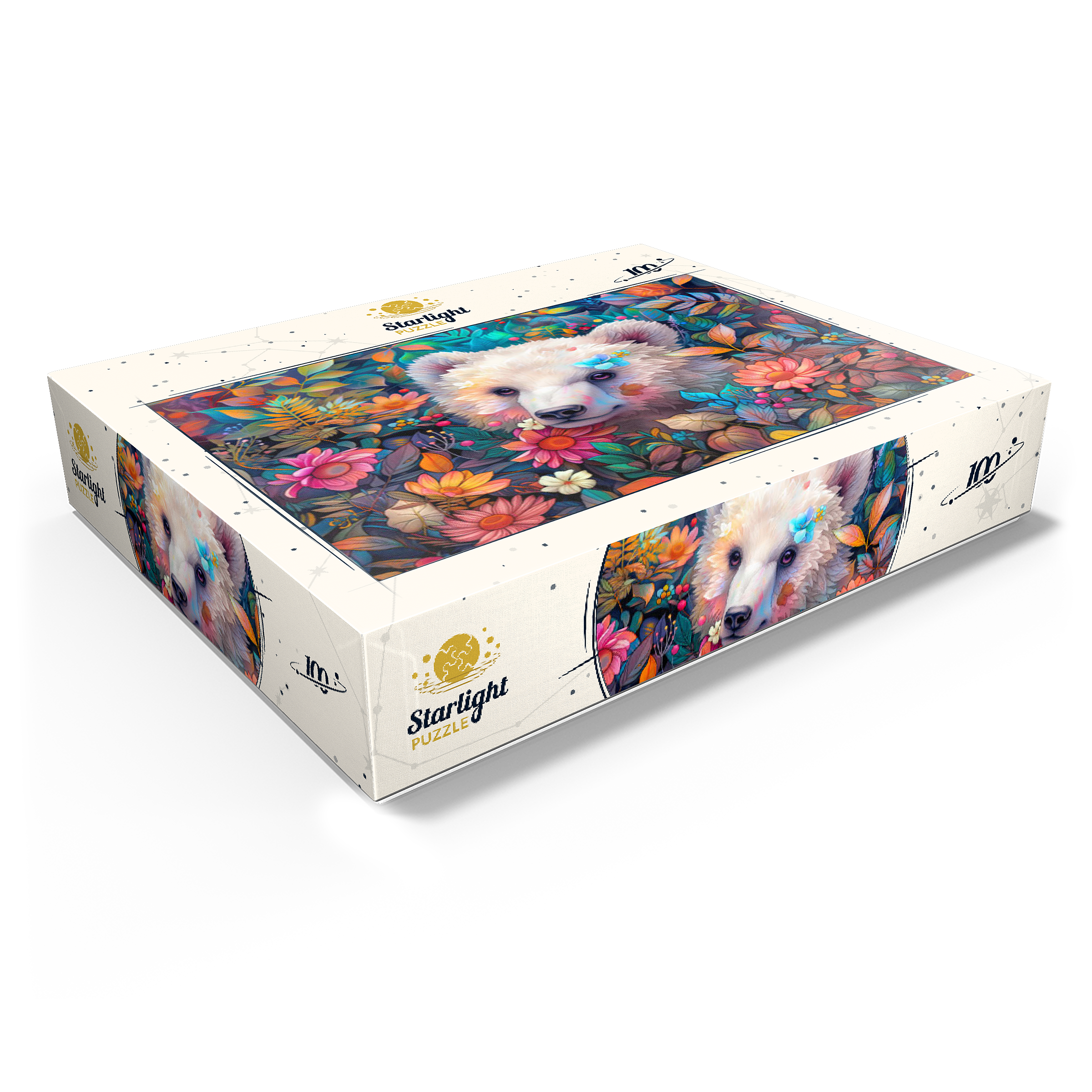 A charming digital artwork depicting an adorable white bear cub peeking through a lush floral landscape. the cub's gentle expression and soft fur are accentuated by colorful blossoms and foliage in shades of pink, orange, yellow, and blue. delicate flowers are tucked into its fur, adding a whimsical touch. the rich, vibrant background features detailed leaves, berries, and petals, creating a magical forest atmosphere. this enchanting piece is perfect for nature lovers, wildlife enthusiasts, and fans of imaginative animal portraits. ideal for wall art, nursery decor, or as a statement piece in any cozy space.