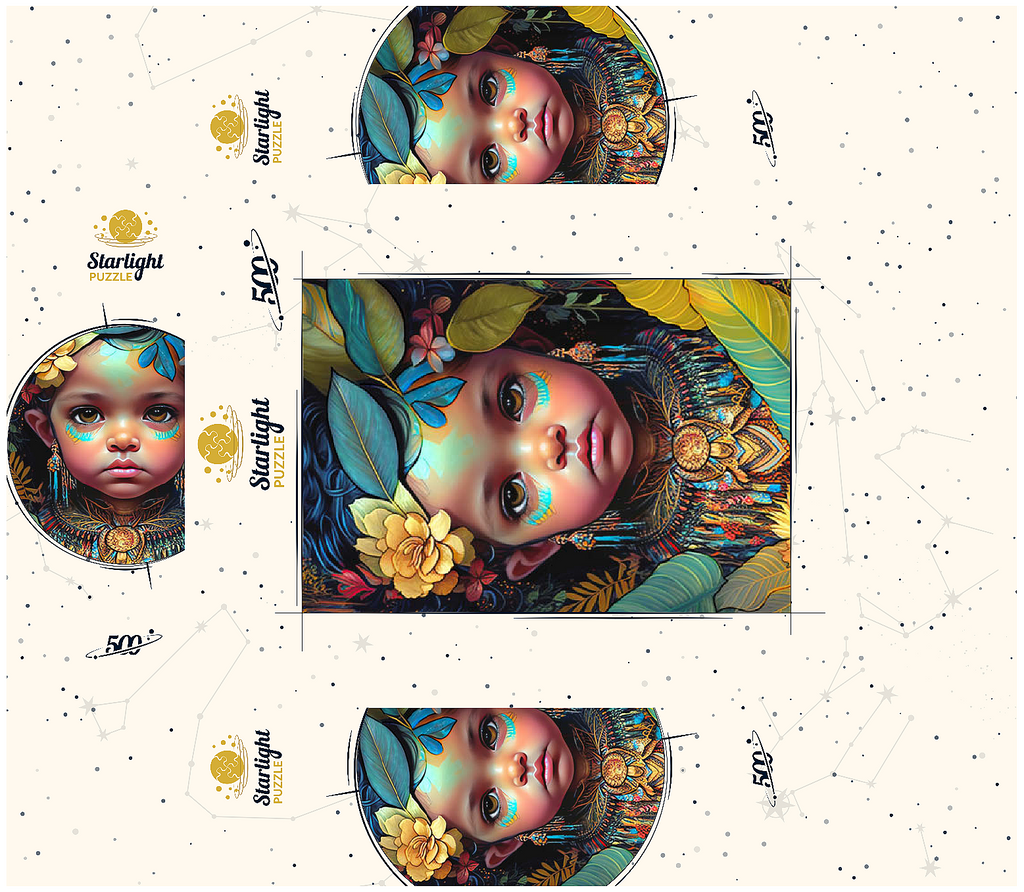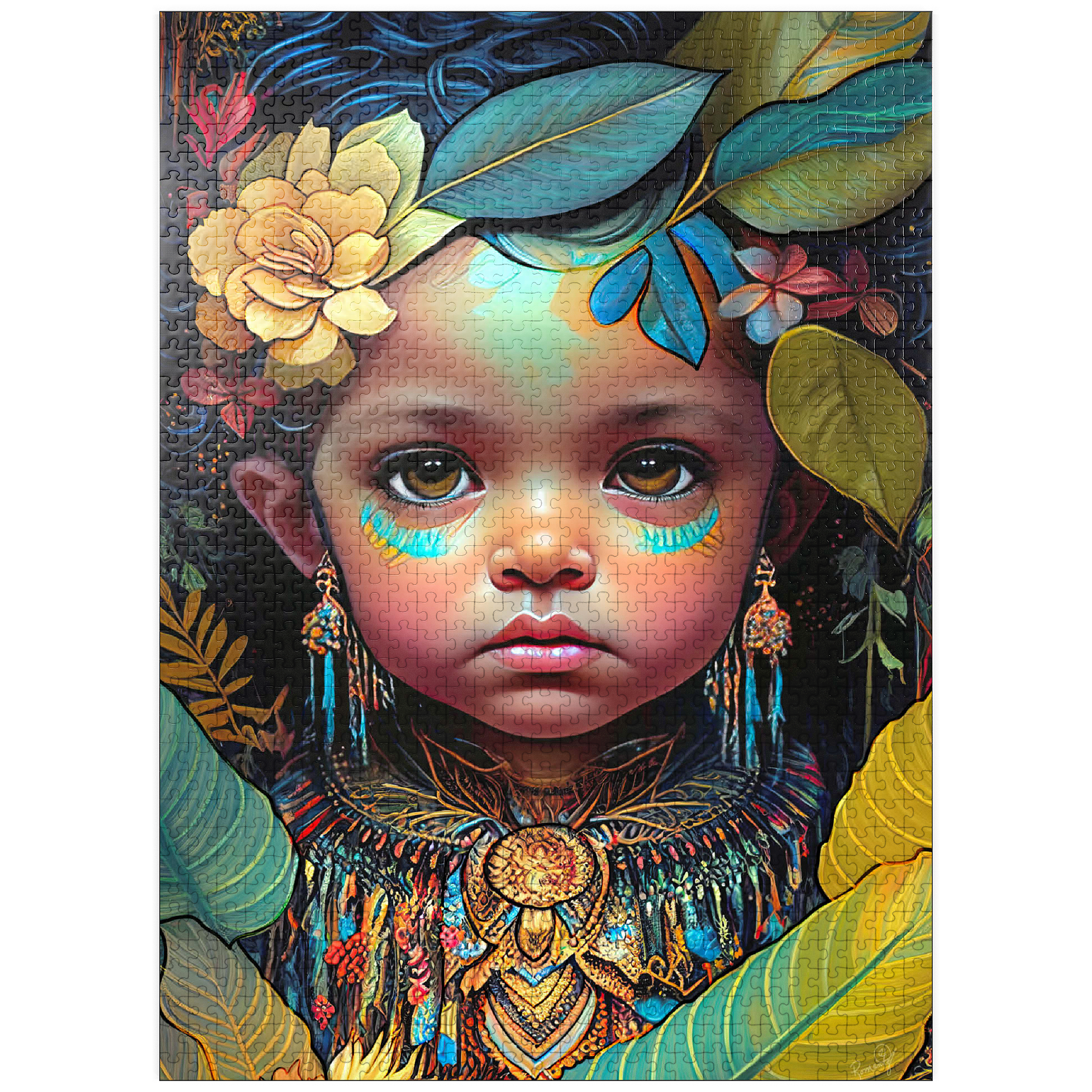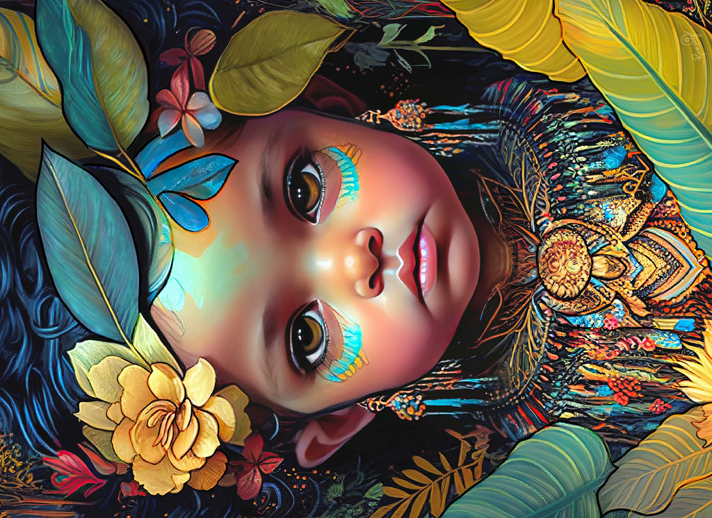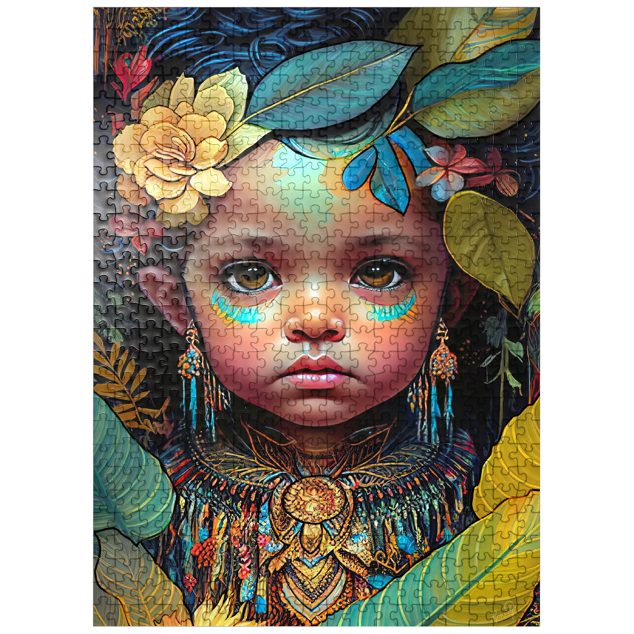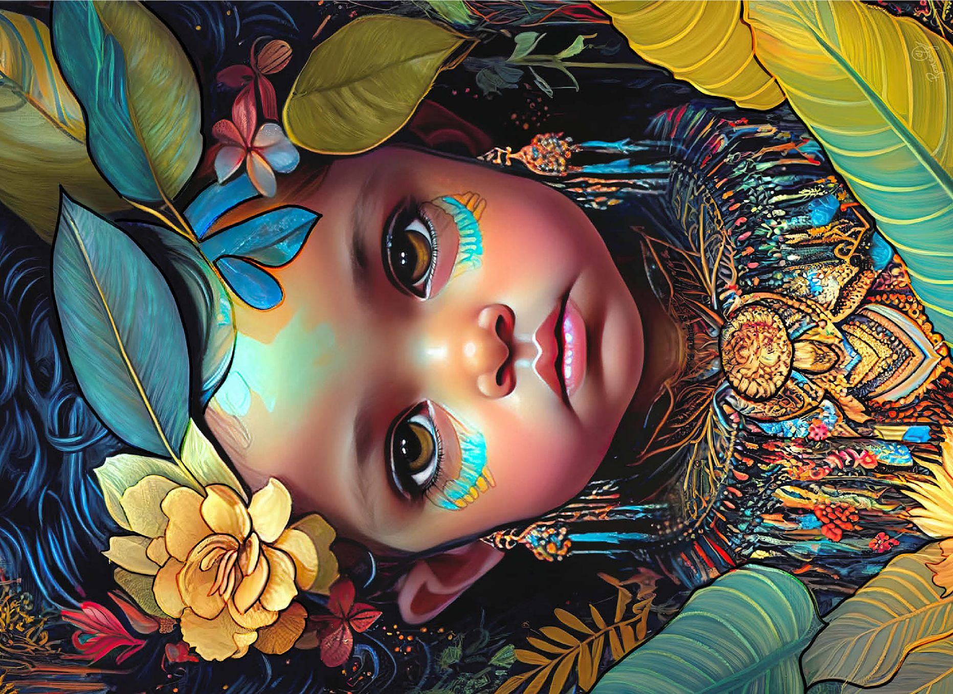 A captivating digital artwork portraying an ethereal child with deep, expressive eyes and delicate features. her face is adorned with intricate tribal-inspired turquoise and gold markings, complementing her vibrant floral headdress of golden blooms and lush green leaves. the detailed jewelry and ornate beaded attire feature rich patterns in shades of gold, blue, and red, evoking a sense of cultural elegance. the dark, textured background accentuates the luminous quality of the child's skin and the vibrant colors of her adornments. perfect for admirers of fantasy portraits, cultural art, and symbolic visual storytelling, this piece adds a powerful and graceful presence to any space.
