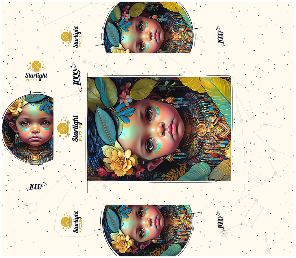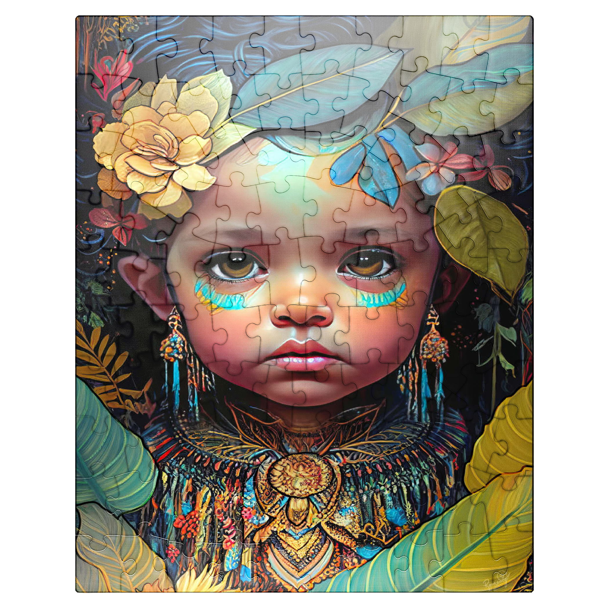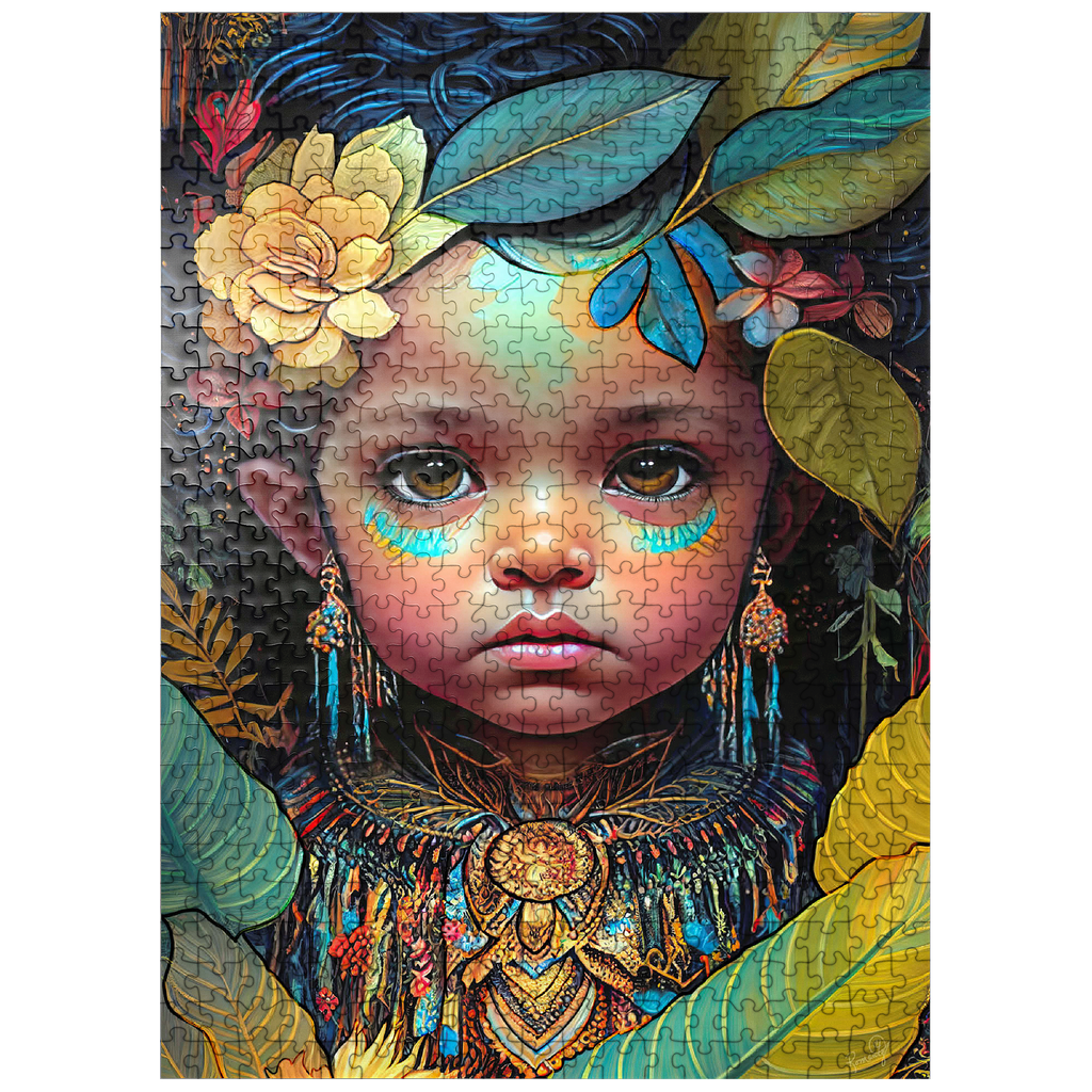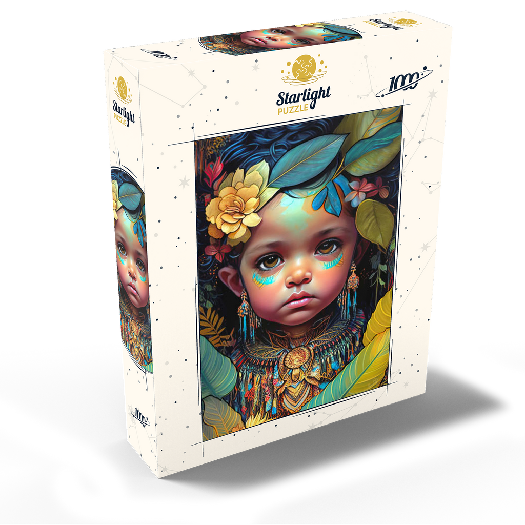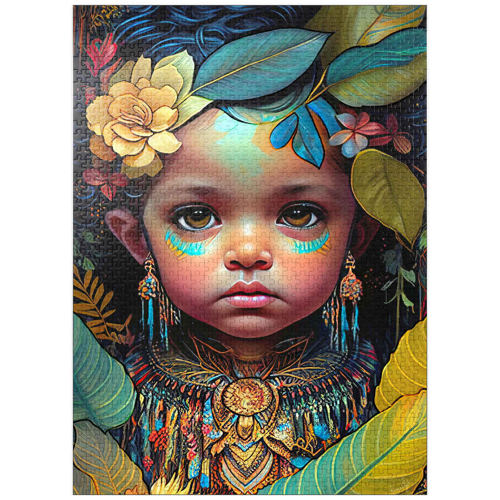 A captivating digital artwork portraying an ethereal child with deep, expressive eyes and delicate features. her face is adorned with intricate tribal-inspired turquoise and gold markings, complementing her vibrant floral headdress of golden blooms and lush green leaves. the detailed jewelry and ornate beaded attire feature rich patterns in shades of gold, blue, and red, evoking a sense of cultural elegance. the dark, textured background accentuates the luminous quality of the child's skin and the vibrant colors of her adornments. perfect for admirers of fantasy portraits, cultural art, and symbolic visual storytelling, this piece adds a powerful and graceful presence to any space.