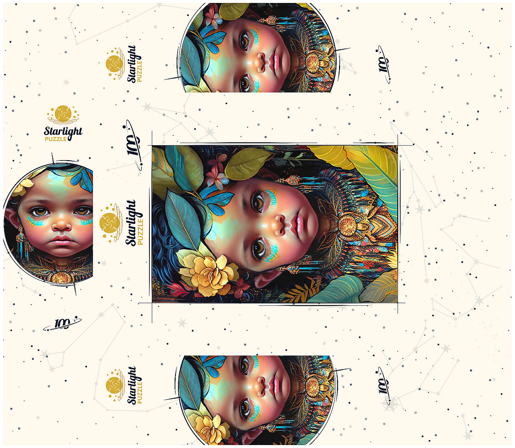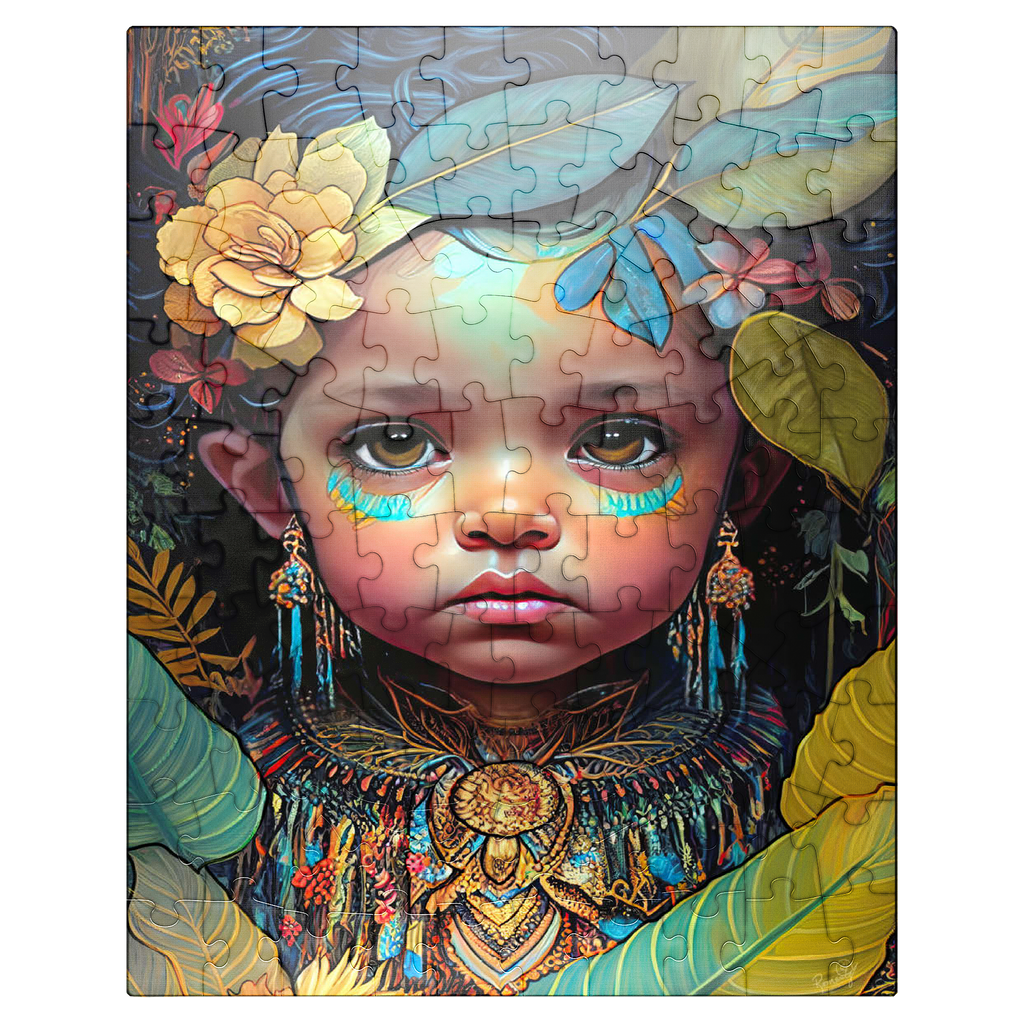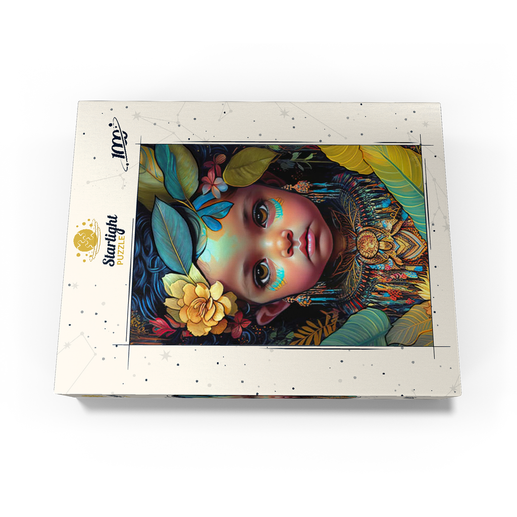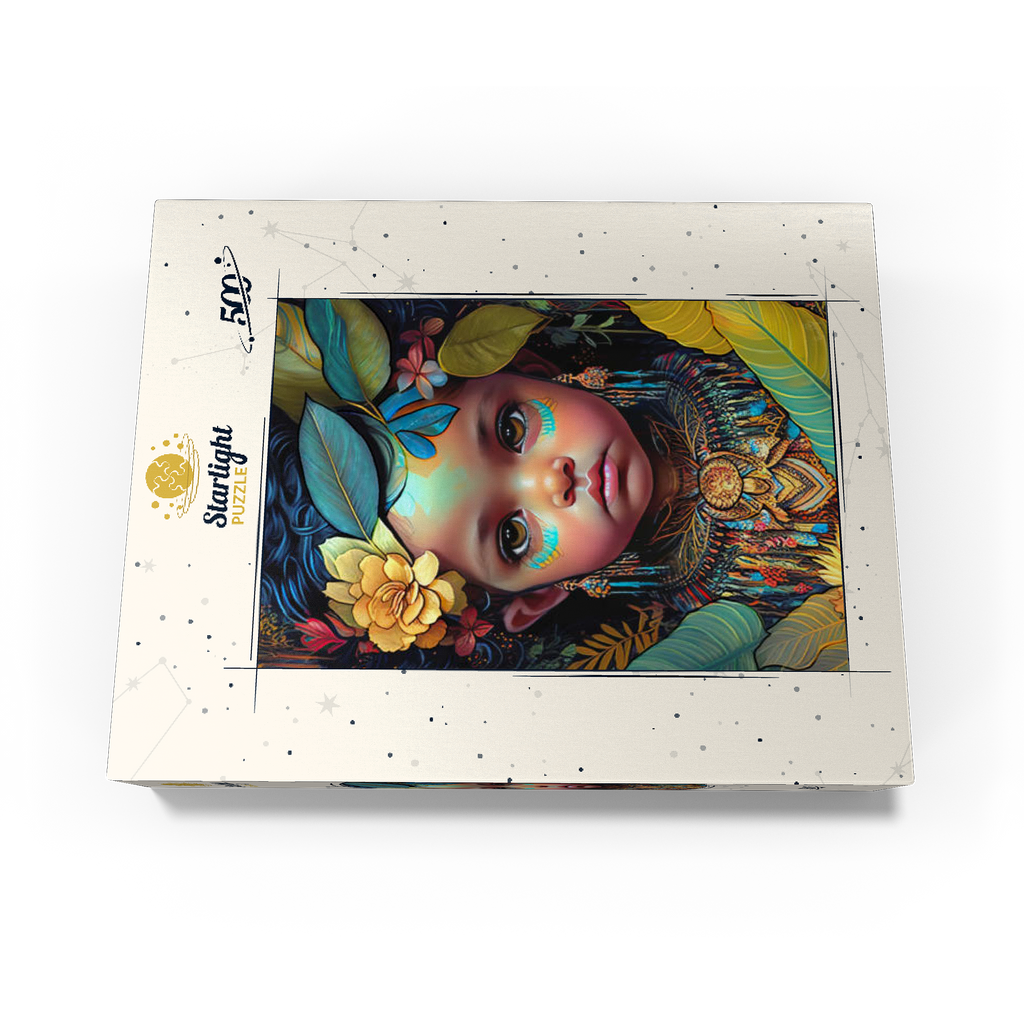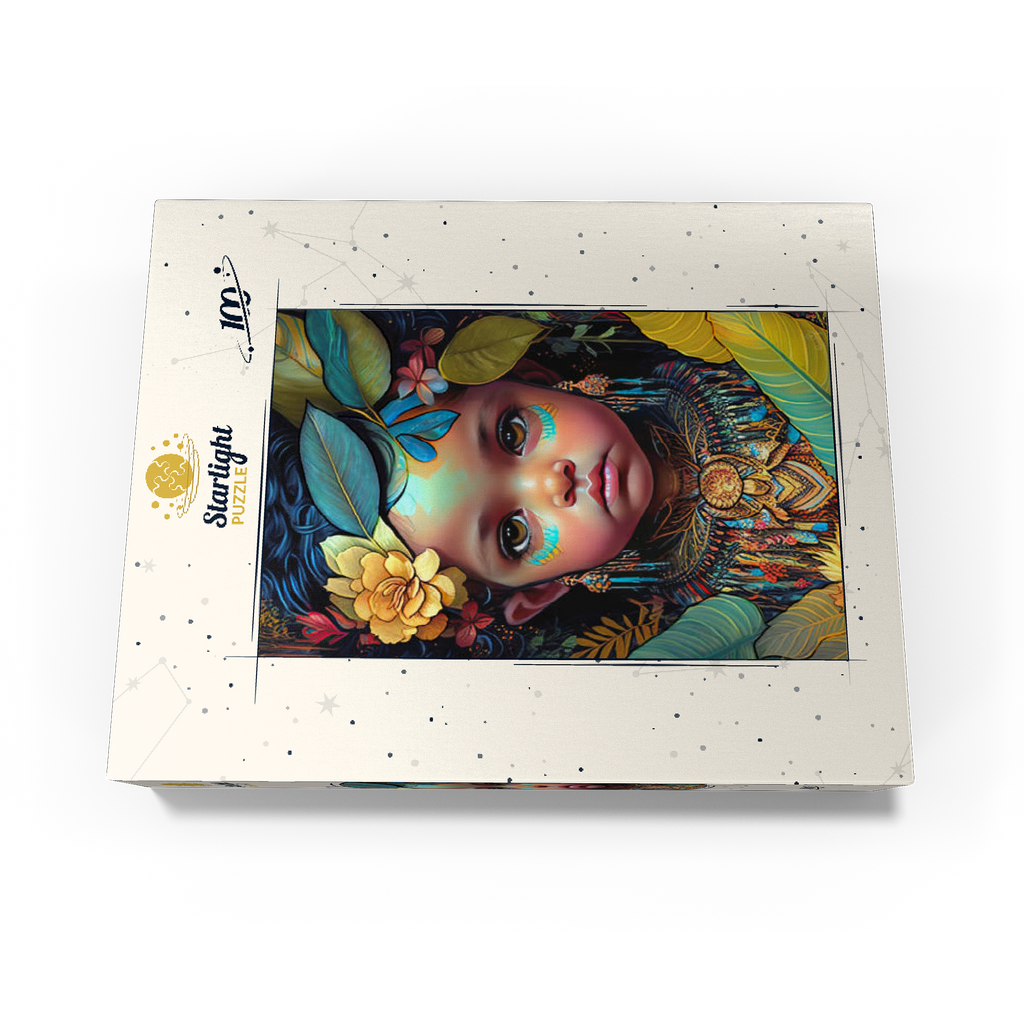 A captivating digital artwork portraying an ethereal child with deep, expressive eyes and delicate features. her face is adorned with intricate tribal-inspired turquoise and gold markings, complementing her vibrant floral headdress of golden blooms and lush green leaves. the detailed jewelry and ornate beaded attire feature rich patterns in shades of gold, blue, and red, evoking a sense of cultural elegance. the dark, textured background accentuates the luminous quality of the child's skin and the vibrant colors of her adornments. perfect for admirers of fantasy portraits, cultural art, and symbolic visual storytelling, this piece adds a powerful and graceful presence to any space.