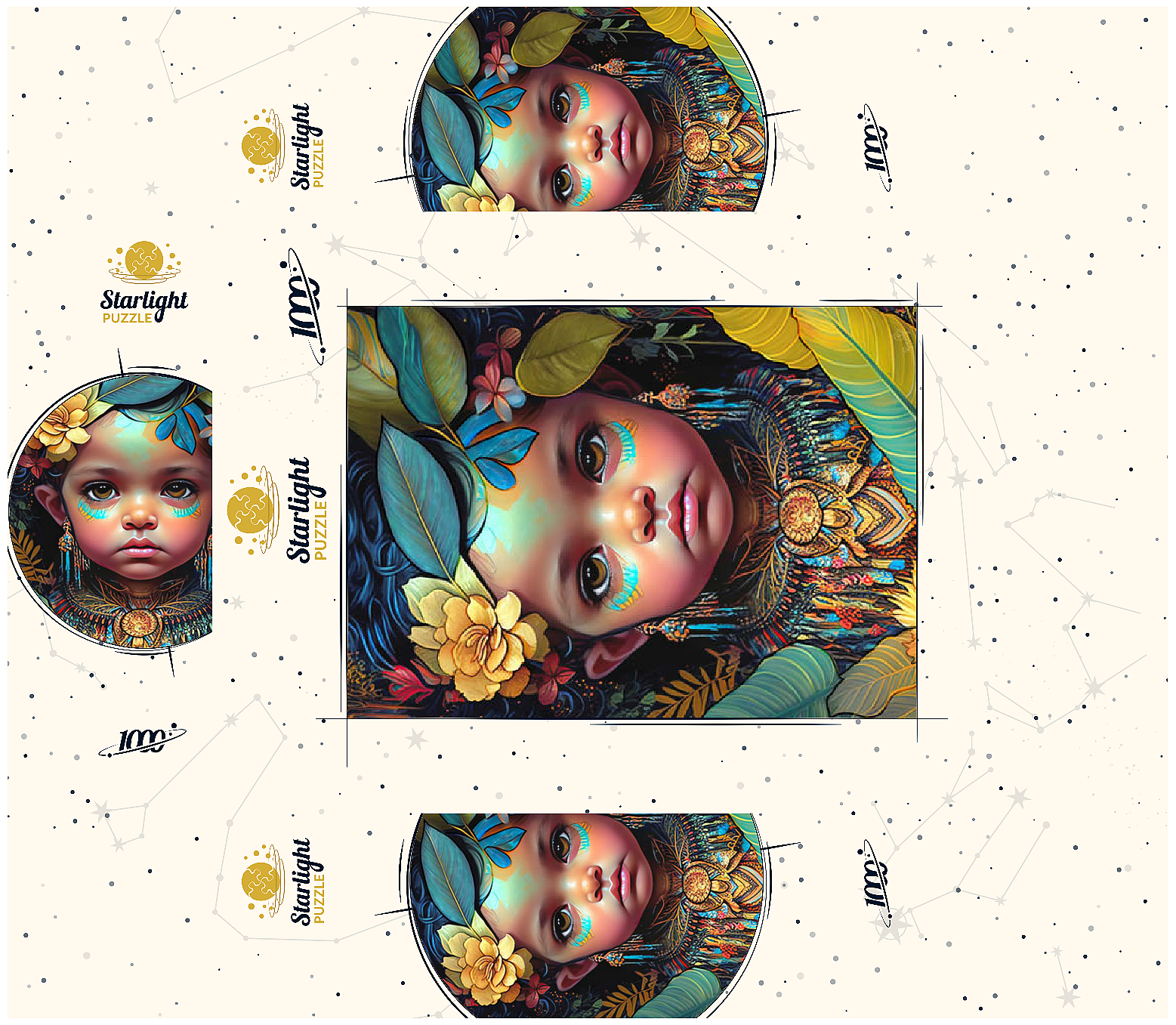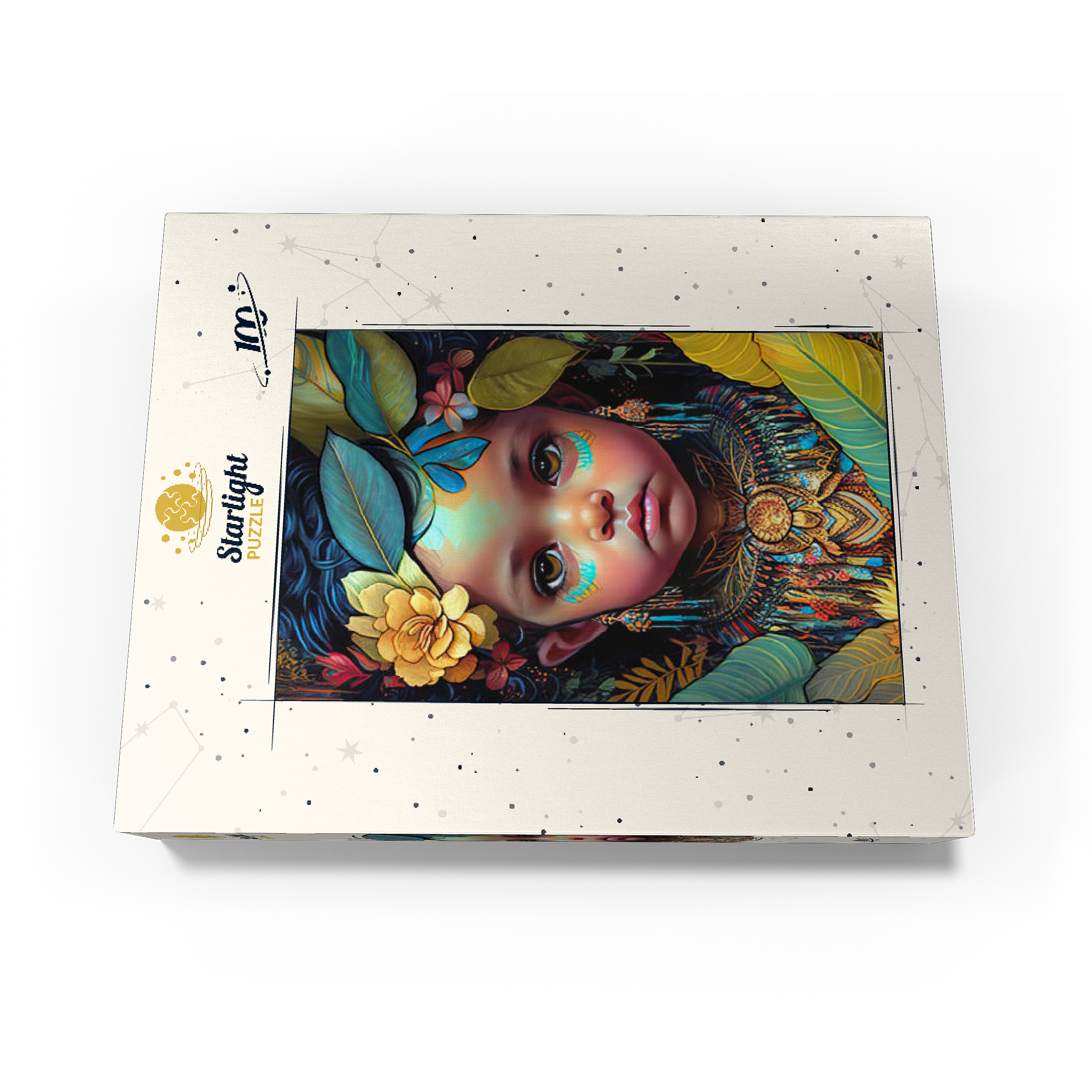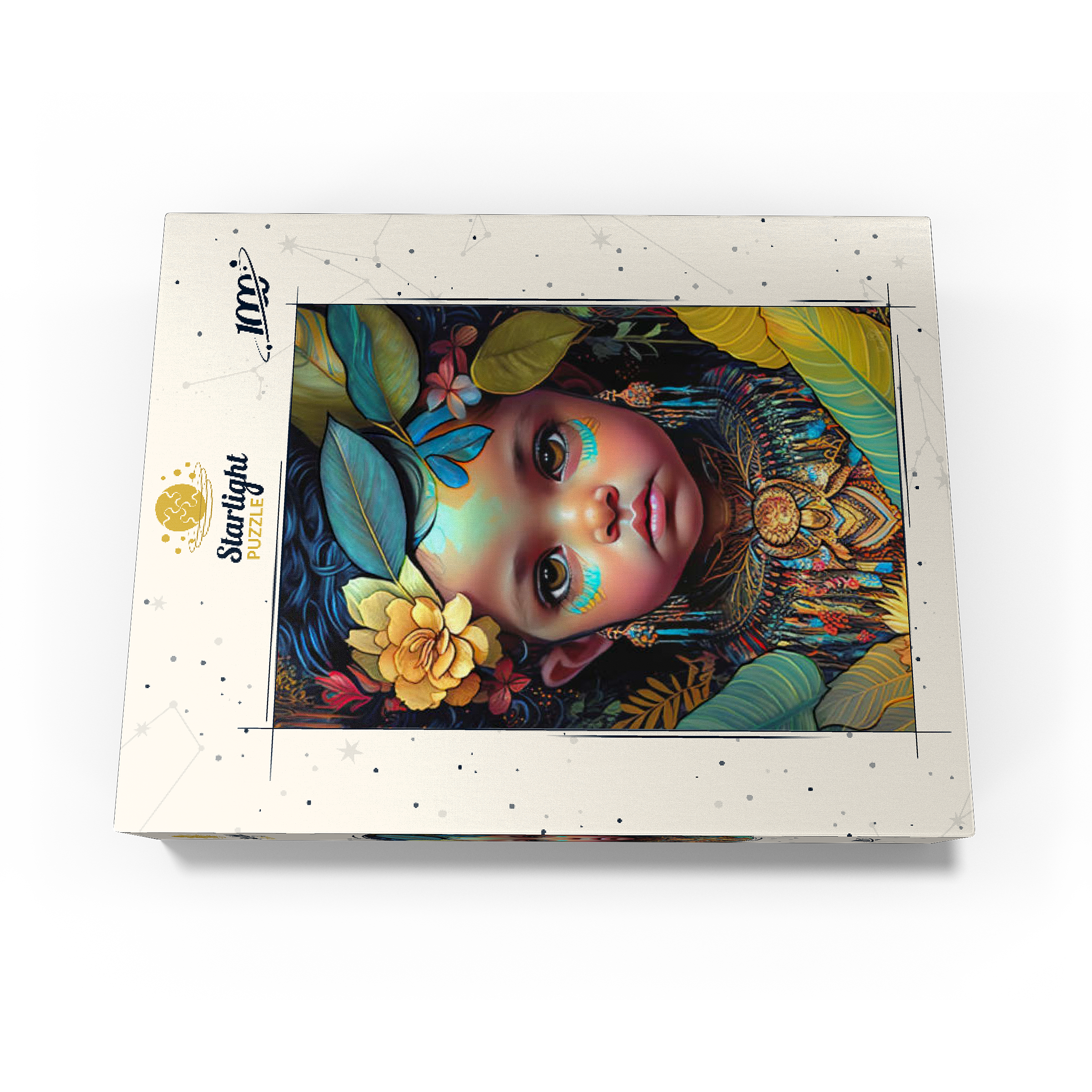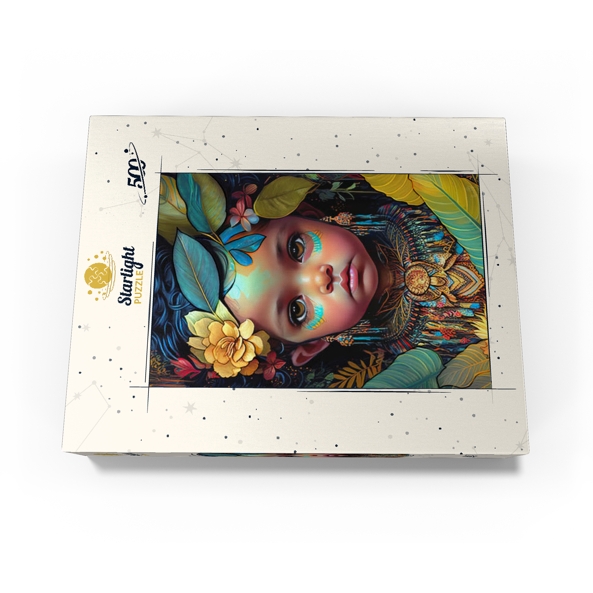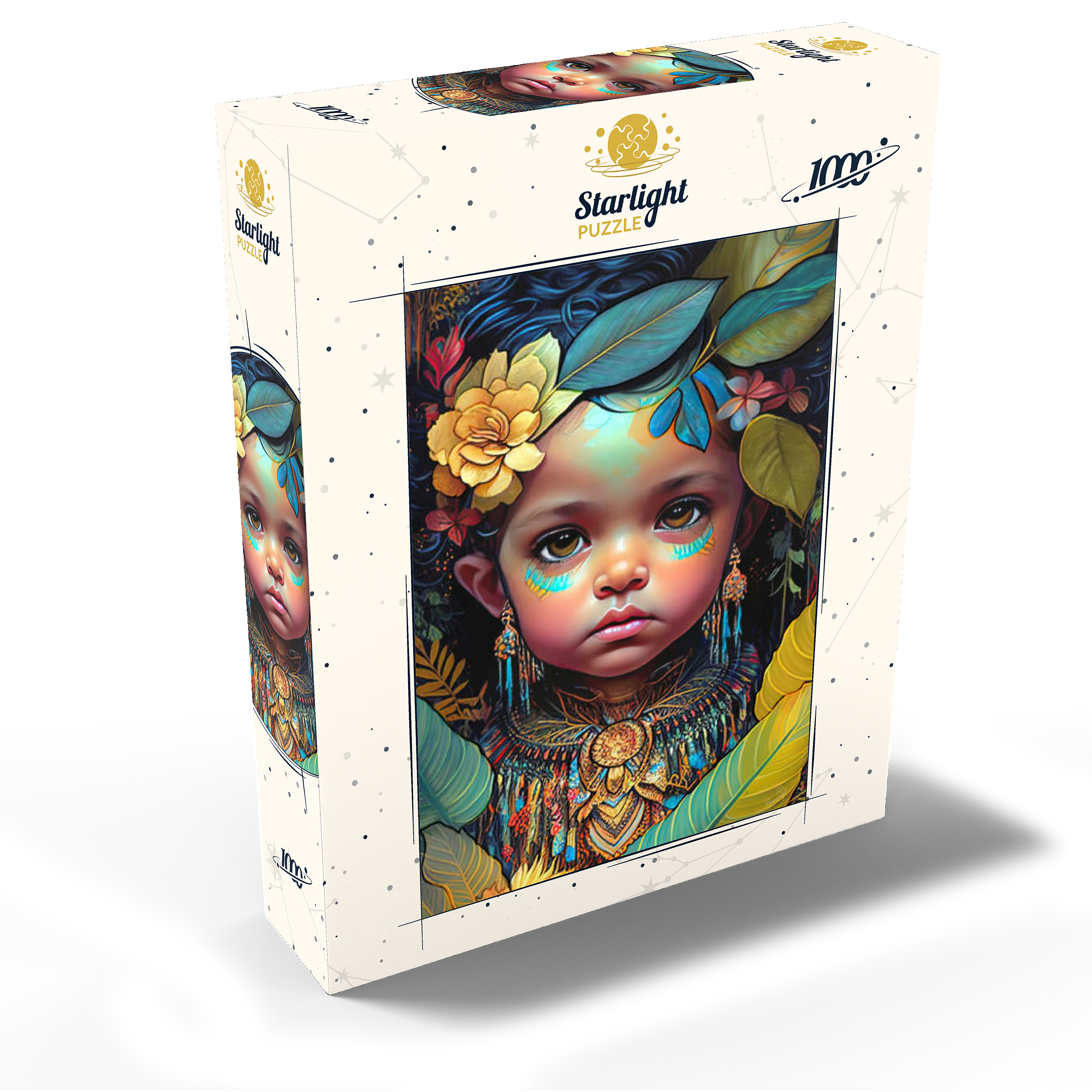 A captivating digital artwork portraying an ethereal child with deep, expressive eyes and delicate features. her face is adorned with intricate tribal-inspired turquoise and gold markings, complementing her vibrant floral headdress of golden blooms and lush green leaves. the detailed jewelry and ornate beaded attire feature rich patterns in shades of gold, blue, and red, evoking a sense of cultural elegance. the dark, textured background accentuates the luminous quality of the child's skin and the vibrant colors of her adornments. perfect for admirers of fantasy portraits, cultural art, and symbolic visual storytelling, this piece adds a powerful and graceful presence to any space.