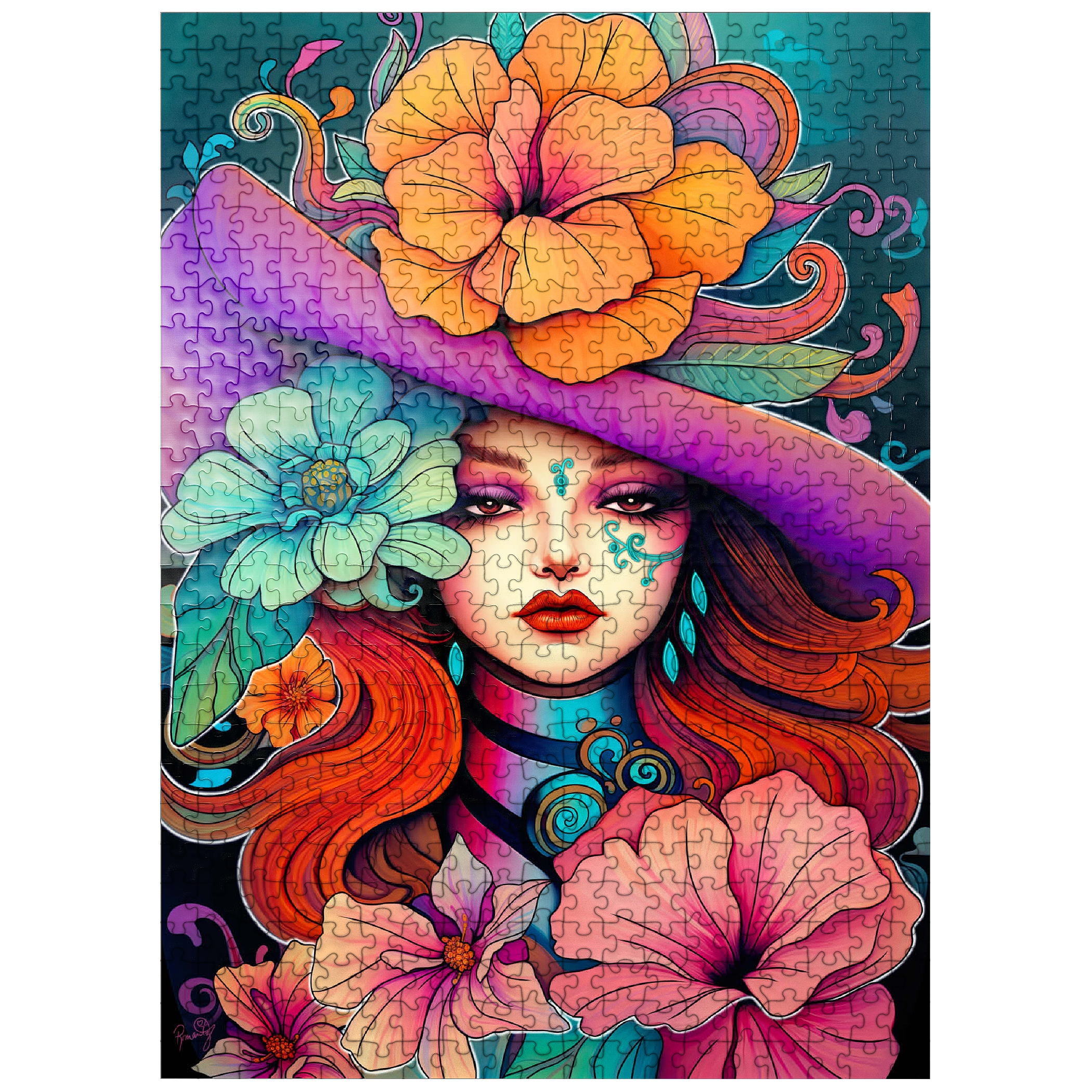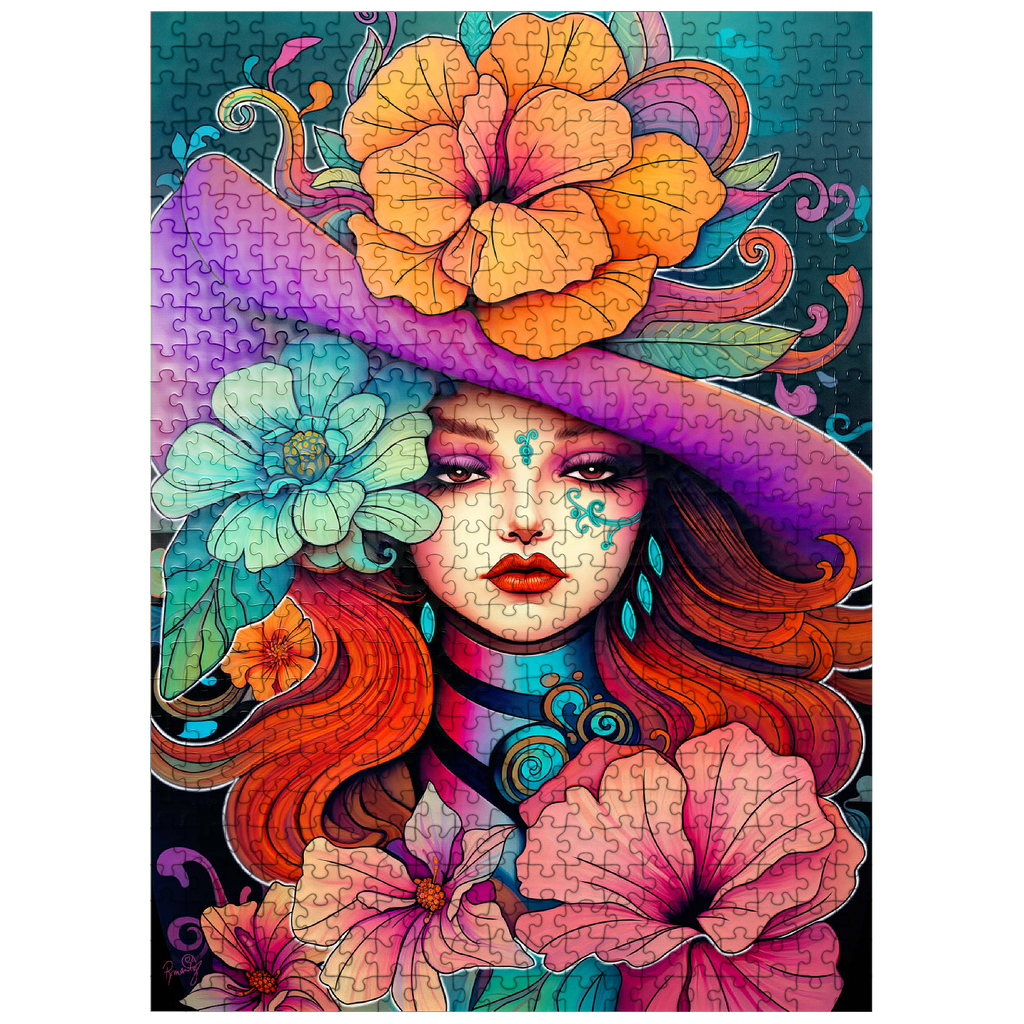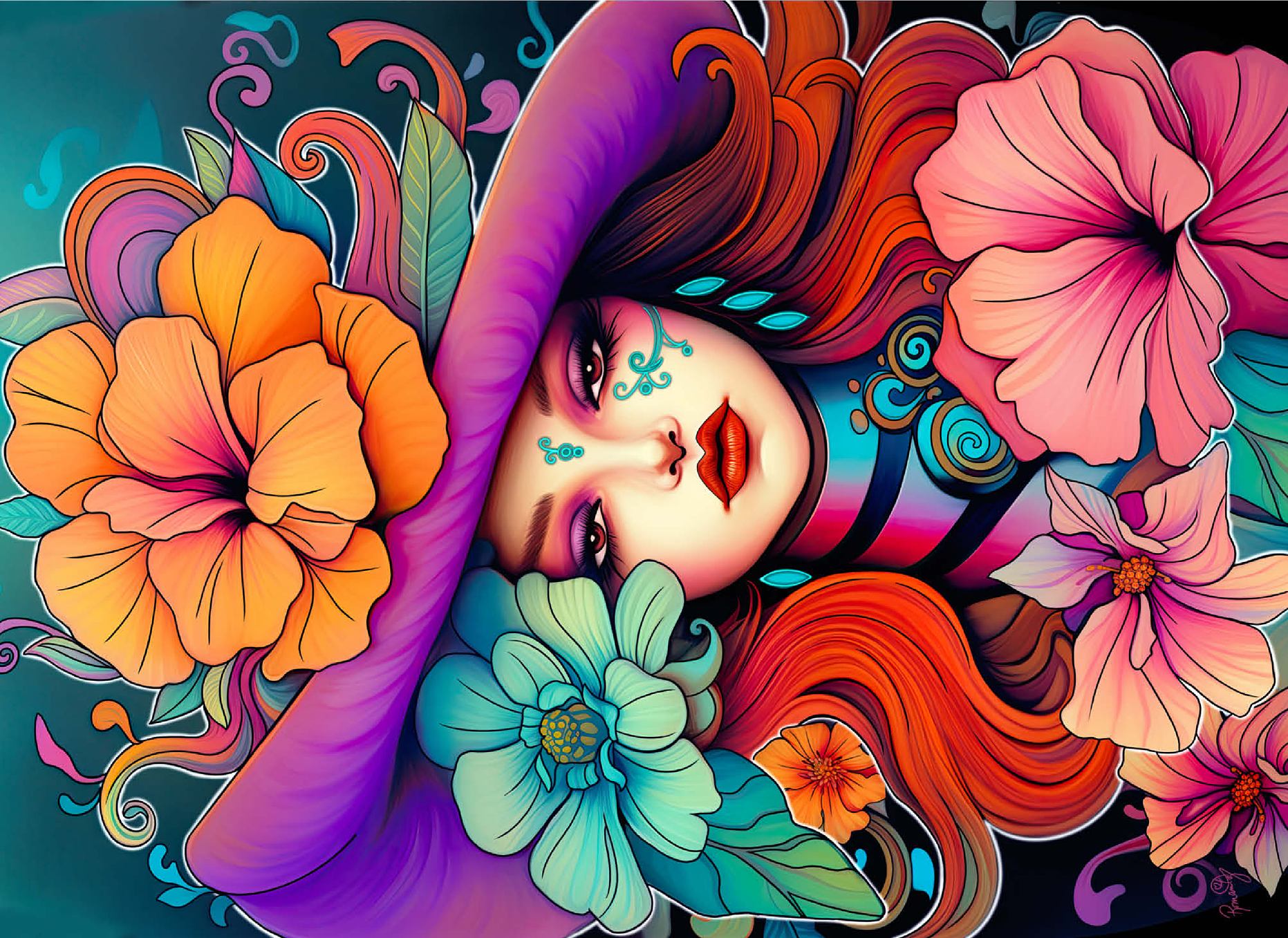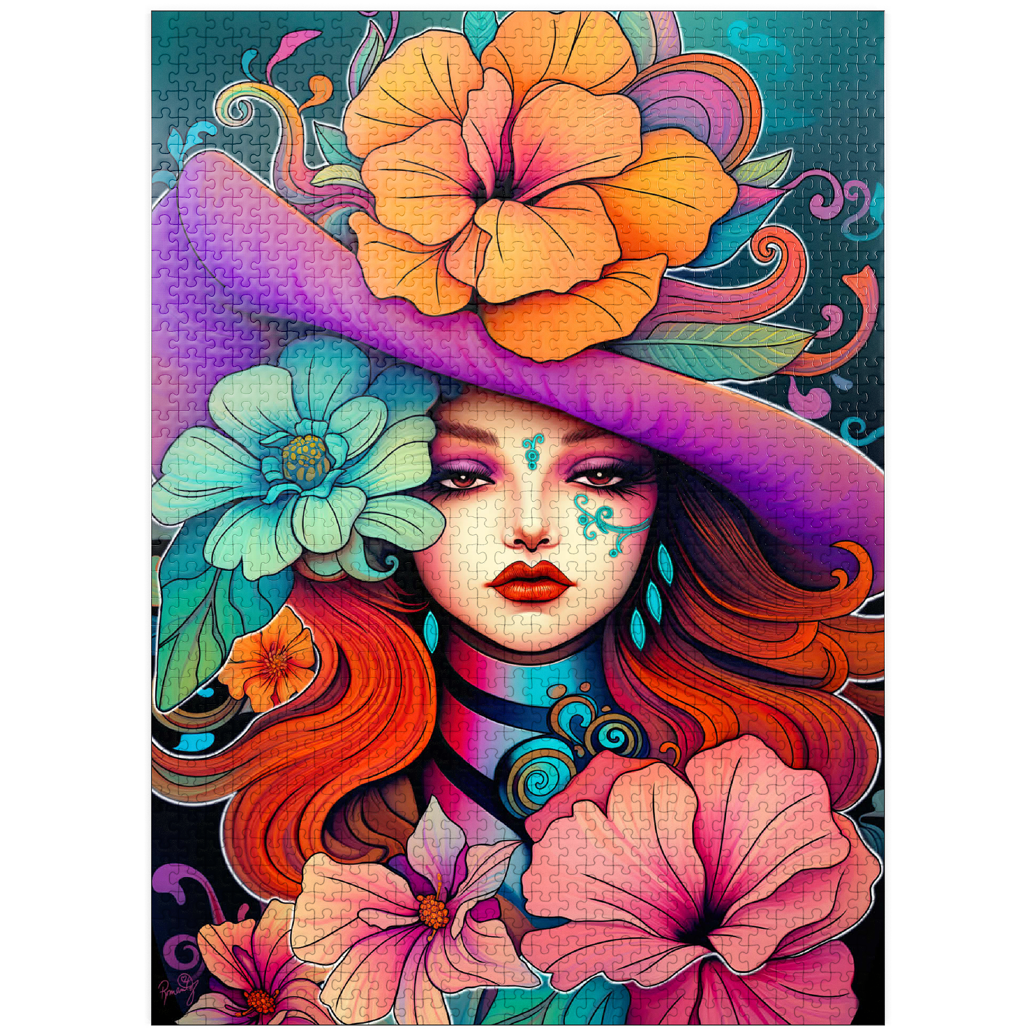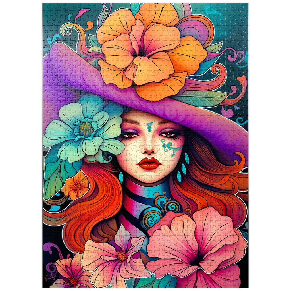This vivid digital illustration features a captivating woman adorned with an oversized violet hat blooming with oversized hibiscus and fantasy flowers. Her fiery red hair cascades in swirling waves, blending seamlessly into the ornamental floral patterns that surround her. Accented with teal face paint and matching teardrop earrings, her striking gaze and bold red lips command attention. The surreal composition and high-contrast color palette combine elegance with expressive modern art, creating a vibrant homage to floral beauty and feminine strength.