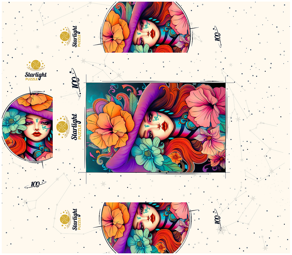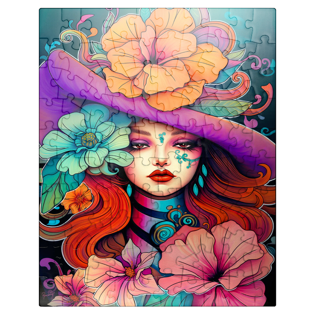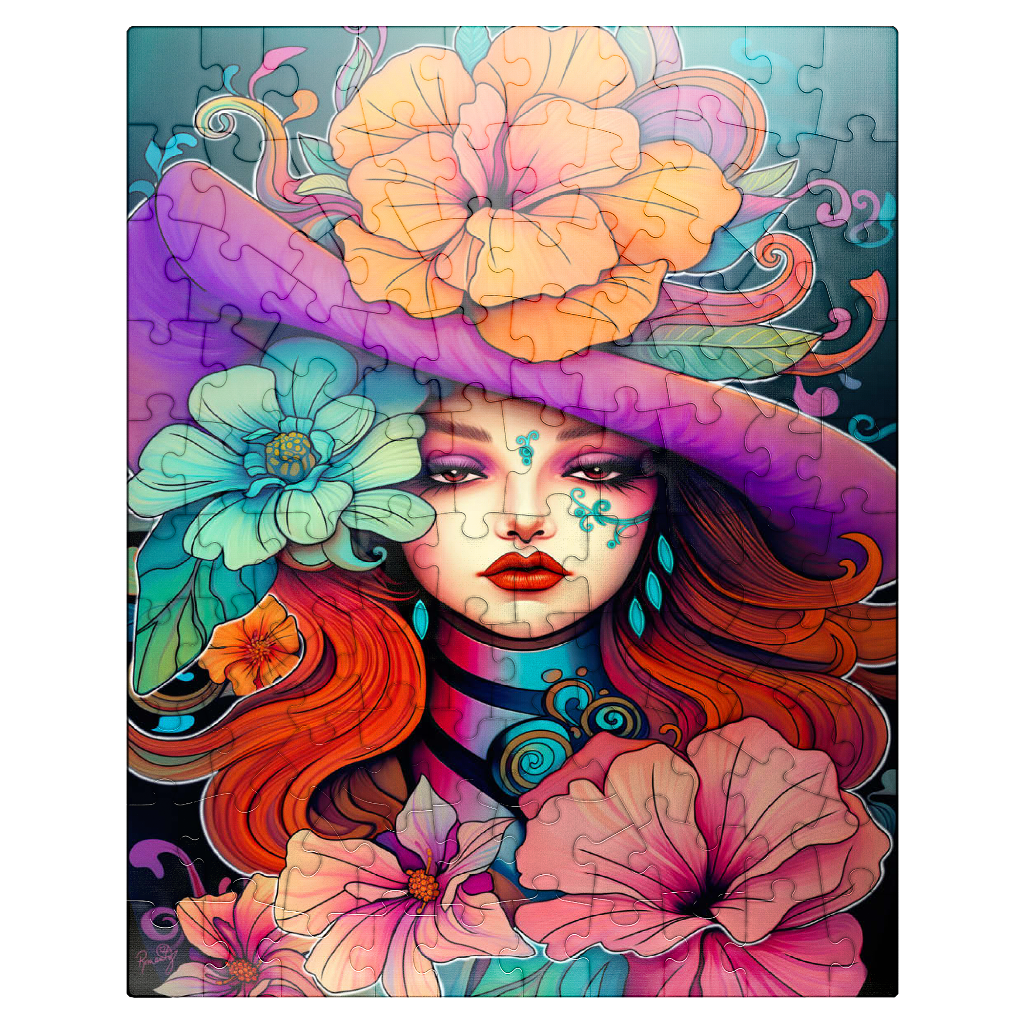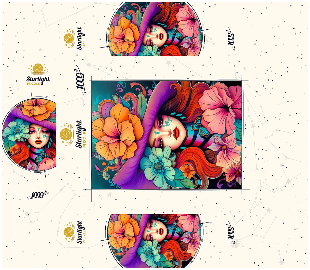 This vivid digital illustration features a captivating woman adorned with an oversized violet hat blooming with oversized hibiscus and fantasy flowers. Her fiery red hair cascades in swirling waves, blending seamlessly into the ornamental floral patterns that surround her. Accented with teal face paint and matching teardrop earrings, her striking gaze and bold red lips command attention. The surreal composition and high-contrast color palette combine elegance with expressive modern art, creating a vibrant homage to floral beauty and feminine strength.