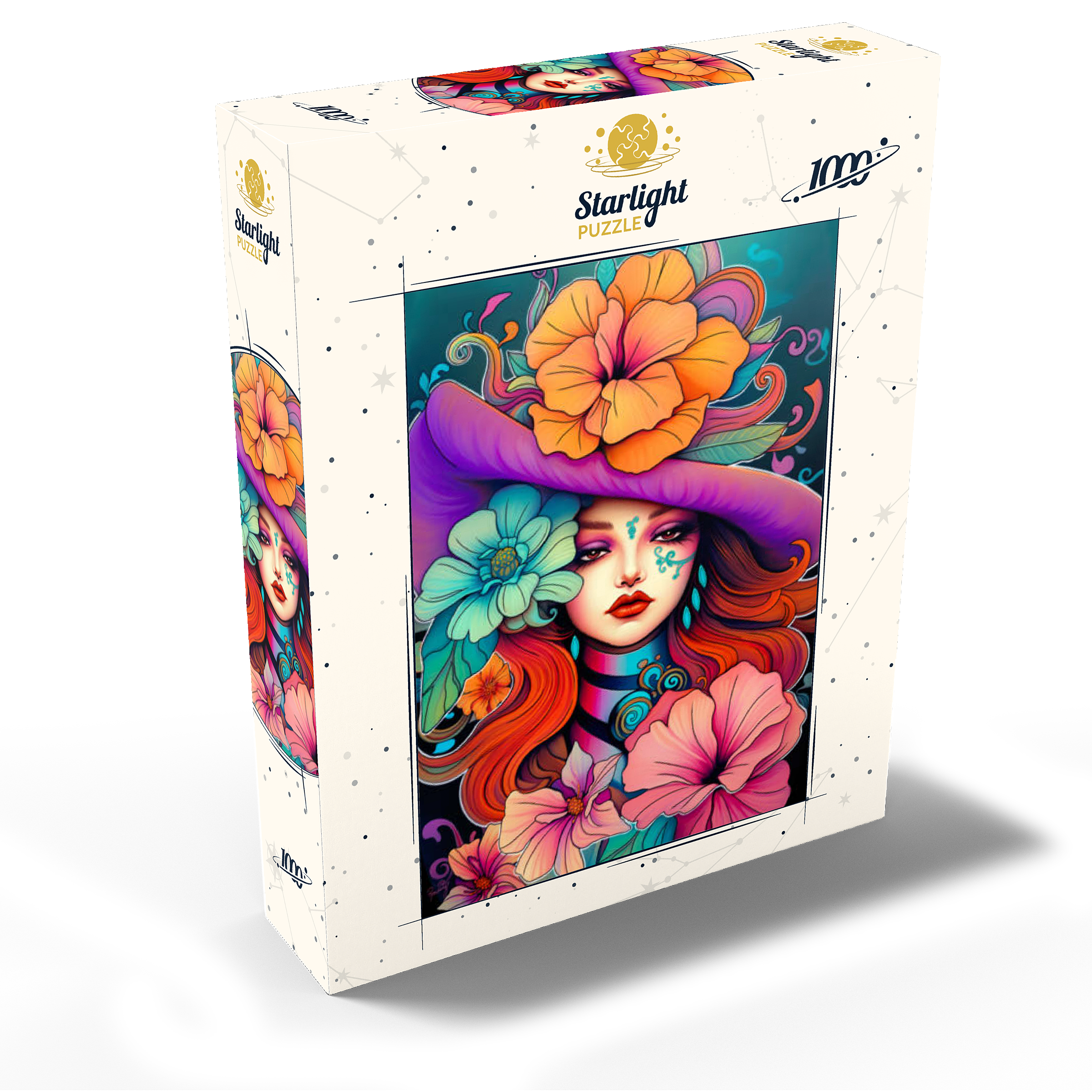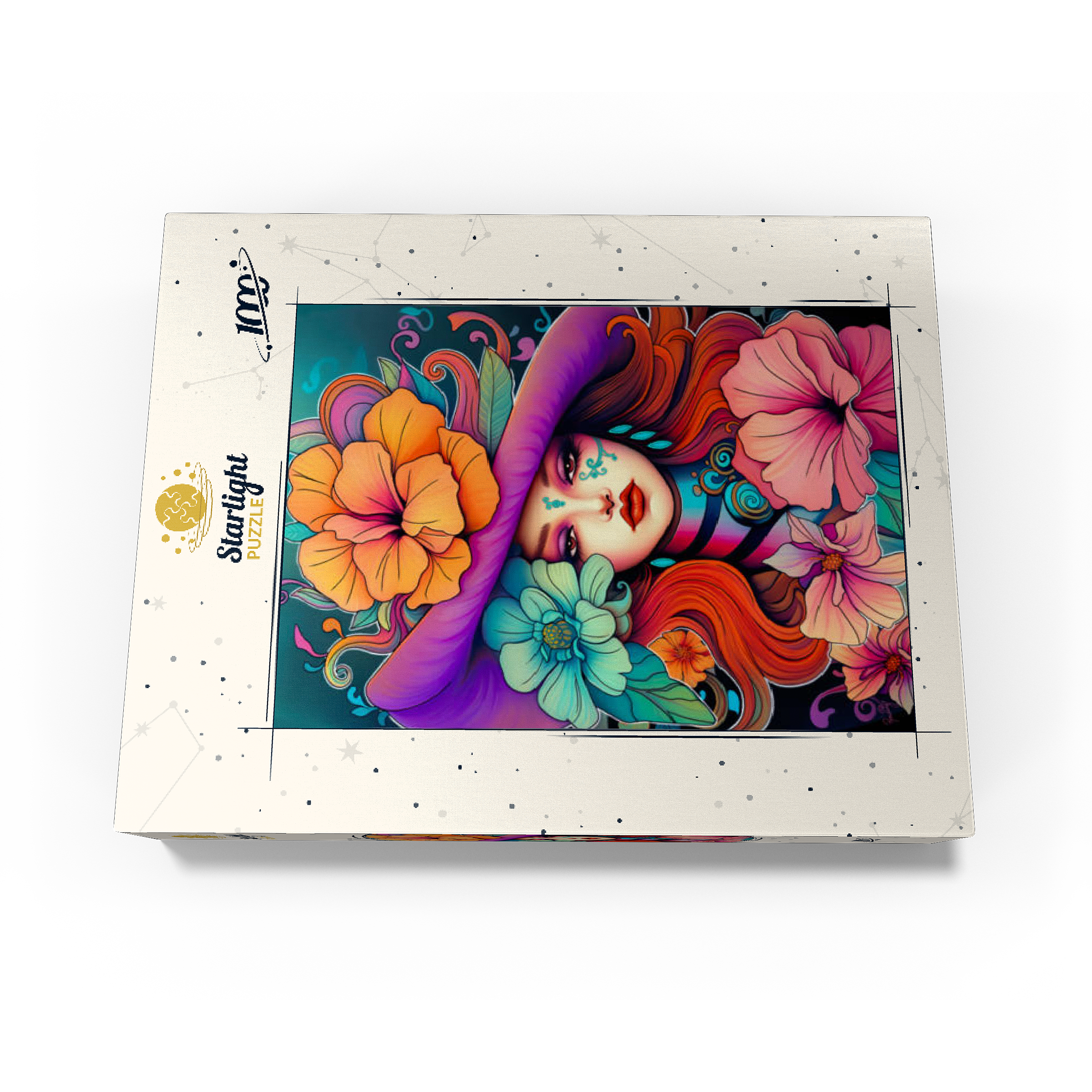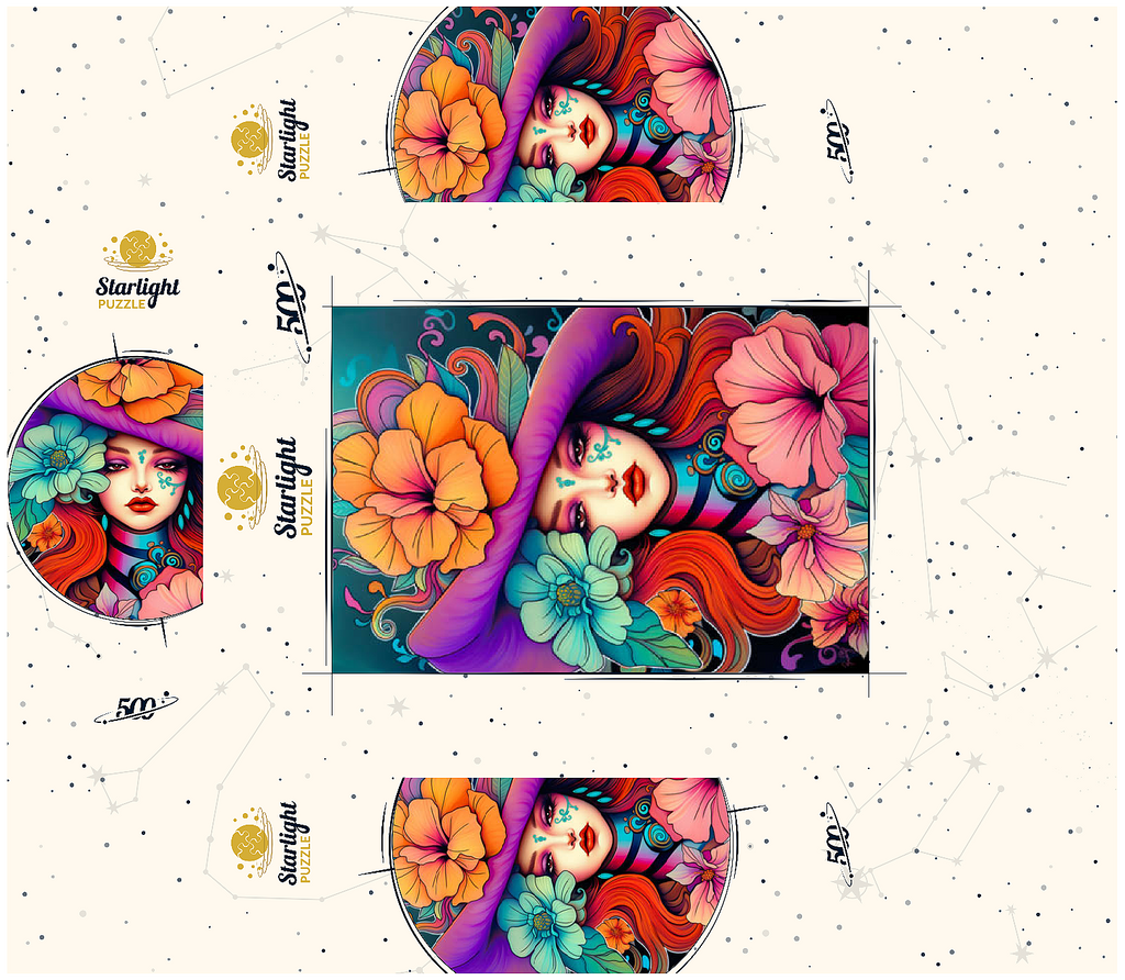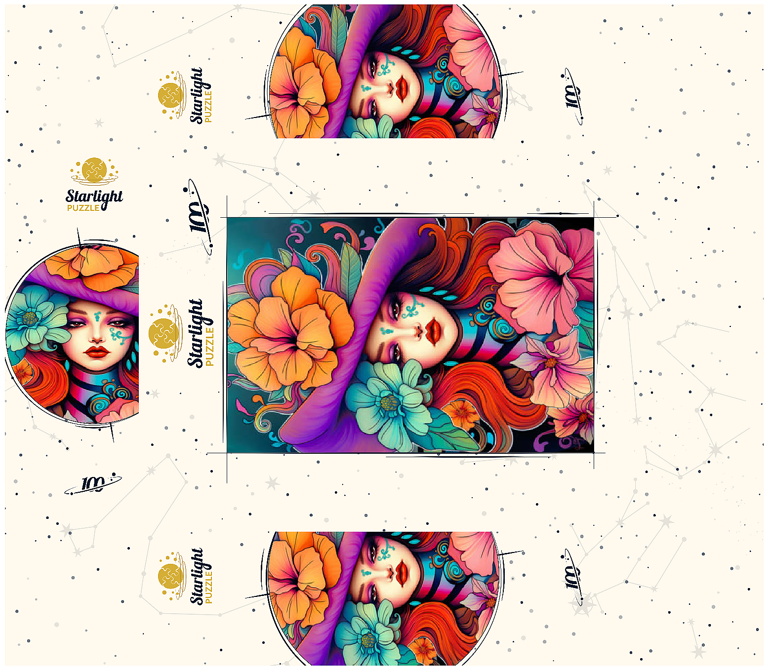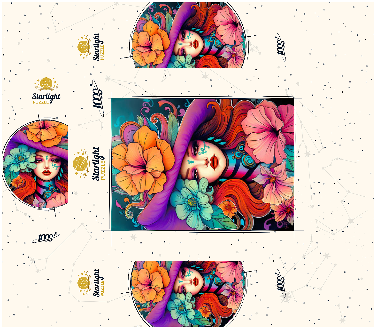 This vivid digital illustration features a captivating woman adorned with an oversized violet hat blooming with oversized hibiscus and fantasy flowers. Her fiery red hair cascades in swirling waves, blending seamlessly into the ornamental floral patterns that surround her. Accented with teal face paint and matching teardrop earrings, her striking gaze and bold red lips command attention. The surreal composition and high-contrast color palette combine elegance with expressive modern art, creating a vibrant homage to floral beauty and feminine strength.