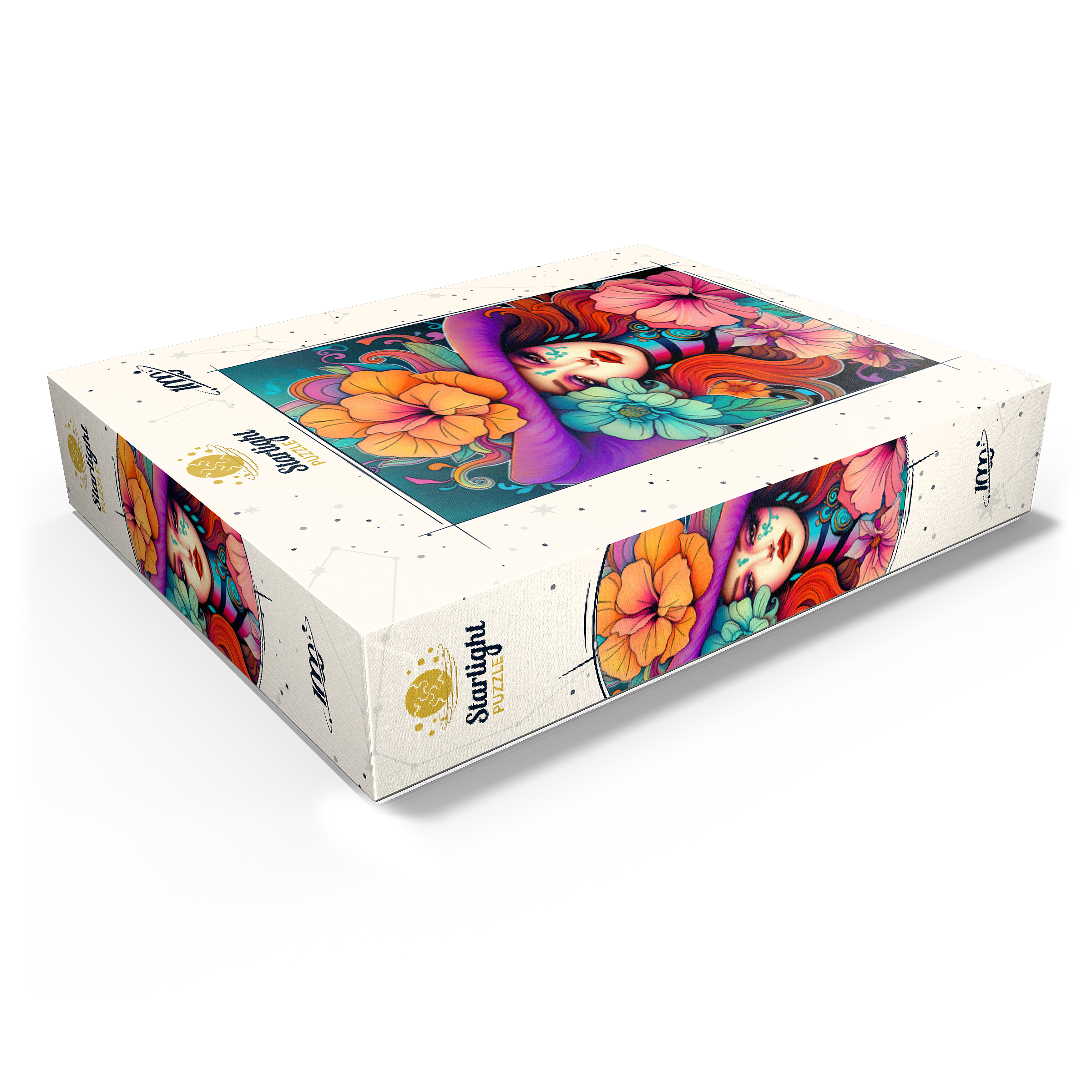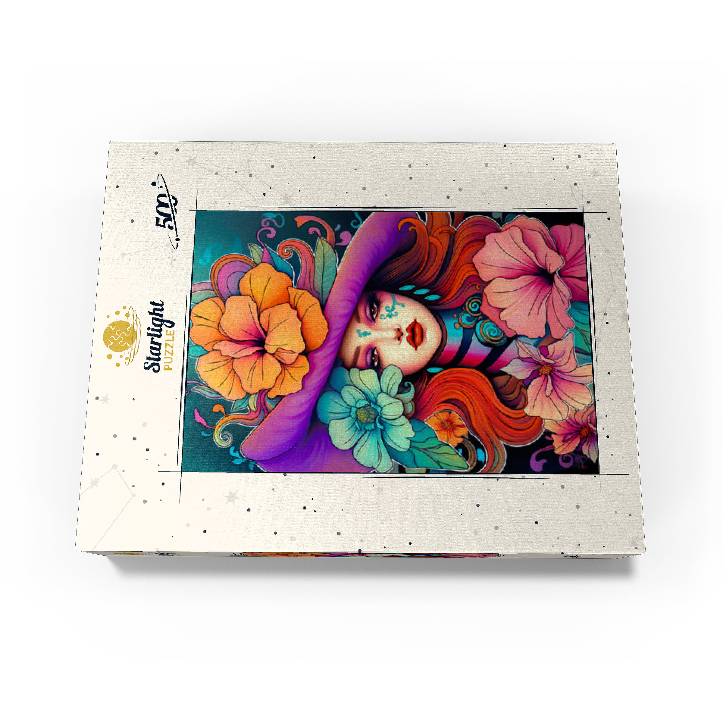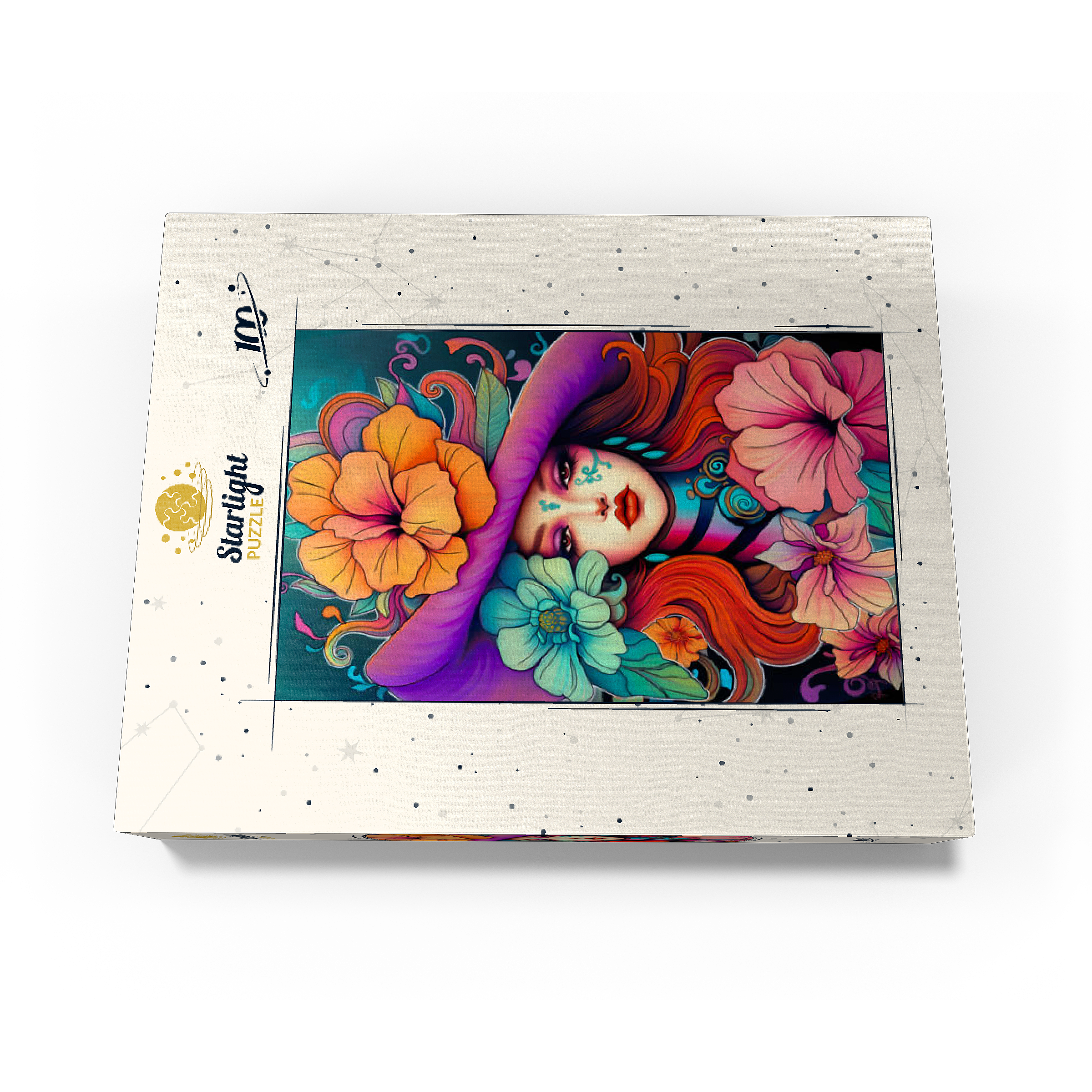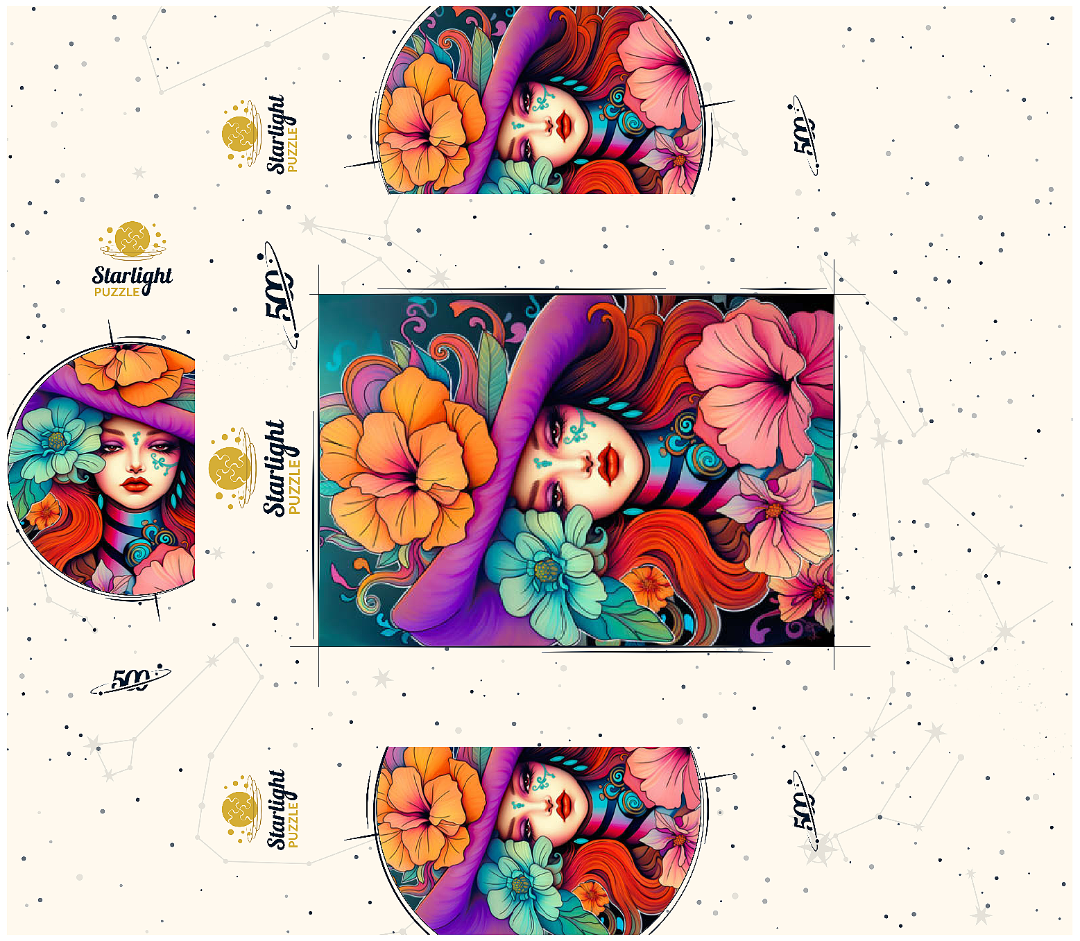 This vivid digital illustration features a captivating woman adorned with an oversized violet hat blooming with oversized hibiscus and fantasy flowers. Her fiery red hair cascades in swirling waves, blending seamlessly into the ornamental floral patterns that surround her. Accented with teal face paint and matching teardrop earrings, her striking gaze and bold red lips command attention. The surreal composition and high-contrast color palette combine elegance with expressive modern art, creating a vibrant homage to floral beauty and feminine strength.