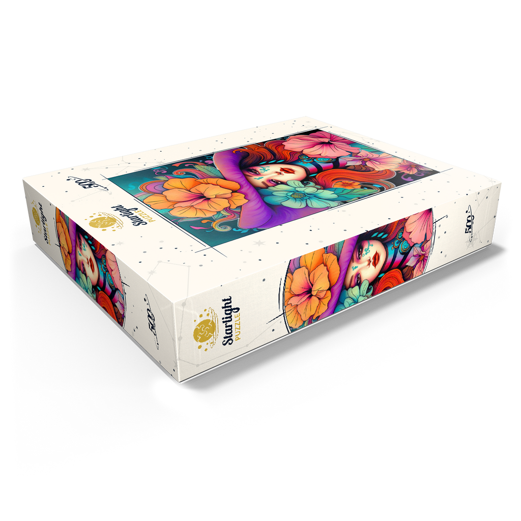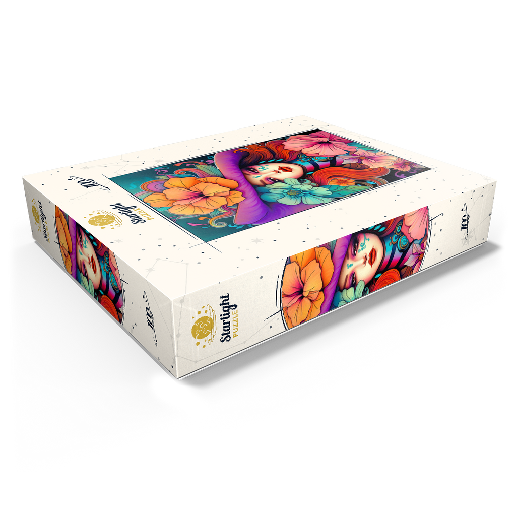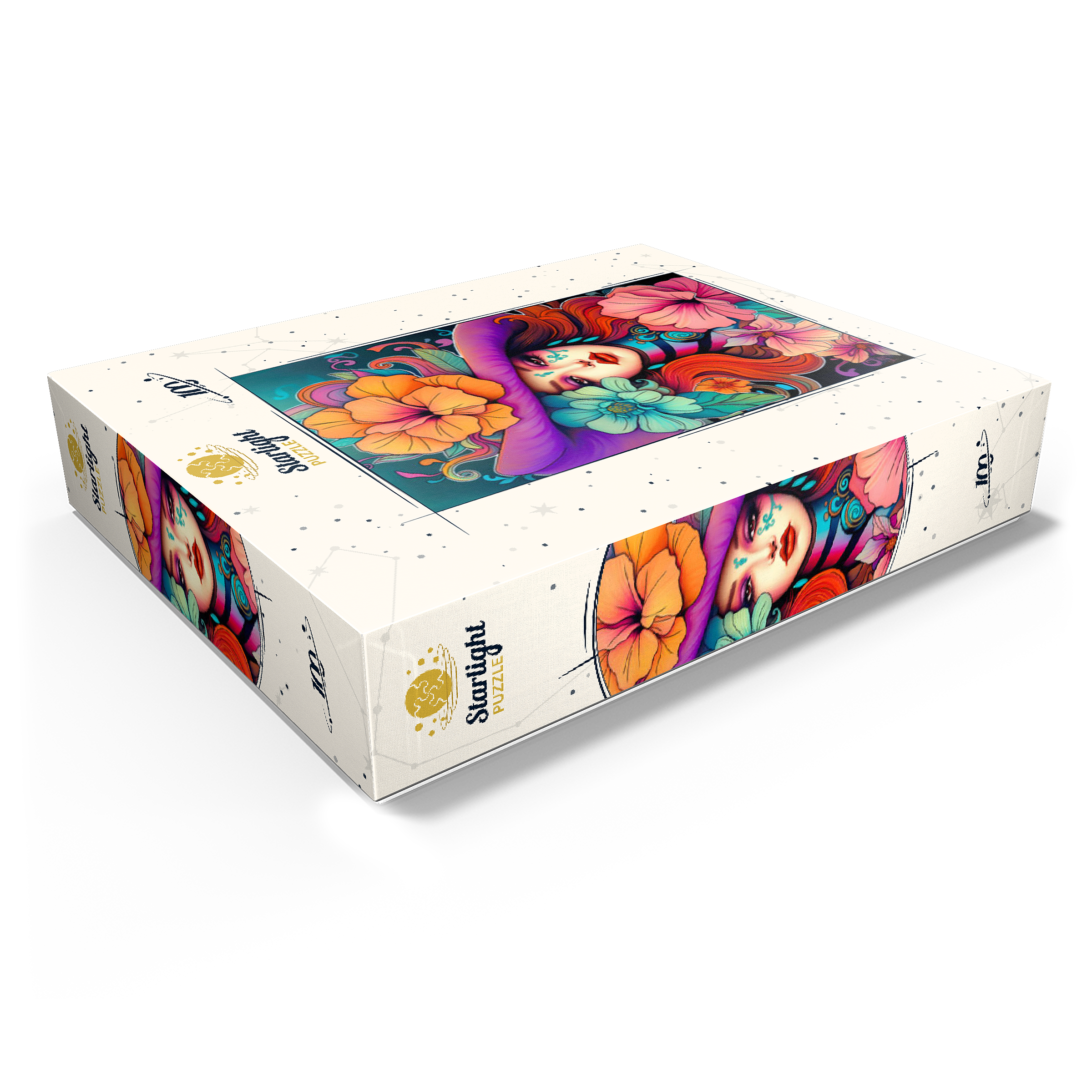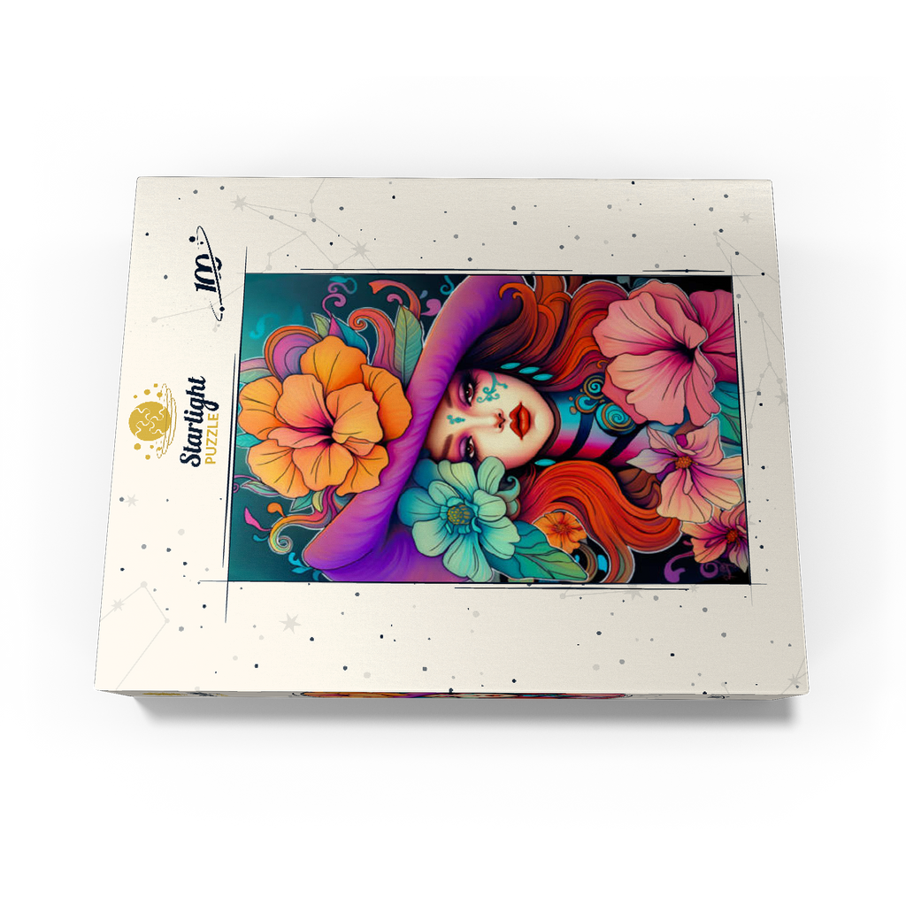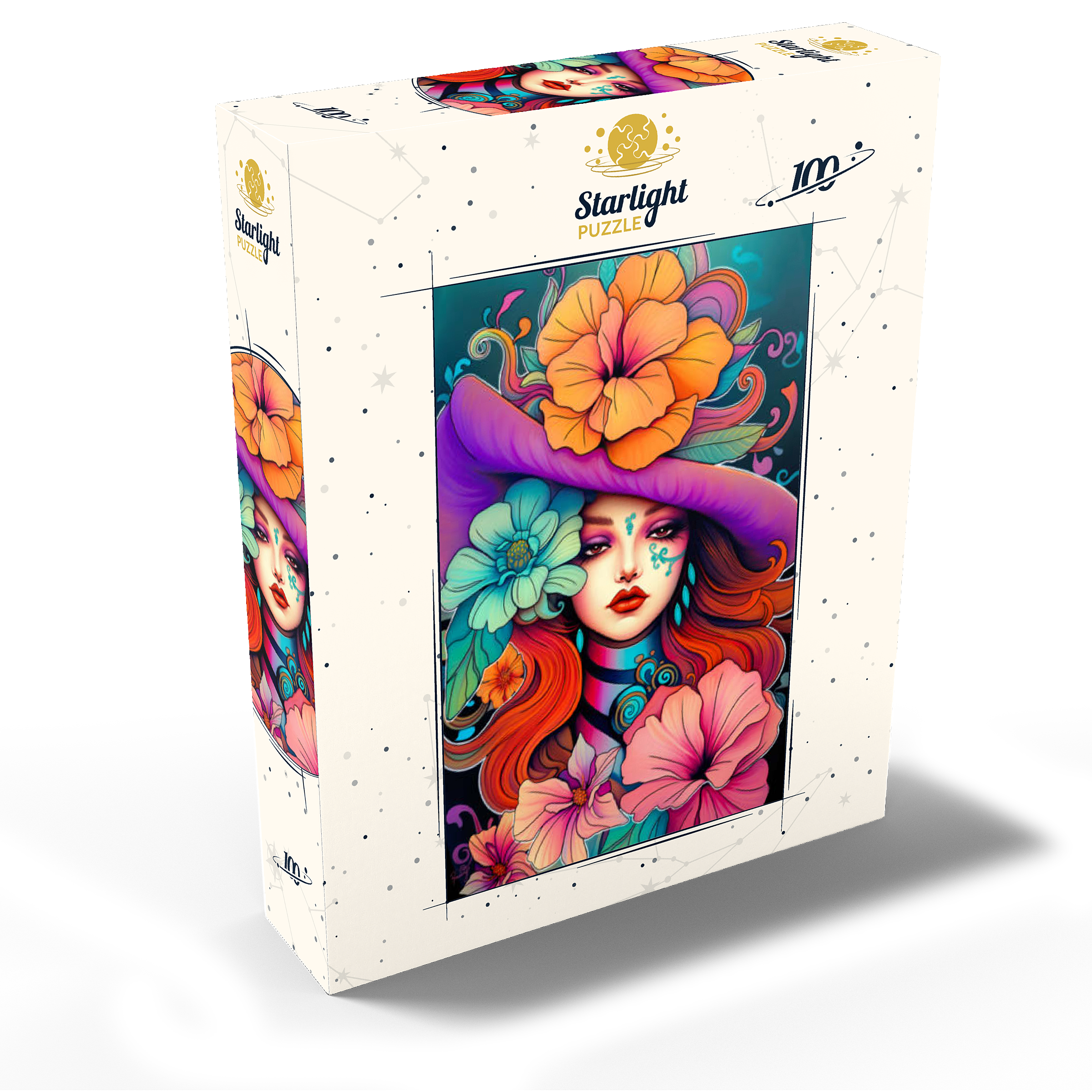 This vivid digital illustration features a captivating woman adorned with an oversized violet hat blooming with oversized hibiscus and fantasy flowers. Her fiery red hair cascades in swirling waves, blending seamlessly into the ornamental floral patterns that surround her. Accented with teal face paint and matching teardrop earrings, her striking gaze and bold red lips command attention. The surreal composition and high-contrast color palette combine elegance with expressive modern art, creating a vibrant homage to floral beauty and feminine strength.